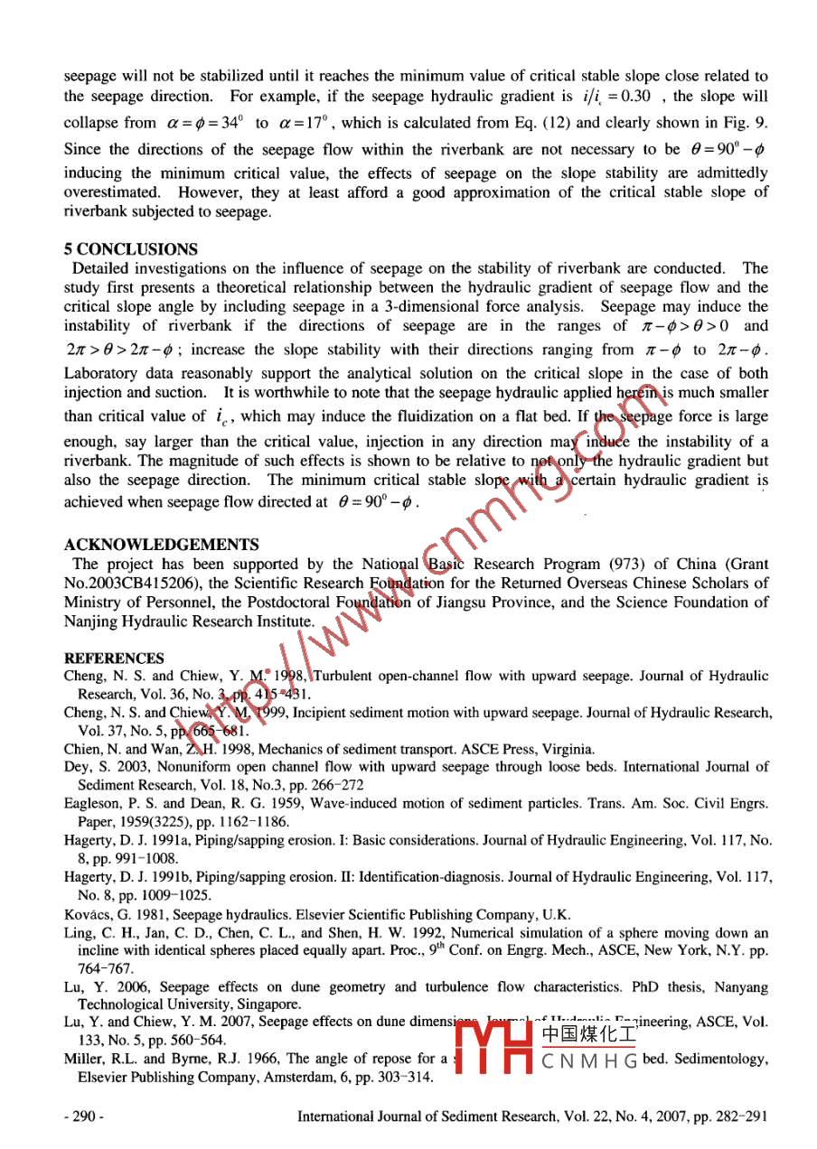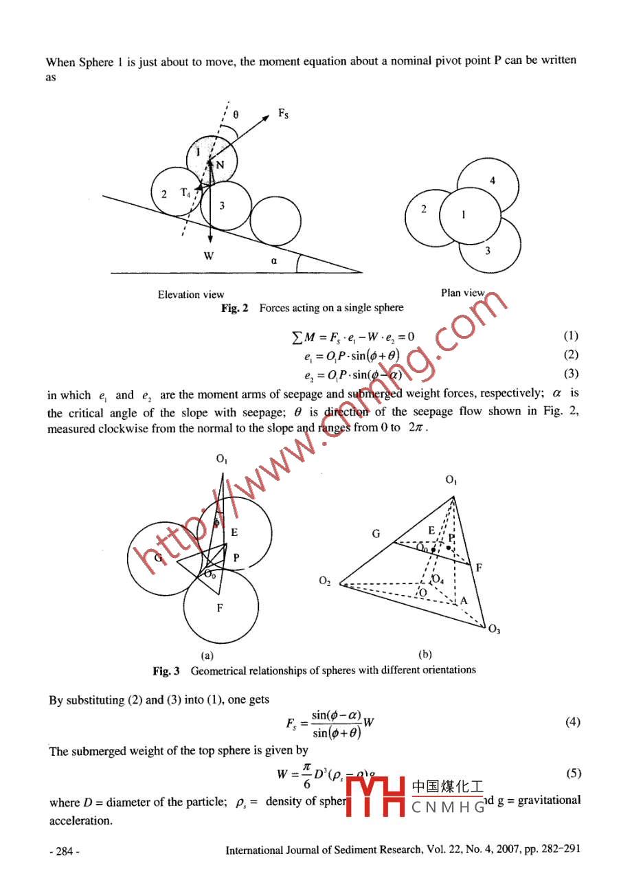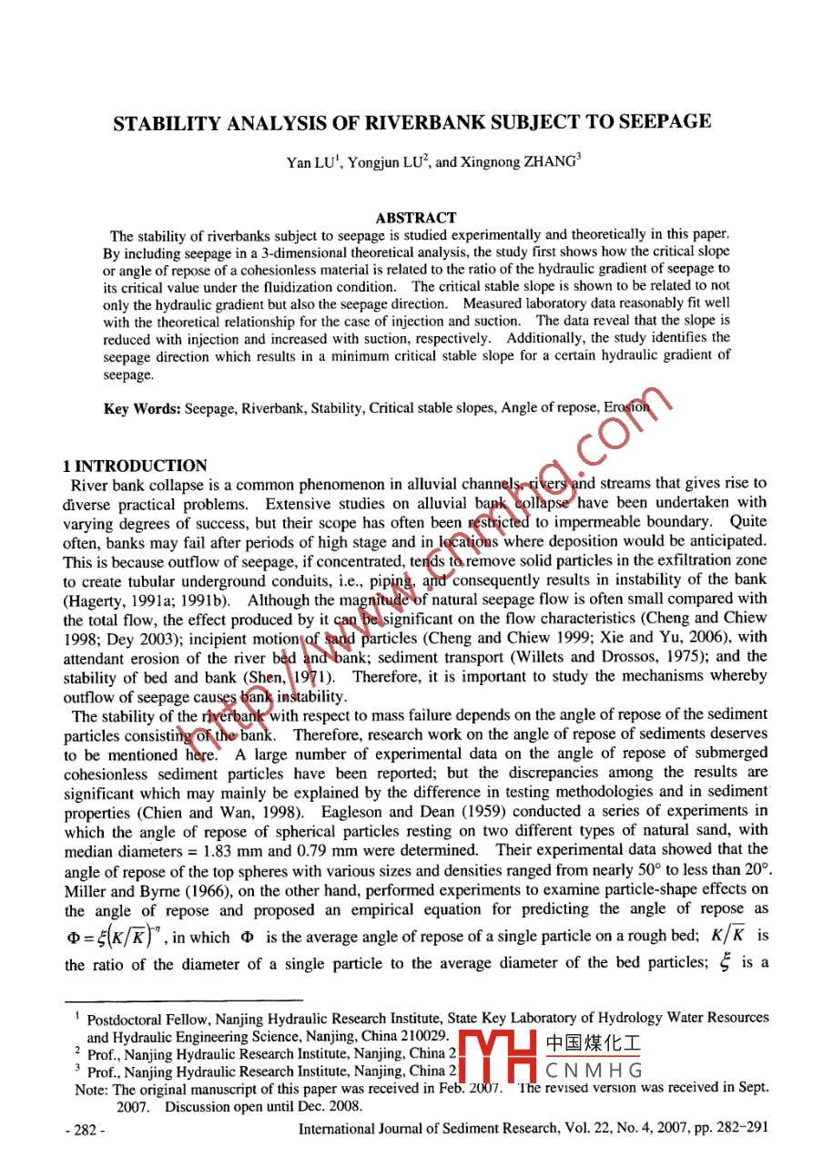 STABILITY ANALYSIS OF RIVERBANK SUBJECT TO SEEPAGEYan LU', Yongjun LU, and Xingnong ZHANGABSTRACTThe stability of riverbanks subject to seepage is studied experimentally and theoretically in this paper.By including seepage in a 3-dimensional theoretical analysis, the study first shows how the critical slopeor angle of repose of a cohesionless material is related to the ratio of the hydraulic gradient of seepage toits critical value under the fluidization condition. The critical stable slope is shown to be related to notonly the hydrauli gradient but also the seepage direction. Measured lboratory data reasonably fit wellwith the theoretical relationship for the case of injection and suction. The data reveal that the slope isreduced with injection and increased with suction, respectively. Additionally, the study identifies theseepage direction which results in a minimum critical stable slope for a certain hydraulic gradient ofseepage.Key Words: Seepage, Riverbank, Stability, Critical stable slopes, Angle of repose, Erosion1 INTRODUCTIONRiver bank collapse is a common phenomenon in alluvial channels, rivers and streams that gives rise todiverse practical problems. Extensive studies on alluvial bank collapse have been undertaken withvarying degrees of success, but their scope has often been restricted to impermeable boundary. Quiteoften, banks may fail after periods of high stage and in locations where deposition would be anticipated.This is because outflow of seepage, if concentrated, tends to remove solid particles in the exfiltration zoneto create tubular underground conduits, i.e, piping, and consequently results in instability of the bank(Hagerty, 1991a; 1991b). Although the magnitude of natural seepage flow is often small compared withthe total flow, the effect produced by it can be significant on the flow characteristics (Cheng and Chiew1998; Dey 2003); incipient motion of sand particles (Cheng and Chiew 1999; Xic and Yu, 2006), withattendant erosion of the river bed and bank; sediment transport (Willets and Drossos, 1975); and thestability of bed and bank (Shen, 1971). Therefore, it is important to study the mechanisms wherebyoutflow of seepage causes bank instability.The stability of the riverbank with respect to mass failure depends on the angle of repose of the sedimentparticles consisting of the bank. Therefore, research work on the angle of repose of sediments deservesto be mentioned here. A large number of experimental data on the angle of repose of submergedcohesionless sediment particles have been reported; but the discrepancies among the results aresignificant which may mainly be explained by the difference in testing methodologies and in sedimentproperties (Chien and Wan, 1998). Eagleson and Dean (1959) conducted a series of experiments inwhich the angle of repose of spherical particles resting on two different types of natural sand, withmedian diamieters = 1.83 mm and 0.79 mm were determined. Their experimental data showed that theangle of repose of the top spheres with various sizes and densities ranged from nearly 50° to less than 20°.Miller and Byme (1966), on the other hand, performed experiments to examine particle-shape effects onthe angle of repose and proposed an empirical equation for predicting the angle of repose asφ=5(k/K)", in which φ is the average angle of repose of a single particle on aroughbed; K/K isthe ratio of the diameter of a single particle to the average diameter of the bed particles; ξ is a| Postdoctoral Fellow, Nanjing Hydraulic Research Instute, State Key Laboratory of Hydrology Water Resourcesand Hydraulic Engineering Science, Nanjing, China 210029.中國(guó)煤化工Prof., Nanjing Hydraulic Research Institute, Nanjing. China 23 Prof.. Nanjing Hydraulic Research Institute, Nanjing, China 2YHCNMHGNote: The original manuscript of this paper was received in Feb. 2007. Ihe revised version was received in Sept.2007. Discussion open until Dec.2008.-282.International Journal of Sediment Research, Vol. 22, No. 4, 2007, pp. 282- 291parameter incorporating the effects of shape and roundness in both particle and bed; and η is aparameter incorporating the effects of sorting of the bed particles. All these studies were conducted underconditions where seepage is absent. If seepage is present, the sediment particles experience an additionalhydrodynamic force, which renders a more complex boundary condition for slope stability consideration.Very few studies have been done to explore the response of the angle of repose to seepage flow. Amongstthe studies that can be found in the literature is the one by Rhee and Bezuijen (1992), who proposed twostability criteria, namely, the continuum mode and single-particle mode to account for sandy slopestability in the presence of seepage. Based on their experimental results, they concluded that for injection,the continuum mode theory governs the failure process, whereas in the case of suction, the failure modecan be described by the single particle mode theory. More recently, Lu (2006) examined the influence ofseepage force on the critical sandy slope and proposed a general expression for the angle of repose in thecase of injection and suction. In the above staterment, injection and suction refer to the case where seepageflow through the channel bed in an upward and a downward direction, respectively.Seepage through boundaries of alluvial channels, rivers and streams is a common occurrence due to theporosity of the granular material. Water is continuously seeping into or out of the channel banks becauseof the different level between the free water surface in the channel and the adjoining groundwater table. Aseepage flow net within a riverbank slope is schematically shown in Fig. I. The principle objective of thepresent study is to develop certain concepts on how the magnitude and direction of the seepage affects thestability of a riverbank.BA__ 又Fig. 1 Schematic sketch of seepage flow within a riverbank2 THEORET