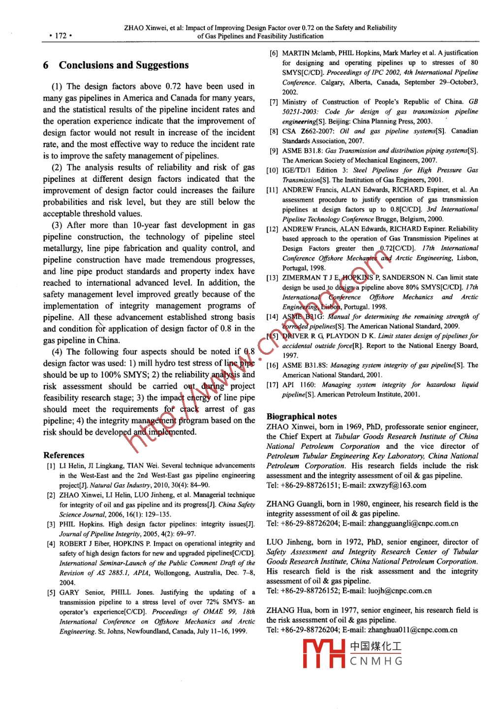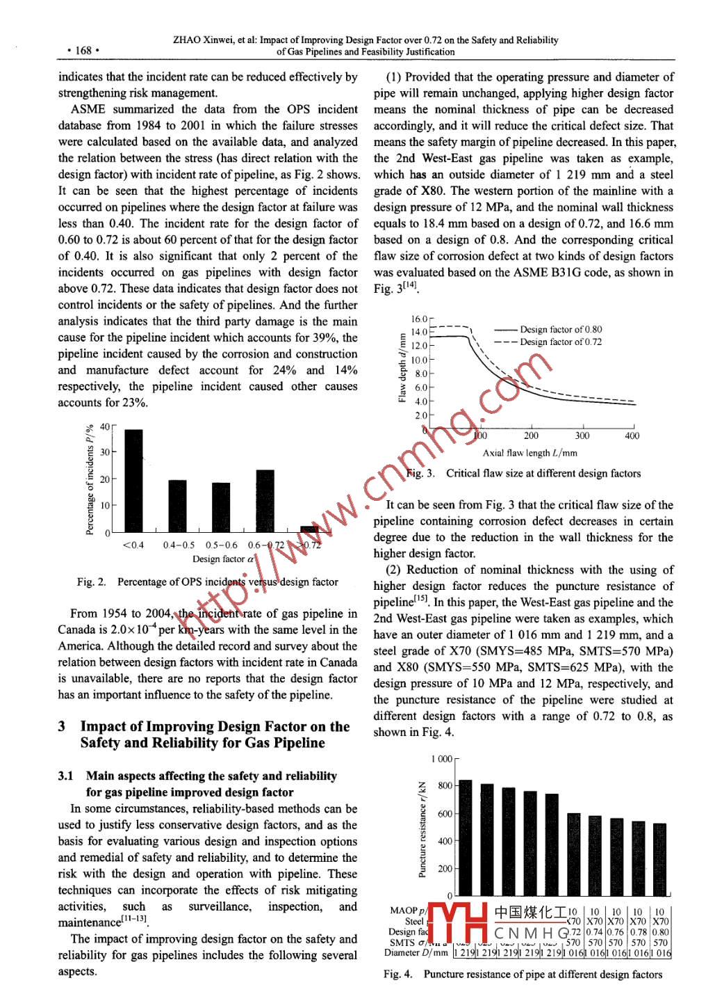 CHINESE JOURNAL OF MECHANICAL ENGINEERING●166.Vol. 25, No.1, 2012DOI: 10.3901/CME.2012.01.166, avilable onlie at wwrnerik com; w.cjmenet.com; www.cjmenet.com.cnImpact of Improving Design Factor over 0.72 on the Safety and Reliabilityof Gas Pipelines and Feasibility JustificationZHAO Xinwei+.2*, ZHANG Guangli', LUO Jinhengl-2, and ZHANG Hua',1 Tiubular Goods Research Institute of China National Petroleum Corporation, xi 'an 710065, China .2 Petroleum tubular engineering Key Laboratory of China National Petroleum Corporation, Xi 'an 710065, ChinaReceived January 21, 2011; revised August 1, 2011; acepted August 15, 2011Abstract: Many years experience of the operation of high stress (> 72% spefied minimum ;yild strength, SMYS) gas pipelines andstatistical analysis resuts of pipeline incidents showed that the operating pipelines at stress levels over 72% SMYS have not presentedproblems in USA and Canada, and design factor does not control incidents or the safety of pipelines. Enhancing pipeline safetymanagement level is most important for decreasing incident rate. The aplication history of higher design factors in the U.S and Canadawas reviewed. And the efect of higher factors to the crtial flaw size, puncture rsistance, change of rlibilitt with time, risk level andthe arest toughness requiremneats of pipeline were analyzed here. The comparison of pipelie failure rates and risk levels between twodesign factors (0.72 and 0.8) has shown that a change in design facor from 0.72 to 0.8 would bring ltte efet on failure rates and risklevels. On the basis of the analysis result, the aplication fesibilit of design factor of 0.8 in China was discussed and the relatedsugestions were proposed. When an operator wishes to apply design factor 0.8 to gas pipeline, the fllowing proces is rcommended:stes level of line pipe hydro test should be up to 100% SMYS, rliabiliy and risk asessment at the design fesibilitiy or conceptualstage should be cnducted, Charpy impact energy should meet the need of peline crack arest; and etabish and execute risk basedintegrity management plan. The technology of pipeline stel meallury, line pipe fbrication and pipeline construction, and line pipequality control level in China achieved tremendous progresses, and line pipe product standards and property indexes have come up tointemational advanced level. Furthermore, pipeline safty management has improved greatly in China. Consequently, the resarch forthe feasibility of application of design factor of0.8 in China has fundamental basis.Key words: gas pipeline, higher design factor, safety and rlibilil, risk itegrity managementthe design and construction process of gas pipeline. At1 Introductionpresent, there are two kinds of method to increase theAs a number of high pressure gas pipelines projectefficiency and reduce the cost in the world, one of them is torepresented by the West-East gas pipeline have been built,use high grade and large diameter line pipe, the other is tothe fast development period of high-pressure large -diameterimprove the design factor's 0. With the fast advancement ofgas pipeline is coming in China. Until the end of“Eleventhpipeline steel metallurgy and line pipe fabrication technology,Five-year Plan", the total length of high-pressurehigh strength line pipe steels, for example, API X70 and APIlarge-diameter gas pipeline including the 2nd West-East gasX80,have been used extensively in the important gaspipeline,the Kazakhstan-China gas pipeline,pipeline projects such as West-East gas pipeline, theRussia-China gas pipeline, the Myanmar-China gasShaan-Jing Gas pipelie and the 2nd West-East gas pipeline,pipeline and Sichuan-East gas pipeline will close to 15 000increasing the fficiency and reducing the cost remarkably.km. And the gas pipeline network has becomes the mainImproving design factor means to increase the designartery supporting the energy requirement in China. Thefactor(DF) above 0.72 in location Class 1 area. Currently,safety and reliability of pipelines in construction andthe design factor of all of gas pipelines in Class 1 is 0.72 inoperation process has direct influence on the developmentChina!". However, 0.8 design factor was adopted inof the national economy and social stability1-2].Canadian gas pipeline design codes in the 1970s, and manyPipeline operators are invetigating to find ways to reducegas pipelines are operated at the stress of 80% SMYSthe cost of new pipelines, or increase their transportation(Specified minimum yield strength)8. From the 1950s, theefficiency without reduction of the reliability and safety indesign factor hewe 072 hos hcr _1sed in several ga:pipelines in中國煤化工apact of using higherdesign factYHC N M H Gudied. In 1990s, 0.8* Corresponding author. E-mail: zxwzyf@163.comdesign factor was adopted in the ASME B31.8 which is theThis project is supported by China National Petroleum Corporationgas pipeline design code in Americal9. Furthermore,Application Fundamental Research Foundation (Grant No. 07A40401)oChinese Mechanial Engineering Society and Springer-Verlag Berin Heidelber 2012England and some other Euro countries are currentlyZHAO Xinwei, et al: Impact of Improving Design Factor over 0.72 on the Safety and Reliability●168●of Gas Pipelines and Feasibility Justificationindicates that the incident rate can be reduced effectively by(1) Provided that the operating pressure and diameter ofstrengthening risk management.pipe will remain unchanged, applying higher design factorASME summarized the data from the OPS incident means the nominal thickness of pipe can be decreaseddatabase from 1984 to 2001 in which the failure stresses accordingly, and it will reduce the critical defect size. Thatwere calculated based on the available data, and analyzed means the safety margin of pipeline decreased. In this paper,the relation between the stress (has direct relation with the the 2nd West-East gas pipeline was taken as example,design factor) with incident rate of pipelin