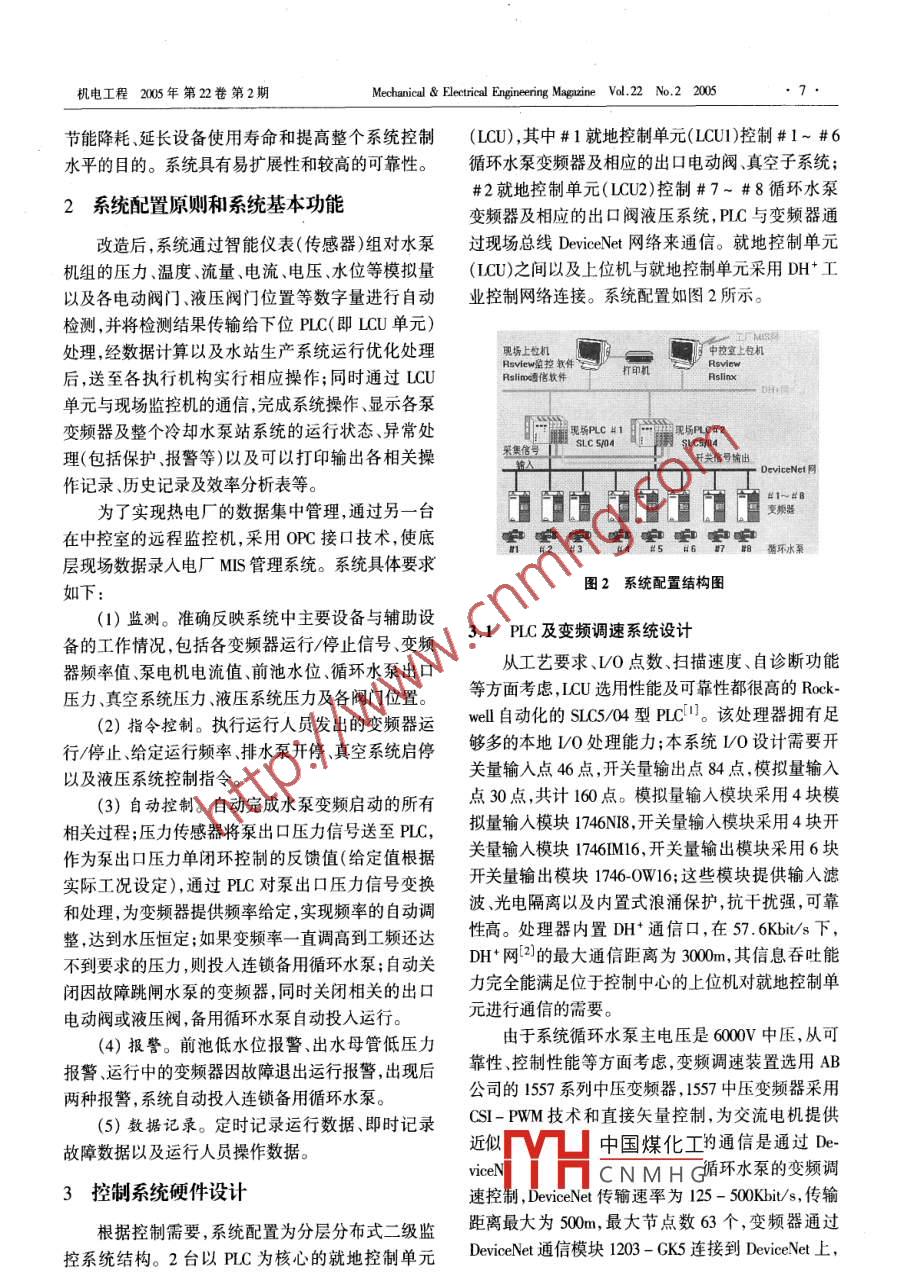 MechMechanicalk Electrical Engineeringine Vol.22 No.2 2005機(jī)電工程2005年 第22卷第2期PLC與變頻器在熱電廠循環(huán)水系統(tǒng)中的應(yīng)用伍冬初,應(yīng)群民(浙江大學(xué)電氣工程學(xué)院,浙江杭州310027)摘要:介紹了一種基于 PLC與變頻調(diào)速的控制系統(tǒng)在水系統(tǒng)自動化改造中的應(yīng)用。包括系統(tǒng)組成、主要功能、下位PLC軟硬件設(shè)計、變頻器控制設(shè)計、上位監(jiān)控設(shè)計以及變頻器、PLC、上位機(jī)三者之間的網(wǎng)絡(luò)通信功能設(shè)計。關(guān)鍵詞:PLC;變頻器;控制系統(tǒng);網(wǎng)絡(luò)通信;組態(tài)軟件中圖分類號:TP391.8;TM628文獻(xiàn)標(biāo)識碼:A文章編號:1001 - 4512005)02 - 0060- 04The Application of PLC & Inverter in Use of the Cycling WaterAutomation Renovation System in the Heat and Power PlantWU Dong-chu, YING Qun-min( The Clle of Eletrial Engineeing, Zhejang University ,Hangzhou 310027, China)Abstract: He article mainly introduces the application based on the PLC and Frequency conversion timing control system inuse of the cyeling water autonatin renovation sytem in the heat and power plant. The structure, the main function, the soft de-sign and hardware design of PLC, the design of frequency conversion timing contol, the design of superisory control and data ac-quisition ware presented. The Network communications between Transducer, PLC and IPC also touched upon in this paper.Key words: PLC; inverter; control system; network communications; configuration software1引言熱電廠外循環(huán)水冷卻系統(tǒng)是為熱電廠發(fā)電機(jī)組的內(nèi)部循環(huán)純凈水提供冷卻,對保證發(fā)電機(jī)組正常、可靠的運(yùn)行,具有非常重要的作用。某熱電廠水泵房現(xiàn)有8臺循環(huán)水泵向廠內(nèi)提供t外冷卻水。根據(jù)生產(chǎn)的需要以及水泵出水口壓力的大小,決定循環(huán)水泵運(yùn)行及臺數(shù)。所有水泵啟動前必須先對水泵的進(jìn)水管抽真空,有2臺真空泵用來完成此項工作。循環(huán)水及其真空子系統(tǒng)組成,如圖1所示。進(jìn)行自動化改造前,水泵的投運(yùn)包括真空泵的開停及相應(yīng)真空閥的開閉操作,均由人工在現(xiàn)場進(jìn)圖1循環(huán)水及真空子 系統(tǒng)組成圖行;一旦發(fā)生緊急情況如運(yùn)行中的水泵突然故障跳閘,人工響應(yīng)往往不夠迅速,未能及時投入連鎖備用針對這些情況,應(yīng)用一種PLC控制、變頻調(diào)速水泵,從而影響工廠的生產(chǎn);而且改造前水泵電機(jī)一與現(xiàn)中國煤化工改造方案,實現(xiàn)了直運(yùn)行在工頻下,能耗大,工頻啟動對泵本身造成很水泵YHCNMHG的變化變速運(yùn)行,大的沖擊,將加速泵系統(tǒng)各個部件的老化。自動調(diào)節(jié)水流量和壓力,既滿足了生產(chǎn)需要,又達(dá)到收稿日期:2004- 05-27修訂日期:2004-06-11作者簡介:伍冬初(1977- ).男,湖南永州人,浙江大學(xué)電氣工程學(xué)院碩士研究生,研究方向:工業(yè)控制方向。機(jī)電工程2005年 第22卷第2期Mchanical & Fletrial Engnering Maguine Vol.22 No.2 2005節(jié)能降耗延長設(shè)備使用壽命和提高整個系統(tǒng)控制(LCU),其中#1就地控制單元(LCUI)控制#1~ #6 .水平的目的。系統(tǒng)具有易擴(kuò)展性和較高的可靠性。循環(huán)水泵變頻器及相應(yīng)的出口電動閥.真空子系統(tǒng);2系統(tǒng)配置原則和系統(tǒng)基 本功能#2就地控制單元(LCU2)控制#7- #8循環(huán)水泵變頻器及相應(yīng)的出口閥液壓系統(tǒng),PLC與變頻器通改造后,系統(tǒng)通過智能儀表(傳感器)組對水泵過現(xiàn)場總線DeviceNet網(wǎng)絡(luò)來通信。就地控制單元機(jī)組的壓力、溫度、流量、電流、電壓、水位等模擬量(LCU)之間以及上位機(jī)與就地控制單元采用DH+工以及各電動閥門、液壓閥門位置等數(shù)字量進(jìn)行自動業(yè)控制網(wǎng)絡(luò)連接。系統(tǒng)配置如圖2所示。檢測,并將檢測結(jié)果傳輸給下位PLC(即LCU單元)處理,經(jīng)數(shù)據(jù)計算以及水站生產(chǎn)系統(tǒng)運(yùn)行優(yōu)化處理Rsvlew生控軟件現(xiàn)場上位機(jī)中控寶中控宣上臺機(jī)后,送至各執(zhí)行機(jī)構(gòu)實行相應(yīng)操作;同時通過LcURslinx遵信軟件打印機(jī)Rsllnxo單元與現(xiàn)場監(jiān)控機(jī)的通信,完成系統(tǒng)操作、顯示各泵變頻器及整個冷卻水泵站系統(tǒng)的運(yùn)行狀態(tài)、異常處現(xiàn)場PLCH1日現(xiàn)場PLCH2理(包括保護(hù)、報警等)以及可以打印輸出各相關(guān)操采焦信號SLC 5AI4開關(guān)信作記錄、歷史記錄及效率分析表等。DeviceNet網(wǎng)為了實現(xiàn)熱電廠的數(shù)據(jù)集中管理,通過另-臺出1一出園CLC[C變換戰(zhàn)在中控室的遠(yuǎn)程監(jiān)控機(jī),采用OPC接口技術(shù),使底層現(xiàn)場數(shù)據(jù)錄人電廠MIS 管理系統(tǒng)。系統(tǒng)具體要求循環(huán)水菜如下:圖2系統(tǒng)配置結(jié)構(gòu)圖(1)監(jiān)測。準(zhǔn)確反映系統(tǒng)中主要設(shè)備與輔助設(shè)備的工作情況,包括各變頻器運(yùn)行/停止信號、變頻3.1 PLC 及變頻調(diào)速系統(tǒng)設(shè)計器頻率值泵電機(jī)電流值、前池水位.循環(huán)水泵出口從工藝要求、VO點(diǎn)數(shù)、掃描速度、自診斷功能壓力真空系統(tǒng)壓力、液壓系統(tǒng)壓力及各閥門位置。等方面考慮,LCU選用性能及可靠性都很高的Rock.(2)指令控制。執(zhí)行運(yùn)行人員發(fā)出的變頻器運(y