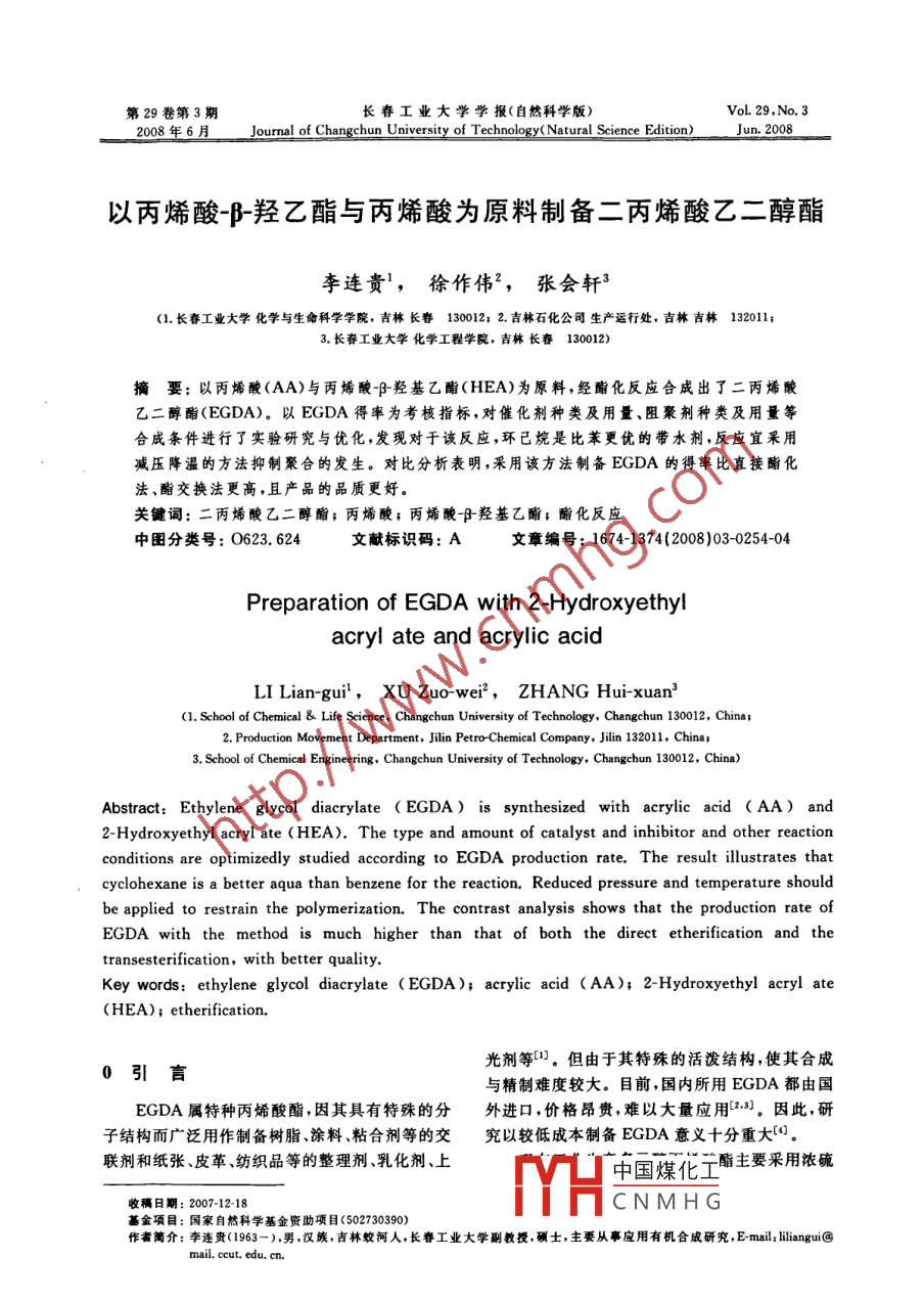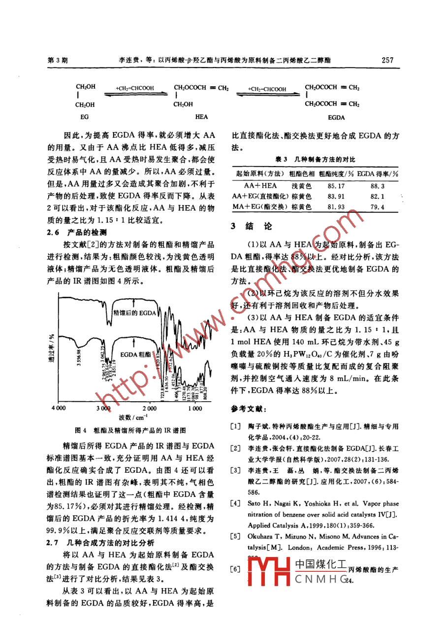 第29卷第3期長春工業(yè)大學(xué)學(xué)報(自然科學(xué)版)2008年6月Journal of Changchun Uniof Technology( Natural Science Edition) Jun 2008以丙烯酸β羥乙酯與丙烯酸為原料制備二丙烯酸乙二醇酯李連貴,徐作偉2,張會軒3(1.長春工業(yè)大學(xué)化學(xué)與生命科學(xué)學(xué)院,吉林長春130012;2.吉林石化公司生產(chǎn)運行處,吉林吉林132011;3長春工業(yè)大學(xué)化學(xué)工程學(xué)院,吉林長春130012)摘要:以兩烯酸(AA)與丙烯酸β羥基乙酯(HEA)為原料,經(jīng)酯化反應(yīng)合成出了二丙烯酸乙二醇酯(EGDA)。以EGDA得率為考核指標(biāo),對催化劑種類及用量、阻聚劑種類及用量等合成條件進行了實驗研究與優(yōu)化,發(fā)現(xiàn)對于該反應(yīng),環(huán)已烷是比苯更優(yōu)的帶水劑,反應(yīng)宜采用減壓降溫的方法抑制聚合的發(fā)生。對比分析表明,采用該方法制備EGDA的得率比直接酯化法、酯交換法更高,且產(chǎn)品的品質(zhì)更好。關(guān)鍵詞:二丙烯酸乙二醇酯;丙烯酸;丙烯酸β羥基乙酯;酯化反應(yīng)中圖分類號:O623.624文獻標(biāo)識碼:A文章編號:1674-1374(2008)03-025404Preparation of EGDA with 2-Hydroxyethylacryl ate and acrylic acidLI Lian-gui', XU Zuo-wei, ZHANG Hui-xuan(1. School of Chemical Life Science, Changchun University of Technology, Changchun 130012, China:tion Movement Department, Jilin Petro-Chemical Company, Jilin 132011, Chinat3. School of Chemical Engineering, Changchun University of Technology, Changchun 130012, ChinaAbstract: Ethylene glycol diacrylate EGDA ) is synthesized with acrylic acid ( AA )and2-Hydroxyethyl acryl ate(HEA). The type and amount of catalyst and inhibitor and other reactionconditions are optimizedly studied according to EGDA production rate. The result illustrates thatcyclohexane is a better aqua than benzene for the reaction. Reduced pressure and temperature shouldbe applied to restrain the polymerization. The contrast analysis shows that the production rate ofEGDA with the method is much higher than that of both the direct etherification and thetransesterification, with better qualityKey words: ethylene glycol diacrylate (EGDA), acrylic acid(AA): 2-Hydroxyethyl acryl ate(HEA); etherification.光劑等口。但由于其特殊的活潑結(jié)構(gòu),使其合成0引言與精制難度較大。目前,國內(nèi)所用EGDA都EGDA屬特種丙烯酸酯因其具有特殊的分外進口,價格昂貴難以大量應(yīng)用23)。因此,子結(jié)構(gòu)而廣泛用作制備樹脂涂料粘合劑等的交究以較低成本制備EGDA意義十分重大聯(lián)劑和紙張、皮革、紡織品等的整理劑、乳化劑、上中國煤化工酯主要采用濃硫收稿日期:2007-1218CNMHG基金項目:國家自然科學(xué)基金資助項目(502730390)作者簡介:李連貴(1963-),男,漢族,吉林蛟河人,長春工業(yè)大學(xué)副教授,碩士,主要從事應(yīng)用有機合成研究,Emal: liliangui@第3期李連貴,等:以丙烯酸羥乙酯與丙烯酸為原料制備二丙烯酸乙二醇酯255酸催化的直接酯化法,此法雖生產(chǎn)成本低、收率件。高,卻存在副反應(yīng)多、產(chǎn)物精制麻煩、嚴(yán)重污染環(huán)境和腐蝕設(shè)備等問題5.文中以AA與HEA為1實驗起始原料,經(jīng)酯化反應(yīng)合成出了EGDA粗酯,再1.1主要儀器與試劑經(jīng)純化處理制得較純凈的EGDA產(chǎn)品。以EGHEA為上海富蔗化工有限公司生產(chǎn)的工業(yè)DA得率為指標(biāo),對主要合成條件進行優(yōu)化,得出品,其它原料、試劑、儀器同文獻[2]了用AA和HEA制備EGDA較適宜的合成條1.2反應(yīng)原理HC-CH-C-0-CHCH,-OH HC-CH-C-OH4 H,C-CH-C-O-CH CH2 -0-C-CH-CH, +HioHEA)(EGDA)即AA與EG(乙二醇直接酯化法制備EGDA的第二步反應(yīng)。1.3實驗過程以HEA代替EG,按文獻[2]的操作方法制濃硫酸備EGDA粗酯,并進行粗酯的精餾。一對甲苯磺酸按文獻[3]的檢測方法,用紅外光譜儀折光4y1.4產(chǎn)品檢測和結(jié)果計算HiPW:OuoH,PW:Ovo/C儀及氣相色譜分析產(chǎn)品中EGDA的含量及產(chǎn)品磷鉬酸的純度。SO: /AlO3按文獻[2]的計算方法,計算EGDA得率催化劑用量/gX=M,X×100%圖1催化劑對AA與HEA反應(yīng)的影響式中:X—EGDA得率(%);從圖中可以看出,濃硫酸對該反應(yīng)的催化活M1—所得精餾產(chǎn)品的質(zhì)量(g);性最高(表現(xiàn)為反應(yīng)時間最短),但濃硫酸具有強X精餾產(chǎn)品中EGDA的含量(%);氧化和脫水性,使反應(yīng)混合物變粘稠,不利于產(chǎn)物理論上反應(yīng)生成EGDA的質(zhì)量的后處理,且其用量增大時使EGDA得率下降(g)。而H3PW12O40是該酯化反應(yīng)較適宜的催化劑反應(yīng)時間短,EGDA得率較高,唯其價格較高。若2結(jié)果與討論將H3PW12O0負(fù)載于載體上制成固體催化劑,因2.1催化劑種類及其用量的影響催化劑可重復(fù)使用,便可克服這一缺點。從實驗按1:1物質(zhì)的量之比向三口瓶中加入AA結(jié)果看,以1 mol hea使用45g負(fù)載量為20%與HEA,并按1 mol HEA加5g由對苯二酚與的H3PW12O40/C(實際用H3PW12O4o9g)做催硫酸銅按等質(zhì)量比復(fù)配成的復(fù)合阻聚劑、100mL化劑較適宜。該催化劑重復(fù)使用6次時,其催化苯、5g催化劑,控制空氣通入速度為8mL/min,活性未見明顯減弱機械攪拌速度為250r/min。分別使用不同催化2.2阻聚劑種類及其用量的影響劑并改變其用量,在常壓下加熱進行酯化反應(yīng),以由于AA,HEA,EGDA及它們相互間都可考察催化劑對該反應(yīng)的影響,實驗結(jié)果如圖1所發(fā)生聚合,導(dǎo)致該反應(yīng)的酯化率下降、EGDA得示率減小。為防止聚合,除設(shè)計反應(yīng)設(shè)備時要考慮