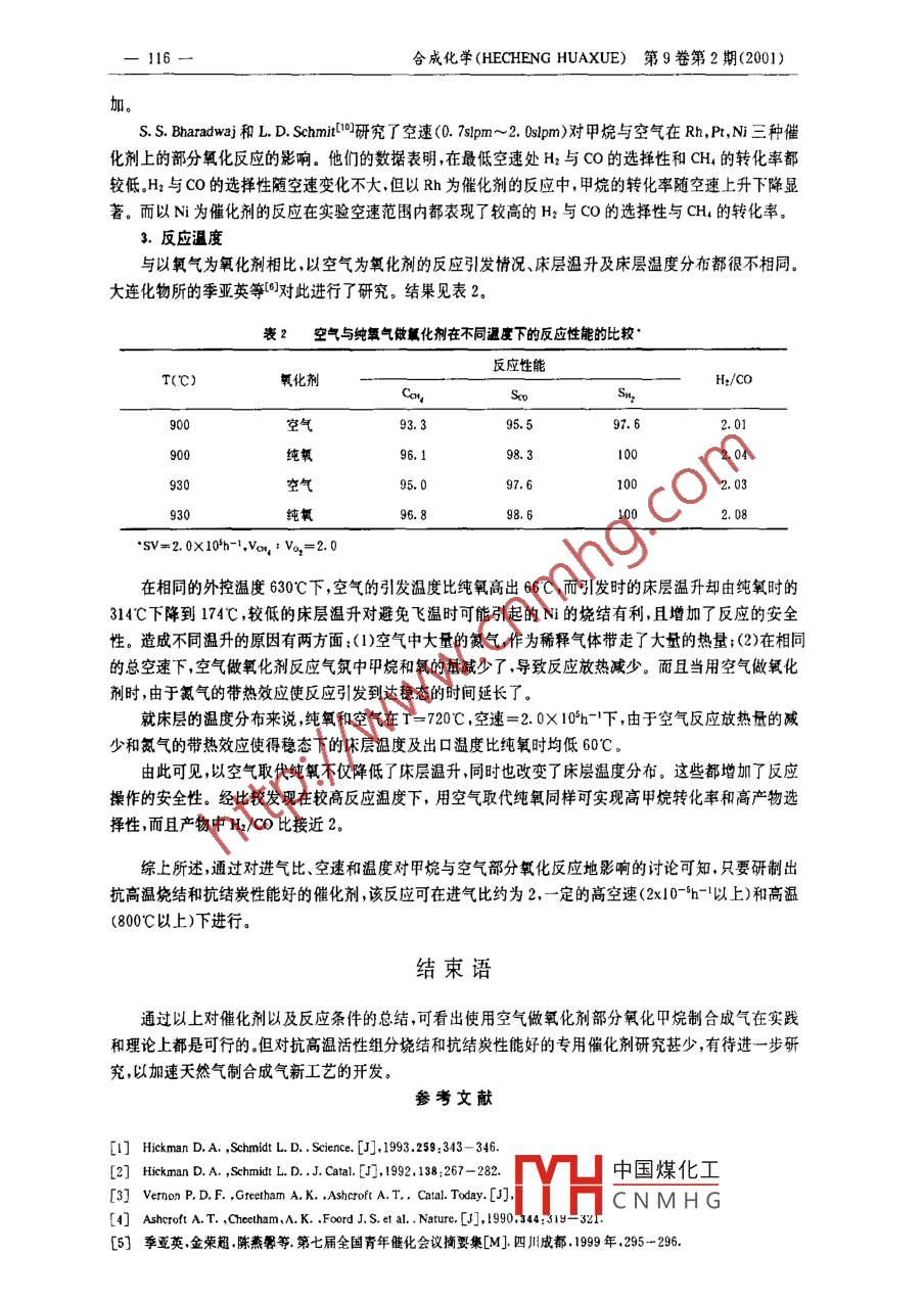 合成化學(xué)( HECHENG HUAXUE)第9卷第2期(2001)甲烷和空氣部分氧化制合成氣尚麗霞,謝衛(wèi)國,呂紹潔,邱發(fā)禮(中國科學(xué)院成都有機化學(xué)研究所,四川成都610041)摘要:使用空氣做氧化劑可減輕甲烷部分氧化制合成氣反應(yīng)中催化劑床層的“熱點問題,而且可大大降低加反應(yīng)條件下反應(yīng)爆炸的危險性因此易于工業(yè)化。對國內(nèi)外在這一領(lǐng)域的的研究總結(jié)表明以空氣與甲烷部分氧化制合成氣在理論和反應(yīng)條件上都是可行的。但專用于空氣來轉(zhuǎn)化CH,的抗高溫?zé)Y(jié)和抗結(jié)炭性能好的催化劑有待進一步研究和開發(fā),參考文獻10篇。關(guān)鍵詞:甲烷;空氣;催化;部分氧氣;合成氣;綜述中圖分類號:TE646,0643文獻標(biāo)識碼:A文章編號:1005-1511(2001)02-113-05隨著石油資源的日益減少,天然氣將成為未來基本化學(xué)品的主要碳源。我國天然氣儲量豐富,天然氣的開發(fā)利用尤為重要。當(dāng)前天然氣的化工利用主要是用于生產(chǎn)合成氣,再由合成氣制取大量的化學(xué)品。目前工業(yè)上生產(chǎn)合成氣主要是利用水蒸汽重整。但該工藝的缺點是強吸熱、能耗大投資大。20世紀(jì)90年代以來,甲烷催化氧化制合成氣有了很大的進展。與水蒸汽重整相比它有以下優(yōu)點:(1)它是個放熱反應(yīng),能耗低;(2)反應(yīng)生成的mon2:moao=2的合成氣,可直接用于甲醇及烴類的費一托合成等重要工業(yè)過程;(3)反應(yīng)速度快,可在高空速下進行但甲烷催化氧化反應(yīng)需要純氧用空分獲得純氧增加了投資,且產(chǎn)生的合成氣不能直接用于合成氨。又由于甲烷與純氧反應(yīng)易在催化劑床層中產(chǎn)生飛溫和在加壓下發(fā)生爆炸問題離工業(yè)化還有一定距離。D. A. Hickman和LD. Schmidt:)曾提出甲烷用空氣做氧化劑可達到高轉(zhuǎn)化率以及CO和H2的高選擇性。 Ashcroft(.4的研究也表明空氣可取代純氧同樣可具有較高的反應(yīng)性能。現(xiàn)在國內(nèi)也有部分研究者6對此進行了研究。以空氣催化氧化甲烷制合成氣有以下優(yōu)點:(1)不再需要空分;(2)空氣中的氮氣可作為稀釋氣體從而減緩了催化劑床層“過熱”現(xiàn)象(3)空氣做氧化劑可大大降低加壓反應(yīng)條件下爆炸的危險性。(4)通過調(diào)節(jié)富氧空氣中氧的含量可使制得合成氣中mol,+moly,=3,其中CO經(jīng)過水蒸汽變換轉(zhuǎn)化成H,使合成氣中molw,;moh,=3,可直接用于生產(chǎn)合成氨,因此用富氧空氣進行甲烷催化氧化制合成氣是有希望在合成氨工業(yè)上推廣使用的。CH4+空氣體系中存在的反應(yīng)甲烷催化氧化制合成氣的總反應(yīng)式為:CH4+1/202→C0+2H2但實際反應(yīng)過程是很復(fù)雜的,往往還有其他副反應(yīng)發(fā)生,其中包括完全氧化反應(yīng)(燃燒反應(yīng)),重整反應(yīng),水氣變換反應(yīng),以及積炭反應(yīng)和消炭反應(yīng)等。Ashcroft認(rèn)為甲烷的部分氧化制合成氣是一系列反應(yīng)的組合,這一系列反應(yīng)包括以下的完全燃燒反應(yīng)和重整反應(yīng)完全氧化反應(yīng)(燃燒反應(yīng))CH4+202→CO2+2H20中國煤化工CNMHG收搞日期:20001-19作者簡介:尚麗霞(1975-),女漢族,四川資陽人,中國科學(xué)院成有機化學(xué)研究所在讀硬士,研究生主要從事多相催化研究114合成化學(xué)( HECHENG HUAXUE)第9卷第2期(2001)CH4+3/202→CO+2H2OH4+3/202→CO2+H2+H2OCH4+O2·CO2+H2H2+1/202→H2OCH4+02→Co+H2O+H2Co+1/202→cO2整反應(yīng)CH4+H2O→Co+3Hz2CH4+CO2→2c0+2H2co+ H20F cO 2 +H,在甲烷催化氧化制合成氣的反應(yīng)體系中除了甲烷催化氧化反應(yīng)外還伴隨有積炭和消炭反應(yīng):CH,=C+ 2H2CO≠cO2+CCo+H2≠C+H2O甲烷與空氣部分催化氧化制合成氣的催化劑前用于甲烷部分氧化制合成氣的催化劑主要有三大類:第一大類是以NRh和Pt等過渡金屬和貴金屬為活性組分的負載型催化劑,所用載體主要為A2O3,MgO,SO2及稀土金屬氧化物等;第二類為Rh,Pt等純貴金屬網(wǎng);第三類為復(fù)合或混合氧化物催化劑。純貴金屬催化劑價格昂貴,成本高。而復(fù)合或混合氧化物催化劑,在使用前需要高溫還原,起催化作用的并不是復(fù)合氧化物本身,而是責(zé)金屬或Ni,C等金屬單質(zhì),該類催化劑在反應(yīng)過程中會分解,催化劑強度低,不能用于實際生產(chǎn)。因此現(xiàn)在用得最多的是第一類負載型催化劑,尤以Ni基負載型催化劑因其具有與Rh等貴金屬相近的活性,且成本低,極具發(fā)展前景。但N在反應(yīng)過程中由于易流失和燒結(jié)等原因,其催化活性會下降,甚至失活。另外,積炭也是造成催化劑失活的主要原因。針對催化劑的積炭,可通過添加稀土或堿士氧化物等適宜的助劑,以及控制一定的制備和反應(yīng)條件盡可能的減少催化劑積炭雖然甲烷部分氧化制合成氣的催化劑研究領(lǐng)域非?;钴S但真正用空氣做氧化劑的催化劑的研究還很少,以下是部分文獻對空氣與甲烷反應(yīng)的有關(guān)催化劑報道。Ann M De groote L等以Ni/Mgo/Al2O3為催化劑,對工業(yè)絕熱固定床反應(yīng)器中甲烷與空氣部分氧化的模擬實驗表明:適當(dāng)選擇操作條件,催化劑上雖有少量的積炭產(chǎn)生,但反應(yīng)器的穩(wěn)態(tài)操作是可能的。使用空氣為氧化劑,甲烷的轉(zhuǎn)化率可達到90%以上。這表明選用N基負載型催化劑是有其工業(yè)實用前景的。Hochmuth1在接近生產(chǎn)實際條件下,以空氣為