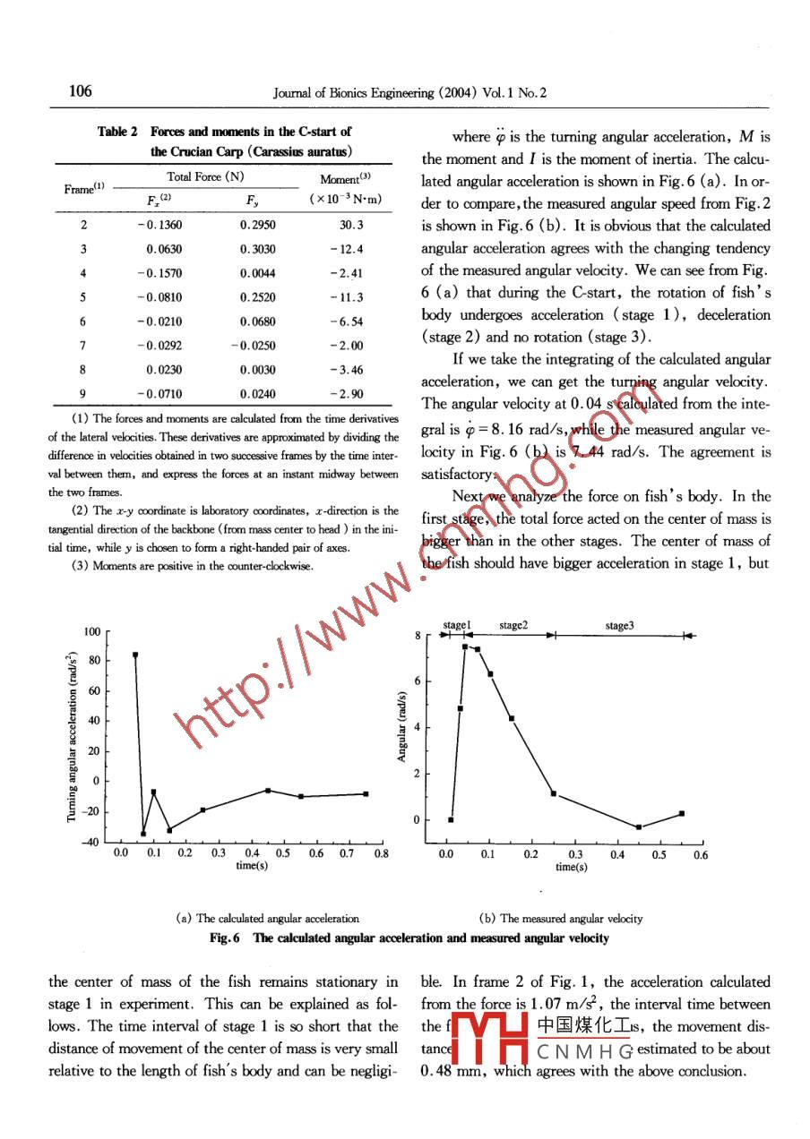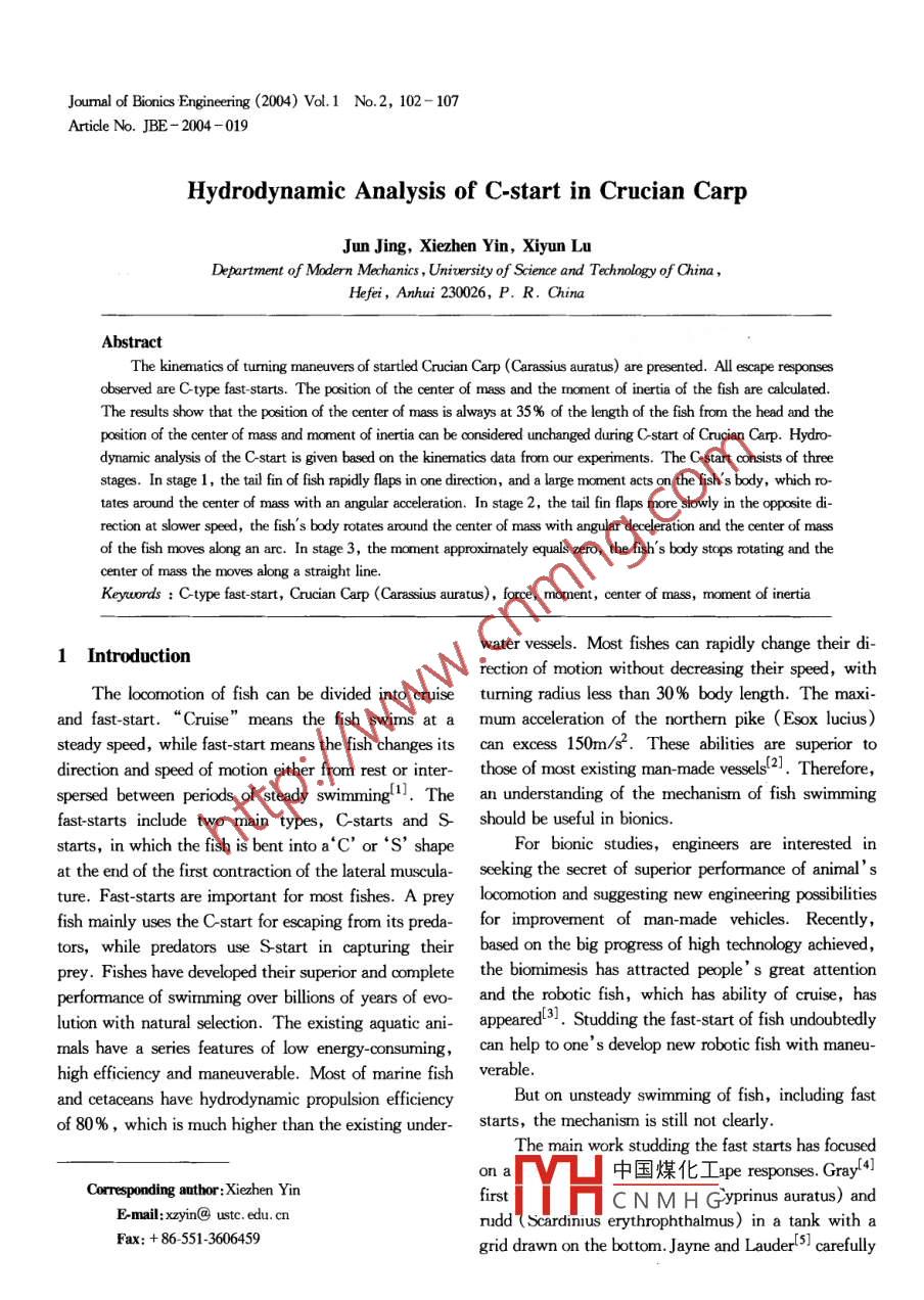 Joumal of Bionics Engineering (2004) Vol.1 No.2, 102 - 107Article No. JBE- 2004 - 019Hydrodynamic Analysis of C-start in Crucian CarpJun Jing, Xiezhen Yin, Xiyun LuDepartment of Modern Mechanics , University of Science and Technology of China ,Hefei, Anhui 230026, P. R. China .AbstractThe kinematics of turning maneuvers of startled Crucian Carp (Carassius auratus) are presented. All escape responsesobserved are C type fast starts. The position of the center of mass and the moment of inertia of the fish are calculated.The resuts show that the position of the center of mass is always at 35% of the length of the fish from the head and theposition of the center of mass and moment of inertia can be considered unchanged during C-start of Crucian Carp. Hydro-dyamic analysis of the C-start is given based on the kinematics data from our experiments. The C start consists of threestages. In stage 1, the tail fin of fish rapidly flaps in one direction, and a large moment acts on the fish's body, which ro-tates around the center of mass with an angular acceleration. In stage 2, the tail fin flaps more slowly in the opposite di-rection at slower speed, the fish' s body rotates around the center of mass with angular deceleration and the center of massof the fish moves along an arc. In stage 3, the moment approximately equals zero, the fish' s body stops rotating and thecenter of mass the moves along a straight line.Keywords : Ctype fast start, Crucian Carp (Carassus auratus), force, moment, center of mass, moment of inertiawater vessels. Most fishes can rapidly change their di-1 Introductionrection of motion without decreasing their speed, withThe lcomotion of fish can be divided into cruiseturmning radius less than 30% body length. The maxi-and fast-start.“ Cruise” means the fish swims at amum acceleration of the northern pike ( Esox lucius )steady speed, while fast-start means the fish changes itscan excess 150m/s-. These abilities are superior todirection and speed of motion either from rest or inter-those of most existing man-made vessels2) . Therefore,spersed between periods of steady swimming'1l. Thean understanding of the mechanism of fish swimmingfast-starts include two main types, C-starts and Sshould be useful in bionics.starts, in which the fish is bent intoa' 'C' or 'S' shapeFor bionic studies, engineers are interested irat the end of the first contraction of the lateral muscula- seeking the secret of superior performance of animal'sture. Fast-starts are important for most fishes. A preylocomotion and suggesting new engineering possibilitiesfish mainly uses the Cstart for escaping from its preda-for improvement of man-made vehicles. Recently,tors, while predators use S-start in capturing theirbased on the big progress of high technology achieved,prey. Fishes have developed their superior and completethe biomimesis has attracted people' s great attentionperformance of swimming over billions of years of evo-and the robotic fish, which has ability of cruise, haslution with natural selection. The existing aquatic ani-appeared3) . Studding the fast-start of fish undoubtedlymals have a series features of low energy-consuming,can help to one' s develop new robotic fish with maneu-high efciency and maneuverable. Most of marine fishverable.and cetaceans have hydrodynamic propulsion efficiencyBut on unsteady swimming of fish, including fastof 80%,which is much higher than the existing under-starts, the mechanism is still not clearly.The main work studding the fast starts has focusedon a中國煤化工ape responses. GrayCorresponding author:Xiezhen YinfirstYHC N M H Gyprinus auratus) andE mail: xzyin@ ustc. edu. cnrudd (Scardinius erythrophthalmus) in a tank with aFax: + 86551-3606459grid drawn on the bottom. Jayne and Lauder-5J carefullyJun Jing, et al.: Hydrodynamic Analysis of C-start in Crucian Carp103studied the kinematics of escape responses of the remarks are summarized in Section 5.bluegill sunfish ( Lepomis macrochirus). Recently,2 Kinematics characteristicsmost papers report the way the muscles function in fishturming. For example, Spierts et al. 16 studied muscleExperiments were conducted on Crucian Carpfunction in the fast-start of carp. To our knowledge, (Carassius auratus) obtained from a local dealer. Thefew people have investigated the hydrodynamics of fast- protocol of the experiments was presented in ref [9].starting fish, except that Weihs-7,8] calculated the In the experiments, four fishes ( total length, L =thrust force of rudd based on the experimental resultsof 20.52+1.13 cm, mass, M= 302.5+20.5 g) wereGray[4].tested. The escape responses of all Crucian Carp areIn this paper, our purpose is to investigate the hy-‘“C start”and all the fish have similar kinematic charac-drodynamics of fast-starting fish based on our experi- teristics.ments9J . This paper is organized as follows. The kine-Fig.1 shows some typical pictures chosen from amatics characteristics of Cstarting fish are briely de- series of frames of one fish turning process reorded byscribed in Section 2. The position of the center of mass high- speed CCD camera (1000 fps). The curves of theand the moment of inertia of fish, which are variable backbone of the fish shown in Fig. 1 are presented inwith changes in the shape of the fish' s body, are given Fig.2. From a series of curves, the speed of the fishin Section 3. The force and moment imposed on fish was calculated using calculation method presented in refbody are analyzed in Section 4. Finally, concluding[9].(0.010 s)(0.040s)(0.070 s)(0.100 s)(0.150s)9。10。(0.2505)(0.450s)(0.550s)(0.750s)(0.850 s)framesFig.1 Typical pictures of C-start of Crucian CarpIn C-start, first the tail fin of the fish rapidly flaps stationary. In the second stage (frames 3- 6), theclockwise, then flaps counter-clockwise, while the center of mass moves along an arc. In the third stagefish' s body only rotates counter clockwise. The process (frames 7- 10), the center of mass moves a
