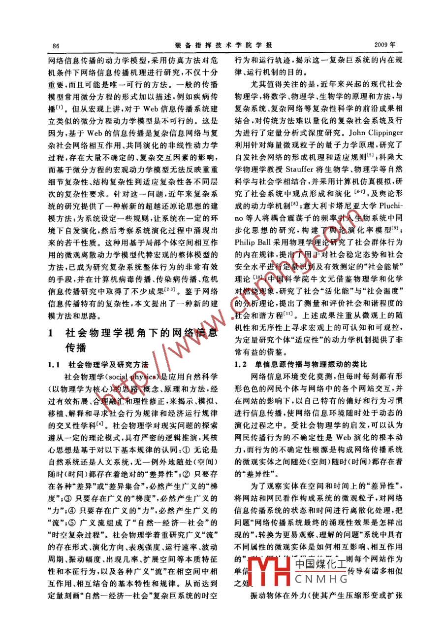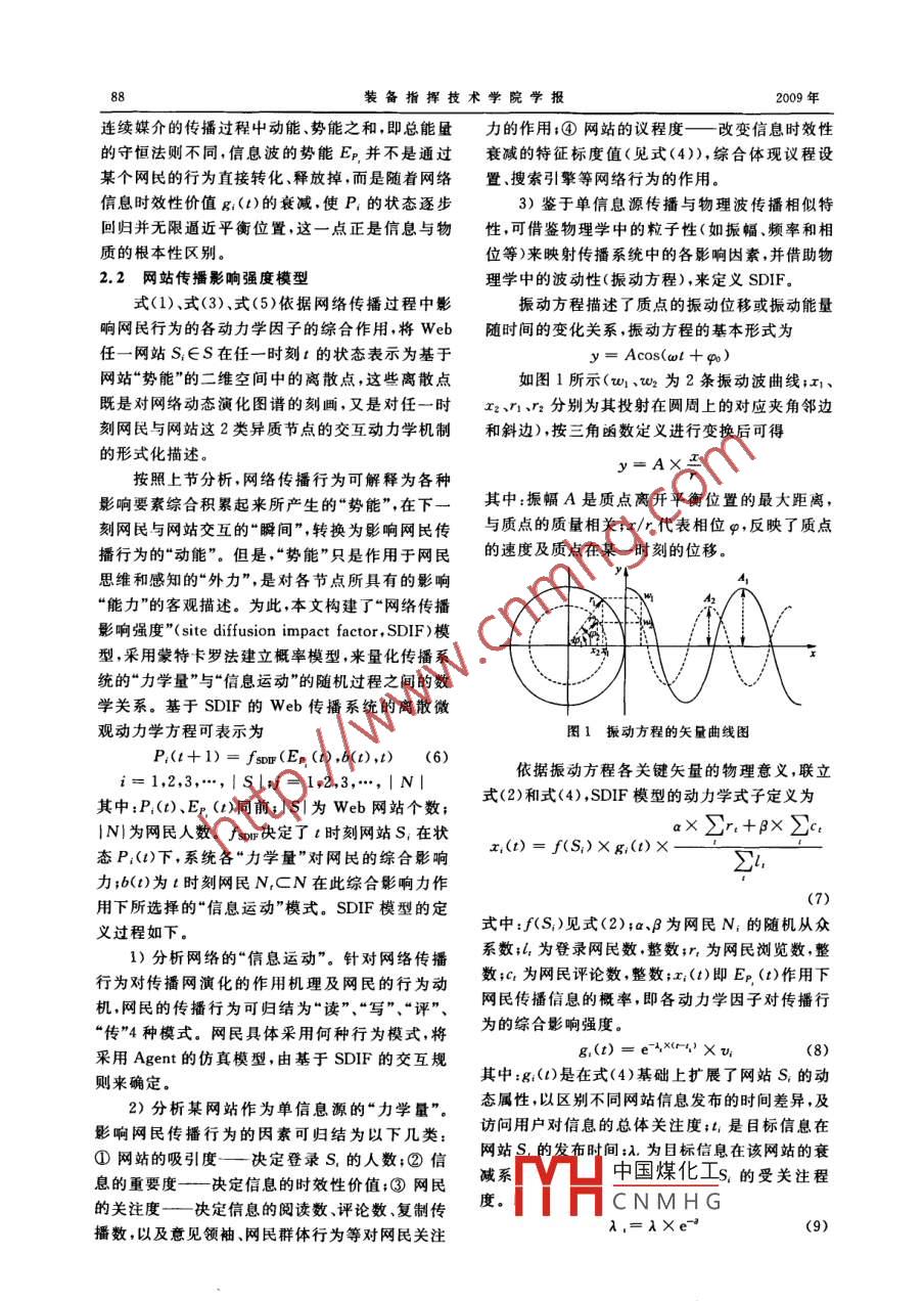2009年裝備指揮技術(shù)學(xué)院學(xué)報(bào)June 2009第20卷第3期Journal of the Academy of Equipment Command TechnologyVol 20 No. 3網(wǎng)絡(luò)信息傳播動(dòng)力學(xué)研究賀筱媛,胡曉峰,司光亞,羅批(國(guó)防大學(xué)信息作戰(zhàn)與指揮訓(xùn)練教研部,北京100091)摘要:對(duì)網(wǎng)絡(luò)傳播機(jī)理建模是運(yùn)用網(wǎng)絡(luò)和實(shí)施控制的基礎(chǔ)。針對(duì)Web信息傳播系統(tǒng)特有的復(fù)雜性,借鑒社會(huì)物理學(xué)的基本思想,對(duì)網(wǎng)絡(luò)狀態(tài)進(jìn)行了離散化定義,并根據(jù)單信息源傳播與機(jī)械波類比特征的相似性,提出了一種網(wǎng)站傳播影響強(qiáng)度模型,從微觀層面模擬網(wǎng)民個(gè)體在瞬態(tài)時(shí)間點(diǎn)上與離散的網(wǎng)站個(gè)體交互時(shí),網(wǎng)絡(luò)傳播系統(tǒng)各動(dòng)力學(xué)因子對(duì)網(wǎng)民傳播行為的動(dòng)態(tài)影響力;在此基礎(chǔ)上,采用蒙特卡羅法將該模型與基于 Agent仿真模型的個(gè)體交互規(guī)則相結(jié)合,建立了Web信息傳播仿真模型。模型的運(yùn)行結(jié)果能很好與實(shí)證研究相互印證,為類似問題的建模提供了一種新的思路關(guān)鍵詞:復(fù)雜網(wǎng)絡(luò);信息傳播機(jī)制;社會(huì)物理學(xué);微觀動(dòng)力學(xué)建模中圖分類號(hào):E911;TP391.9文章編號(hào):1673-01272009)03-008506文獻(xiàn)標(biāo)識(shí)碼:ADOI:10.3783/j.issn.1673-0127.2009.03.020Dynamics Research of Information Diffusion on the InternetHE Xiaoyuan, HU Xiaofeng, SI Guangya, LUO Piepartment of Information Operation & Command Training, NDU of PLA, Beijing 100091, China)Abstract: Modeling the mechanism of information diffusion is the basis of handling and control-ling network. a discrete definition, which is aiming at the specific complicacy of web information, isgiven to the network state, some basic ideas from social physics is also used as reference. Based on thecharacter similarity between information diffusion of a single information source and mechanicalwaves,a model of influence intensity on network diffusion is presented. This model simulated the dynamical influence of every dynamical factors in the diffusion system on web user, when he/she interactwith discrete nework at microscopic level. With Monte-Carlo method and combined this model with a-gent-based interact rules, a web information diffusion simulation model is built. The running resultsare well consist of real empirical results. This model provides a new approach for similar modeling.Key words: complex network; mechanism of information diffusion; social physics; microcosmicdynamics model因特網(wǎng)以其前所未有的傳播優(yōu)勢(shì)和巨大影響具特色的、新的作戰(zhàn)樣式。但是,由于目前對(duì)網(wǎng)絡(luò)力,已成為信息社會(huì)擁有強(qiáng)大社會(huì)影響力和輿論傳播機(jī)理尚沒有完全掌握,對(duì)危機(jī)條件下敏感信動(dòng)員力的重要傳播工具。尤其在戰(zhàn)爭(zhēng)期間,基于息的破壞性尚無法控制,傳統(tǒng)的研究方法還多屬網(wǎng)絡(luò)媒體實(shí)施的輿論戰(zhàn)、新聞戰(zhàn)等,已成為一種獨(dú)于直接對(duì)網(wǎng)絡(luò)特性進(jìn)行實(shí)證研究。因此,建立起收稿日期:2008-12-19基金項(xiàng)目:網(wǎng)家自然科學(xué)基金資助項(xiàng)目(60774035)作者簡(jiǎn)介:賀筱幔,女,博士研究生,主要研究方向:戰(zhàn)爭(zhēng)模擬系統(tǒng)與環(huán)境中國(guó)煤化工CNMHG裝備指揮技術(shù)學(xué)院學(xué)報(bào)網(wǎng)絡(luò)信息傳播的動(dòng)力學(xué)模型,采用仿真方法對(duì)危行為和運(yùn)行軌跡揭示這一復(fù)雜巨系統(tǒng)的內(nèi)在規(guī)機(jī)條件下網(wǎng)絡(luò)信息傳播機(jī)理進(jìn)行研究,不僅十分律、運(yùn)行機(jī)制的目的。重要,而且可能是唯一可行的方法。一般的傳播尤其值得關(guān)注的是,近年來興起的現(xiàn)代社會(huì)模型常用微分方程的形式加以描述,例如疾病傳物理學(xué),將數(shù)學(xué)、物理學(xué)生物學(xué)的原理和方法,與播。但從宏觀上講,對(duì)于web信息傳播系統(tǒng)建復(fù)雜系統(tǒng)、復(fù)雜網(wǎng)絡(luò)等復(fù)雜性科學(xué)的前沿成果相立類似的微分方程動(dòng)力學(xué)模型是不可行的。這是結(jié)合,對(duì)傳統(tǒng)方法難以量化的復(fù)雜社會(huì)系統(tǒng)及行因?yàn)?基于web的信息傳播是復(fù)雜信息網(wǎng)絡(luò)與復(fù)為進(jìn)行了定量分析式深度研究。 John Clippinger雜社會(huì)網(wǎng)絡(luò)相互作用、共同演化的非線性動(dòng)力學(xué)利用針對(duì)海量微觀粒子的量子力學(xué)原理,研究了過程,存在大量不確定的、復(fù)雜交互因素的影響,自發(fā)社會(huì)網(wǎng)絡(luò)的形成機(jī)理和適應(yīng)規(guī)則;科隆大而基于微分方程的宏觀動(dòng)力學(xué)模型無法反映重重學(xué)物理學(xué)教授 Stauffer將生物學(xué)、物理學(xué)等自然細(xì)節(jié)復(fù)雜性、結(jié)構(gòu)復(fù)雜性到適應(yīng)復(fù)雜性各不同層科學(xué)與社會(huì)學(xué)相結(jié)合,并采用計(jì)算機(jī)仿真模擬,研次的復(fù)雜性要求。針對(duì)這一問題,近年來復(fù)雜系究了社會(huì)系統(tǒng)中觀點(diǎn)形成和演化【,及輿論形統(tǒng)的研究提供了一種嶄新的超越還原論思想的建成的動(dòng)力學(xué)機(jī)制。;意大利卡塔尼亞大學(xué) Puchi模方法:為系統(tǒng)設(shè)定一些規(guī)則,讓系統(tǒng)在一