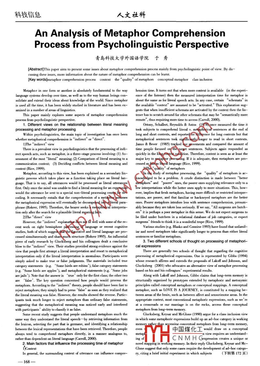 科技信息人文社科torical allusions and legends which influence the understanding of the lan-Therefor, we should never neglect customary culture in diferent lan-guage. In ancient times, Britain was once conquered by Julius Caesar, andguages, or we may sonetines fall into a language trap and become a laughingClaudius from Rome Empire, s0 English is deeply inluenced by Roman cul-stick.ture and Greek culture. Some simple stnuctures express very profound mean-3. Conclusionings. The stories in the Bible, in Greek mythology, in Roman mythology, andLanguage and culture are very closely related. Trunslation means trans-in Aesops' fables influence English greatly, too. As for“Achille's hee!", if weating the culture of a language. Through this article, we can find that bothChinese and English vary in their respective cultures. There are also somenerale point. "'The Trojan Horse" also comes from the Trojan War. The hugeother factors infuence English -Chinese translation, which need our atentionwooden horse left in Trojan is full of danger, which causes the eity intoand research.Greeks' hands. There are some other idioms, suchas "Grek's git"(害人的English leamers should continue to enrich their mind with cultural禮物),“Juda's kiss' (死亡之吻),“Pandora's box' (災(zāi)難之源)“the last sup-knowledge, and distinguish cultural differences between both languages. Forper' '(最后的晚簀) which are the rllction of historical culture.English teachers, they must change the teaching methods. If the teachers onlyLove is blind. Whe we translate it into Chinese, we ofen say“情人眼里focus on grammar and pronunciation teaching, studentsnot leam the出西施"."Love is blind" is from Westerm culure. It is about Cupid, who isfrom Roman mythology and Eros, but there are no Cupid or Eros in Chinese.Therefore, they can not do good translation work. Teachers should strengthenWhen we translate such idiom we do it in very chinese version.cuture education and guide students to contact with Westem eulture materials5)Customary Cultureextensively, and improve their eros8- -cultural awareness. Only in this way, canCustomary Culture shows thal, people in daily life, form their nationalEnglish leamers make fewer mistakes in comprehending the original and rep-customs and habits. In Chinese, we call offe table“茶幾", but not“咖啡resenting the target language.桌". Because in the long history, Westermers have developed the habit ofdrinking clfe. but in China, people prefer drinking tea. According to the dif-Referencesferent customs, we use diflemnet ways of expression, for example, brown bread[1]陳定安.英漢比較與翻譯.中國(guó)對(duì)外翻譯出版公司2002.(黑面包),brown sugar(紅糖), black lea(紅茶), and green- eyed(嫉妒).●[2]賈德江英漢語(yǔ)對(duì)比研究與翻譯,國(guó)防科技大學(xué)出版社2002.“Bright red costomes, with hats, shoes, and stockings to match are to be[3]金惠康跨文化交際翻譯.中國(guó)對(duì)外翻譯出版公司,2003.all the craze in the spring, smart women will have to be careful not to be yawn[4]金惠康跨文化交際翻譯續(xù)篇中國(guó)對(duì)外翻譯出版公司,004.in the street in case some short sighted person is on his way to post a ltter .[5]李海燕.論英漢習(xí)語(yǔ)中的文化存異與認(rèn)同現(xiàn)象.內(nèi)蒙古大學(xué)報(bào),If we don't understand the postbox in England is red, it is dificult for us005,3.senteneeto understand this sentence.[6]劉桂琴.試論文化差異在翻譯中的體現(xiàn)安徽大學(xué)學(xué)報(bào),2004,5.(上接第168頁(yè))were given metaphorical with minimal context andhension." Journal of Verbal Leaming and Verbal Behavior, 17, 465-477.asked to paraphrase them (Rohrer, 1995).[6]anus, R.. & Bever, T. 1985. "Processing metaphoric language: An4. Conclusioninvestigation of the three stage model of metaphor comprehension." JournalRecent study suggests that people understand metaphors much the sameof Psycholinguistic Reseatch, 14, 473-487.way they understand the literal speech. Context and the "quality" of[7]lasko, D.. & Connine, C.1993. "fects of familiariy and aptnessphors can inluence the processing time of metaphors. As to the cognitiveon metaphor processing,” Joumal of Experimental Psychology: Learningprocessing of metaphorical expressions, dilerent schools of thought hold dif-Memory, and Cognition, 19, 295 -308.ferent opinions. In fact, we should note that both perspectives are essential for[8]Gentner, Dedre, Brian F. Bowdle, Phillip Wolf, and Consuelous to learm metaphor process.Boronat. 2001. Mectaphor is likeanalogy. In The analogical mind: perspec-tives from cognitive science, eds. Gentner, Dedre et a..199- 253. Cam-bridge, Mass; London: MIT Press.[1]Rice, Stanley. 1999. Information as metaphor. Autospec, Inc.[9 ]Gibbs, Raymond. 1994. The Poetics of Mind: Figuraive Thought,[2]Rohrer, Tim.1995. The cognitive science of metaphor from phi-Language and Understanding, Cambridge, Eng: Cambidge Universitylosophy to neuropsychology.[3. ]Glucksberg, s. 2001. Undestanding Figurative Language. OUP.[10]Lakof, G. and Johnson, M. 1980. Metaphors We Live By,[4C]aroll, D. w.2000.語(yǔ)言心理學(xué).北京:外語(yǔ)教學(xué)與研究出版Chicago and London: University of Chicago Pres.社,[11 ]Glucksberg. Samn, B. Keysar and M. McGlone. 1990. “Mectaphor[5 ]Ortony, Andrew, D. Schallert, R. Reynolds and S. Antos. 1978.understanding and acessing conceptual schema: Reply to Gibbs (1992)."“Interpreting metaphors and idioms: Some ffects of context on compre-Psychological Review, 99, 578 -581.(上接第170頁(yè))Grammar. Tokyo: The Japan Times.[6 ]Malinowski, B. 1923. The problem of meaning in primitive lan-[1 ]Blakemore, D.2004. Discourse markers. In L. Hom and G. Wardguages. Supplement to Ogden, CK. and Richards, 1.A.(1989: 296 -36).6(Ed,), The Handbook of Pragmatis. Austali: Blackwell Publishing,[7]Marin, s