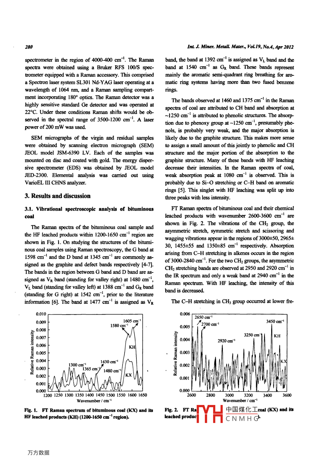 International Journal of Minerals, Metallurgy and MaterialsVolume 19, Number 4, Apr 2012, Page 279Do!:10.1007/s12613012055140Chemical leaching of an Indian bituminous coal and characterization of theproducts by vibrational spectroscopic techniquesB. Manoj2)and A.G. Kunjomana"1)Department of Physics, Christ University, Hosur Road, Bangalore-29 Kamataka 560029, India2)Research and Development Centre, Bharathiar University, Coimbatore, Tamil Nadu, lodia(Received: 29 April 2011: revised: 28 November 2011; accepted: 29 November 201l)Abstract: High volatile bituminous coal was demineralized by a chemical method. The vibrations of the"aromatics"structure of graphite,crystalline or non-crystalline, were observed in the spectra at the 1600 cm" region. The band at 1477 cm is assigned as Va band, the bandat 1392 cm as Vi band and the band at 1540 cm as Gr band. Graphite structure remains after chemical leaching liberates oxygenatedfunctional groups and mineral groups. The silicate bands between 1010 and 1100 cm" are active in the infrared (IR)spectrum but inactive inthe Raman spectrum. Absorption arising from C-H stretching in alkenes occurs in the region of 3000 to 2840 cm". Raman bands because ofsymmetric stretch of water molecules were also observed in the spectrum at 3250 cm"and 3450 cm". Scanning electron microscopy analysis revealed the presence of a graphite layer on the surface. Leaching of the sample with hydrofluoric acid decreases the mineral phase andincreases the carbon content. The ash content is reduced by 845wt%with leaching from its initial value by mainly removing aluminum andsilicate containing mineralsKeywords: bituminous coal; characterization; graphite; leaching,mal spectroscopy;ash content of the coal. It will in turn affect the quality of1. Introductioncoal as fuel. Concerted efforts are there to demineralize theRaman spectroscopy had been used extensively to char-coal samples to get mineral free coal [4-5]. In the presentacterize the structural features of carbonaceous matter sincestudy, the change of functional groups and mineral groupTuinstra and Koenig [1] first correlated Raman bands towith hydrofluoric acid (HF) leaching on high volatile Indianstructural parameters measured from X-ray diffraction coal was investigated by IR and Raman spectroscopy. Su(XRD)of polycrystalline graphite. Raman spectroscopy had face characteristics of very low ash bituminous coal ob-also been applied to study the structural features of tained after chemical demineralization were carried out withcoal-derived products [2-3]. In these studies, the Raman scanning electron microscopy(SEM) and energy dispersivespectral characteristics, mainly those of graphite(G)and spectroscopy (EDS)defect bands(D), were used to investigate the coal structuresand their correlation to other characteristics, e.g. coal rank2. Experimentaland the 'graphite crystalline size parameters. In nearly allspectro"copic studies of organic and inorganic materials it is dried in a dessicator to remove the absorbed water. Samples30%10%for24halong with Fourier transform infrared(FTIR) spectra. Thewashed with enormous amounts of distilled water. Thetwo methods are completely complementary and could pro- slurry was filtered and dried at about 80 C for removing thevide considerable structural information when used together.absorbed water and allowed to cool slowly in a dessicator.The minerals present in coal play a significant role in the The Ftir spectrum was recorded by a Shimadzu FTIR-8400orresponding author: B Manoj E-mail: manoj b@christuniversity in中國煤化工SpringerO University of Scicnce and Technology Beijing and Springer-Verlag Berlin Heidelberg 2012CNMHGInt J. Miner. MetalL Mater oL19, No4, Apr 2012pectrometer in the region of 4000-400 cm". The Raman band, the band at 1392 cm"is assigned as vl band and thespectra were obtained using a Bruker RFS 100/S spec- band at 1540 cm"as gr band. These bands representtrometer equipped with a Raman accessory. This comprised mainly the aromatic semi-quadrant ring breathing for aro-a Spectron laser system SL301 Nd-YAG laser operating at a matic ring systems having more than two fused benzenewavelength of 1064 nm, and a raman sampling compart- rings.ment incorporating 1800 optics. The Raman detector was aThe bands observed at 1460 and 1375 cm in the ramanhighly sensitive standard Ge detector and was operated at22C. Under these conditions raman shifts would be ob.spectra of coal are attributed to Ch band and absorption at1250 cm is attributed to phenolic structures. The absorp-served in the spectral range of 3500-1200 cm. A laserpower of 200 mw was used.tion due to phenoxy group at-1250 cm, presumably phe-ols, is probably very weak, and the majorA SEM micrographs of the virgin and residual samples likely due to the graphite structure. This makes more sensewere obtained by scanning electron micrograph(sEM) to assign a small amount of this jointly to phenolic and ChJEOL model JSM-6390 LV. Each of the samples was structure and the major portion of the absorption to themounted on disc and coated with gold. The energy disper- graphite structure. Many of these bands with HF leachingsive spectrometer(EDS) was obtained by JEOL model decrease their intensities. In the Raman spectra of coal,JED-2300. Elemental analysis was carried out using weak absorption peak at 1080 cm is observed. This isVaroEL III CHNS analyzerprobably due to Si-O stretching or C-H band on aromaticrings [5]. This singlet with HF leaching was split up into3. Results and discussionthree peaks with less intensity.3. 1. Vibrational spectroscopic analysis of bituminousFT Raman spectra of bituminous coal and their chemicalleached products with wavenumber 2600-3600 cm"areThe Raman spectra of the bituminous coal sample andshown in Fig. 2. The vibrations of the CH2 group, thethe HF leached products within 1200-1650 cm"region areasymmetric stretch, symmetric stretch and scissoring andshown in Fig. 1. On studying the structures of t