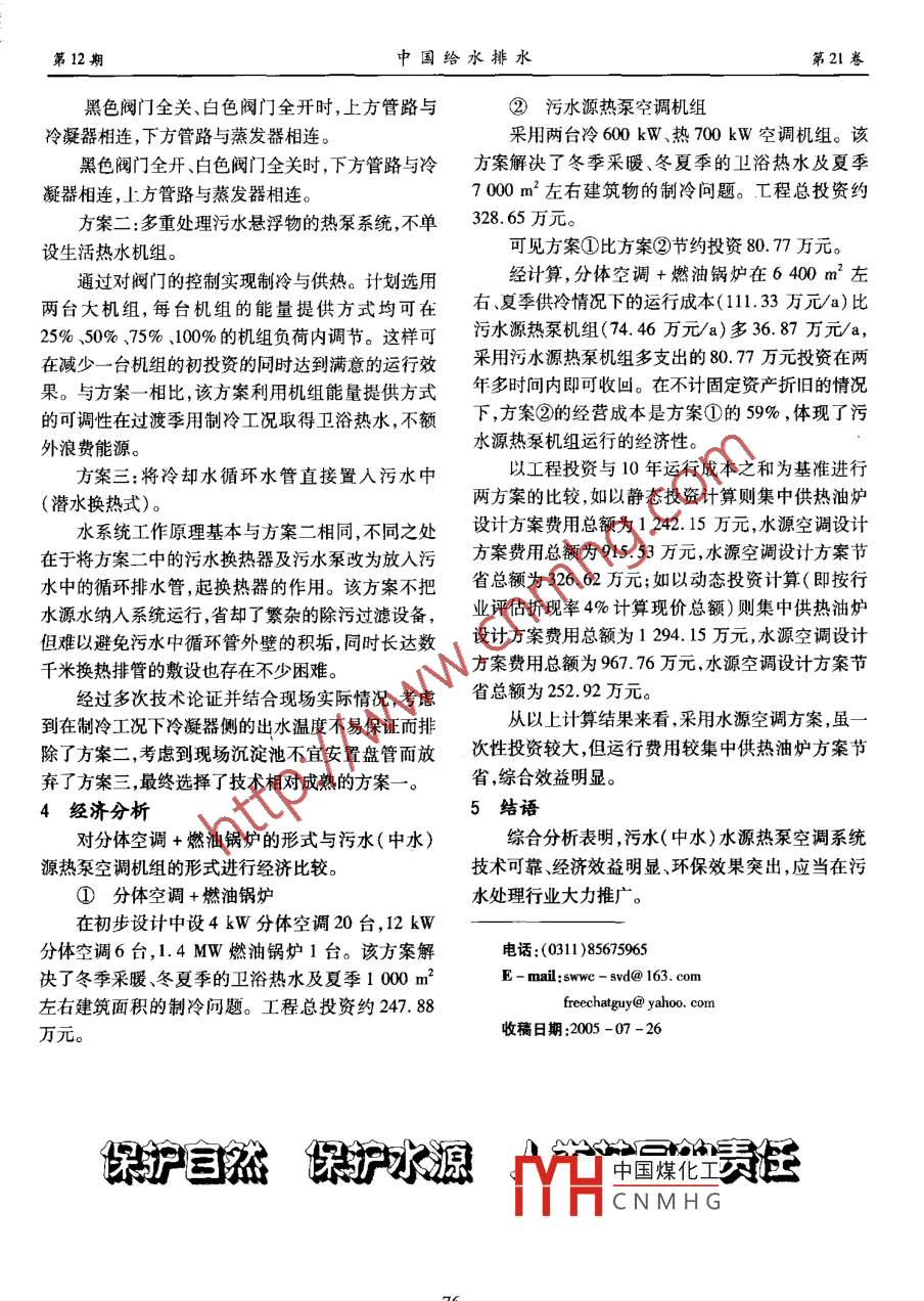 第21卷第12期中國(guó)給水排水Vol.21 No. 122005年12月CHINA WATER & WASTEW ATERDec.2005橋東污水廠污水(中水)源熱泵系統(tǒng)設(shè)計(jì)江雄志,趙會(huì)芳,劉炳虎,李超(石家莊市橋東污水治理工程籌建處,河北石家莊050031)摘要:闡述了石家莊市橋東污水處理廠工程中污水(中水)源熱系系統(tǒng)的實(shí)施方案。介紹了采用污水水源的防污措施及水系統(tǒng)的循環(huán)方式等設(shè)計(jì)要點(diǎn),并在節(jié)能、投資及運(yùn)行費(fèi)用等方面與傳統(tǒng)方式進(jìn)行了比較。關(guān)鍵詞:污水處理廠; 污水(中水)水源; 熱泵技術(shù)中圖分類號(hào): X706文獻(xiàn)標(biāo)識(shí)碼: C文章編號(hào): 1000 -4602(2005)12 -0074 -03Design for Wastewater ( Reclaimed Water) Source Heat PumpSystem in Qiaodong Wastewater Treatment PlantJIANG Xiong-zhi,ZHAO Hui-fang,LIU Bing-hu,LI Chao( Construction Preparatory Department of Shiyjazhuang City Qiodong Wastevater TreatmentProject , Shijiazhuang 050031 , China)Abstract: The implementation plan was described for wastewater ( reclaimed water) source heatpump in Qiaodong Wastewater Trealment Plant project. The measures for pollution prevention and themain design for recycling mode of the water system were introduced. Comparison was made with tradition-al method in the aspects of energy-saving, investment ,and operating cost.Key words: wastewater treatment plant; wastewater ( reclaimed water) source; heat pumptechnology石家莊市橋東污水處理廠為利用世界銀行貸款1工程建設(shè)內(nèi)容的河北省城市環(huán)境項(xiàng)目之一,該廠處理能力為50 x水源熱泵空調(diào)工程主要由水源熱泵制冷(熱)10* m'/d,中水回用量為30x10* m'/d。廠區(qū)行政站、污水(二級(jí)處理水)采集站、連接污水采集站與及生產(chǎn)性建筑物總計(jì)約1 x10* m2。制冷(熱)站、空調(diào)站和用戶之間的管道系統(tǒng)組成。在建筑物能源設(shè)計(jì)上,原方案為分體空調(diào)+燃1.1 水源熱泵制冷(熱)站油鍋爐,這種能源采集方式能耗高、效益差、污染環(huán)包括水源熱泵空調(diào)機(jī)組、室內(nèi)管路連接系統(tǒng)循境。經(jīng)過技術(shù)咨詢與實(shí)地考察,提出了污水(中水)環(huán)水泵、除污裝置、水箱、水處理器等設(shè)備。水源熱泵空調(diào)方案,該技術(shù)高效節(jié)能,可以滿足污水空調(diào)站冷負(fù)荷為1 050 kW,熱負(fù)荷為1 200工程冬季采暖、夏季制冷的需要,且具有明顯的經(jīng)濟(jì)kW ,另有300 kW的常年使用的洗浴熱負(fù)荷(均未效益和環(huán)境效益。在按照世行采購(gòu)規(guī)定(《廠區(qū)設(shè)計(jì)人熱耗及適當(dāng)富余量)。備的供貨與安裝》,俗稱“紅皮書”)完成工程招標(biāo)后與中標(biāo)單位簽訂了施工合同,此合同附帶性能保證中國(guó)煤化工壓器間)控制在400(夏季制冷:回水溫度≤14C;冬季供熱:回水溫度m2CHCNMHG≥45 C ;洗浴:供水溫度≥52 C ;功率:制冷COP≥1.2 空調(diào)水源水采集站4.5 ~5.0,供熱C0P≥4.0)。包括采集站內(nèi)的管道、污水泵、格柵等。工程分,74●第12期江雄志,等:橋東污水廠污水(中水)源熱泵系統(tǒng)設(shè)計(jì)第21卷三步進(jìn)行:Gu①綜合樓使用后而污水處理工藝未運(yùn)行前,epS利用污水作空調(diào)熱泵水源。在污水進(jìn)廠總配水井建式中G一- -設(shè)計(jì)流量,按4 C溫降計(jì)算為200 Vh設(shè)污水采集系統(tǒng)。ρ一水的密度②在橋東污水處理廠 運(yùn)行后,利用二級(jí)出水?dāng)嗝婷娣e作空調(diào)熱泵水源。建設(shè)二級(jí)出水采集系統(tǒng)。-格柵過水面積修正系數(shù)③在中水廠建成運(yùn)行后,利用中水作空調(diào)熱格柵的網(wǎng)眼大小定為d=3 mm ,故可計(jì)算出ε泵水源。建設(shè)中水采集系統(tǒng)。=0.25 ,u=0.32 m/s。1.3變電所及 空調(diào)站電氣設(shè)備安裝反沖洗通過兩個(gè)電磁閥控制,依次打開兩個(gè)出空調(diào)站按三類用電負(fù)荷供電,在污水廠總變電水口,可獲得兩倍的流速,能有效沖刷掉格柵上的污所的基礎(chǔ)上.增設(shè)-臺(tái)高壓開關(guān)柜作為新變電所的物,保證格柵不被堵塞。10 kV供電電源。3水循環(huán)系統(tǒng)的設(shè)計(jì)新變電所與空調(diào)站合建,采用一臺(tái)630 kVA變根據(jù)不同的防污方案及設(shè)備提出三套水循環(huán)方壓器作為空調(diào)站的動(dòng)力中心,供應(yīng)站內(nèi)全套設(shè)備用案。電,內(nèi)設(shè)高低壓配電室、值班室。方案一:防污措施為設(shè)置污水換熱器與中介水空調(diào)站內(nèi)采用380/220 V配電,低壓380 V采系統(tǒng),生活熱水設(shè) 專用機(jī)組。用三相四線制,中性點(diǎn)直接接地系統(tǒng),放射式配電。熱泵水系統(tǒng)工作原理見圖1。2防污措施通過技術(shù)咨詢及項(xiàng)目考察,發(fā)現(xiàn)以污水(中水)高位水籍為水源的熱泵空調(diào)系統(tǒng)需要解決的主要技術(shù)難題為高含量懸浮物的堵塞和污水對(duì)機(jī)組的腐蝕、結(jié)垢及,浮球閥補(bǔ)水.鐵細(xì)菌的繁殖。為解決以上問題,選擇了設(shè)置污水中55T熱水箱換熱站與中介水系統(tǒng)的方案:污水僅僅通過換熱器,接高位格供應(yīng)面的水箱熱件讓中介水通過機(jī)組可以有效防止污水中的懸浮物及霉菌對(duì)機(jī)組(結(jié)垢)的影響,同時(shí)通過選擇換熱器材上10污水菜9凸污水換熱器質(zhì)解決污水腐蝕和鐵細(xì)菌的繁殖問題。鑒于冬季污水溫度較低,要求換熱器的工作特點(d