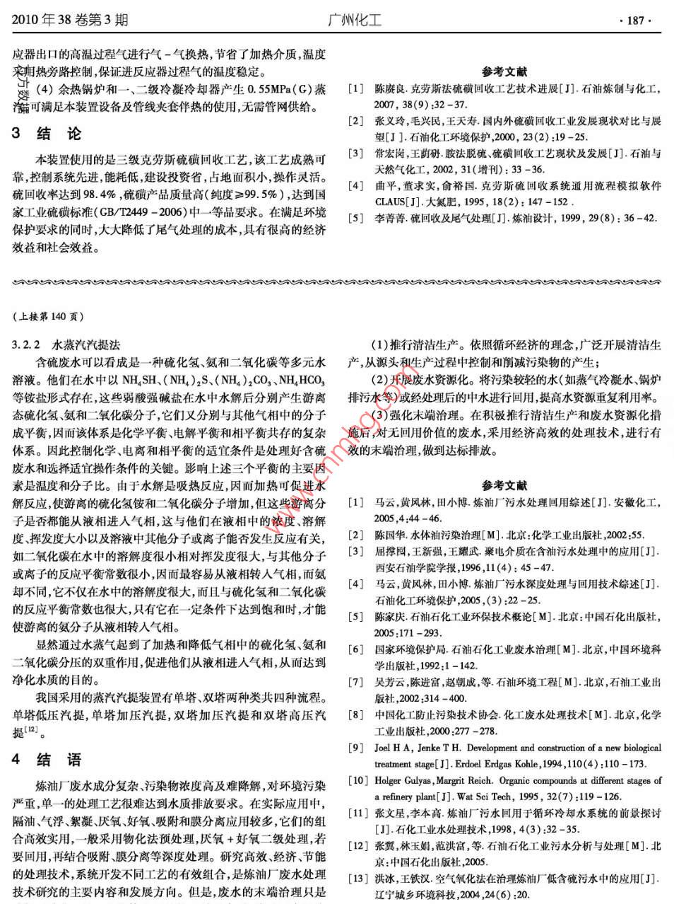 2010年38卷第3期廣州化工●139.煉廠污水水質(zhì)的變化及處理技術(shù)變革鋪馬斌",張鋒2( 1蘭州石化公司化工研究院,甘肅蘭州730060; 2蘭州石化公司煉油廠,甘肅蘭州730060)摘要:煉油企業(yè) 發(fā)展壯大與水資源嚴(yán)重短缺矛盾日益尖銳,這就迫切需要對(duì)煉廠污水處理技術(shù)進(jìn)行研究開發(fā)。本文簡(jiǎn)要介紹了煉油廠污水的主要特征及煉廠污水的來源與分類,并對(duì)煉廠各類污水的處理技術(shù)進(jìn)行了綜述。關(guān)鍵詞:煉油廠污水;特征;分類;處理技術(shù)Reform of Wastewater Treatment and Changes in Water Quality in RefineryMA Bin' ,ZHANG Feng2(1 Research Institute of Lanzhou Petrochemical Company,Gansu Lanzhou 730060;2 Lanzhou Petrochemical Company Refinery,Gansu Lanzhou 730060, China)Abstract: With the development of refinery, the shortage of water became more and more serious. This issue neededresearch about wastewater treatment technology in refinery. The main characteristics and resources and sorts of wastewaterin refinery were introduced and the treatment technologies of all kinds of wastewater in refinery were reviewed.Key words: waste water in refinery; character; sort; treatment technology煉廠污水是-一種很難處理的工業(yè)廢水,污染物種類多、濃度水搞好污水處理,對(duì)各個(gè)地區(qū)經(jīng)濟(jì)和社會(huì)可持續(xù)發(fā)展至關(guān)重高,并且由于我國的石油中重質(zhì)油和含碗原油相對(duì)密度大,增加要;了煉油的難度"。目前國外煉油廠每加工1t 原油產(chǎn)生0.5~(2)廢水組成復(fù)雜:石油化工廢水中除含有油、硫、酚、氰化1. 0t廢水,我國煉油廠每加工1t原油產(chǎn)生0.7 ~3.5t含油廢物 、COD外,還含有多種有機(jī)化學(xué)產(chǎn)品。廢水中的主要污染物,水*。我國的煉油工業(yè)污水--般采用“隔油-浮選-生化”的處一般可概括為烴類和可溶解的有機(jī)和無機(jī)組分,其中可溶解的理工藝,絕大多數(shù)煉油企業(yè)的外排水雖可以達(dá)標(biāo),但煉油污水的無機(jī)組分主要是硫化氫氨化和物及微量的重金屬;可溶解的有排放量逐年增加。目前我國僅煉廠就向環(huán)境排放1.47億~7.35機(jī)組分大多能被微生物所降解,亦有小部分難以生物降解;億t污水,而我國人均水資源還不到世界平均水平的1/4。煉(3)廢水水質(zhì)隨加工原油的性質(zhì)、工藝過程和方法的不同油企業(yè)發(fā)展壯大與水資源嚴(yán)重短缺矛盾日益尖銳,這也為煉油而異。廠污水處理技術(shù)的發(fā)展提供了一一定的機(jī)遇。 因此,研究適宜的2煉廠污水的分類污水處理技術(shù)以保證煉油污水循環(huán)回用顯得十分必要。為了有效地治理煉廠污水,通常將煉廠污水劃分為:含油污1煉廠 污水的特征水、冷卻污水、含碗污水、含堿污水、含酸污水、含鹽污水、含酚污煉油污水是電脫鹽、常減壓催化裂化等工段產(chǎn)生的污水匯水、生活污水和非污染污水(即假定污水)等九類(6-8] ,其中最主集而成,其性質(zhì)與原油的組成,特別是非烴類、水中雜質(zhì)和加工要的為含油污水和含碗污水。工藝等密切相關(guān),是一種集懸浮油、乳化油、溶解有機(jī)物及鹽于2. 1含油污水-體的多相體系B]。其-般組成與性質(zhì)如表1所示4。含油污水主要來源是油氣和油品的冷凝分離水、油氣和油表1煉油污水主要污染物及排放標(biāo)準(zhǔn) (mg/L)品的洗滌水、反應(yīng)生成水、機(jī)泵填料麗冷卻水化驗(yàn)室排水、油罐車水油槽車洗滌水、煉油設(shè)備洗滌排水、地面沖洗水等。污染物石油類CODBOD硫化物 揮發(fā)酚懸浮物氨氮含油污水在水面形成油膜,阻礙氧氣進(jìn)入水體,且易粘附和含量20-200 10~1200 50~100 20~60 0.1-0.5 2-400 4-~30 .填塞魚的鰓部,使魚類窒息死亡。在含油污水污染的水域中孵排放標(biāo)準(zhǔn)10150301.00.5250 25化的魚苗多為畸形,易于死亡。同時(shí)會(huì)嚴(yán)重影響水生生物的生長;降低水域的自凈能力,影響岸邊的環(huán)境衛(wèi)生和植物的生存,煉廠廢水具有以下特點(diǎn)(51:降低海灘的使用價(jià)值?!?40廠廣州化工2010年38卷第3期收[6]水色度、臭味和COD等,但處理成本較高,且容易造成二次污染。22含硫污水在石油化工廢水處理中,吸附常與臭氧氧化或絮凝聯(lián)用8。樓含碗污水主要來源于煉油廠二次加工裝置分離罐的排水、3.1.1.5膜分離菌(洗漲水等。這部分廢水含有較高的硫化物、氨,同時(shí)含有膜分離主要包括反滲透、納濾、超濾和微濾,能有效脫除廢酚氰化物和油類等污染物,具有強(qiáng)烈的惡臭,不能直接排人污水的色度、臭味,除去多種離子、有機(jī)物和微生物,出水水質(zhì)穩(wěn)定水處理場(chǎng),必須進(jìn)行預(yù)處理,并回收有用物質(zhì)。含硫污水中污染可靠,占地面積小,運(yùn)行操作完全自動(dòng)化,被稱為“21世紀(jì)的水處物的濃度隨著原油中碗、氮含量的增加和加工深度的提高而增理技術(shù)”,但是需要投資大,污水處理量小時(shí)。加。3.1.2化學(xué)法含硫污水除了具有含油污水的危害之外,還能大量消耗水化學(xué)處理法主要有絮凝、化學(xué)氧化、消毒、離子交換石灰處中的氧氣,使水體缺氧。排入水體后,當(dāng)含酚量為0.1 ~0. 2mg/L理、電化學(xué)和光化學(xué)處理等。絮凝是指投加無機(jī)或有機(jī)化學(xué)藥時(shí),則會(huì)使魚類有酚味,甚至死亡,使海帶等水生植物腐爛(6-7]。劑使膠體脫穩(wěn),凝結(ji