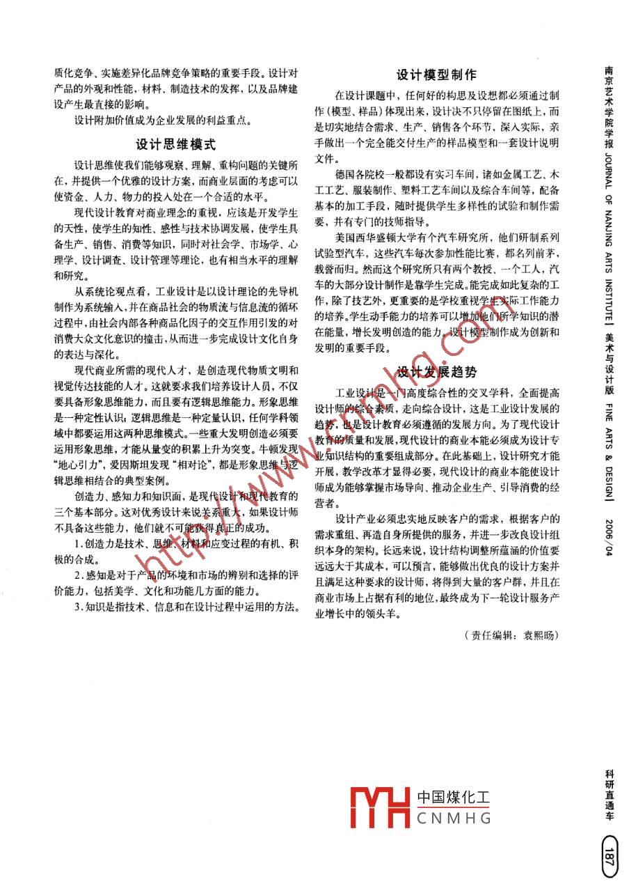設(shè)計(jì)的商業(yè)本能戰(zhàn)捷(深糊大學(xué)藝術(shù)設(shè)計(jì)學(xué)院。 深圳518060)(擁要]21世紀(jì)交革前沿的設(shè)計(jì),正在將其核心競(jìng)爭(zhēng)力從以往的設(shè)計(jì)圖紙轉(zhuǎn)化為設(shè)計(jì)理念。從表現(xiàn)風(fēng)格轉(zhuǎn)向設(shè)計(jì)創(chuàng)新,從關(guān)注造型特向注重商業(yè)層面的成功。設(shè)計(jì)正越來越顯示商業(yè)的本能,成為企業(yè)核心競(jìng)爭(zhēng)力的一個(gè)重要環(huán)節(jié)。[關(guān)鍵詞]設(shè)計(jì),商業(yè)本能,競(jìng)爭(zhēng)力9[中圖分類號(hào)]J502[文獻(xiàn)標(biāo)識(shí)碼]A[文章編號(hào)]1008-9675 (2006) 04- -0186-02設(shè)計(jì)引導(dǎo)消費(fèi)企業(yè),都設(shè)有專們的新產(chǎn)品開發(fā)部,許多中小企業(yè)也有專21世紀(jì)變革前沿的設(shè)計(jì),正在將其核心競(jìng)爭(zhēng)力從以往人從事新產(chǎn)品的研究與開發(fā)。在新的產(chǎn)業(yè)革命推動(dòng)下,世的設(shè)計(jì)圖紙轉(zhuǎn)化為設(shè)計(jì)理念,從表現(xiàn)風(fēng)格轉(zhuǎn)向設(shè)計(jì)創(chuàng)新,界已進(jìn)入設(shè)計(jì)時(shí)代。 在一些發(fā)達(dá)國(guó)家,設(shè)計(jì)已被列入政府從關(guān)注造型轉(zhuǎn)向注重商業(yè)層面的成功。企業(yè)要將設(shè)計(jì)視為宏觀決策之中,工業(yè)設(shè)計(jì)成為振興經(jīng)濟(jì)、擴(kuò)大出口、提高-種能夠影響企 業(yè)戰(zhàn)略和組織結(jié)構(gòu)的多面型的職能部門商品附加值、 增強(qiáng)競(jìng)爭(zhēng)力的戰(zhàn)略武器,并且是樹立企業(yè)形-這些職能包括創(chuàng)造新的品牌,調(diào)研消費(fèi)者的消費(fèi)體象、創(chuàng)造企業(yè)文化、決定企業(yè)興衰的關(guān)鍵所在。與驗(yàn),明確用戶需求,改變不良的商業(yè)慣例等等。意大利擁有一大批國(guó)際級(jí)的大公司, 其經(jīng)營(yíng)手段除設(shè)從生態(tài)理論觀點(diǎn)看,簡(jiǎn)約的設(shè)計(jì)更符合人類生存環(huán)了豐富的商業(yè)管理、 企業(yè)管理方式以外,絕大多數(shù)的生產(chǎn)版境發(fā)展的需求。設(shè)計(jì)遠(yuǎn)沒有生活重要,但沒有良好設(shè)計(jì)的性公 司都有其以設(shè)計(jì)為核心的發(fā)展戰(zhàn)略。企業(yè)在國(guó)際競(jìng)爭(zhēng)生活卻是乏味而不可想象的。中真正認(rèn)識(shí)和體會(huì)到設(shè)計(jì)所帶來的無形和有形的利益。著為人設(shè)計(jì),為生活方式而設(shè)計(jì),創(chuàng)遣合理、舒適的生名設(shè)計(jì)師同時(shí)受聘于多個(gè)企業(yè)也是正?,F(xiàn)象,這種結(jié)果給存、生活方式,這是人類理想化的生活方式本能。引導(dǎo)消企業(yè)和個(gè)人都帶來較 大的彈性及選擇余地。群體設(shè)計(jì)使一費(fèi)是商業(yè)機(jī)會(huì)主義產(chǎn)生的重要原因,也是企業(yè)發(fā)展、經(jīng)營(yíng)批具有 先進(jìn)水平的綜合性產(chǎn)品相繼問世。雖的重要手段。設(shè)計(jì)附加價(jià)值人類消費(fèi)觀念的變化,也使設(shè)計(jì)引導(dǎo)消費(fèi)成為現(xiàn)實(shí)。今天,世界產(chǎn)業(yè)結(jié)構(gòu)、商品市場(chǎng)、消費(fèi)觀念、生活方我們今天使用的手機(jī).MP3.MP4.電子游戲等眾多產(chǎn)品都式和生活構(gòu)透發(fā)生了巨大變化,知識(shí)和產(chǎn)品老化速度加是設(shè)計(jì)引導(dǎo)消費(fèi)的結(jié)果。設(shè)計(jì)引導(dǎo)消費(fèi)成為企業(yè)發(fā)展的商業(yè)動(dòng)機(jī)??欤a(chǎn)品周期越來越短,產(chǎn)品的附加利益將是競(jìng)爭(zhēng)的重點(diǎn)。美國(guó)銷售學(xué)家理維特教授指出:“未來競(jìng)爭(zhēng)的關(guān)鍵,不設(shè)計(jì)發(fā)展市場(chǎng)在于工廠能生產(chǎn)什么產(chǎn)品,而在于其產(chǎn)品所提供的附加價(jià)在世界規(guī)模的商品競(jìng)爭(zhēng)中,技術(shù)和設(shè)計(jì)是成敗的關(guān)值:包裝、服務(wù)、廣告.用戶咨詢、購(gòu)買信貸、及時(shí)交貨鍵。在技術(shù)、質(zhì)量、功能等條件沒有明顯差別的情況下,和人們以價(jià)值來衡量的-切東西"。設(shè)計(jì)成了決定勝負(fù)的因素。過去,誰控制了質(zhì)量就控制了國(guó)內(nèi)有家企業(yè)生產(chǎn)的精密磨床,盡管與德國(guó)西門子市場(chǎng),現(xiàn)在,誰控制了設(shè)計(jì)就控制了市場(chǎng)。公司產(chǎn)品內(nèi)在質(zhì)量完全- -樣, 但西門子公司產(chǎn)品賣69萬/企業(yè)通過統(tǒng)-規(guī)劃產(chǎn)品的形象,在市場(chǎng)上產(chǎn)生很強(qiáng)臺(tái),國(guó)產(chǎn)的僅賣13萬/臺(tái),正是工業(yè)設(shè)計(jì)及企業(yè)形象不佳,的視覺沖擊力和統(tǒng)- -感,產(chǎn) 品設(shè)計(jì)上與競(jìng)爭(zhēng)對(duì)手的差異能影響了產(chǎn)品的附加價(jià)值。戰(zhàn)后的日本,靠科技立國(guó)、設(shè)計(jì)夠帶來銷售市場(chǎng)的優(yōu)勢(shì),并使產(chǎn)品產(chǎn)生象征意義.以提高致富,每年有數(shù)萬人接受設(shè)計(jì)教育,這支龐大的設(shè)計(jì)隊(duì)伍公司品牌的認(rèn)同感。因此,企業(yè)的品牌建設(shè)不簡(jiǎn)單是一一個(gè)使高 質(zhì)量、高技術(shù)產(chǎn)品層出不窮。“卡西歐”1957 年創(chuàng)辦,企業(yè)的標(biāo)志,與消費(fèi)者最終緊密接觸的產(chǎn)品形象才是品牌1964 年瀕臨倒閉,結(jié)果是依靠設(shè