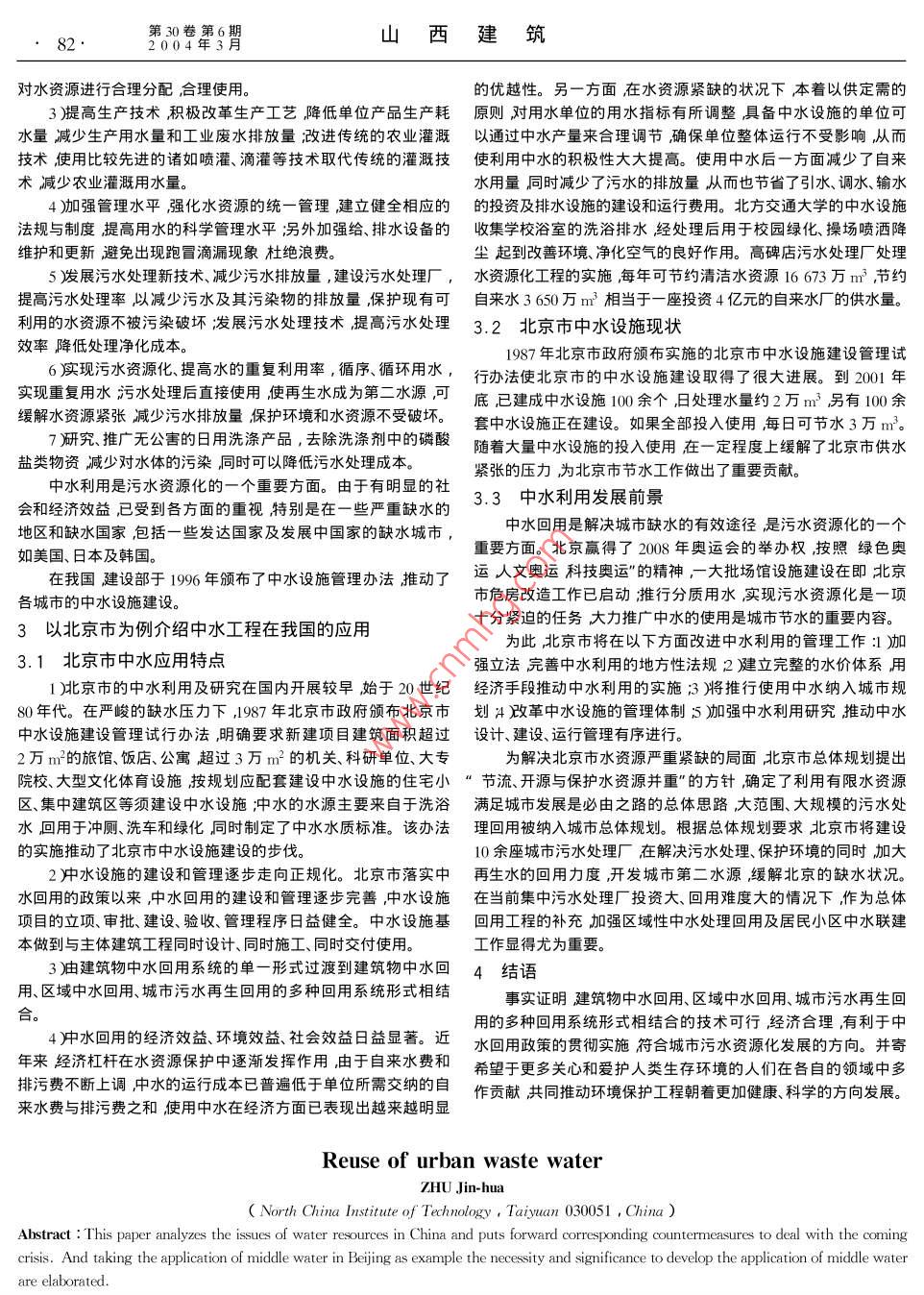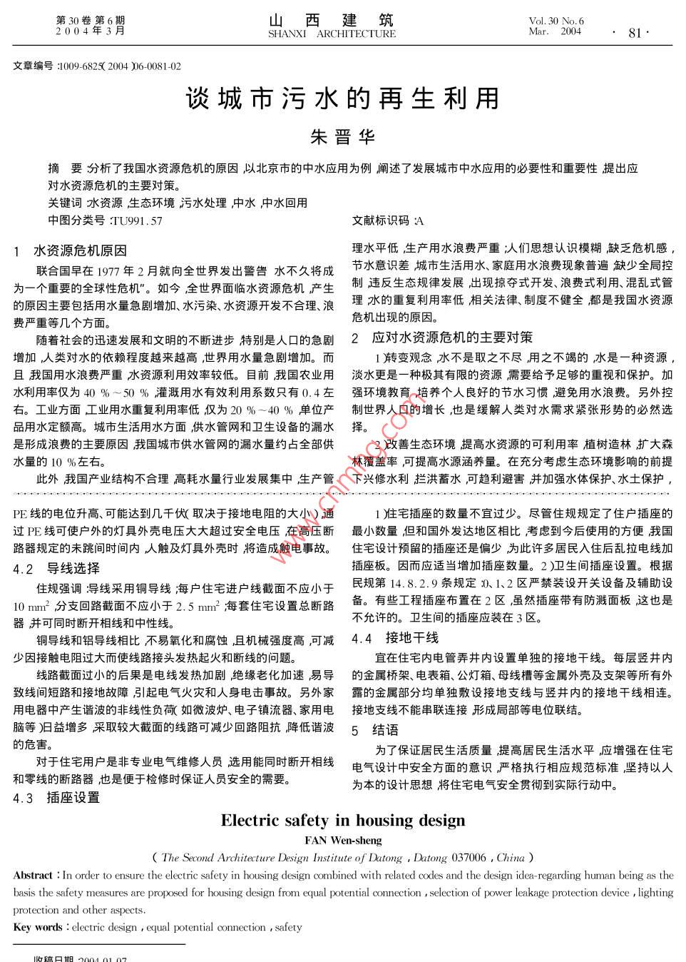第30卷第6期山西建筑Vol. 30 No2004年3月SHANXI ARCHITECTUREMar.2004文章編號(hào):1009-6825< 2004 )06-0081-02談城市污水的再生利用朱晉華摘要分析了我國(guó)水資源危機(jī)的原因以北京市的中水應(yīng)用為例,闡述了發(fā)展城市中水應(yīng)用的必要性和重要性提出應(yīng)對(duì)水資源危機(jī)的主要對(duì)策。關(guān)鍵詞水資源生態(tài)環(huán)境污水處理中水,中水回用中圖分類(lèi)號(hào):TU991.57文獻(xiàn)標(biāo)識(shí)碼A1水資 源危機(jī)原因理水平低,生產(chǎn)用水浪費(fèi)嚴(yán)重人們思想認(rèn)識(shí)模糊缺乏危機(jī)感,聯(lián)合國(guó)早在1977年2月就向全世界發(fā)出警告水不久將成節(jié)水意識(shí)差城市生活用水、家庭用水浪費(fèi)現(xiàn)象普遍缺少全局控為一個(gè)重要的全球性危機(jī)”。如今全世界面臨水資源危機(jī)產(chǎn)生制違反生態(tài)規(guī)律發(fā)展,出現(xiàn)掠奪式開(kāi)發(fā)、浪費(fèi)式利用、混亂式管的原因主要包括用水量急劇增加、水污染、水資源開(kāi)發(fā)不合理、浪理水的重復(fù)利用率低相關(guān)法律、制度不健全都是我國(guó)水資源危機(jī)出現(xiàn)的原因。費(fèi)嚴(yán)重等幾個(gè)方面。隨著社會(huì)的迅速發(fā)展和文明的不斷進(jìn)步特別是人口的急劇2 應(yīng)對(duì)水 資源危機(jī)的主要對(duì)策增加人類(lèi)對(duì)水的依賴(lài)程度越來(lái)越高,世界用水量急劇增加。而1 )轉(zhuǎn)變觀念,水不是取之不盡,用之不竭的,水是一種資源且我國(guó)用水浪費(fèi)嚴(yán)重水資源利用效率較低。目前我國(guó)農(nóng)業(yè)用淡水更是- -種極其 有限的資源需要給予足夠的重視和保護(hù)。加水利用率僅為40 %~50 %灌溉用水有效利用系數(shù)只有0.4左強(qiáng)環(huán)境教育 培養(yǎng)個(gè)人良好的節(jié)水習(xí)慣避免用水浪費(fèi)。另外控右。工業(yè)方面工業(yè)用水重復(fù)利用率低,僅為20%-40%單位產(chǎn)制世界人口的增長(zhǎng),也是緩解人類(lèi)對(duì)水需求緊張形勢(shì)的必然選品用水定額高。城市生活用水方面,供水管網(wǎng)和衛(wèi)生設(shè)備的漏水擇。是形成浪費(fèi)的主要原因我國(guó)城市供水管網(wǎng)的漏水量約占全部供2 )改善生態(tài)環(huán)境提高水資源的可利用率植樹(shù)造林?jǐn)U大森水量的10 %左右。林覆蓋率可提高水源涵養(yǎng)量。在充分考慮生態(tài)環(huán)境影響的前提此外我國(guó)產(chǎn)業(yè)結(jié)構(gòu)不合理高耗水量行業(yè)發(fā)展集中生產(chǎn)管下興修水利 攔洪蓄水,可趨利避害并加強(qiáng)水體保護(hù)、水土保護(hù)PE線(xiàn)的電位升高、可能達(dá)到幾千伏(取決于接地電阻的大小)通1 )住宅插座的數(shù)量不宜過(guò)少。盡管住規(guī)規(guī)定了住戶(hù)插座的過(guò)PE線(xiàn)可使戶(hù)外的燈具外殼電壓大大超過(guò)安全電壓在高壓斷最小數(shù)量但和國(guó)外發(fā)達(dá)地區(qū)相比考慮到今后使用的方便我國(guó)路器規(guī)定的未跳間時(shí)間內(nèi)人觸及燈具外殼時(shí)將造成觸電事故。住宅設(shè)計(jì)預(yù)留的插座還是偏少為此許多居民入住后亂拉電線(xiàn)加4.2 導(dǎo)線(xiàn)選擇插座板。因而應(yīng)適當(dāng)增加插座數(shù)量。2)衛(wèi)生間插座設(shè)置。根據(jù)住規(guī)強(qiáng)調(diào)導(dǎo)線(xiàn)采用銅導(dǎo)線(xiàn);每戶(hù)住宅進(jìn)戶(hù)線(xiàn)截面不應(yīng)小于民規(guī)第14.8.2.9條規(guī)定0.1、2區(qū)嚴(yán)禁裝設(shè)開(kāi)關(guān)設(shè)備及輔助設(shè)10 mm2分支回路截面不應(yīng)小于2.5 mm2 ;每套住宅設(shè)置總斷路備。有些工程插座布置在2區(qū),雖然插座帶有防濺面板,這也是不允許的。衛(wèi)生間的插座應(yīng)裝在3區(qū)。器并可同時(shí)斷開(kāi)相線(xiàn)和中性線(xiàn)。銅導(dǎo)線(xiàn)和鋁導(dǎo)線(xiàn)相比,不易氧化和腐蝕,且機(jī)械強(qiáng)度高,可減4.4 接地干線(xiàn)少因接觸電阻過(guò)大而使線(xiàn)路接頭發(fā)熱起火和斷線(xiàn)的問(wèn)題。宜在住宅內(nèi)電管弄井內(nèi)設(shè)置單獨(dú)的接地干線(xiàn)。每層豎井內(nèi)線(xiàn)路截面過(guò)小的后果是電線(xiàn)發(fā)熱加劇絕緣老化加速易導(dǎo)的金屬橋架、電表箱、公燈箱、母線(xiàn)槽等金屬外殼及支架等所有外致線(xiàn)間短路和接地故障引起電氣火災(zāi)和人身電擊事故。另外家露的金屬部分均單獨(dú)敷設(shè)接地支線(xiàn)與豎井內(nèi)的接地干線(xiàn)相連。用電器中產(chǎn)生諧波的非線(xiàn)性負(fù)荷如微波爐、電子鎮(zhèn)流器、家用電接地 支線(xiàn)不能串聯(lián)連接形成局部等電位聯(lián)結(jié)。腦等)舊益增多采取較大截面的線(xiàn)路可減少回路阻抗降低諧波5結(jié)語(yǔ)的危害。對(duì)于住宅用戶(hù)是非專(zhuān)業(yè)電氣維修人員選用能同時(shí)斷開(kāi)相線(xiàn)為了保證居民生活質(zhì)量,提高居民生活水平應(yīng)增強(qiáng)在住宅電氣設(shè)計(jì)中安全方面的意識(shí),嚴(yán)格執(zhí)行相應(yīng)規(guī)范標(biāo)準(zhǔn)堅(jiān)持以人和零線(xiàn)的斷路器,也是便于檢修時(shí)保證人員安全的需要。為本的設(shè)計(jì)思想將住宅電氣安全貫徹到實(shí)際行動(dòng)中。4.3插座設(shè)置Electric safety in housing designFAN Wen-sheng( The Second Architecture Desi