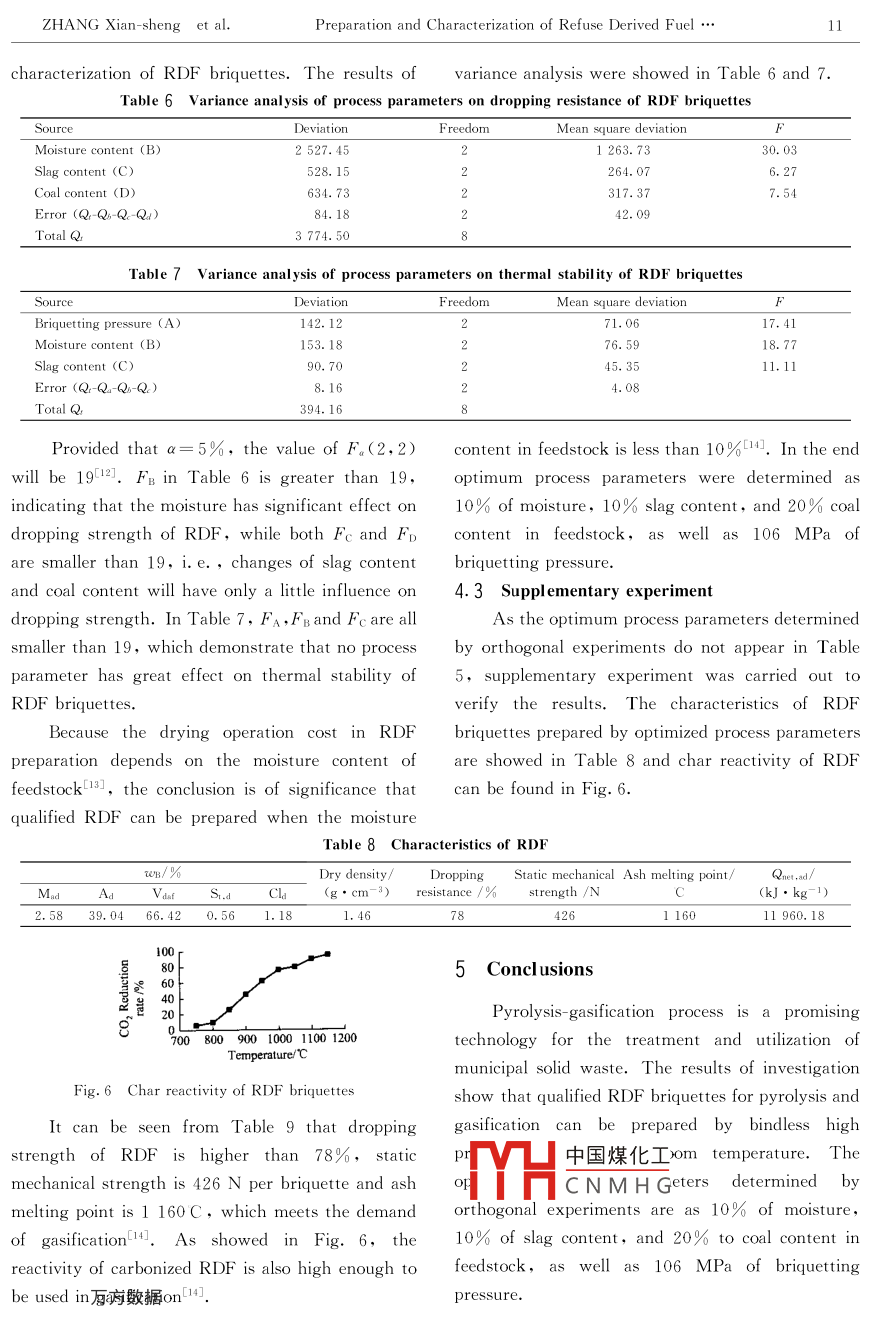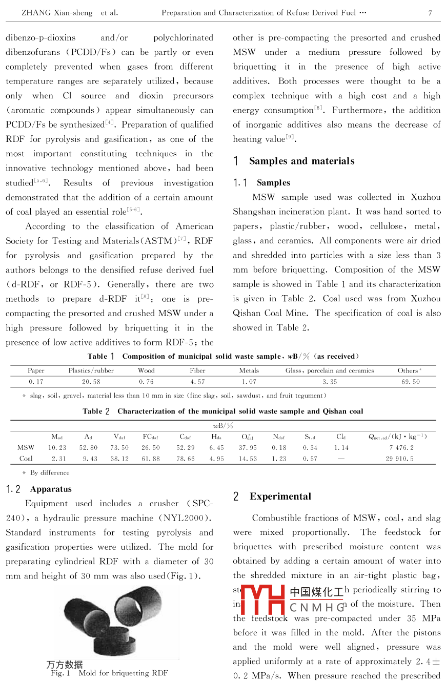 Jun.2004Journal of China University of Mining &. TechnologyVol. 14 No. 1Preparation and Characterization ofRefuse Derived Fuel for Pyrol ysisandGasification by Bindless High PressureBriquetting Technol ogyZHANG Xian-sheng(張憲生)',XIE Qiang(解強)1.2,LI Wei(厲偉)', SHEN Ji-min(沈吉敏)'(1. School of Chemical Engineering and Technology, CUMT,Xuzhou ,Jiangsu 221008,China;2. School of Chemical and Environmental Engineering, CUMT ,Beijing 100083 China)Abstract: A new type of refuse derived fuel (RDF) for pyrolysis and gasification was prepared from municipal solidwaste (MSW ) in the presence of a small quantity of coal by bindless high pressure technology at room temperature.The physicochemical property of RDF was tested. Orthogonal experiment method was used to optimize the processparameters using dropping strength (mechanical strength) and thermal stability of the RDF as indices for quality ofRDF. The result shows that the mixture of MSW and coal with a total moisture ranging from 5% to 17% can beeasily compressed into RDF briquettes at a pressure above 70 MPa. When the briquetting pressure is higher than100 kN and moisture content is about 10%,the qualified RDF can be obtained. The orthogonal experiment showsthat the moisture can greatly affect the mechanical strength of RDF,while all the technique parameters have noobvious influence on thermal stability of RDF. The optimal parameters are a shaping pressure of 106 MPa, amoisture content of 10%,and a coal content of 20%.Key words: municipal solid waste; refuse derived fuel; preparation ; orthogonal experimentCLC number: X 705Document code: AArticle ID: 1006-1266(2004)01-0006-07Refuse derived fuel (RDF ) from municipalincineration process ”.In the light of dioxinsolid waste ( MSW ) is of manyfavorableformation mechanism an innovative technology wasperformances such as uniform size distribution,proposed and developed by the Research Center fohomogeneous composition,, high caloric value, andMSW and Biomass to Energy Technology, Chinaeasy in being handled in both transportation andUniversity of Mining and Technology. Thisstockpile.Therefore,various techniques oltechnology can be described as“preparation of RDFpreparating RDF have been developed and applied in-controlled pyrolysis of RDF at low temperaturerecent years- 1-21.Generally,RDF is utilized mainlywith the aim to dechlorination- gasification of charmeans of incineration for energy-recovery.derived from RDF pyrolysis to produce cleanHowever,some issues related to the MSW /RDF .gas”[4]. The results of TG FTIR study of RDFincineration have appeared, e. g. low combustionpyrolysis showed that during heat treatment under aefficiency,dioxin pollution, corrosion of boiler中國煤化工1evolved and aromaticcomponents caused by acidic flue gases ( mainly:THCN M H Gifferent temperatures,HCI ),which results in a high costs of theindecating that the tormation of polychlorinatedReceived date: 2003-11 -09Foundation item: Foundation of Education Department of Jjangsu Government for Commercialization of High Technology Developed inUniversities.Biograph5方數(shù)據(jù)Xian sheng(1972 ), male, from Jining, Shandong Province. Graduate student, engaged in the research on treatmentand utilization of solid wastes.ZHANG Xian-sheng et al.Preparation and Characterization of Refuse Derived Fuel ..dibenzo- p- dioxinsand/orpolychlorinatedother is pre-compacting the presorted and crusheddibenzofurans ( PCDD/Fs) can be partly or evenMSW under a medium pressure followed bycompletely prevented when gases from differentbriquetting it in the presence of high activetemperature ranges are separately utilized, becauseadditives. Both processes were thought to be aonly when Cl source and dioxinprecursorscomplex technique with a high cost and a high(aromatic compounds ) appear simultaneously canenergy consumptionl8l. Furthermore, the additionPCDD/Fs be synthesized4I. Preparation of qualifiedof inorganic additives also means the decrease ofRDF for pyrolysis and gasification, as one of theheating value[9].most important constituting techniques in theinnovative technology mentioned above, had been1Samples and materialsstudied5.60. Results of previousinvestigation1.1 Samplesdemonstrated that the addition of a certain amountMSW sample used was collected in Xuzhouof coal played an essential role[-6].Shangshan incineration plant. It was hand sorted toAccording to the classification of Americanpapers,plastic/rubber, wood, cellulose, metal,Society for Testing and Materials(ASTM)[7, RDFglass, and ceramics. All components were air driedfor pyrolysis and gasification prepared by theand shredded into particles with a size less than 3authors belongs to the densified refuse derived fuelmm before briquetting. Composition of the MSW(d- RDF,or RDF-5). Generally, there are twosample is showed in Table 1 and its characterizationmethods to prepare d-RDF it[8]: one is pre-is given in Table 2. Coal used was from Xuzhoucompacting the presorted and crushed MSW under aQishan Coal Mine. The specification of coal is alsohigh pressure followed by briquetting it in theshowed in Table 2.presence of low active additives to form RDF-5; theTable1 Composition of municipal solid waste sample, wB/ % (as received )PaperPlastics/ rubberWoodFiberMetalGlasporcelain and ceramicsOthers”0.1720. 580.764.571. 073. 3569. 50slag, soil, gravel, material less than 10 mm in size (fine slag,soil, sawdust, and fruit tegument )Table 2 Characterization of the municipal solid waste sample and Qishan coaltwB/%MadAdVarFCat .CafHaOautNatrSr.dClaQmet.nd/(kJ. kg-1)MSW10.23 52. 8073.50 26. 5052.29 6. 4537. 950. 180.341.147 476.2Coal2.319.43 38. 12 61. 8878. 664.9514. 531.230.5729 910.5t By difference1.2 Apparatus2 ExperimentalEquipment used includes a crusher ( SPC-240),a hydraulic pressure machine (NYL2000). .Combustible fractions of MSW, coal, and slagStandard instruments for testing pyrolysis andweremixed proportionally. The feedstock forgasification properties w