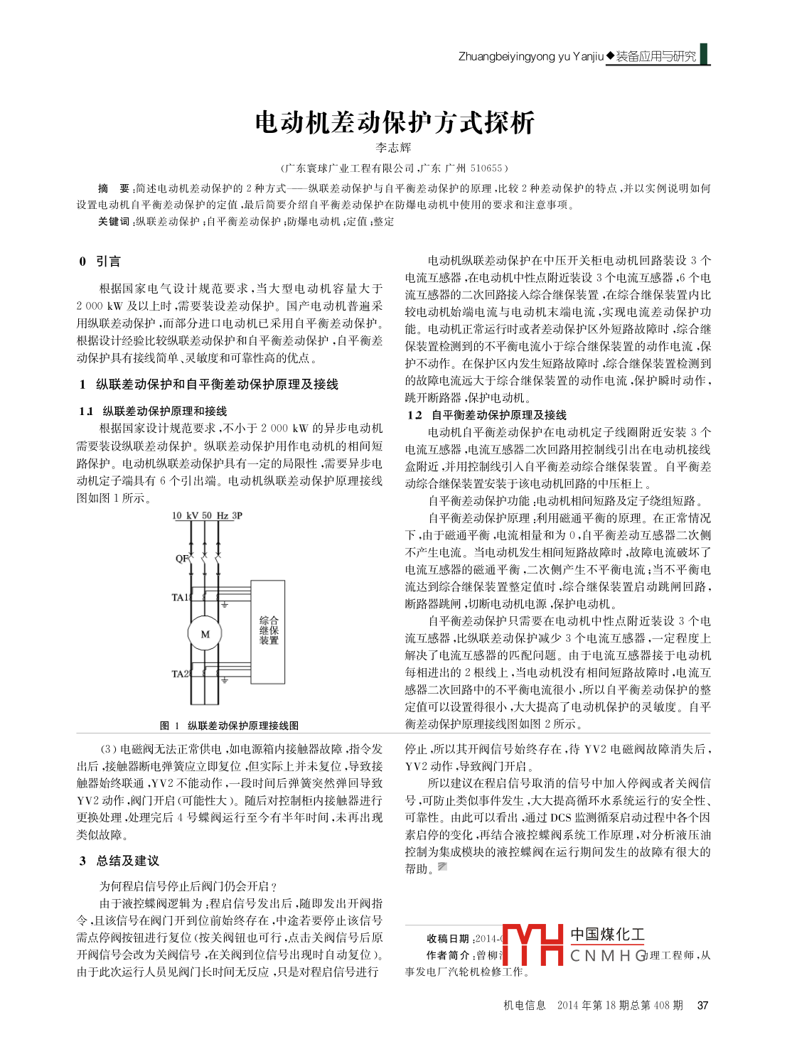 裝備應(yīng)用與研究◆Zhuangbeiyingyong yu Yanjiu循環(huán)水泵程啟失敗后液控蝶閥異常開啟故障分析曾柳清(深能合和電力(河源)有限公司,廣”東河源517000)商要:循環(huán)水系統(tǒng)在自然通風(fēng)冷卻塔發(fā)電廠中扮演著重要的角色,通過(guò)冷卻凝汽器中的汽輪機(jī)排汽來(lái)維持凝汽器真空,是汽水循環(huán)得以繼續(xù)的關(guān)鍵。循環(huán)水泵液控蝶閥的安全性、穩(wěn)定性自然成了影響循環(huán)水系統(tǒng)的因素?,F(xiàn)以河源電廠4號(hào)循泵在啟動(dòng)失敗后閥門異常開啟造成4號(hào)循泵倒轉(zhuǎn)凝汽器真空下降這一-事故為例通過(guò)事后分析,總結(jié)了程啟信號(hào)停止后閥門仍舊開啟的原因,并提出了有針對(duì)性的建議,對(duì)分析液控蝶閥故障有一-定的參 考意義。關(guān)鍵詞:循環(huán)水泵;液控蝶閥;電磁閥;接觸器1故障描述.開兩關(guān)閥2013年10月29日15:30,2 號(hào)機(jī)對(duì)4號(hào)循泵進(jìn)行例行切21換。在15:31遠(yuǎn)方發(fā)出2B循泵程啟指令時(shí),就地油站油泵電四門關(guān)關(guān)機(jī)短時(shí)間啟動(dòng)后停止,閥門未開啟。就地等待至15 :36后閥門520. 2仍無(wú)開啟,遠(yuǎn)方取消程啟指令。取消指令發(fā)出6 min后閥門自19中水.2動(dòng)開啟,就地運(yùn)行人員發(fā)現(xiàn)閥門開啟后通知遠(yuǎn)方關(guān)閉閥門。閥門動(dòng)作全過(guò)程導(dǎo)致4號(hào)循泵倒轉(zhuǎn),機(jī)組真空下降。951 192故障分析-十日315-2經(jīng)由工程師站調(diào)取的事發(fā)經(jīng)過(guò)相關(guān)DCS曲線(圖1 )可看118 如出,在程控曲線發(fā)出后,開閥指令同時(shí)發(fā)出,液控蝶閥應(yīng)出現(xiàn)狀態(tài)為:YV1電磁閥失電,YV2電磁閥帶電,油缸液壓油經(jīng)由本|18YV2電磁閥泄出。壓力油經(jīng)YV1電磁閥進(jìn)人油缸。6-10.牛23<>1p24圖2液控蝶閥工作原理圖為油泵啟動(dòng)曲線表明油泵為短時(shí)間啟動(dòng)后系統(tǒng)保壓,證明15-2油泵運(yùn)行由來(lái)場(chǎng)行一油泵運(yùn)行 -油奉運(yùn)行插裝閥不應(yīng)出現(xiàn)問(wèn)題,則為液控單向閥13堵澀(可能性較小,程控指專若為臟東西卡澀溢流閥,在電磁閥狀態(tài)無(wú)任何改變的情況下閥門不應(yīng)該在后來(lái)突然開啟)。(2) YV1動(dòng)作異常,YV2正常動(dòng)作。由于2號(hào)機(jī)組液控蝶閥開關(guān)指令調(diào)開未指令調(diào)開關(guān)指令閥在管閥到位以后,YV1為帶電狀態(tài),則壓力油繼續(xù)走關(guān)閥側(cè),陶位開度周們開度我位開座由于YV2正常動(dòng)作,壓力油將由18號(hào)插裝閥持續(xù)泄出。與現(xiàn)程控個(gè)。我控張令象不符。(3) YV1動(dòng)作正常,YV2動(dòng)作異常。YV1 動(dòng)作正常,壓力圖1事發(fā)經(jīng)過(guò)相關(guān)DCS曲線油進(jìn)人開閥側(cè)原無(wú)壓油管.系統(tǒng)壓力降低,油泵啟動(dòng)。由于注:由上至下各條曲線分別為油泵啟停、程啟指令、閥門開關(guān)指令、閥門YV2 動(dòng)作異常,插裝閥18無(wú)法打開,油缸有桿腔壓力油無(wú)法泄出,待系統(tǒng)油壓重新建立以后油泵停止運(yùn)行。則出現(xiàn)上述現(xiàn)從曲線可看出,發(fā)出指令的同時(shí)油站油泵電機(jī)出現(xiàn)短時(shí)間象,油泵短時(shí)間運(yùn)行后停止。證明導(dǎo)致程啟信號(hào)發(fā)出后閥門無(wú)啟動(dòng),證明系統(tǒng)油壓有變化,但壓力只是小幅度下降,推斷為法開啟的原因?yàn)?YV2電磁閥動(dòng)作異常。YV1與YV2至少有一個(gè)動(dòng)作。YV2電磁閥異常原因分析:液控蝶閥工作原理如圖2所示。(1)電磁閥本體有異常.油質(zhì)臟導(dǎo)致閥體內(nèi)部活動(dòng)卡澀。可假設(shè):但卡澀的話也應(yīng)有音中國(guó)煤化工堵死,也不會(huì)(1)YV1、YV2都動(dòng)作。若YV1. YV2都正常動(dòng)作,則插出現(xiàn)后 來(lái)的突然開啟YHCNMHG裝閥15-2可能發(fā)生卡澀,若該閥發(fā)生泄漏應(yīng)為長(zhǎng)時(shí)間泄漏,因(2 )電磁閥線圈故障,無(wú)法正?;顒?dòng)(可能性小)。36Zhuangbeiyingyong yu Yanju◆裝備應(yīng)用與研究電動(dòng)機(jī)差動(dòng)保護(hù)方式探析李志輝(廣東寰球廣業(yè)工程有限公司,廣東廣州510655).摘要:簡(jiǎn)述電動(dòng)機(jī)差動(dòng)保護(hù)的2種方式一縱聯(lián)差動(dòng)保護(hù)與自平衡差動(dòng)保護(hù)的原理,比較2種差動(dòng)保護(hù)的特點(diǎn),并以實(shí)例說(shuō)明如何設(shè)置電動(dòng)機(jī)自平衡差動(dòng)保護(hù)的定值,最后簡(jiǎn)要介紹自平衡差動(dòng)保護(hù)在防爆電動(dòng)機(jī)中使用的要求和注意事項(xiàng)。關(guān)鍵詞:縱聯(lián)差動(dòng)保護(hù);自平衡差動(dòng)保護(hù);防爆電動(dòng)機(jī);定值;整定0引言電動(dòng)機(jī)縱聯(lián)差動(dòng)保護(hù)在中壓開關(guān)柜電動(dòng)機(jī)回路裝設(shè)3個(gè)根據(jù)國(guó)家電氣設(shè)計(jì)規(guī)范要求,當(dāng)大型電動(dòng)機(jī)容量大于電流互感器,在電動(dòng)機(jī)中性點(diǎn)附近裝設(shè)3個(gè)電流互感器,6個(gè)電2000kW及以上時(shí),需要裝設(shè)差動(dòng)保護(hù)。國(guó)產(chǎn)電動(dòng)機(jī)普遍采流互感器的二次回路接入綜合繼保裝置,在綜合繼保裝置內(nèi)比用縱聯(lián)差動(dòng)保護(hù),而部分進(jìn)口電動(dòng)機(jī)已采用自平衡差動(dòng)保護(hù)。較電動(dòng)機(jī)始端電流與電動(dòng)