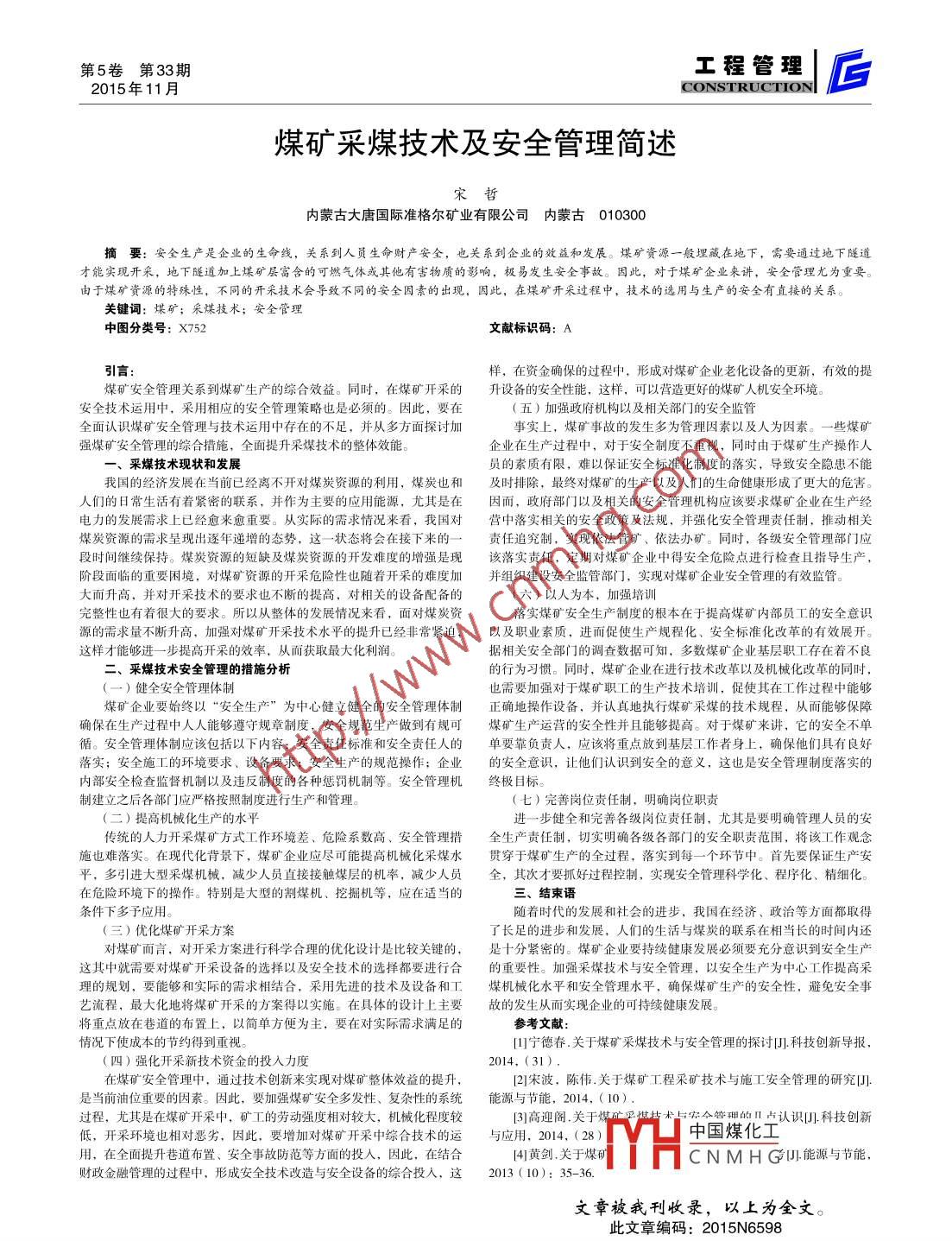第5卷第33期工程管理2015年11月CONSTRUCTIONI后煤礦采煤技術(shù)及安全管理簡(jiǎn)述宋哲內(nèi)蒙古大唐國(guó)際準(zhǔn)格爾礦業(yè)有限公司內(nèi)蒙古010300摘要:安全生產(chǎn)是企業(yè)的生命線,關(guān)系到人員生命財(cái)產(chǎn)安全,也關(guān)系到企業(yè)的效益和發(fā)展。煤礦資源一般埋藏在地下,需要通過(guò)地下隧道才能實(shí)現(xiàn)開(kāi)采,地下隧道加上煤礦層富含的可燃?xì)怏w或其他有害物質(zhì)的影響,極易發(fā)生安全事故。因此,對(duì)于煤礦企業(yè)來(lái)講,安全管理尤為重要。由于煤礦資源的特殊性,不同的開(kāi)采技術(shù)會(huì)導(dǎo)致不同的安全因素的出現(xiàn),因此,在煤礦開(kāi)采過(guò)程中,技術(shù)的選用與生產(chǎn)的安全有直接的關(guān)系。關(guān)鍵詞:煤礦;采煤技術(shù);安全管理中圖分類號(hào): X752文獻(xiàn)標(biāo)識(shí)碼: A引言:樣,在資金確保的過(guò)程中,形成對(duì)煤礦企業(yè)老化設(shè)備的更新,有效的提煤礦安全管理關(guān)系到煤礦生產(chǎn)的綜合效益。同時(shí),在煤礦開(kāi)采的升設(shè)備的安全性能, 這樣,可以營(yíng)造更好的煤礦人機(jī)安全環(huán)境。安全技術(shù)運(yùn)用中,采用相應(yīng)的安全管理策略也是必須的。因此,要在(五)加強(qiáng)政府機(jī)構(gòu)以及相關(guān)部門的安全監(jiān)管全面認(rèn)識(shí)煤礦安全管理與技術(shù)運(yùn)用中存在的不足,并從多方面探討加事實(shí)上,煤礦事故的發(fā)生多為管理因素以及人為因素。-些煤礦強(qiáng)煤礦安全管理的綜合措施,全面提升采煤技術(shù)的整體效能。企業(yè)在生產(chǎn)過(guò)程中,對(duì)于安全制度不重視,同時(shí)由于煤礦生產(chǎn)操作人-、采煤技術(shù)現(xiàn)狀和發(fā)展員的索質(zhì)有限,難以保證安全標(biāo)準(zhǔn)化制度的落實(shí),導(dǎo)致安全隱患不能我國(guó)的經(jīng)濟(jì)發(fā)展在當(dāng)前已經(jīng)離不開(kāi)對(duì)煤炭資源的利用,煤炭也和及時(shí)排除, 最終對(duì)煤礦的生產(chǎn)以及人們的生命健康形成了更大的危害。人們的日常生活有著緊密的聯(lián)系,并作為主要的應(yīng)用能源,尤其是在因而, 政府部門以及相關(guān)的安全管理機(jī)構(gòu)應(yīng)該要求煤礦企業(yè)在生產(chǎn)經(jīng)電力的發(fā)展需求上已經(jīng)愈來(lái)愈重要。從實(shí)際的需求情況來(lái)看,我國(guó)對(duì)營(yíng)中落實(shí)相關(guān)的安全政策及法規(guī),并強(qiáng)化安全管理責(zé)任制,推動(dòng)相關(guān)煤炭資源的需求呈現(xiàn)出逐年遞增的態(tài)勢(shì),這一-狀態(tài)將 會(huì)在接下來(lái)的一責(zé) 任追究制,實(shí)現(xiàn)依法管礦、依法辦礦。同時(shí),各級(jí)安全管理部門應(yīng)段時(shí)間繼續(xù)保持。煤炭資源的短缺及煤炭資源的開(kāi)發(fā)難度的增強(qiáng)是現(xiàn)該落實(shí)責(zé)任,定期對(duì)煤礦企業(yè)中得安全危險(xiǎn)點(diǎn)進(jìn)行檢查且指導(dǎo)生產(chǎn),階段面臨的重要困境,對(duì)煤礦資源的開(kāi)采危險(xiǎn)性也隨著開(kāi)采的難度加并組織建 設(shè)安全監(jiān)管部門,實(shí)現(xiàn)對(duì)煤礦企業(yè)安全管理的有效監(jiān)管。大而升高,并對(duì)開(kāi)采技術(shù)的要求也不斷的提高,對(duì)相關(guān)的設(shè)備配備的(六) 以人為本,加強(qiáng)培訓(xùn)完整性也有著很大的要求。所以從整體的發(fā)展情況來(lái)看,面對(duì)煤炭資落實(shí)煤礦安全生產(chǎn)制度的根本在于提高煤礦內(nèi)部員工的安全意識(shí)源的需求量不斷升高,加強(qiáng)對(duì)煤礦開(kāi)采技術(shù)水平的提升已經(jīng)非常緊迫,以及職業(yè)素質(zhì),進(jìn)而促使生產(chǎn)規(guī)程化、安全標(biāo)準(zhǔn)化改革的有效展開(kāi)。這樣才能夠進(jìn)一一步提高開(kāi)采的效率,從而獲取最大化利潤(rùn)。據(jù)相關(guān)安全部門的調(diào)查數(shù)據(jù)可知,多數(shù)煤礦企業(yè)基層職工存在著不良二、采煤技術(shù)安全管理的措施分析的行為習(xí)慣。同時(shí),煤礦企業(yè)在進(jìn)行技術(shù)改革以及機(jī)械化改革的同時(shí),(一)健全安全管理體制也需要加強(qiáng)對(duì)于煤礦職工的生產(chǎn)技術(shù)培訓(xùn),促使其在工作過(guò)程中能夠煤礦企業(yè)要始終以“安全生產(chǎn)”為中心健立健全的安全管理體制正確地操作設(shè)備,并認(rèn)真地執(zhí)行煤礦采煤的技術(shù)規(guī)程,從而能夠保障確保在生產(chǎn)過(guò)程中人人能夠遵守規(guī)章制度,安全規(guī)范生產(chǎn)做到有規(guī)可煤礦 生產(chǎn)運(yùn)營(yíng)的安全性并且能夠提高。對(duì)于煤礦來(lái)講,它的安全不單循。安全管理體制應(yīng)該包括以下內(nèi)容:安全責(zé)任標(biāo)準(zhǔn)和安全責(zé)任人的單 要靠負(fù)責(zé)人,應(yīng)該將重點(diǎn)放到基層工作者身上,確保他們具有良好落實(shí);安全施工的環(huán)境要求、設(shè)備要求;安全生產(chǎn)的規(guī)范操作;企業(yè)的安全 意識(shí),讓他們認(rèn)識(shí)到安全的意義,這也是安全管理制度落實(shí)的內(nèi)部安全檢查監(jiān)督機(jī)制以及違反制度的各種懲罰機(jī)制等。安全管理機(jī)終極目標(biāo)。制建立之后各部門]應(yīng)嚴(yán)格按照制度進(jìn)行生產(chǎn)
