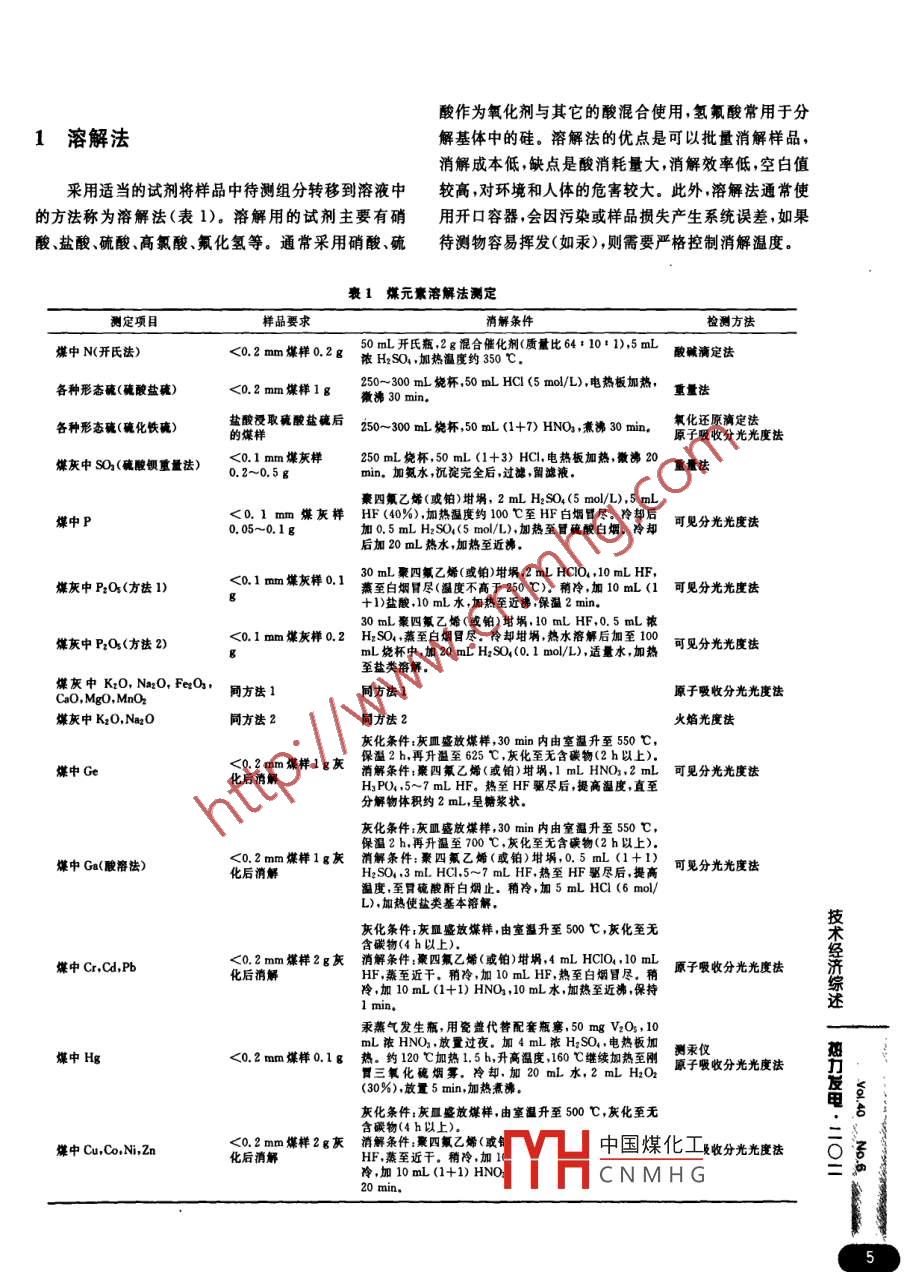 煤及煤灰消解技術(shù)綜述周桂萍',史傳紅21.國(guó)家電網(wǎng)技術(shù)學(xué)院發(fā)電與新能源培訓(xùn)部,山東濟(jì)南2500022.華電濰坊發(fā)電有限公司,山東濰坊261201[摘要] 對(duì)常用的煤和煤灰中元素檢測(cè)的消解方法如溶解法、熔融法和燃燒法的基本原理及在煤炭檢驗(yàn)中的應(yīng)用情況進(jìn)行了綜述。介紹了微波消解技術(shù)用于煤元素檢測(cè)的研究進(jìn)展。相比于傳統(tǒng)的溶解法、熔融法和燃燒法,微波消解技術(shù)對(duì)樣品的消解時(shí)間大大編短,并且可一次處理多個(gè)樣品,使檢測(cè)效率大幅提高。[關(guān)鍵詞]煤;煤灰;溶解法;熔融法;燃燒法;微波消解;微波燃燒消解[中圈分類號(hào)] 0657[文獻(xiàn)標(biāo)識(shí)碼] A[文章編號(hào)] 1002 - 364(2011)06 - 0004 -05[DOI編號(hào)] 10.3969/j. issn. 1002 - 3364. 2011. 06. 004REVIEW ON THE DIGESTION TECHNOLOGY OF COAL AND COAL ASHZHOU Guiping' ,SHI Chuanhong1. State Power Grid Technology College ,Jinan 250002 ,Shandong Province PRC2. Huadian Weifeng Power Generation Co Ltd, Weifang 261201 ,Shandong Province,PRCAbstract:The basic principle of commonly used digestion methods, including dissolving method,fusingmethod, and burning method, for detecting elemnts contained in coal and coal ash,as well as their ap-plication situation in coal inspection have been reviewed. The progress of studying adoptation of micro-wave degestion technology to detect elements contained in coal has been presented. Compared with theconventional dissolving method, fusing method, and burning method, the time used for digesting sam-ples by using microwave digestion technology has been greatly shortened, and many samples can be技handled at a time, making the efficiency of digestion to be enhanced by a big margin.經(jīng)Key words: coal; dissolving method; fusing method; burning method; microwave digestion; microwaveburning digestion煤中含有許多有害元素,在運(yùn)輸、貯存、燃燒利用及煤灰樣轉(zhuǎn)化到溶液中,即對(duì)樣品進(jìn)行消解處理。常勢(shì)過(guò)程中有害元素 會(huì)以氣體、飄塵或粉塵形態(tài)進(jìn)人大氣,用的煤和煤灰消解方法有溶解法、熔融法和燃燒法具發(fā)或隨雨水等滲人土壤造成環(huán)境污染。 因此,對(duì)于發(fā)電有 消解時(shí)間短、殘?zhí)嫉?、樣品空白值小、可批量消解等、?shù)電用煤除了進(jìn)行日常的燃燒特性檢測(cè)以外,還需測(cè)定其優(yōu)點(diǎn)。微波消解技術(shù)利用微波產(chǎn)生熱量加熱試樣,目有機(jī)、無(wú)機(jī)元素的含量。測(cè)定這些元素需要將固體煤中國(guó)煤化工曹δCNMHG作者簡(jiǎn)介:周桂萍(1970 -),山東日照人,理學(xué)博士,副教授,高工,從事電力化學(xué)和環(huán)保專業(yè)的教學(xué)與研究.E- mall; zhguiping@yahoo com. cn酸作為氧化劑與其它的酸混合使用,氫氟酸常用于分1溶解法解基體中的硅。溶解法的優(yōu)點(diǎn)是可以批量消解樣品,消解成本低,缺點(diǎn)是酸消耗量大,消解效率低,空白值采用適當(dāng)?shù)脑噭悠分写郎y(cè)組分轉(zhuǎn)移到溶液中較高,對(duì)環(huán)境和人體的危害較大。此外,溶解法通常使的方法稱為溶解法(表1)。溶解用的試劑主要有硝用開口容器,會(huì)因污染或樣品損失產(chǎn)生系統(tǒng)誤差,如果酸、鹽酸、硫酸、高氯酸、氟化氫等。通常采用硝酸、硫待測(cè)物容易揮發(fā)(如汞),則需要嚴(yán)格控制消解溫度。裹1煤元素溶解法測(cè)定測(cè)定項(xiàng)目樣品要求.消解條件檢測(cè)方法50 mL開氏瓶,2g混合催化劑(質(zhì)量比64# 101 1),5 mL煤中N(開氏法)<0.2 mm煤樣0.2g濃H2SO, .加熱溫度約350 C。酸堿滴定法各種形態(tài)硫(硫酸鹽碗)<0.2 mm煤樣1g250~300 mL燒杯,50 mL HCI <5 mo/L).電熱板加熱,重量法微沸30 min.各種形態(tài)碗(碗化鐵碗)鹽酸授取碗酸鹽硫后250~300 ml燒杯,50 mL (1+7) HNO,煮佛30 min,氧化還原滴定法的煤樣原子吸收分光光度法煤灰中SO、(硫胺鋇重量法)<0.1 mm煤灰樣250 mL燒杯,50 mL (1+3) HCl,電熱板加熱,微沸200.2~0.5gmin.加氨水,沉淀完全后,過(guò)濾,留濾液.豪四氟乙烯(或鉑)坩堝,2 mL H2SO.(5 mol/L),5 mL<0. 1 mm煤灰樣HF (40%),加熱溫度約100乜至HF白煙暫盡。冷卻后煤中P0. 05~0.1 g加0.5 mL H2SO,(5 mo/L),加熱至冒硫酸白煙.冷卻可見分光光度法后加20 m熱水,加熱至近佛。.<0.1 mm煤灰樣0.130 mL聚四氟乙烯(或鉑)坩堝,2 mL HCIO, ,10 mL HF,煤灰中P:O%(方法1)蒸至白煙冒盡(溫度不高于250 C)。稍冷,加10 mL(1可見分光光度法30 mL聚四氟乙烯(或鉑)坩堝,10 mL HF,0.5 mL濃煤灰中P2O:(方法2)<0.1 mm煤灰樣0.2 H2SO,蒸至白煙冒盡。 冷卻坩堝,熱水溶解后加至100mL燒杯中,加20 mL H2SO,(0. 1 mol/L),適量水,加熱至鹽類溶解。煤灰中K:O, Na2O, FerO,局方法1聞方法1原于吸收分光光度法CaO,MgO,MnOr煤灰中KzO,NaxO同方法2火焰光度法灰化條件:灰皿盛放煤樣,30 min內(nèi)由室溫升至550 C,<0.2 mm煤樣1g灰保溫2 h.再升溫至625 C,灰化至無(wú)含碳物(2h以上)。煤中Ge消解條件:豪四氟乙烯(或鉑)坩堝,1 mL HNO3,2 mL可見分光光度法化后清解H3PO,5~7 mL HF.熱至HF驅(qū)盡后,提高溫度,直至.分解物體積約2 mL,呈糖漿狀?;一瘲l件:灰皿盛放煤樣,30 min內(nèi)由室溫升至550 C ,保溫2 h,再升溫至700 C.灰化至無(wú)含碳物(2 h以上)。<0.2 mm煤樣1g灰消解條件:秦四氟乙烯(或鉑)坩堝,0.5 mL (1+1)煤中Ga(酸溶法)化后消解H2S0,3 mL HC1.5~7 mL HF,熱至HF驅(qū)盡后,提高溫度,至胃硫酸酐白煙止。稍冷,加5 mL HC (6 mol/L) ,加熱使鹽類基本榕解。技灰化條件;灰皿盛放
