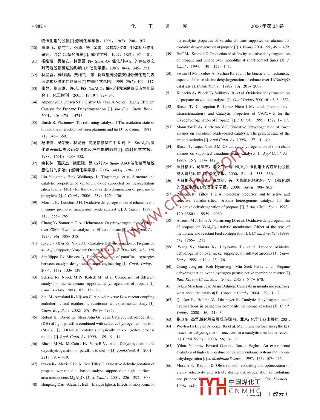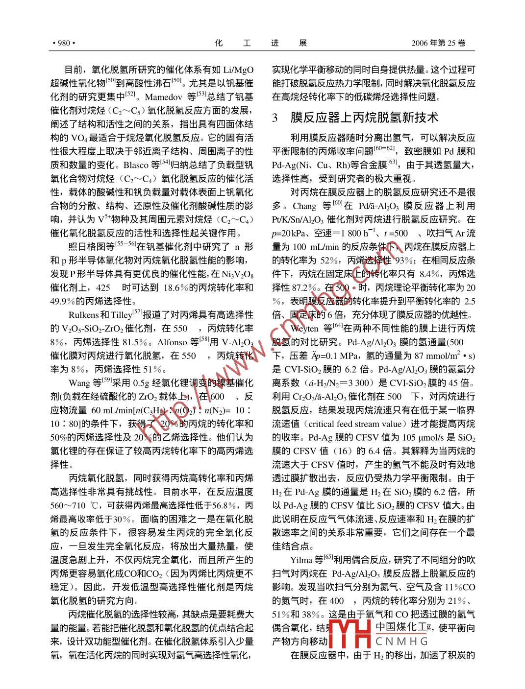 化工進(jìn)展2006年第25卷第9期CHEMICAL INDUSTRY AND ENGINEERING PROGRESS977進(jìn)展與述評(píng)丙烷脫氫制丙烯研究新進(jìn)展余長(zhǎng)林12,葛慶杰,徐恒泳,李文釗中國(guó)科學(xué)院大連化學(xué)物理研究所,天然氣化工與應(yīng)用催化研究室,遼寧大連1160232中國(guó)科學(xué)院研究生院,北京100049摘要:介紹了丙烷催化轉(zhuǎn)化制丙烯的硏究狀況,綜述了丙烷催化脫氫制丙烯的鉻系催化劑、鉑系催化劑及其助劑Sn的研究進(jìn)展;評(píng)述了丙烷氧化脫氬反應(yīng)機(jī)理低溫和高選擇性的催化劑及膜反應(yīng)器在丙烷脫氫反應(yīng)上所具有的優(yōu)越性,認(rèn)為研發(fā)具有高穩(wěn)定性和髙透氫性能的氫分離膜,將有望能大幅度提高丙烯的收率。關(guān)鍵詞:丙烷;丙烯;脫氫;膜反應(yīng)器中圖分類(lèi)號(hào):O643文獻(xiàn)標(biāo)識(shí)碼:A文章編號(hào):1000-6613(2006)09-0977-06New development of dehydrogenation of propane to propyleneYU Changlin", GE ingjie', XU Hengyong, LI Wenzhao( Laboratory of Natural Gas Utilization and Applied Catalysis, Dalian Institute of Chemical Physics, Chinese Academyof Sciences, Dalian 116023, Liaoning, China; Graduate School of Chinese Academy of Sciences, Beijing 100049China)Abstract The development of the dehydrogenation of propane to propylene, including catalyticdehydrogenation, oxidative dehydrogenation and dehydrogenation in the membrane reactor is summarizedand analyzed. Although, catalytic dehydrogenation of propane has been commercialized, the performance ofatalysts needs to be further improved. The development of low temperature and high selectivity catalysts isthe key issue for propane oxidative dehydrogenation. Compared with the traditional dehydrogenation, themembrane reactor has its advantages in propane dehydrogenation. It can overcome the restriction ofthermodynamic equilibrium and shift the reaction to the dehydrogenation direction. So, in the membranereactor,the conversion of propane and the yield of propylene are very high. If the activity and stability ofcatalysts for propane dehydrogenation and the hydrogen perm-selectivity of the membrane reactor can befurther improved, the membrane reactor is a promising method for the dehydrogenation of propaneKey words: propane; propylene; dehydrogenation; membrane reactor低碳烷烴催化轉(zhuǎn)化制烯烴一直是石油化工領(lǐng)域的化的乙烷水蒸氣裂解工藝相比很難具有競(jìng)爭(zhēng)力。熱點(diǎn)課題,它將成為新世紀(jì)石油化工技術(shù)研究開(kāi)發(fā)的目前,丙烯供應(yīng)主要來(lái)自石腦油裂解制乙烯和重點(diǎn)之一。其開(kāi)發(fā)的方向主要有:甲烷轉(zhuǎn)化為烯烴;石油催化裂化過(guò)程的副產(chǎn)品。預(yù)測(cè)2004~2010年間,乙烷脫氬為乙烯;丙烷脫氫為丙烯;④丁烷脫氫為?當(dāng)乙烯產(chǎn)能增長(zhǎng)34%時(shí),丙烯產(chǎn)能僅能增長(zhǎng)25%丁烯。甲烷氧化偶聯(lián)制乙烯(OCM-直是具有挑戰(zhàn)性除非有新的丙烯生產(chǎn)工藝成功投入工業(yè)化生產(chǎn),否的課題。二十多年研究表明,就目前催化劑水平,則將難以滿足石化行業(yè)對(duì)丙烯的需求。因此,近年開(kāi)C(乙烯和乙烷)單程收率只能在25%左右徘徊發(fā)擴(kuò)大丙烯來(lái)源的生產(chǎn)工藝成為熱點(diǎn),其中丙烷脫離工業(yè)化甚遠(yuǎn),近年來(lái)這方面的研究已趨于萎縮。乙氬(PDH制丙對(duì)中國(guó)煤化工紀(jì)90年代以烷催化脫氨反應(yīng)條件茍刻,能耗高,反應(yīng)仍然嚴(yán)格地來(lái),PDH已成CNMHG益增長(zhǎng)的來(lái)受到熱力學(xué)平衡的限制,收率難以提高,與當(dāng)今商業(yè)收稿日期2006-06-27;修改稿日期2006-07-20。作者簡(jiǎn)介余長(zhǎng)林(1974-,男,博土研究生。聯(lián)系人徐恒泳,研究員,博士生導(dǎo)師。電話041184581234;E- mail xuhy@ dicp accn化工進(jìn)展2006年第25卷源。目前世界上有10套PDH裝置在運(yùn)轉(zhuǎn),其中8套1.1鉻系催化劑裝置采用UOP公司的 Reflex技術(shù),2套裝置采用丙烷催化脫氫的 Catofin工藝就采用(CrOyABB Lummus公司的 Catofin技術(shù)。兩種技術(shù)分別采A1O3催化劑。該脫氫過(guò)程,通常在高于550進(jìn)行用C系和Pt系催化劑3-n壓力(3~5)×10Pa,單程轉(zhuǎn)化率48%~65%,反應(yīng)中國(guó)有較豐富的液化石油氣,它基本上由60%周期15~30min。高溫使催化劑迅速失活,其主要的丙烷和如0%的丁烷組成,若能有效地將丙烷直接原因是大量旳積炭覆蓋了催化劑的活性位。因此毎轉(zhuǎn)化成丙烯,將可緩解丙烯來(lái)源不足的問(wèn)題。雖已隔7~15min需對(duì)催化劑進(jìn)行氧化再生。對(duì)開(kāi)展了丙烷、丁烷等低碳烷烴脫氫的研究8⑩,但Cr2O√AlO3催化劑,主要集中在丙烷脫氫的活性位還沒(méi)有建立丙烷脫氫生產(chǎn)裝置。點(diǎn)的研究,因?yàn)镃r在Al2O表面以多種價(jià)態(tài)和多種1丙烷催化脫氫相態(tài)存在1-12 gorrie研究指出,Cr3+、Cr”和Cr°形成多種化合物,并具有不同的還原性和催化行為。丙烷催化脫氫反應(yīng)在熱力學(xué)上是吸熱、分子數(shù)增Cr”物種和催化劑的初活性相關(guān),但主活性中心是加的可逆反應(yīng),其轉(zhuǎn)化率取決于熱力學(xué)平衡,為使反Cr2,而丙烯的選擇性主要由Cr物種決定。應(yīng)向脫氫方向進(jìn)行,需要提高反應(yīng)溫度和降低壓力。由于鉻系催化劑穩(wěn)定性差,且具有毒性,隨著丙烷在0. I MPa和o0lMPa的平衡轉(zhuǎn)化率及丙烷和環(huán)境保護(hù)呼聲的日益提高,開(kāi)發(fā)低Cr含量的催化劑丙烯