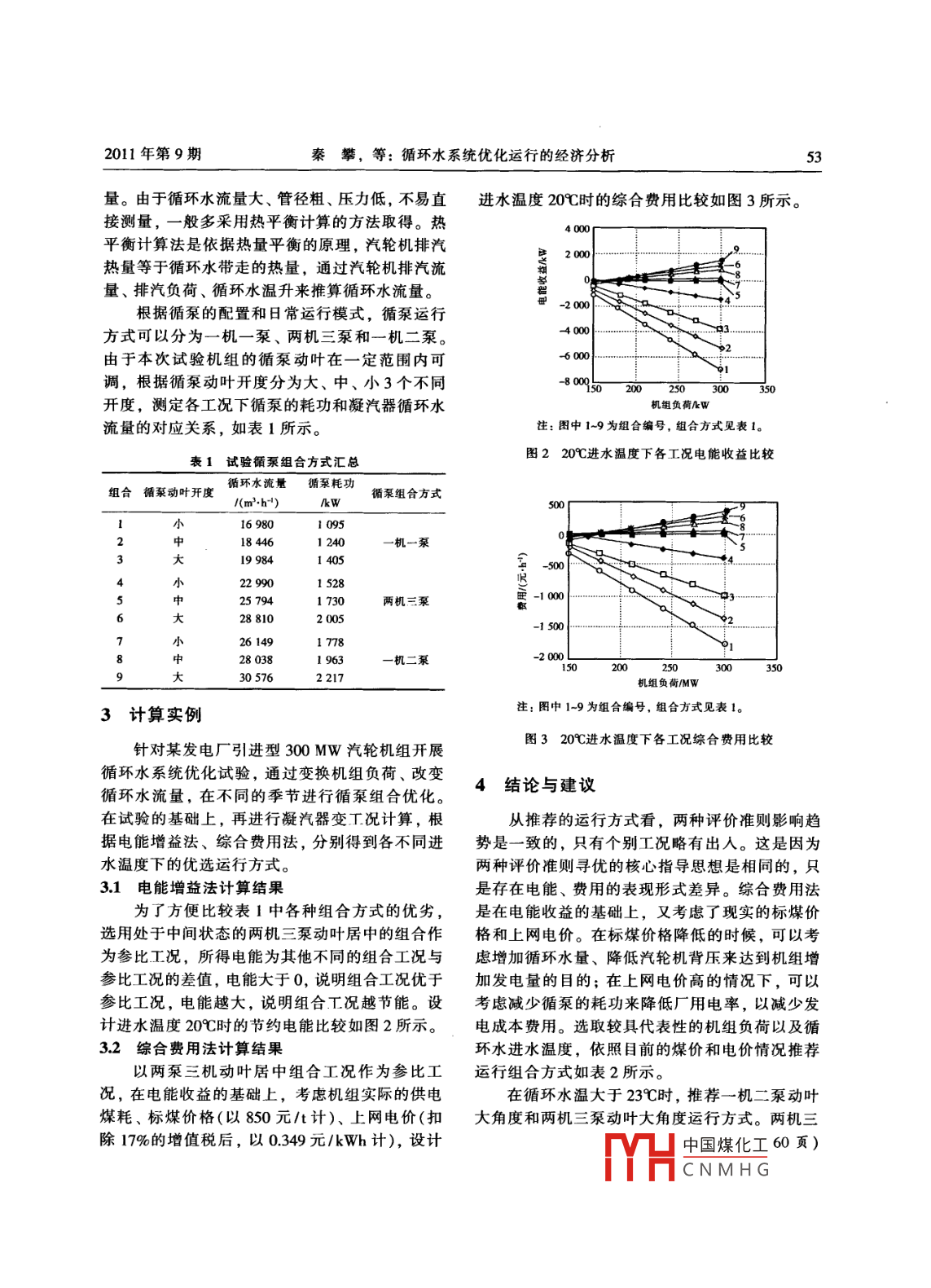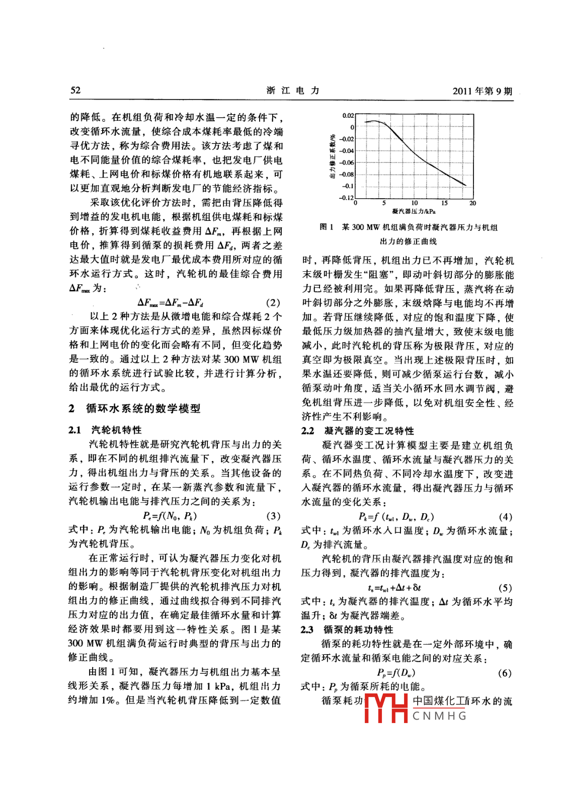 浙江電力2011年第9期ZHEJIANG ELECTRIC POWER5循環(huán)水系統(tǒng)優(yōu)化運行的經(jīng)濟分析秦攀',林閩成2,葉勁松2,孫永平',董益華(1浙江省電力試驗研究院,杭州310014;2.浙能溫州發(fā)電有限公司,浙江溫州325602)摘要:針對循環(huán)水系統(tǒng)對機組冷端運行經(jīng)濟性產(chǎn)生的影響,通過試驗、數(shù)值計算和理論分析,綜合研究循環(huán)水溫、循環(huán)水量、凝汽器特性、低壓缸排汽壓力等多種因素對機組負荷及經(jīng)濟性的影響,依據(jù)2個評價準則計算確定某300MW機組循環(huán)水系統(tǒng)在不同循環(huán)水溫、不同負荷條件下的經(jīng)濟運行方式,并對該型機組循環(huán)水系統(tǒng)的實際優(yōu)化運行方式的選取方法進行討論和分析。關(guān)鍵詞:300MW機組;循環(huán)水泵;優(yōu)化運行;評價準則中圖分類號:TK2641文獻標志碼:B文章編號:1007-1881(2011)090051-03Economic analysis on Optimal Operation of Circulating Water SystemQIN Pan, LIN Min-cheng2, YE Jin-song SUN Yong-ping, DONG Yi-hua(1. Zhejiang Electric Power Test and Research Institute, Hangzhou 310014, China2. Zhejiang Energy Wenzhou Power Generation Co, Ltd, Wenzhou Zhejiang 325602, China)Abstract: In view of the influence of circulating water system on cold-end system operation economy of u-nits, this paper carries out the comprehensive research on the influence of multiple factors such as circulatinwater temperature, circulating water volume, condenser characteristics, exhaust steam pressure of low pres-sure cylinder on the unit load and economy through the tests, numeric calculation and theoretical analysis.The economic operation modes of the circulating water system for 300 MW unit under different circulating water temtures and loads are confirmed after the calculation according to the two evaluation criteria, and thselection method of actual optimal operation mode of the circulating water system for the unit of this type isanalyzKey words: 300 MW unit; circulating water pump; optimal operation; evaluation criteria循環(huán)水系統(tǒng)的優(yōu)化運行,對發(fā)電機組的凈輸確定循環(huán)水系統(tǒng)優(yōu)化運行的判定準則,最常出電能有一定的影響,對提高發(fā)電廠的經(jīng)濟性有使用的方法是電能增益法。對1臺機組而言,在著積極的作用。在機組日常運行過程中,隨著環(huán)機組負荷和冷卻水溫一定的條件下,增加循環(huán)水境溫度及機組負荷的變化,可以采取改變循環(huán)水流量,會降低汽輪機的背壓,汽輪機的電能會隨泵(簡稱循泵)運行方式來調(diào)整循環(huán)水流量、改善著機組背壓的降低而增加。同時增加的循環(huán)水流機組真空、提高汽輪發(fā)電機組的運行效率。因量又會使循泵的耗功增加。當汽輪機電能的微增此,在機組負荷、環(huán)境溫度及循環(huán)水流量之間存值△P與循泵的耗電增加值ΔP。之間的差值達到在一個尋優(yōu)的目標,找到在不同負荷、不同環(huán)境最大時,所對應的循環(huán)水流量即為最佳循環(huán)水流溫度下最優(yōu)的循環(huán)水流量,就可以把機組整體的量。這時,汽輪機的最大凈增電能△P=m為:運行能耗降到最低。△P=△P-△P12綜合費用法1循環(huán)水系統(tǒng)優(yōu)化的評價準則發(fā)電廠作為電力市場競爭的主體,不僅關(guān)心11電能增益法電能的節(jié)省,同TYH中國煤化工合成本CNMHG52浙江電力2011年第9期的降低。在機組負荷和冷卻水溫一定的條件下改變循環(huán)水流量,使綜合成本煤耗率最低的冷端受0.02尋優(yōu)方法,稱為綜合費用法。該方法考慮了煤和電不同能量價值的綜合煤耗率,也把發(fā)電廠供電-00煤耗、上網(wǎng)電價和標煤價格有機地聯(lián)系起來,可以更加直觀地分析判斷發(fā)電廠的節(jié)能經(jīng)濟指標。采取該優(yōu)化評價方法時,需把由背壓降低得到增益的發(fā)電機電能,根據(jù)機組供電煤耗和標煤凝汽器壓力kPa價格,折算得到煤耗收益費用△Fn,再根據(jù)上網(wǎng)圖1某300MW機組滿負荷時凝汽器壓力與機組電價,推算得到循泵的損耗費用△F4,兩者之差出力的修正曲線達最大值時就是發(fā)電廠最優(yōu)成本費用所對應的循時,再降低背壓,機組出力已不再增加,汽輪機環(huán)水運行方式。這時,汽輪機的最佳綜合費用末級葉柵發(fā)生“阻塞”,即動葉斜切部分的膨脹能△F為力已經(jīng)被利用完。如果再降低背壓,蒸汽將在動△F=AFn-△F(2)葉斜切部分之外膨脹,末級焓降與電能均不再增以上2種方法是從微增電能和綜合煤耗2個加。若背壓繼續(xù)降低,對應的飽和溫度下降,使方面來體現(xiàn)優(yōu)化運行方式的差異,雖然因標煤價最低壓力級加熱器的抽汽量增大,致使末級電能格和上網(wǎng)電價的變化而會略有不同,但變化趨勢減小,此時汽輪機的背壓稱為極限背壓,對應的是一致的。通過以上2種方法對某300MW機組真空即為極限真空。當出現(xiàn)上述極限背壓時,如的循環(huán)水系統(tǒng)進行試驗比較,并進行計算分析,果水溫還要降低,則可減少循泵運行臺數(shù),減小給出最優(yōu)的運行方式。循泵動葉角度,適當關(guān)小循環(huán)水回水調(diào)節(jié)閥,避2循環(huán)水系統(tǒng)的數(shù)學模型免機組背壓進一步降低,以免對機組安全性、經(jīng)濟性產(chǎn)生不利影響。21汽輪機特性2.2凝汽器的變工況特性汽輪機特性就是研究汽輪機背壓與出力的關(guān)凝汽器變工況計算模型主要是建立機組負系,即在不同的機組排汽流量下,改變凝