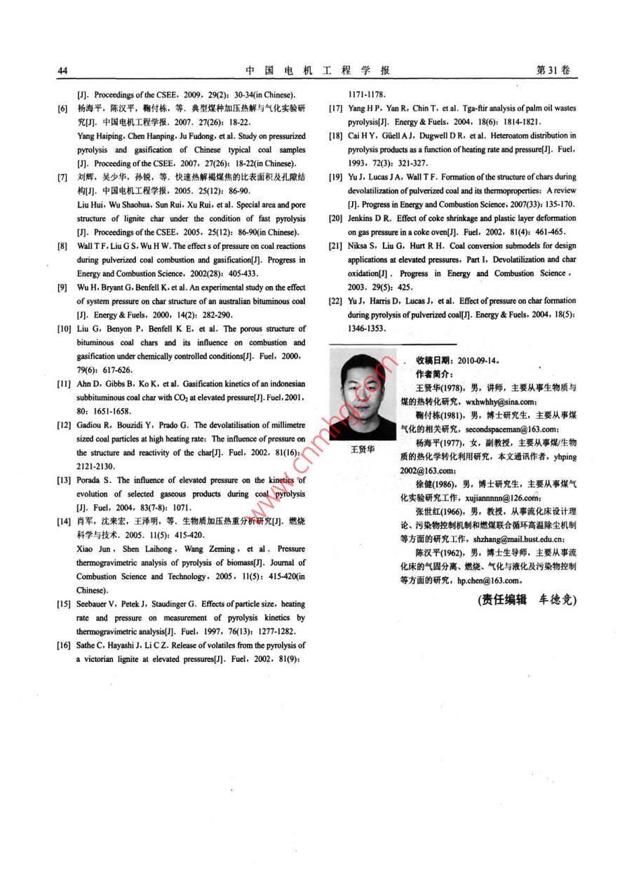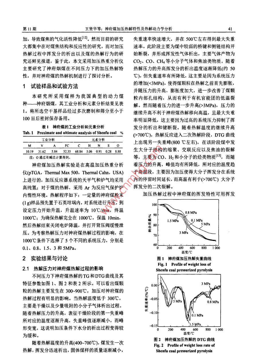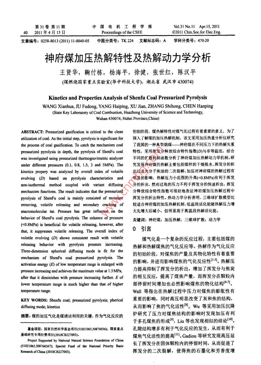 第31卷第11期中國電機(jī)工程學(xué)報(bào)Vol.31 No.11 Apr:Is, 2011402011年4月15日Proceedings of the CSEEC2011 Chin.Soc.for Elec.Eng.文章編號(hào): 0258-8013 (2011) 1-00405中圖分類號(hào): TK224文獻(xiàn)標(biāo)志碼: A學(xué)科分類號(hào): 470.20神府煤加壓熱解特性及熱解動(dòng)力學(xué)分析王賢華,鞠付棟,楊海平,徐健,張世紅,陳漢平(煤燃燒國家重點(diǎn)實(shí)驗(yàn)室(華中科技大學(xué)),湖北省武漢市430074)Kinetics and Properties Analysis of Shenfu Coal Pressurized PyrolysisWANG Xianhua, JU Fudong, YANG Haiping, XU Jian, ZHANG Shihong, CHEN Hanping(State Key Laboratory of Coal Combustion, Huazhong University of Science and Technology,Wuhan 430074, Hubei Province,China)ABSTRACT: Pressurized gasification is critical to the clean初始階段,煤熱解特性對(duì)煤氣化過程有著重要的意義。為了utilization of coal. As the initial step, pyrolysis is significant for深入了解煤的加壓熱解機(jī)制,該文采用加壓熱重分析儀研究the process of coal gasification. To catch the mechanism coal了我國的一種典型煙煤神府煤在 不同壓力下的熱解失重pressurized pyrolysis in depth, the pyrolysis of ShenFu coal特性,采用揮發(fā)分釋放綜合特性指數(shù)(D)與非等溫法,結(jié)合was investigated using pressurized thermogravimetric analyzer不同的擴(kuò)散機(jī)制函數(shù)分析了神府煤加壓熱解動(dòng)力學(xué)機(jī)制。研under dfferent pressures (0.1, 0.8, 1.5, 3 and 5MPa). The究發(fā)現(xiàn)神府煤的熱解主要包括煤樣的干燥脫水、揮發(fā)分的析kinetics propery was analyzed by overall index of volatile出以及大分子焦油的二次裂解:加壓對(duì)神府煤的熱解過程有evolving (D) based on pyrolysis characteristics and明顯的影響,熱解壓力小范圍的升高(<0.8MPa)有利于揮發(fā)non-isothermal method coupled with variant diffusing分的析出,然而過高的壓力不利于揮發(fā)分的快速析出,揮發(fā)mechanism functions. The result indicates that the pressurized分釋放綜合特性指數(shù)可很好地表征神府煤加壓熱解過程中pyrolysis of ShenFu coal is mainly consisted of moisture揮發(fā)分的析出特性。熱動(dòng)力學(xué)分析表明,三維球擴(kuò)散模型比removing, volatile releasing and secondary cracking of較適合神府煤的加壓熱解機(jī)制,低溫段活化能隨熱解壓力增macromolecular tar. Pressure has great influence on the大先增大后減小,但明顯高于高溫段熱解活化能。behavior of ShenFu coal pyrolysis. The enhance of pressure關(guān)鍵詞:神府煤;加壓熱解;三維球擴(kuò)散:動(dòng)力學(xué)(<0.8MPa) is beneficial for volatile releasing, however, afterthat, it suppresses volatile releasing. The overall index of0引言volatile evolving (D) shows consistent result with volatile煤氣化是-一個(gè)復(fù)雜的反應(yīng)過程,主要包括煤的releasing behavior with pyrolysis pressure increasing.熱解和熱解煤焦的氣化反應(yīng)等。熱解作為氣化反應(yīng)Three-dimension spherical diffusing mode is fit for the的初始階段,對(duì)煤焦的產(chǎn)量及其物化特性有著重要mechanism of ShenFu coal pressurized pyrolysis. Th的影響,并進(jìn)而影響煤焦的氣化反應(yīng)性-3)。熱解壓activation energy (E) of low temperature range is enlarged withpressure incrcasing and achieves the maximum value at 1.5MPa,力提高抑制了揮發(fā)分的析出,增加了揮發(fā)分與焦炭afer that it diminishes with pressure increasing further. E of的相互反應(yīng),提高了煤焦產(chǎn)量,而揮發(fā)分在顆粒內(nèi)lower temperature range is much higher than that of higher部停留時(shí)間增加也必然影響煤焦的物化結(jié)構(gòu)|47]。temperature range.Wall等指出在熱解過程中壓力對(duì)煤焦的膨脹性有KEY WORDS: Shenfu coal; pressurized pyrolysis; pherical重要的影響,同時(shí)高壓明顯改變了灰和焦的結(jié)構(gòu),diffusing mode; kinetics從而影響了焦的氣化活性8。Wu等采用加壓沉降摘要:煤的加壓氣化是煤清潔利用的關(guān)鍵,作為氣化反應(yīng)的爐研究了壓力對(duì)煤焦結(jié)構(gòu)的影響時(shí)發(fā)現(xiàn)加壓有利于多孔煤焦的形成!", Liu等也發(fā)現(xiàn)相似的結(jié)論l01?;痦?xiàng)目:國家自然科學(xué)基金項(xiàng)目(51021065,50876036; 國家重點(diǎn)孔隙結(jié)構(gòu)增多有利于氣化反應(yīng)的發(fā)生,從而有利于基礎(chǔ)研究專項(xiàng)經(jīng)費(fèi)項(xiàng)(010C8227003)。煤焦氣化活性的提高"。Gadiou等研究發(fā)現(xiàn)高壓延Project Supported by National Natural Science Foundation of China長了揮發(fā)分在固體顆粒內(nèi)的停留時(shí)間,從而促進(jìn)了(51021065.508760367); Special Fund of tbe National Priority BasicRescarch of China (2010CB22003).揮發(fā)分的二次裂解,使得焦的石墨化和芳香度增第11期王賢華等:神府煤加壓熱解特性及熱解動(dòng)力學(xué)分析41加,導(dǎo)致煤焦的氣化活性降低([2。然而目前的研究失重速率快速增大,并在500"C 左右得到最大失重大都集中在對(duì)煤焦結(jié)構(gòu)和反應(yīng)性的研究,而對(duì)加壓速率。此階段主要為煤中較弱的橋鍵和側(cè)鏈結(jié)構(gòu)開熱解過程中揮發(fā)分的析出以及煤的熱解行為的研始斷裂,并形成揮發(fā)性氣體析出,主要?dú)怏w產(chǎn)物為究還鮮,見報(bào)道,鑒于此,本文采用加壓熱重分析儀CO2、CO、 CH4等小分子氣體和焦油類物質(zhì)。隨著主要研究了神府煙煤在不同壓力下的加壓熱解特?zé)峤鈮毫Φ纳邠]發(fā)分的析出溫度逐漸降低(約50性,并對(duì)神府煤的熱解機(jī)制進(j