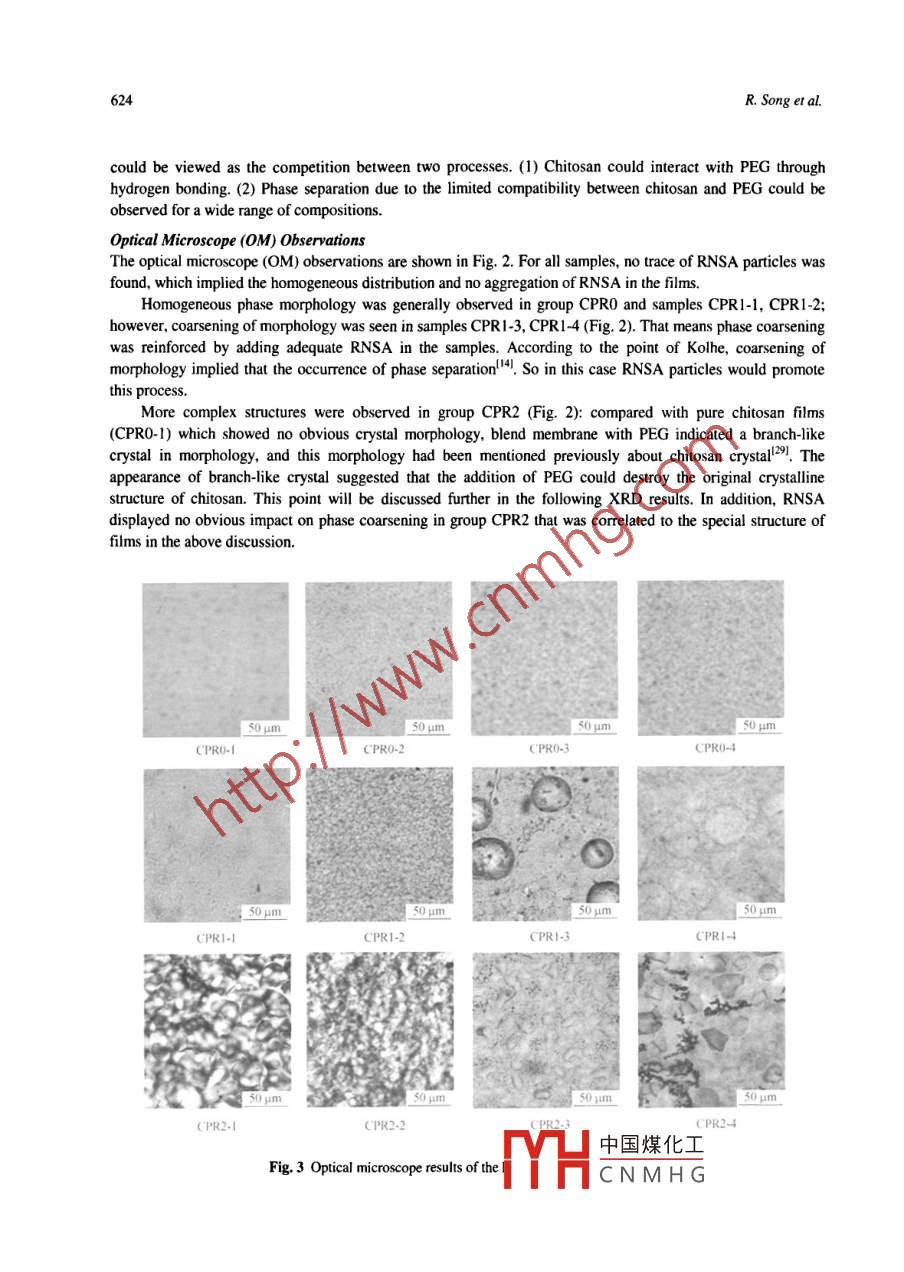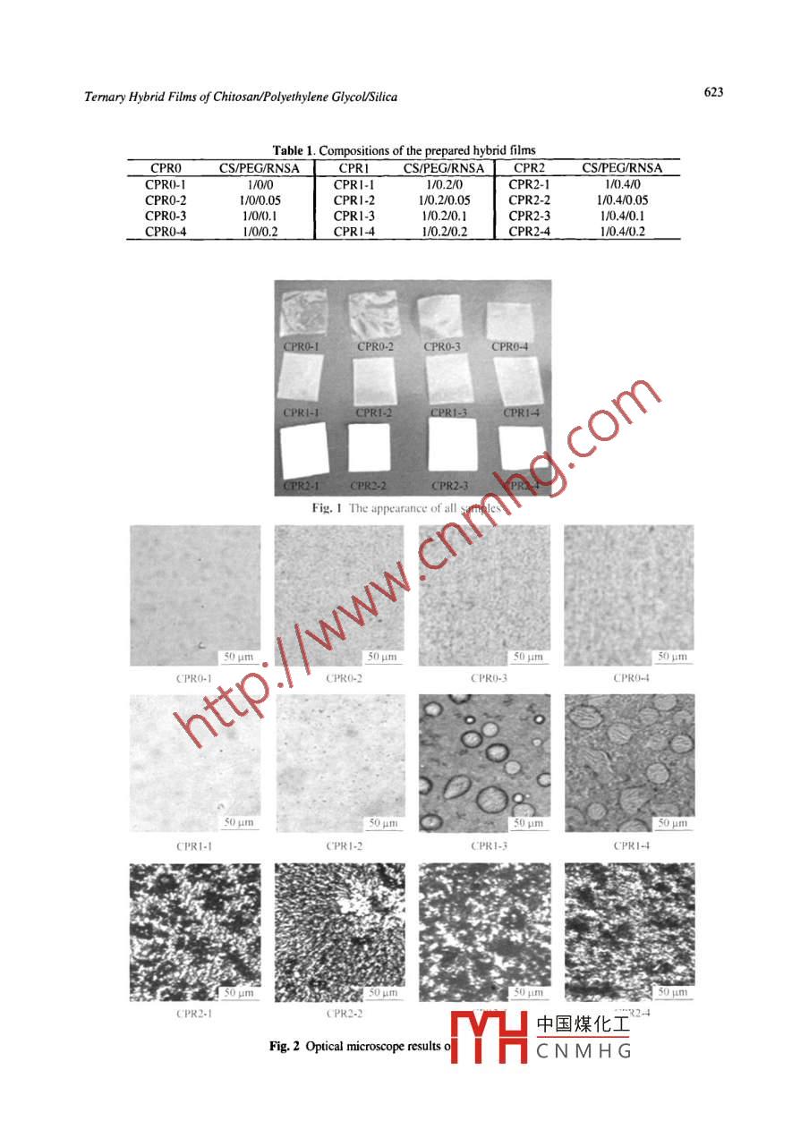 Chinese Joumal of Polymer Science Vol. 26, No.5, (2008), 621-630Chinese Journal ofPolymer Science⑥2008 World ScientificTHE STRUCTURE AND PROPERTIES OF CHITOSANPOLYETHYLENEGLYCOL/SILICA TERNARY HYBRID ORGANIC-INORGANIC FILMSRui Song* , Rui Xue', Ling-hao He", Ying Liu* and Qiao-ling Xiao'#Henan Provincial Key Laboratory of Surfuce & Interface Science, Zhengzhou University of Light Indusry,Zhengzhou 450002, ChinaCollege of Chemistry and Chemical Engineering, Graduate University of Chinese Academry of Sciences,Beiing 100049, ChinaAbstract The termary hybrid flms consisting of chiosan (CS), polyethylene glycol (PEG) and nano-sized silica which wassurface-modified by amino groups (RNSA) were prepared. The structures of the blend membranes were characterized byattenuation total reflection-infrared spectroscopy (ATR-IR), X-ray diffraction (XRD), optical microscopy (OM) anddifferential scanning calorimetry (DSC). The results showed that the addition of silica affected not only the distribution andcrytallinity of PEG on the sample surface. but also the phase coarseness and the crystalline structure of chitosan in the blendsystem. Moreover, PEG changed the crystalline structure of chitosan. Upon annealing (at 100C for 1 h), the blends wouldshow the altered crystalline structure of chitosan, the reinforced phase coarseness, as well as the decreased miscibility andinteraction between chitosan and PEG.Keywords: Chitosan; Poly(ethylene glycol); Silica; Annealing.INTRODUCTIONChitosan is a polycation derived from chitin, a natural polysaccharide usually obtained from carapaces of themarine crustaceans such as crabs and shrimps'". Chitosan has amino groups and hydroxyl groups on itsbackbone, which on one hand makes chitosan itself hydrophilic and on the other hand brings chitosan a .polycationic property. Several studies have indicated that chitosan has some important advantagesl-9I, such asbiodegradation, antibiosis, biocompatibility, non-toxicity, good film-forming characters and excellent chemical-resistant properties which allow its use in many areas such as in clinicsl2), drug delivery systems'3, solidpolyelectrolytes'*, surfactants'sl, membranes for ultra-filtration, reverse osmosis and evaporation' 0.Owing to its functional properties, chitosan has been widely investigated for the last two decades onindustrial and biomedical applications, which is expected to be useful in the development of composite materialssuch as blends or hybrids with other polymers and inorganic nanoparticles. Specially, blends with otherpolymers such as polycaprolactonelol, polyvinylpyrolidone) (PVP)", DNAI!12, nylonl'3l, polyethylene glycol(PEG)4-I7I, starch!'8, pullulan!'!, poly(vinyl alcohol) (PVA)I9 221 et al. have shown favorable properties, whichare recognized as materials supporting chitosan to obtain material with sufficient mechanical strength of preparedfilms and fibers. Some researches about the compatibility and interaction between the components have beenreported. Among all the alternatives, poly(ethylene glycol) (PEG) is of particular interest owing to its usefulproperties such as low toxicity, immunogenicity, biocompatibility and biodegradability. Alexeev et al. foundsignificant improvement in mechanical properties of chitosan blending with PEGIS, l6l. Kolhe concluded that'This work was prially subsidized by Henan Innovation Project for中國煤化工ens (HAIPURT")program.“Corresponding author: Rui Song (宋銳), E-mail: rsong@ gucas.ac.cn.MYCHCNMHGReceived June 20, 2007; Revised August 23, 2007; Acepted September 1,2w/622R. Song etal.blending was a more efficient way to improve ductility of chitosan. For blend consisting of PEG and chitosanwhich was supposed to be the parially miscible blend, the improvement of blend in compatibility and propertiesis dependent on 'well-dispersion', crystallinity of PEG as well as phase coarsening and intermolecularinteractions4. However, the influences on crystal properties of each other have not well been understood. Inaddition, hybriding with inorganic nanoparticles such as silial2-21 or carbon nanotube (CNT)281 was usuallyconsidered to be an effective method to improve the properties of materials by interaction with components.However, the influence of inorganic nanoparticles on blends had been investigated scarcely. Since the propertiesof films were settled by factors such as crystalline structures of ingredients, morphologies of films and molecularinteractions, the investigation about the influences of inorganic nanoparicles on these properties will be highlynecessary.The objective of this investigation was to explore the effects of silica on the chitosan/PEG blend flms,including dispersion and crystal properties of PEG as well as phase separation and coarsening. Besides themiscibility and interaction between chitosan and PEG, the influence of silica on the process of annealing wasalso investigated in order to understand the interaction involved.EXPERIMENTALMaterialsChitosan with a degree of deacetylation of 93% was received from Shanghai Reagent Company, China. PEG(Mw = 10000) was received from Tianjin Chemical Reagent Company, China. Silica with surface modified byamino groups and with diameter of ca. 20 nm (RNSA hereinafter), was supplied by Prof. Z.J. Zhang in HenanUniversity, China.Preparation of Hybrid MembranesChitosan was dissolved in 2 vol% aqueous acetic acid solution at a concentration of 2 wt%. Appropriate amountof PEG and RNSA were added to the solution, and the mixture was thoroughly stired until there was no airbubble in the solution. Films were obtained by casting solution on a glass dish and allowing the solvent toevaporate at 40°C. To check the annealing effect, all samples were treated at 100°C under vacuum for I h, andthen cooled down to room temperature in the vacuum.CharacterizationsAttenuation total reflection-infrared spectra (ATR-IR Bruker-TENSOR 27) were used to probe surface characterof films. For all the measurements, the spectra were o