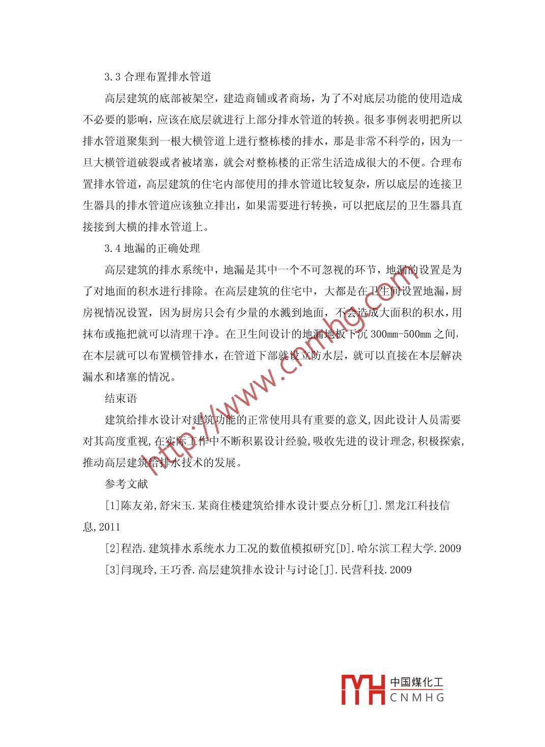建筑給排水的優(yōu)化設(shè)計(jì)研究武智佳河北工業(yè)職業(yè)技術(shù)學(xué)院河北050091摘要:建筑用水需求量高、排水量大、層數(shù)多、高度大、振源多,對給水系統(tǒng)排水系統(tǒng)的設(shè)計(jì)以及材料施工和日常管理上提出了更高的要求。本文研究了建筑給排水設(shè)計(jì)方法。.關(guān)鍵詞:高層建筑;給水系統(tǒng);排水系統(tǒng);設(shè)計(jì);研究中圖分類號: TU97文獻(xiàn)標(biāo)識碼: A文 章編號:引言建筑給排水的設(shè)計(jì)影響到人們的正常生活,合理的設(shè)計(jì)、科學(xué)的管理以及優(yōu)質(zhì)的施工質(zhì)量是保證系統(tǒng)安全有效運(yùn)行的關(guān)鍵,采用新技術(shù)新措施才能更加保障給水系統(tǒng)排水系統(tǒng)更好的運(yùn)行,達(dá)到高層建筑對水系統(tǒng)的高要求。1、建筑給排水工程特點(diǎn)(1)靜水壓力是高層建筑給排水消防系統(tǒng)設(shè)計(jì)時(shí)需要重點(diǎn)考慮的因素,相對普通低層建筑而言,高層建筑給排水消防系統(tǒng)靜水壓力較大,而如果采用常規(guī)的一個(gè)區(qū)供水,使用效果很難保證,而且也很容易造成管道和配件的損壞。(2)安全可靠性是高層建筑消防系統(tǒng)另-一個(gè)重要因素,高層建筑可以誘發(fā)火災(zāi)的因素較多,火勢蔓延速度快,而且撲球起來非常困難,因此確保消防系統(tǒng)的安全可靠性是重中之重,鑒于目前我國的國情,消防系統(tǒng)設(shè)計(jì)時(shí)應(yīng)將自救放在第一位。(3)高層建筑由于高度比較大,所以排水管道比較長,而且排水量也比普通建筑大,故管道內(nèi)部的壓力起伏很大。所以高層建筑給排水設(shè)計(jì)時(shí),需要保證排水系統(tǒng)的排水能力、管道內(nèi)壓力的穩(wěn)定以及保護(hù)水封不被破壞。綜合考慮這幾點(diǎn),高層建筑的排水量管道應(yīng)采用機(jī)械強(qiáng)度較高的管道材料,并采用柔性接口。(4)給排水系統(tǒng)需要非常穩(wěn)定。高層建筑的建筑標(biāo)準(zhǔn)高,而且給排水設(shè)備的使用人數(shù)也是非常多,水的消耗量也非常大,如果供水不穩(wěn)定,出現(xiàn)停水或管道堵塞的情況,那么會造成非常惡劣的影響。故因此采取多種措施,保證給水排水系統(tǒng)的穩(wěn)定性。此外,高層建筑的給水排水需要考慮進(jìn)行噪音中國煤化工YHCNMH G2、建筑給水系統(tǒng)設(shè)計(jì)2.1明確高層建筑給水方式高層建筑常用的就有高位水箱、氣壓罐和變頻泵無水箱三個(gè)給水設(shè)備,正確選擇高層建筑的供水方式,采用最科學(xué)合理的供水設(shè)備,選用技術(shù)先進(jìn)、供水安全以及經(jīng)濟(jì)合理的供水設(shè)備,是高層建筑正常供水的核心關(guān)鍵,選擇合理的給水方式,使用合適的給水設(shè)備,對高層建筑的影響作用非常大。2.1. 1高位水箱給水高位水箱具有存儲和調(diào)節(jié)水量和水壓的作用,離心水泵負(fù)責(zé)給水箱里加水。其供水方式有水箱和水泵,不僅可以并聯(lián)供水、串聯(lián)供水,還可以對水箱或是閥門進(jìn)行減壓供水。高位水箱不僅可以存儲相當(dāng)可靠的水量可以比較安全供水,水壓相對穩(wěn)定,效率高,而且設(shè)備費(fèi)和管理費(fèi)都相對較低。但是高位水箱占建筑面積大,增加了高層建筑的受壓,要投入更多的基建資金,而且水箱里的水容易被污染,防水進(jìn)去的時(shí)候還產(chǎn)生振動,發(fā)出噪音。2.1.2氣壓罐給水氣壓罐是一個(gè)密閉的鋼制容器,由氣壓罐和離心水泵組成,利用罐內(nèi)空氣壓縮存儲水量進(jìn)行供水,水量達(dá)到一.定程度就自動停止供水,非常節(jié)能,水泵的循序啟動和軟啟動功能實(shí)現(xiàn)了無塔也能供水的目的。氣壓罐供水不僅不占高層建筑的面積,減少建筑的負(fù)荷,水質(zhì)不容易被污染,節(jié)約了資金投入,而且控制自動化,大大方便集中管理,但是供水波動不穩(wěn)定,水量存儲少,因而要頻繁啟動水泵,在高壓或低壓狀態(tài)下,水泵的工作效率低,導(dǎo)致水泵的使用壽命相對的縮短,氣壓罐供水的沒有高位水箱供水可靠。2.1.3變頻泵無水箱給水水泵機(jī)組和單片機(jī)變頻技術(shù)構(gòu)成變頻泵無水箱,電壓和頻率被變報(bào)器的電源改變,電動機(jī)的交流轉(zhuǎn)速得到有效的控制。變頻泵無水箱是一個(gè)可以隨意調(diào)節(jié)流量和水壓的設(shè)備,因?yàn)榭梢哉{(diào)節(jié)流量和水壓,所以可以.不用高位水箱,避免了占地面積和重力對高層建筑的影響。2.2選用合適的給水管道傳統(tǒng)的給水管道通常是熱鍍鋅鋼管,但是這種鋼管重量大、非常容易生銹,影響水的質(zhì)量,無法滿足人們對生活用水的要求。目前,重量輕、經(jīng)濟(jì)實(shí)惠、液體流動性好、耐壓度強(qiáng)、安裝方便、耐腐蝕性強(qiáng)以及使中國煤化工塑料YHCNMHG水管被廣泛應(yīng)用。給水管材的選擇,要考慮質(zhì)量、重量、經(jīng)濟(jì)、使用的環(huán)境、承受壓力的程度、承受的最高溫度以及安裝的方式等,要綜合技術(shù)和經(jīng)濟(jì)的實(shí)際情況后進(jìn)行給水管道的選擇。2.3合理布置給水管道給水管道的布置,要滿足高層建筑里的用戶的生活用水的要求,選擇合適的管道長度和管道的內(nèi)徑,盡量降低成本。但是現(xiàn)在我們國家還不是特別重視高層建筑的管道布置,最大的原因也許是高層