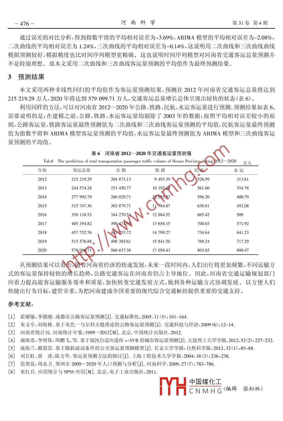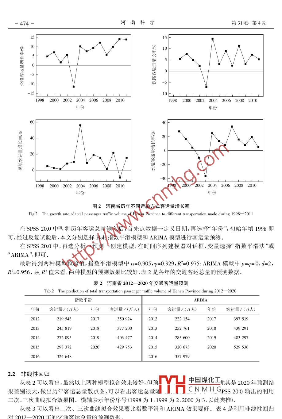 第31卷第4期河南科學VoL31 No.42013年4月HENAN SCIENCEApr. 2013文章編號: 1004- -3918(2013)04 -0472-05河南省2012--2020年交通客運量預測與分析范賀花,周永衛(wèi)(鄭州航空工業(yè)管理學院數(shù)理系,鄭州450015)摘要:以1998-2011年河南統(tǒng)計年鑒中列出的河南省歷年交通客運量數(shù)據(jù)為研究對象,運用時間序列模型(指數(shù)平滑和ARIMA模型)和非線性回歸方法,對河南省2012-2020年的交通客運總量以及各交通運輸方式客運量做出預測.預測結(jié)果顯示:未來幾年公路交通客運在河南省仍占主導地位,河南省交通客運總量2012年達到215 219.29萬人,其中公路.鐵路、民航、水運客運總量分別為204 873.13. 9493.39. 526.99.313.61萬人,2020年客運總量將達到579 099.71萬人.關(guān)鍵詞:客運量預測;時間序列;指數(shù)平滑; ARIMA 模型中圖分類號: U; 0 211.6.文獻標識碼: AForecasting and Analysis of Transit Passenger Volume inHenan Province During 2012- 2020Fan Hehua,Zhou Yongwei(Department of Math and Physics, Zhengzhou Institute of Aeronautical Industry Management, Zhengzhou 450015, China)Abstract: The thesis regards the transit passenger volume data of Henan Province which are listed in StatisticalYearbook of Henan in 1998- -2011 as the objective of research. The paper predicts the total and diferent transpor-tation passenger traffie volume in 2012- 2020 by means of time series model (exponential smoothing and ARIMAmodel) and nonlinear regression. Predict results show that highway passenger transportation is the dominant modein the future couple years, the total passenger trafic volume of Henan Province will reach 2 152.192 9 million in 2012,where the passenger volume of highway , railway , civil aviation and water way will reach 2 048.731 3,94.933 9,5.269 9,3.136 1 million respectively ,and the total passenger traffic volume will reach to 5 790.997 1 million in2020.Key words: passenger traffic volume prediction; time series; exponential smoothing; ARIMA model交通運輸客運量是衡量旅客運輸生產(chǎn)勞動量的重要尺度-2),是統(tǒng)計期內(nèi)運送的旅客數(shù)量,也是評價運輸組織效果的重要指標,交通運輸客運量體現(xiàn)了運輸組織方式滿足社會需要程度的大小.對河南省交通客運量及其發(fā)展趨勢進行預測與分析,可以有效地規(guī)劃和組織河南省旅客運輸,為河南省交通運輸規(guī)劃提供決策的理論依據(jù),提高交通運輸經(jīng)濟效益和社會效益,為建設(shè)中原經(jīng)濟區(qū)、加快中原崛起、河南振興提供重要的交通支持.1河南省歷年交通客運量變化趨勢分析河南省位于黃河中下游,東接安徽、山東,北界河北、山西,西連陜西,南臨湖北。全省總面積16.7萬km',總?cè)丝?667萬,轄18個省轄市.河南省是全國最重要的陸路交通樞紐之一,交通區(qū)位優(yōu)勢十分明顯、經(jīng)過多年建設(shè),河南省交通運輸?shù)囊?guī)模、方式發(fā)生了巨大變化,現(xiàn)已形成集公路、鐵路、水運、航空為一體的綜合中國煤化工收稿日期: 2013-01-11MHCNMHG基金項目:國家自然科學基金(71171027);河南省政府招標課題(2012B689);河南省自然科學基金(22300410181);河南省教育廳自然科學基金(13A1 10399) ;鄭州航院青年基金資助(20121 1300)作者簡介:范賀花(1978-),女,河南周口人,講師,碩士,研究方向為馬爾可夫過程及其應(yīng)用.2013年4月范賀花,等:河南省2012- -2020 年交通客運量預測與分析運輸體系.2011年,全省主要交通運輸方式共完成客運量19.38 億人時,是1952年1032萬人的187.8倍、改革開放初期(1978年)1.11億人的17.5 倍.其中公路客運量為18.42億人,占河南省交通客運總量的95.06%,鐵路客運量為8804萬人(表1),占河南省總客運量的4.5%,表明公路旅客運輸在河南省整個客運交通運輸體系中據(jù)主導地位.表1河南省1998- 2011 年歷年客運量Tab.1 The total transportation passenger raffce volume of Henan Province during 1998- 201110+人年份客運總量 公路鐵路民航水運1998 74 25769 9174214715:200598 13691 92058792409199978 10673 4934462757e2006 108 212101 345 6465971052000 84 02379 0174838 .77912007 122 594 115 4606622352160200185 52480 2595092789:2008 130 436 122 414 7476356190200290 45585 078520682009 144 659 136 279 7718456206200381 32376 30148646:2010 167 641 158 6308338418255200491 01385 0165695218842011 193 781184 2138804496268注:資料來源于河南統(tǒng)計年鑒(1999- -2012) .河南省交通客運量1998年至2011年這14年來5↑增加119 524萬人,平均年增長率為11.5%。這一-過10程中,客運量增長率總體趨勢在上升,但上升趨勢有所減緩.1998 年至今交通客運量的變化趨勢主要表必(現(xiàn)為:交通客運量總數(shù)逐年增長,各年之間增長相對軒-5|-平穩(wěn),1998一2005 年,年增長幅度比較小,年增長速-10 t度比較平緩,年平均增長率為3.67%,但2003年卻比2002年客運量有所減少(圖1),減少11.25%,這是因1998 2000 2002 2004 2006 2008 2010年份為2003年“非典”疫情的影響,交通運輸業(yè)是受“非典”疫情影響較大的行業(yè)之一-,當年全國范圍內(nèi)出現(xiàn)圖1河南省歷年客運總量增長率了交通客運量下降的情形,河南也不例外。2003 年Fig. 1 The growth rate of total transportation passenger taff河南省的公路、鐵路、水運客運量與2002年相比都有volume of Henan Province during 1998- -2011所減少(圖2).2006- 2011 年,客運增長較為平穩(wěn),總體呈現(xiàn)較快增長趨勢,年平均增長率約為10.68%.隨著河南省經(jīng)濟的快速發(fā)展,未來相當長的一段時間內(nèi),河南省交通客運量將維持持續(xù)增長,并且交通客運總量將迅速增加.2客運量預測關(gu