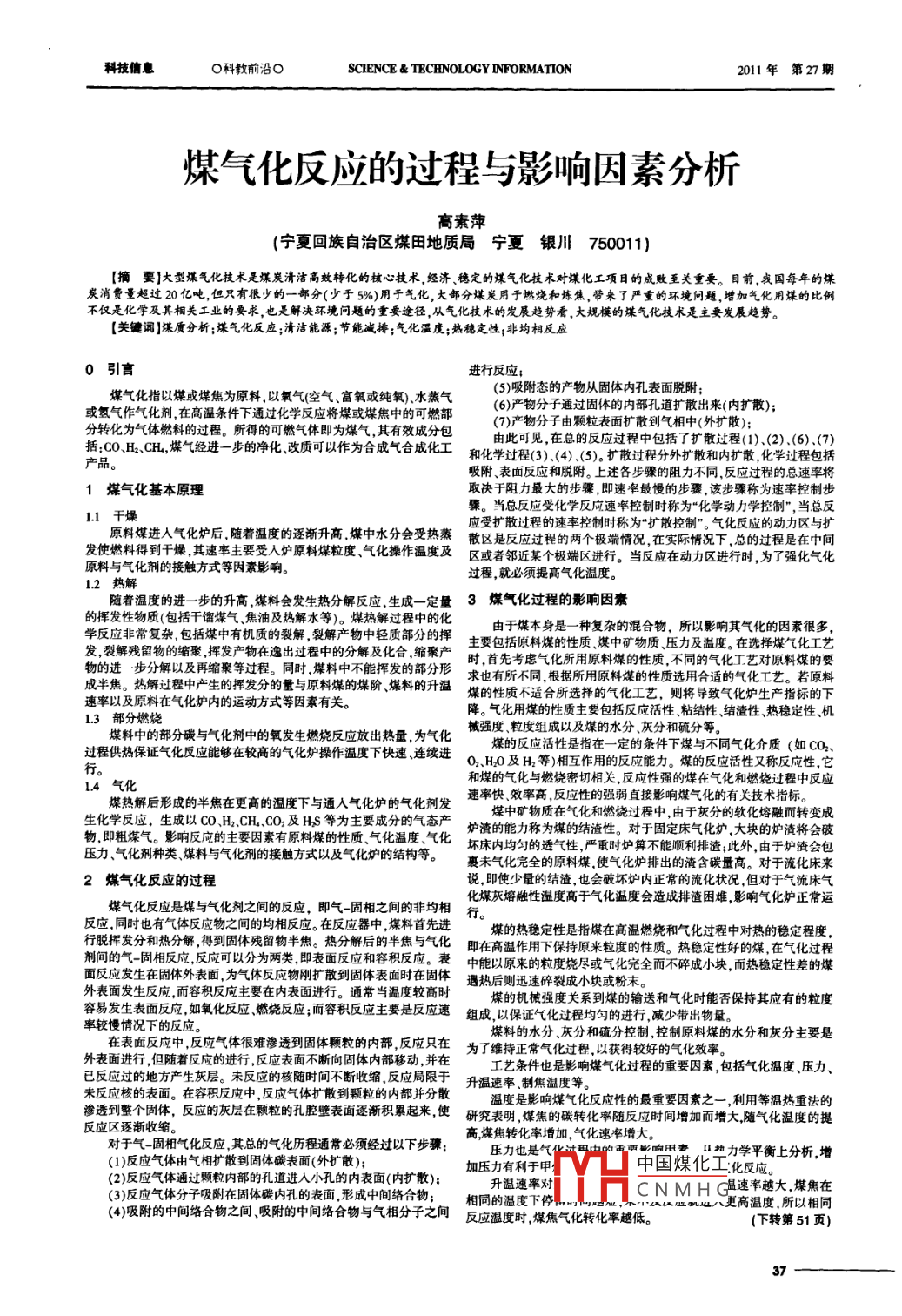 科技信息O科教前沿OSCIENCE TECHNOLOGY INFORMATION2011年第27期煤氣化反應(yīng)的過程與影響因素分析高素萍寧夏回族自治區(qū)煤田地質(zhì)局寧夏銀川750011)【摘要】大型煤氣化技術(shù)是煤炭清潔高效特化的核心技術(shù),經(jīng)濟(jì)、穗定的煤氣化技術(shù)對煤化工項(xiàng)目的成敗至關(guān)重要。目前,我國每年的煤炭消費(fèi)量超過20億噸,但只有很少的一部分(少于5%)用于氣化,大部分煤炭用于燃燒和煉焦,帶來了嚴(yán)重的環(huán)境問題,增加氣化用煤的比例不僅是化學(xué)及其相關(guān)工業(yè)的要求,也是解決環(huán)境問題的重要途徑,從氣化技術(shù)的發(fā)展趨勢看,大規(guī)模的煤氣化技術(shù)是主要發(fā)展趨勢,【關(guān)鍵詞】質(zhì)分析;煤氣化反應(yīng);清潔能源;節(jié)能減排;氣化度;熱穩(wěn)定性;非均相反應(yīng)0引言進(jìn)行反應(yīng)煤氣化指以煤或煤焦為原料,以氧氣(空氣、富氧或純氧)水蒸氣(5)吸附態(tài)的產(chǎn)物從固體內(nèi)孔表面脫附;或氫氣作氣化劑在高溫條件下通過化學(xué)反應(yīng)將煤或煤焦中的可燃部(6)產(chǎn)物分子通過固體的內(nèi)部孔道擴(kuò)散出來(內(nèi)擴(kuò)散);(7)產(chǎn)物分子由顆粒表面擴(kuò)散到氣相中(外擴(kuò)散);分轉(zhuǎn)化為氣體燃料的過程。所得的可燃?xì)怏w即為煤氣其有效成分包由此可見,在總的反應(yīng)過程中包括了擴(kuò)散過程(1)、(2)、(6)(7)括:COH2、CH,煤氣經(jīng)進(jìn)一步的凈化改質(zhì)可以作為合成氣合成化工和化學(xué)過程(3)、(4)、(5)。擴(kuò)散過程分外擴(kuò)散和內(nèi)擴(kuò)散化學(xué)過程包括產(chǎn)品。吸附、表面反應(yīng)和脫附。上述各步驟的阻力不同反應(yīng)過程的總速率將1煤氣化基本原理取決于阻力最大的步驟即速率最慢的步驟該步驟稱為速率控制步1.1干燥驟。當(dāng)總反應(yīng)受化學(xué)反應(yīng)速率控制時稱為“化學(xué)動力學(xué)控制”,當(dāng)總反應(yīng)受擴(kuò)散過程的速率控制時稱為“擴(kuò)散控制”。氣化反應(yīng)的動力區(qū)與擴(kuò)原料煤進(jìn)入氣化爐后隨著溫度的逐漸升高煤中水分會受熱蒸散區(qū)是反應(yīng)過程的兩個極端情況,在實(shí)際情況下,總的過程是在中間發(fā)使燃料得到干燥,其速率主要受人爐原料煤粒度氣化操作溫度及區(qū)或者鄰近某個極端區(qū)進(jìn)行。當(dāng)反應(yīng)在動力區(qū)進(jìn)行時為了強(qiáng)化氣化原料與氣化劑的接觸方式等因素影響過程,就必須提高氣化溫度熱隨著溫度的進(jìn)一步的升高煤料會發(fā)生熱分解反應(yīng)生成一定量3煤氣化過程的影響因素的揮發(fā)性物質(zhì)(包括干餾煤氣、焦油及熱解水等)。煤熱解過程中的化由于煤本身是一種復(fù)雜的混合物,所以影響其氣化的因素很多學(xué)反應(yīng)非常復(fù)雜包括煤中有機(jī)質(zhì)的裂解裂解產(chǎn)物中輕質(zhì)部分的揮主要包括原料煤的性質(zhì)煤中礦物質(zhì)壓力及溫度。在選擇煤氣化工藝發(fā)裂解殘留物的縮聚揮發(fā)產(chǎn)物在逸出過程中的分解及化合縮聚產(chǎn)時,首先考慮氣化所用原料煤的性質(zhì)不同的氣化工藝對原料煤的要物的進(jìn)一步分解以及再縮聚等過程。同時煤料中不能揮發(fā)的部分形求也有所不同根據(jù)所用原料煤的性質(zhì)選用合適的氣化工藝。若原料成半焦。熱解過程中產(chǎn)生的揮發(fā)分的量與原料煤的煤階、媒料的升溫煤的性質(zhì)不適合所選擇的氣化工藝,則將導(dǎo)致氣化爐生產(chǎn)指標(biāo)的下速率以及原料在氣化爐內(nèi)的運(yùn)動方式等因素有關(guān)13部分燃燒降。氣化用煤的性質(zhì)主要包括反應(yīng)活性粘結(jié)性、結(jié)渣性熱穩(wěn)定性、機(jī)煤料中的部分碳與氣化劑中的氧發(fā)生燃燒反應(yīng)放出熱量為氣化械強(qiáng)度粒度組成以及煤的水分灰分和硫分等。過程供熱保證氣化反應(yīng)能夠在較高的氣化爐操作溫度下快速連續(xù)進(jìn)煤的反應(yīng)活性是指在一定的條件下煤與不同氣化介質(zhì)(如CO2行O2、HO及H2等)相互作用的反應(yīng)能力。煤的反應(yīng)活性又稱反應(yīng)性,它14氣化和煤的氣化與燃燒密切相關(guān),反應(yīng)性強(qiáng)的煤在氣化和燃燒過程中反應(yīng)煤熱解后形成的半焦在更高的溫度下與通人氣化爐的氣化劑發(fā)速率快效率高反應(yīng)性的強(qiáng)弱直接影響煤氣化的有關(guān)技術(shù)指標(biāo)生化學(xué)反應(yīng),生成以C0H2CH、CO2及HS等為主要成分的氣態(tài)產(chǎn)煤中礦物質(zhì)在氣化和燃燒過程中由于灰分的軟化熔融而轉(zhuǎn)變成爐渣的能力稱為煤的結(jié)渣性。對于固定床氣化爐,大塊的爐渣將會破物即粗煤氣。影響反應(yīng)的主要因素有原料煤的性質(zhì)氣化溫度、氣化壞床內(nèi)均勻的透氣性嚴(yán)重時爐算不能順利排渣;此外由于爐渣會包壓力、氣化劑種類、煤料與氣化劑的接觸方式以及氣化爐的結(jié)構(gòu)等。裹未氣化完全的原料煤,使氣化爐排出的渣含碳量高。對于流化床來2煤氣化反應(yīng)的過程說,即使少量的結(jié)渣,也會破壞爐內(nèi)正常的流化狀況,但對于氣流床氣煤氣化反應(yīng)是煤與氣化劑之間的反應(yīng),即氣固相之間的非均相行化煤灰熔融性溫度高于氣化溫度會造成排渣困難影響氣化爐正常運(yùn)反應(yīng)