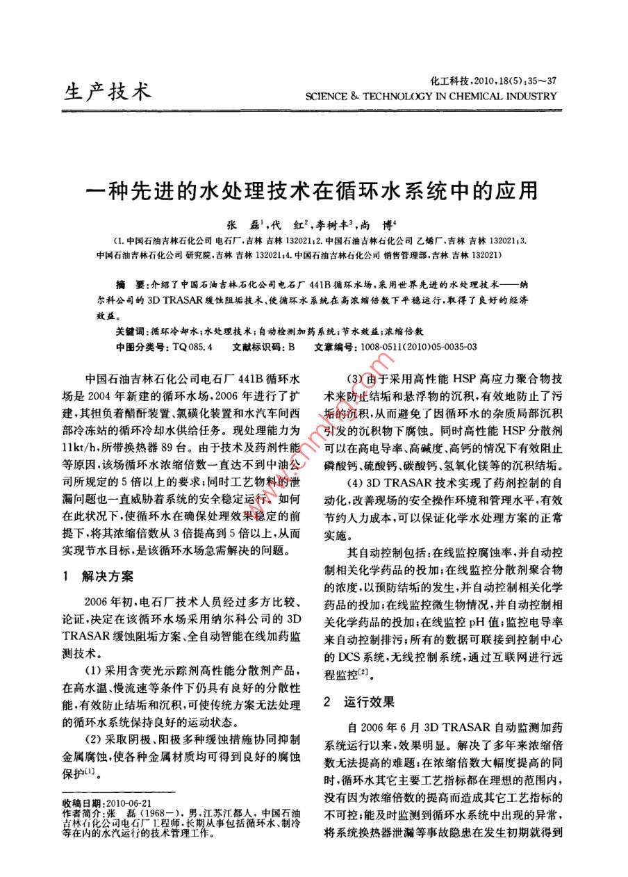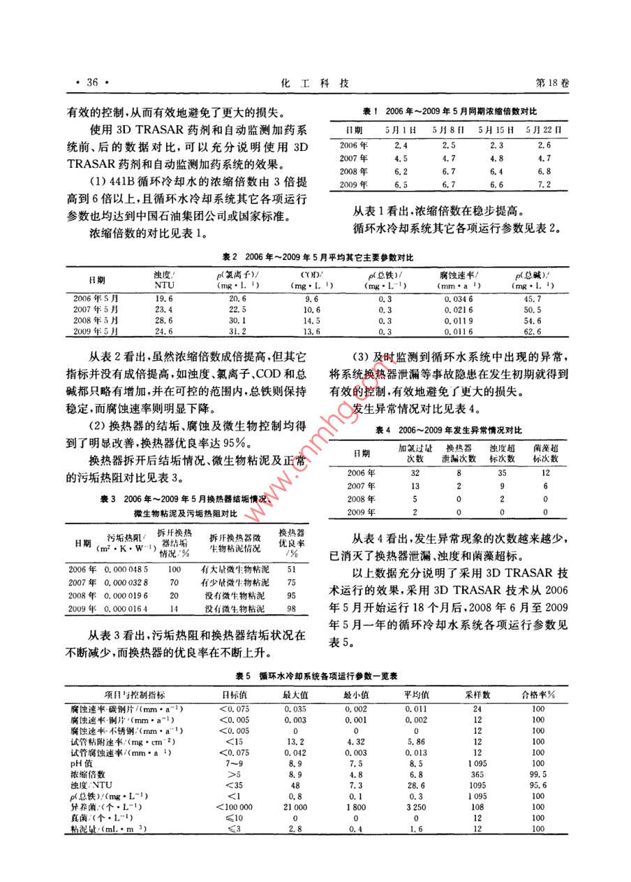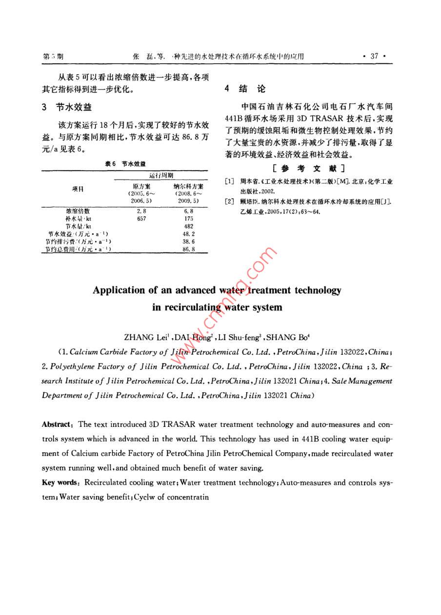 生產(chǎn)技術(shù)化工科技,2010,18(5):35~37SCIeNCe TECHNOLOGY IN CHEMICAL INDUSTRY種先進的水處理技術(shù)在循環(huán)水系統(tǒng)中的應(yīng)用張磊,代紅2,李樹豐3,尚博(1中國石油吉林石化公司電石廠吉林吉林132021;2.中國石油吉林石化公司乙烯廠吉林吉林132021;3.中國石油吉林石化公司研究院吉林吉林132021;4.中國石油吉林石化公司銷售管理部,吉林吉林132021)摘要:介紹了中國石油吉林石化公司電石廠441B循環(huán)水場,采用世界先進的水處理技術(shù)—納爾科公司的3 D TRASAR緩蝕阻垢技術(shù)、使循環(huán)水系統(tǒng)在高濃縮倍數(shù)下平穩(wěn)運行,取得了良好的經(jīng)濟效益關(guān)鍵詞:循環(huán)冷卻水;水處理技術(shù);自動檢測加藥系統(tǒng):節(jié)水效益;濃縮倍數(shù)中圖分類號:TQ085.4文獻標識碼:B文章編號:10080511(2010)05003503中國石油吉林石化公司電石廠441B循環(huán)水(3)由于采用高性能HSP高應(yīng)力聚合物技場是2004年新建的循環(huán)水場,2006年進行了擴術(shù)來防止結(jié)垢和懸浮物的沉積,有效地防止了污建,其擔負著醋酐裝置氯磺化裝置和水汽車間西垢的沉積從而避免了因循環(huán)水的雜質(zhì)局部沉積部冷凍站的循環(huán)冷卻水供給任務(wù)?,F(xiàn)處理能力為引發(fā)的沉積物下腐蝕。同時高性能HSP分散劑llkt/h,所帶換熱器89臺。由于技術(shù)及藥劑性能可以在高電導(dǎo)率、高堿度、高鈣的情況下有效阻止等原因該場循環(huán)水濃縮倍數(shù)一直達不到中油公磷酸鈣、硫酸鈣、碳酸鈣氫氧化鎂等的沉積結(jié)垢。司所規(guī)定的5倍以上的要求;同時工藝物料的泄(4)3 D TRASAR技術(shù)實現(xiàn)了藥劑控制的自漏問題也一直威脅著系統(tǒng)的安全穩(wěn)定運行。如何動化改善現(xiàn)場的安全操作環(huán)境和管理水平,有效在此狀況下,使循環(huán)水在確保處理效果穩(wěn)定的前節(jié)約人力成本,可以保證化學(xué)水處理方案的正常提下,將其濃縮倍數(shù)從3倍提高到5倍以上,從而實施實現(xiàn)節(jié)水目標,是該循環(huán)水場急需解決的問題。其自動控制包括:在線監(jiān)控腐蝕率,并自動控1解決方案制相關(guān)化學(xué)藥品的投加;在線監(jiān)控分散劑聚合物的濃度,以預(yù)防結(jié)垢的發(fā)生,并自動控制相關(guān)化學(xué)2006年初電石廠技術(shù)人員經(jīng)過多方比較、藥品的投加;在線監(jiān)控微生物情況,并自動控制相論證,決定在該循環(huán)水場采用納爾科公司的3D關(guān)化學(xué)藥品的投加;在線監(jiān)控pH值;監(jiān)控電導(dǎo)率TRASAR緩蝕阻垢方案全自動智能在線加藥監(jiān)來自動控制排污;所有的數(shù)據(jù)可聯(lián)接到控制中心測技術(shù)。的DCS系統(tǒng),無線控制系統(tǒng),通過互聯(lián)網(wǎng)進行遠(1)采用含熒光示蹤劑高性能分散劑產(chǎn)品,程監(jiān)控1在高水溫、慢流速等條件下仍具有良好的分散性能有效防止結(jié)垢和沉積,可使傳統(tǒng)方案無法處理2運行效果的循環(huán)水系統(tǒng)保持良好的運動狀態(tài)。自2006年6月3 D TRASAR自動監(jiān)測加藥(2)采取陰極陽極多種緩蝕措施協(xié)同抑制系統(tǒng)運行以來效果明顯。解決了多年來濃縮倍金屬腐蝕,使各種金屬材質(zhì)均可得到良好的概蝕數(shù)無法提高的難題;在濃縮倍數(shù)大幅度提高的同保護山。時,循環(huán)水其它主要工藝指標都在理想的范圍內(nèi),收稿日期:201006-21沒有因為濃縮倍數(shù)的提高而造成其它工藝指標的作煮簡介(1968-),男,江蘇江都人,中國石油不可控;能及時監(jiān)測到循環(huán)水系統(tǒng)中出現(xiàn)的異常,等在內(nèi)的水汽運行的技術(shù)管理工作將系統(tǒng)換熱器泄漏等事故隱患在發(fā)生初期就得到36·化工科技第18卷有效的控制,從而有效地避免了更大的損失。表12006年~2009年5月同期濃縮倍數(shù)對比使用3 D TRASAR藥劑和自動監(jiān)測加藥系日期5月1日5月8日5月15日5月22日統(tǒng)前、后的數(shù)據(jù)對比,可以充分說明使用3D200年2.42.5TRASAR藥劑和自動監(jiān)測加藥系統(tǒng)的效果。2007年4.7(1)441B循環(huán)冷卻水的濃縮倍數(shù)由3倍提209年高到6倍以上,且循環(huán)水冷卻系統(tǒng)其它各項運行參數(shù)也均達到中國石油集團公司或國家標準。從表1看出,濃縮倍數(shù)在穩(wěn)步提高濃縮倍數(shù)的對比見表1循環(huán)水冷卻系統(tǒng)其它各項運行參數(shù)見表2。表22006年~2009年5月平均其它主要參數(shù)對比日期p(氯離f)p總鐵/腐蝕速率p(總堿NTU(mg·L.1)(mg·1-1)19.60.034623.40.021650.530.0.0119從表2看出,雖然濃縮倍數(shù)成倍提高,但其它(3)及時監(jiān)測到循環(huán)水系統(tǒng)中出現(xiàn)的異常,指標并沒有成倍提高,如濁度、氯離子、COD和總將系統(tǒng)換熱器泄漏等事故隱患在發(fā)生初期就得到堿都只略有增加,并在可控的范圍內(nèi),總鐵則保持有效的控制,有效地避免了更大的損失。穩(wěn)定,而腐蝕速率則明顯下降。發(fā)生異常情況對比見表4。(2)換熱器的結(jié)垢、腐蝕及微生物控制均得表42006~2009年發(fā)生異常情況對比到了明顯改善換熱器優(yōu)良率達95%。換熱器拆開后結(jié)垢情況、微生物粘泥及正常日期加氯過器濁度超菌藻超次數(shù)泄漏次數(shù)標次數(shù)標次數(shù)的污垢熱阻對比見表32006323513表32006年~209年5月?lián)Q熱器結(jié)垢情況微生物粘泥及污垢熱阻