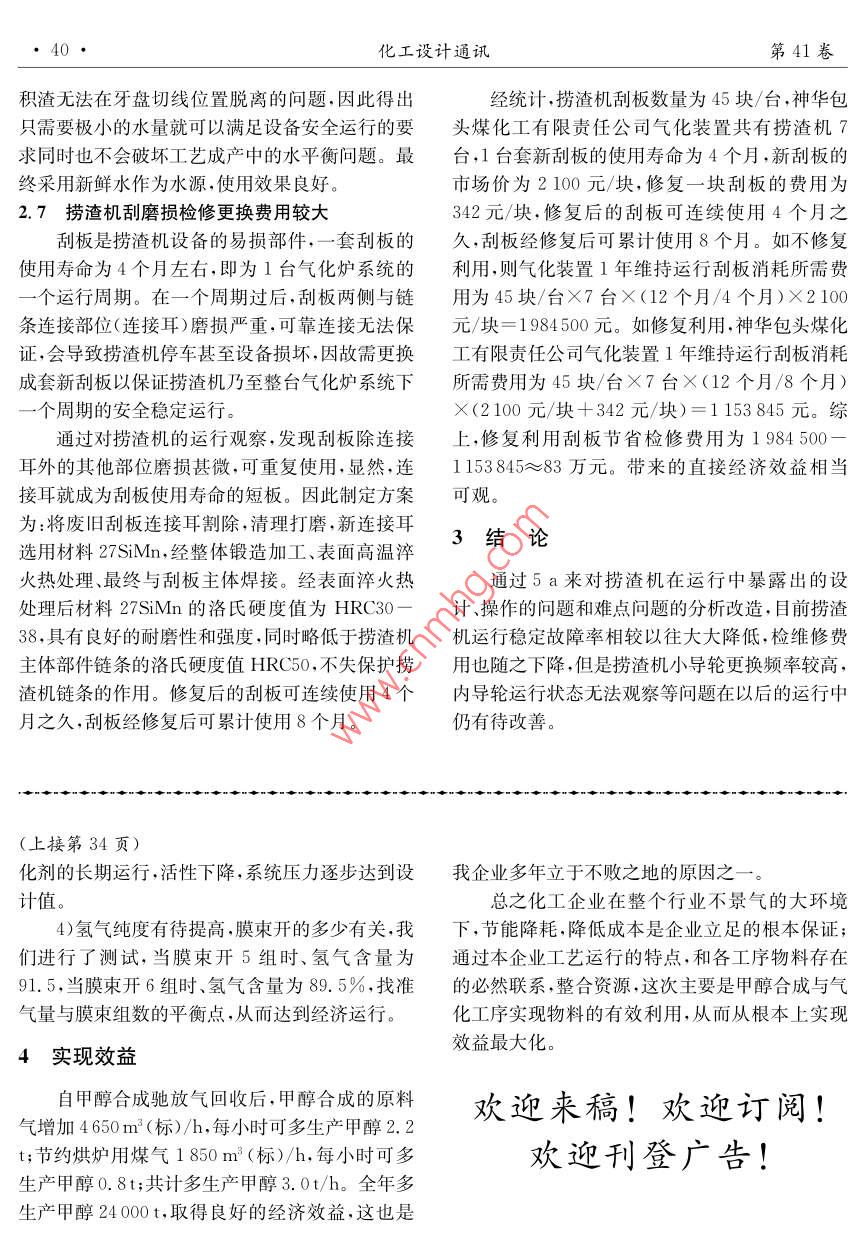 第41卷第4期化工設(shè)計(jì)通訊2015年8月Chemical engineering design CommunicationsGE水煤漿氣化撈渣機(jī)故障分析及改造賈磊(神華包頭煤化工有限責(zé)任公司,內(nèi)蒙古包頭014000摘要:針對(duì)GE水煤漿氣化工藝中撈渣機(jī)運(yùn)行過(guò)程中出現(xiàn)的問(wèn)題,進(jìn)行了詳細(xì)的分析,并采取了相應(yīng)的技術(shù)改造措施改造后設(shè)備運(yùn)行穩(wěn)定,檢修頻率下降,并對(duì)各項(xiàng)改造進(jìn)行了介紹關(guān)鍵詞:GE;氣化;撈渣機(jī);故障;改造中圖分類號(hào):TQ85文獻(xiàn)標(biāo)志碼:B文章編號(hào):1003-6490(2015)040037-04Failure analysis and improvement of ge coal slurry gasifierJIA Lel.(Shenhua Baotou Coal Chemical Co., Ltd, Baotou Inner Mongolia 014000 China)bstract: Article focused on the slag conveyer in the ge water- slurry gasification operationanalyzed the operating problem in details, according to these problem found out the technicalimprovement. The equipment reach the stable condition after the modification, drastically decreasedthe service frequency. So far the article explained every modification of the slag conveyerKey words: GE; gasification; slag conveyer; malfunction; modification水煤漿氣化裝置工藝流程為,水煤漿經(jīng)過(guò)氣表2化爐反應(yīng)生成合成氣(CO+H2)供給下游生產(chǎn)裝名稱正常最大置,煤進(jìn)入氣化爐進(jìn)行反應(yīng)的過(guò)程將有效成分燃爐渣(kg/hr70799992燒后無(wú)法燃燒的部分經(jīng)過(guò)氣化爐激冷室、鎖斗排黑水(kg/hr)總流量(kg/hr)1416120097放至撈渣機(jī)渣倉(cāng)再由刮板輸送至渣車后外送。如水含量(wt%)果撈渣機(jī)出現(xiàn)故障也將影響氣化爐的正常運(yùn)行。下面將我公司撈渣機(jī)自2010年投料試車以來(lái)出1.2設(shè)計(jì)參數(shù)現(xiàn)的故障進(jìn)行分析解決。出力:3.0~15t/h(干基)連續(xù)調(diào)節(jié);刮板速度:0.6~1.5m/min連續(xù)調(diào)節(jié);(變頻刮板輸送機(jī)的主要參數(shù)及特點(diǎn)調(diào)速);1.1設(shè)計(jì)基礎(chǔ)刮板有效尺寸(L×H):1200×200mm;1.1.1撈渣機(jī)受料數(shù)據(jù)(單臺(tái)數(shù)據(jù))電機(jī)型號(hào)與功率:YBTP132M-4,7.5kW防爆等級(jí)dⅡCT4表1設(shè)計(jì)壓力:常壓;名稱正常最大設(shè)計(jì)溫度:100℃;爐渣(kg/hr)傾斜段仰角:35黑水(kg/hr)56268總流量(kg/hr)640761047063結(jié)構(gòu)特點(diǎn)溫度(C)51-80(1)倉(cāng)體下部全鋪防破碎、防脫落40mm厚玄武巖鑄石襯,硬度HV700,使用壽命200000k1.1.2撈渣機(jī)出料數(shù)據(jù)(單臺(tái)數(shù)據(jù))此襯底不僅比金屬襯底壽命提高了4~5倍,且比收稿日期:2015-07-15化工設(shè)計(jì)通訊第41卷金屬襯底摩擦系數(shù)小.從而降低了刮板和鏈條的內(nèi)部磨損提高了刮板和鏈條的使用壽命;2.1.2故障解決方法及效果(2)鏈條張緊裝置采用尾部液壓及手動(dòng)輔助考慮氣化在運(yùn)行過(guò)程中會(huì)出現(xiàn)堵渣現(xiàn)象,經(jīng)張緊裝置,此裝置設(shè)置在撈渣機(jī)尾部,由油泵、張過(guò)處理后會(huì)出現(xiàn)較大的渣塊,固將原有撈渣機(jī)受緊油缸、蓄能器、油箱、液壓閥門組件、表盤、管路料管線與泄入口襯板距離有原有230mm改為等組成。當(dāng)鏈條磨損、拉長(zhǎng)后不需檢修人員人工500mm,在經(jīng)過(guò)一段運(yùn)行后再未岀現(xiàn)過(guò)撈渣機(jī)受張緊液壓系統(tǒng)在恒定的液壓下自動(dòng)張緊,并保證料管線堵塞的現(xiàn)象,同時(shí)發(fā)現(xiàn)泄入口襯板與受料張緊狀態(tài)的恒定;同時(shí)由于鏈條處于較緊工作狀管線在原有間距尺寸時(shí),由于間距過(guò)小造成爐渣態(tài),從而減少刮板與底板的摩擦,提高了刮板的使脫離受料管線時(shí)的發(fā)散角度小造成泄入口襯板局用壽命。張緊行程是400mm,端部有限位開(kāi)關(guān),部磨損嚴(yán)重。將間距加大后磨損面積增大但是使當(dāng)張緊行程達(dá)到400mm時(shí),滑動(dòng)軸承座上的撞用時(shí)間延長(zhǎng),同時(shí)在提高間距的同時(shí)將泄入口襯擊塊撞到限位開(kāi)關(guān)從而發(fā)出信號(hào)提醒操作人員,板由原有的30mm增大為40mm,使得泄入口襯鏈條已經(jīng)拉長(zhǎng)接近極限必須截鏈條。必須說(shuō)明:板由原有的使用時(shí)間為1800-2000h延長(zhǎng)至如頭部拖動(dòng)機(jī)構(gòu)張緊裝置必須保證在400mm張緊今3000-4000h行程內(nèi)驅(qū)動(dòng)減速機(jī)鏈輪和驅(qū)動(dòng)鏈條32A-2Xn不2.2撈渣機(jī)受料管線無(wú)法切換能處于完全張緊狀態(tài),否則,驅(qū)動(dòng)機(jī)構(gòu)或拖動(dòng)機(jī)構(gòu)2.2.Ⅰ問(wèn)題現(xiàn)象及原因?qū)p壞。扒渣機(jī)頭部設(shè)有鎖定裝置,目的是自動(dòng)撈渣杋在初期設(shè)計(jì)時(shí)將排渣管線與事故排渣張緊過(guò)程中防止液壓系統(tǒng)出現(xiàn)故障失靈而致使張管線設(shè)置為翻板閥,在需要切換排渣管線是只需緊機(jī)構(gòu)撤回太多;兩個(gè)鎖定螺杄把拖動(dòng)機(jī)構(gòu)的軸要人工轉(zhuǎn)動(dòng)翻板閥來(lái)完成排渣管線的切換,具有承頂住,從而防止拖動(dòng)機(jī)構(gòu)撤回。維護(hù)人員要在造價(jià)低搡作簡(jiǎn)單的特點(diǎn),但是在實(shí)際使用過(guò)程中周時(shí)間內(nèi)調(diào)整一次,使其與滑動(dòng)軸承座接觸。發(fā)現(xiàn),由于氣化爐灰渣中固含量很高造成轉(zhuǎn)動(dòng)部(3)扒渣機(jī)的動(dòng)力采用防爆變頻電機(jī)、減速件內(nèi)經(jīng)常