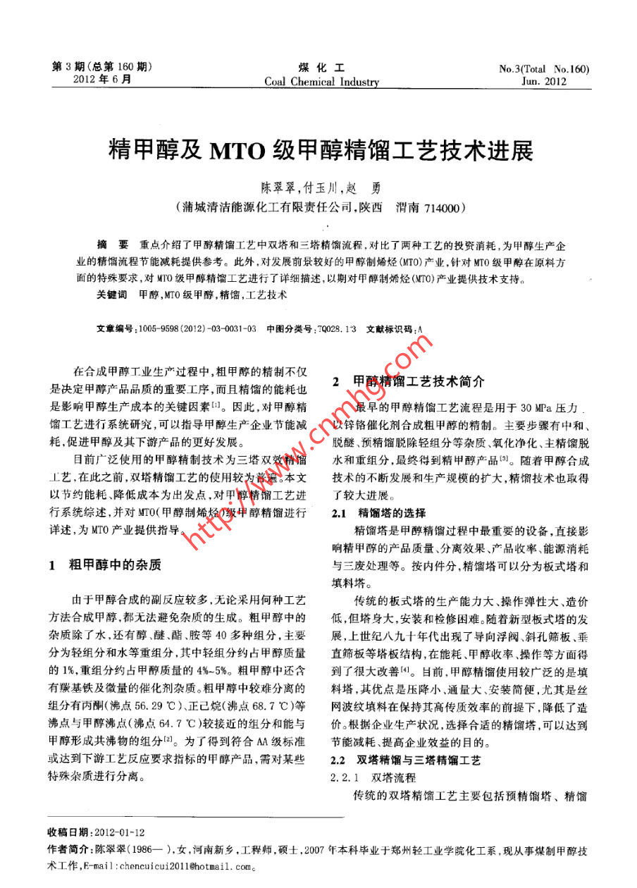 第3期(總第160 期)煤化工No.3(Total No.160)2012年6月Coal Chemical IndustryJun.2012精甲醇及MTO級甲醇精餾工藝技術(shù)進(jìn)展陳翠翠,付玉川,趙勇(蒲城清潔能源化工有限責(zé)任公司,陜西渭南714000)摘要重點(diǎn)介紹了甲醇精餾工藝中雙塔和三塔精餾流程,對比了兩種工藝的投資消耗,為甲醇生產(chǎn)企業(yè)的精餾流程節(jié)能減耗提供參考。此外,對發(fā)展前景較好的甲醇制烯烴(MTO)產(chǎn)業(yè),針對MTO級甲醇在原料方面的特殊要求,對MTO級甲醇精餾工藝進(jìn)行了詳細(xì)描述,以期對甲醇制烯烴(NTO)產(chǎn)業(yè)提供技術(shù)支持。關(guān)鍵詞甲醇,MTO級甲醇 ,精餾,工藝技術(shù)文章編號:1005- 9598 (2012) - 030031-03中圈分類號 :T9028.13文獻(xiàn)標(biāo)識碼:A在合成甲醇工業(yè)生產(chǎn)過程中,粗甲醇的精制不僅2甲醇精餾工藝 技術(shù)簡介是決定甲醇產(chǎn)品品質(zhì)的重要工序,而且精餾的能耗也是影響甲醇生產(chǎn)成本的關(guān)鍵因素“1。因此,對甲醇精最早的甲醇精餾工藝流程是用于30 MPa壓力餾工藝進(jìn)行系統(tǒng)研究,可以指導(dǎo)甲醇生產(chǎn)企業(yè)節(jié)能減以鋅鉻催化劑合成粗甲醇的精制。主要步驟有中和、耗,促進(jìn)甲醇及其下游產(chǎn)品的更好發(fā)展。脫醚、預(yù)精餾脫除輕組分等雜質(zhì)氧化凈化、主精餾脫目前廣泛使用的甲醇精制技術(shù)為三塔雙效精餾水和重組分,最終得到精甲醇產(chǎn)品0。隨著甲醇合成工藝,在此之前,雙塔精餾工藝的使用較為普遍。本文技術(shù)的不斷發(fā)展和生產(chǎn)規(guī)模的擴(kuò)大,精餾技術(shù)也取得以節(jié)約能耗、降低成本為出發(fā)點(diǎn),對甲醇精餾工藝進(jìn)行系統(tǒng)綜述,并對MTO(甲醇制烯烴)級甲醇精餾進(jìn)行2.1精餾塔的選擇詳述,為MTO產(chǎn)業(yè)提供指導(dǎo)。精餾塔是甲醇精餾過程中最重要的設(shè)備,直接影響精甲醇的產(chǎn)品質(zhì)量分離效果、產(chǎn)品收率、能源消耗1粗甲醇中的雜質(zhì)與三廢處理等。按內(nèi)件分,精餾塔可以分為板式塔和填料塔。由于甲醇合成的副反應(yīng)較多,無論采用何種工藝傳統(tǒng)的板式塔的生產(chǎn)能力大、操作彈性大、造價方法合成甲醇,都無法避免雜質(zhì)的生成。粗甲醇中的低,但塔身大,安裝和檢修困難。隨著新型板式塔的發(fā)雜質(zhì)除了水,還有醇、醚.酯.胺等40多種組分,主要展,上世紀(jì)八九十年代出現(xiàn)了導(dǎo)向浮閥、斜孔篩板、垂分為輕組分和水等重組分,其中輕組分約占甲醇質(zhì)量直篩板等塔板結(jié)構(gòu),在能耗.甲醇收率、操作等方面得的1%,重組分約占甲醇質(zhì)量的4%~5%。粗甲醇中還含到了很大改善“1。目前,甲醇精餾使用較廣泛的是填有羰基鐵及微量的催化劑雜質(zhì)。粗甲醇中較難分離的料塔,其優(yōu)點(diǎn)是壓降小.通量大、安裝簡便,尤其是絲組分有丙酮(沸點(diǎn)56. 29 C)、正已烷(沸點(diǎn)68.7 C)等.網(wǎng)波紋填料在保持其高傳質(zhì)效率的前提下,降低了造沸點(diǎn)與甲醇沸點(diǎn)(沸點(diǎn)64.7C)較接近的組分和能與價。根據(jù)企業(yè)生產(chǎn)狀況,選擇合適的精餾塔,可以達(dá)到甲醇形成共沸物的組分口。為了得到符合AA級標(biāo)準(zhǔn)節(jié)能減耗、提高企業(yè)效益的目的?;蜻_(dá)到下游工藝反應(yīng)要求指標(biāo)的甲醇產(chǎn)品,需對某些2.2雙塔精餾與三塔精餾工藝特殊雜質(zhì)進(jìn)行分離。2.2.1雙塔流程 .傳統(tǒng)的雙塔精餾工藝主要包括預(yù)精餾塔、精餾收稿日期:2012 -01-12 .作者簡介:陳翠翠(1986- ),女 ,河南新鄉(xiāng),工程師,碩士,2007年本科畢業(yè)于鄭州輕工業(yè)學(xué)院化工系,現(xiàn)從事煤制甲醇技術(shù)工作,E- -mail : chencuicui201 1@hotmail. com。2012年6月陳翠翠等:精甲醇及MTO級甲醇精餾工藝技術(shù)進(jìn)展。33-泵送人塔內(nèi);不凝氣則送出界區(qū)。一級蒸發(fā)器由低壓蒸汽提供熱量,產(chǎn)生的甲醇蒸汽先進(jìn)入二級蒸發(fā)器。3結(jié)論通過3個蒸發(fā)器的甲醇蒸汽被冷卻至40C,送入MTO工段作原料。通過對雙塔精餾與三塔雙效工藝對比可知,三塔精餾流程中的常壓塔塔釜再沸器加熱所需熱量由加輕組分.壓塔塔頂蒸汽提供,不需要外界供熱,從而降低了熱穩(wěn)定塔回流罐凸能消耗,規(guī)模相同時所需冷卻水量和蒸汽量遠(yuǎn)遠(yuǎn)小于雙塔流程,因此,在普通的甲醇精餾流程中,三塔雙效廢液工藝將是未來發(fā)展的趨勢。此外,對于甲醇制烯烴(MTO)反應(yīng),由于反應(yīng)催化低壓蒸汽|可劑對甲醇中的金屬尤其是堿金屬的含量要求較高,需采用多效蒸發(fā)器,有效濃縮金屬雜質(zhì),并通過排污脫冷凝海除,以此確保甲醇中金屬質(zhì)量分?jǐn)?shù)降至0.1X 10*以下,才能夠使甲醇高效轉(zhuǎn)化。-心1IT0級甲醇。團(tuán)3MTO級甲醇精餾工藝流程示意圖參考文獻(xiàn):.4 甲醇精餾工藝研究新進(jìn)展[1]張 蔚.甲醉精餾技術(shù)淺析[J]. 山西化工,2009,29(1):52-54.目前,對甲醇精餾的研究主要集中在對各操作參[2]查旭峰,段文杰萃取精餾在甲醇精餾中的應(yīng)用[J].數(shù)的優(yōu)化與控制上,如中國石油大學(xué)宋昭崢等叫應(yīng)用化學(xué)工程.2009 , 37(10): 69-72.ASPEN PILUS對甲醇精餾進(jìn)行模擬,分別討論了操作回.[3]吳聲旺.甲醇雙塔精餾與三塔雙效精餾工藝應(yīng)用比較流比、進(jìn)料位置、塔頂餾出量