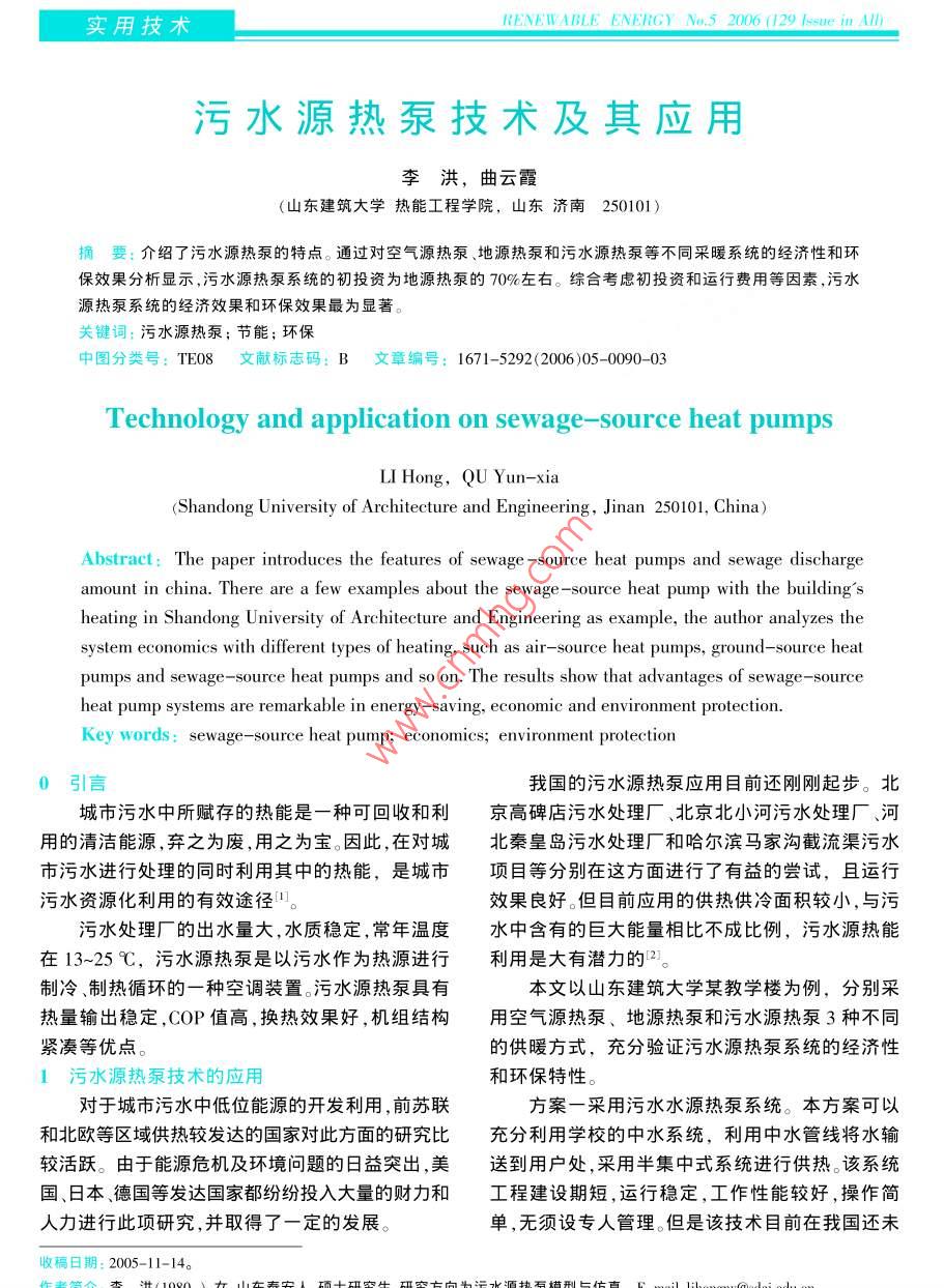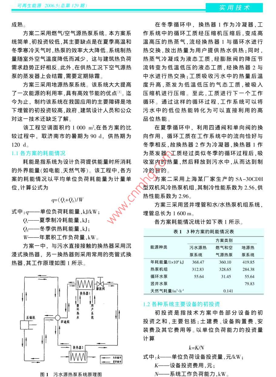 實用技術(shù)RENEWABLE ENENG) No 5 2006(129 Issue in A/p污水源熱泵技術(shù)及其應(yīng)用李洪,曲云霞(山東建筑大學(xué)熱能工程學(xué)院,山東濟南250101)摘要:介紹了污水源熱泵的特點。通過對空氣源熱泵、地源熱泵和污水源熱泵等不同采暖系統(tǒng)的經(jīng)濟性和環(huán)保效果分析顯示,污水源熱泵系統(tǒng)的初投資為地源熱泵的70%左右。綜合考慮初投資和運行費用等因素,污水源熱泵系統(tǒng)的經(jīng)濟效果和環(huán)保效果最為顯著。關(guān)鍵詞:污水源熱泵;節(jié)能;環(huán)保中圖分類號:TEO8文獻標(biāo)志碼:B文章編號:1671-5292(2006)05-0090-03Technology and application on sewage-source heat pumpsLI Hong, QU Yun-xiaShandong University of Architecture and Engineering, Jinan 250101, China)Abstract: The paper introduces the features of sewage-source heat pumps and sewage dischargeamount in china. There are a few examples about the sewage-source heat pump with the buildingsheating in Shandong University of Architecture and Engineering as example, the author analyzes thesystem economics with different types of heating, such as air-source heat pumps, ground-source heatpumps and sewage-source heat pumps and so on. The results show that advantages of sewage-sourceheat pump systems are remarkable in energy-saving, economic and environment protectionKey words: sewage-source heat pump; economics; environment protection0引言我國的污水源熱泵應(yīng)用目前還剛剛起步。北城市污水中所賦存的熱能是一種可回收和利京高碑店污水處理廠、北京北小河污水處理廠、河用的清潔能源,棄之為廢,用之為寶。因此,在對城北秦皇島污水處理廠和哈爾濱馬家溝截流渠污水市污水進行處理的同時利用其中的熱能,是城市項目等分別在這方面進行了有益的嘗試,且運行污水資源化利用的有效途徑。效果良好。但目前應(yīng)用的供熱供冷面積較小,與污污水處理廠的岀水量大,水質(zhì)穩(wěn)定,常年溫度水中含有的巨大能量相比不成比例,污水源熱能在13-25℃,污水源熱泵是以污水作為熱源進行利用是大有潛力的2。制冷、制熱循環(huán)的一種空調(diào)裝置。污水源熱泵具有本文以山東建筑大學(xué)某教學(xué)樓為例,分別采熱量輸岀穩(wěn)定,COP值高,換熱效果好,杋組結(jié)構(gòu)用空氣源熱泵、地源熱泵和污水源熱泵3種不同緊湊等優(yōu)點。的供暖方式,充分驗證污水源熱泵系統(tǒng)的經(jīng)濟性1污水源熱泵技術(shù)的應(yīng)用和環(huán)保特性。對于城市污水中低位能源的開發(fā)利用,前蘇聯(lián)方案一采用污水水源熱泵系統(tǒng)。本方案可以和北歐等區(qū)域供熱較發(fā)達的國家對此方面的研究比充分利用學(xué)校的中水系統(tǒng),利用中水管線將水輸較活躍。由于能源危機及環(huán)境問題的日益突岀,美送到用戶處,采用半集中式系統(tǒng)進行供熱該系統(tǒng)國、日本、德國等發(fā)達國家都紛紛投入大量的財力和工程建設(shè)期短,運行穩(wěn)定,工作性能較好,操作簡人力進行此項研究,并取得了一定的發(fā)展。單,無須設(shè)專人管理。但是該技術(shù)目前在我國還未收稿日期:2005-11-14??稍偕茉?006.5(總第129期)實用技術(shù)成熟。在冬季循環(huán)中,換熱器1作為冷凝器,工方案二采用燃氣/空氣源熱泵系統(tǒng)。本方案系作系統(tǒng)中的循環(huán)工質(zhì)經(jīng)壓縮機壓縮后,變成高統(tǒng)簡單,初投資較低,其主要缺點是在夏季高溫和溫高壓的熱蒸氣,流經(jīng)換熱器1與循環(huán)水進行冬季寒冷天氣時,熱泵的效率大大降低。系統(tǒng)制熱熱交換,放出熱量為用戶提供熱水供熱;同時量隨室外空氣溫度降低而減少,這與建筑熱負荷熱蒸氣冷凝成為液態(tài)工質(zhì),經(jīng)膨脹閥的降壓節(jié)需求趨勢正好相反。此外,在供熱工況下空氣源熱流轉(zhuǎn)變?yōu)榈蜏氐蛪旱囊簯B(tài)工質(zhì),經(jīng)換熱器2與泵的蒸發(fā)器上會結(jié)霜,需要定期除霜中水進行熱交換;工質(zhì)吸收污水中的熱量后溫方案三采用地源熱泵系統(tǒng)。該系統(tǒng)大大提高度升高,蒸發(fā)為低溫低壓的氣態(tài)工質(zhì),被吸入了一次能源的利用率,具有高效節(jié)能的優(yōu)點③。迄壓縮機進行壓縮。至此,工質(zhì)進行下一個工作今為止,制約該系統(tǒng)在我國應(yīng)用的主要障礙是地循環(huán)。通過這樣的循環(huán)過程,工作系統(tǒng)可以將下埋管的初投資較高,政府、建筑設(shè)計人員和公眾污水中的低位熱能轉(zhuǎn)化為可以直接利用的高對這一技術(shù)還缺乏了解。品位熱能。該工程空調(diào)面積約1000m2,在各方案的比在夏季循環(huán)中,利用四通閥和單向閥的換較過程中,取濟南市的暑期為φod,供熱期為向作用,循環(huán)工質(zhì)在工作系統(tǒng)中的流向恰好與120d冬季相反,故換熱器2作為冷凝器,換熱器1作1.1各方案的耗能情況為蒸發(fā)器。工質(zhì)經(jīng)過類似冬季的循環(huán)過程后,吸耗能是指系統(tǒng)為設(shè)計負荷提供能量時所消耗收室內(nèi)的熱量,然后釋放到污水中,從而達到制的外界能量(如電能、天然氣等)。該工程中,各方冷的目的。案的耗能情況以平均單位負荷耗能量為計量單方案二采用上海某廠家生產(chǎn)的SA-30CDH位,計算公式為型雙機風(fēng)冷熱泵機組,其制冷性能系數(shù)為2.56,供熱性能系數(shù)為2.96。q(Q+Qa)/W方案三采用豎井埋管和水/水熱泵機組系統(tǒng),式中:q—單位負荷耗能量,kJ丿