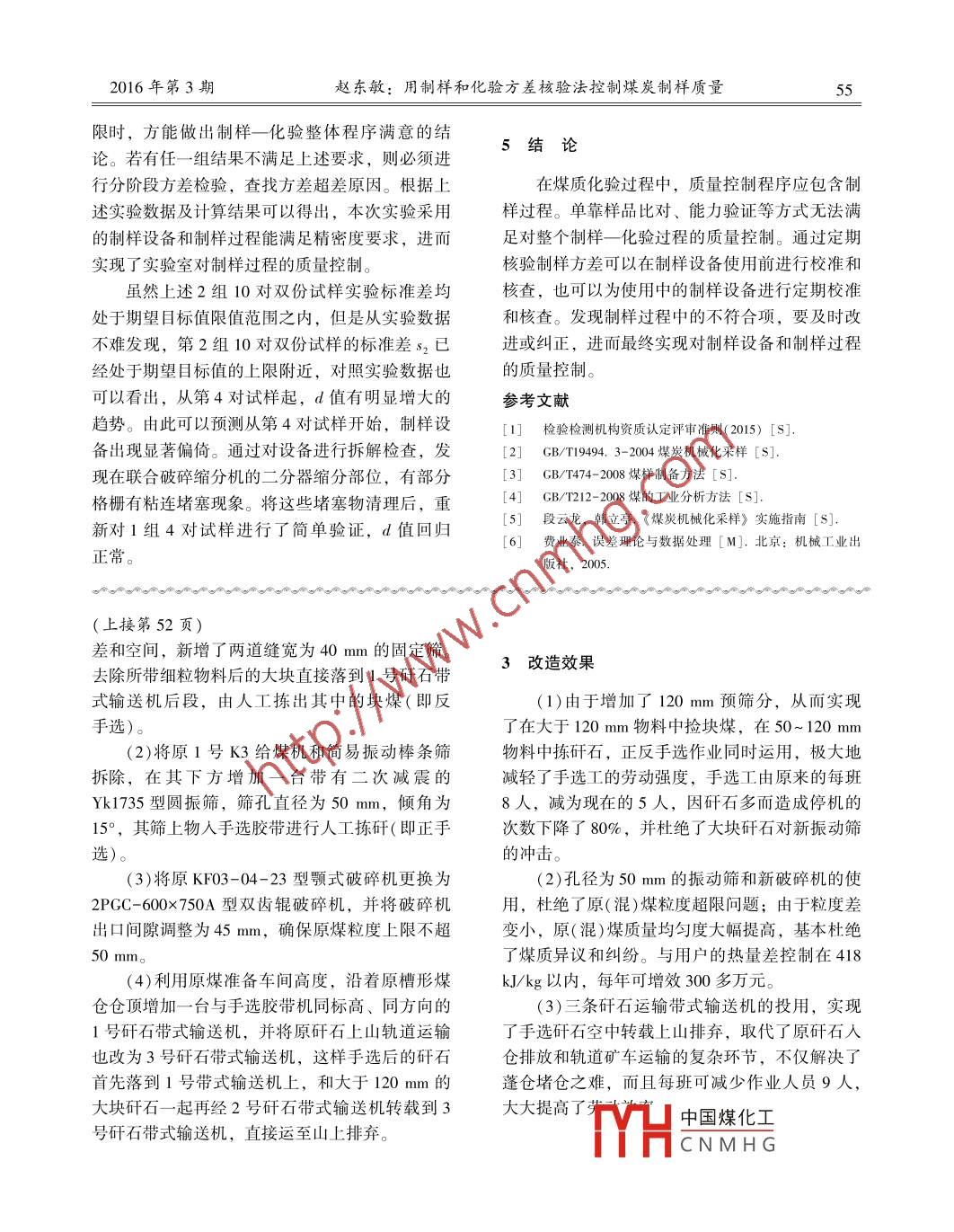 煤炭加工與綜合利用52COAL PROCESSING & COMPREHENSIVE UTILIZATIONNo.3, 2016鶴煤八礦選煤廠原煤準(zhǔn)備系統(tǒng)的改造陳祥君(河南能源鶴煤公司八礦選煤廠,河南鶴璧458030)摘要:鶴煤公司八礦選煤廠通過(guò)對(duì)原煤準(zhǔn)備系統(tǒng)篩分、破碎、運(yùn)輸?shù)裙に嚟h(huán)節(jié)的改造,實(shí)現(xiàn)了正反手選,減輕了手選勞動(dòng)強(qiáng)度,保證了原(混)煤粒度,提高了矸石運(yùn)輸排棄環(huán)節(jié)的工作效率。關(guān)鍵詞:選煤廠;原煤準(zhǔn)備系統(tǒng);技術(shù)改造;效果中圖分類(lèi)號(hào): TD941文獻(xiàn)標(biāo)識(shí)碼: A文章編號(hào): 1005-8397(2016)03-0052-02河南能源鶴煤公司八礦選煤廠年處理原煤不均,離析現(xiàn)象嚴(yán)重,采樣代表性受粒度和人為0.82 Mt。礦井毛煤經(jīng)篩分、手選、破碎等準(zhǔn)備主觀因素影響較大,出廠煤發(fā)熱量值與用戶化驗(yàn)工藝環(huán)節(jié)處理后成為原煤,其中- -部分人洗,另結(jié)果平均相差836 kJ/kg以上,最大相差2 090一部分與洗后中煤、煤泥摻配后作為電煤銷(xiāo)售。kJ/kg,不但易發(fā)生煤質(zhì)糾紛,而且造成了較大的隱性經(jīng)濟(jì)損失。另外,由于粒度超限嚴(yán)重,經(jīng)1存在問(wèn)題??ǘ绿瓩C(jī)排矸輪和排料道,影響正常的洗選近幾年,隨著采煤工作面的不斷延伸、地質(zhì)作業(yè)和精煤等產(chǎn)品質(zhì)量。條件的變化以及綜采放頂煤工藝的推廣,八礦毛1.3矸石運(yùn)輸環(huán)節(jié) 多,效率低煤含矸量明顯增加,加之原煤準(zhǔn)備系統(tǒng)工藝不完.原手選矸石進(jìn)人矸石倉(cāng)后經(jīng)人工放至礦車(chē)善、設(shè)備簡(jiǎn)陋等因素影響,原煤含研量和灰分逐內(nèi),再經(jīng)人工和小絞車(chē)推拉至中轉(zhuǎn)點(diǎn)后,由電瓶年增高,難以滿足用戶要求和自身發(fā)展需要。車(chē)?yán)巾肥较?,最后由絞車(chē)?yán)缴缴戏?chē)排1.1 矸石量多塊大,嚴(yán)重影響手選作業(yè)棄。該環(huán)節(jié)存在的問(wèn)題: -是由于矸石塊大,極自綜采放頂采煤工藝推廣以來(lái),特別是當(dāng)遇易蓬倉(cāng)堵倉(cāng),放倉(cāng)作業(yè)勞動(dòng)強(qiáng)度大,工作危險(xiǎn);到煤層變薄、斷層、頂板破碎等地質(zhì)條件變化二是由于運(yùn)輸環(huán)節(jié)復(fù)雜,每班至少需要12 人,時(shí),毛煤中大于100 mm部分占20%以上,且其勞動(dòng)效率低。中90%為矸石,1.0 m寬的手選膠帶和十幾名手2改造途徑選工無(wú)法滿足生產(chǎn)要求,只好頻繁開(kāi)停系統(tǒng)進(jìn)行揀矸,不僅勞動(dòng)強(qiáng)度大,而且每班開(kāi)停機(jī)平均在選煤廠根據(jù)現(xiàn)場(chǎng)實(shí)際,因地制宜,采取了以40次以上,嚴(yán)重影響了礦井正常生產(chǎn)。下解決辦法:1.2粒度超限, 嚴(yán)重影響煤質(zhì)和洗選(1)將毛煤轉(zhuǎn)載帶式輸送機(jī)機(jī)頭延長(zhǎng)抬高,原準(zhǔn)備篩分采用的是自制的長(zhǎng)2.2 m、寬在機(jī)頭”下方增加一臺(tái)自制的條縫寬度為120mm,1.7m、篩縫50mm的簡(jiǎn)易振動(dòng)棒條篩。由于篩一- 端有轉(zhuǎn)軸、另- - -端帶有橡膠彈簧的棒條篩,邊縫長(zhǎng),經(jīng)常有大塊扁平矸石進(jìn)人原煤中,粒度超行預(yù)篩分。為解決大于120 mm大塊物料中夾帶限嚴(yán)重,其中大于50 mm級(jí)占20%以上,大于的細(xì)粒物料,將原2號(hào)K3給料機(jī)拆除,利用高100 mm級(jí)超過(guò)5%。原煤經(jīng)摻配裝車(chē)后粒度分布(下轉(zhuǎn)第55頁(yè))收稿日期: 2015-08-27 DOI: 10. 16200/j. enki. 11-2627/td. 2016.03. 017中國(guó)煤化工、\礦選煤廠高級(jí)作者簡(jiǎn)介:陳祥君(1967- -), 男,吉林磐石人,1989 年畢業(yè)于黑龍江礦業(yè)學(xué)院選礦專(zhuān)業(yè),MYHCNMHG工程師。引用格式:陳祥君.鶴煤八\礦選煤廠原煤準(zhǔn)備系統(tǒng)的改造[J]. 煤炭加工與綜合利用,2016(3): 52, 55.2016年第3期趙東敏:用制樣和化驗(yàn)方差核驗(yàn)法控制煤炭制樣質(zhì)量65限時(shí),方能做出制樣一化驗(yàn)整體程序滿意的結(jié)5結(jié)論論。若有任- -組結(jié)果不滿足上述要求,則必須進(jìn)行分階段方差檢驗(yàn),查找方差超差原因。根據(jù)上在煤質(zhì)化驗(yàn)過(guò)程中,質(zhì)量控制程序應(yīng)包含制述實(shí)驗(yàn)數(shù)據(jù)及計(jì)算結(jié)果可以得出,本次實(shí)驗(yàn)采用樣過(guò)程。單靠樣品比對(duì)、能力驗(yàn)證等方式無(wú)法滿的制樣設(shè)備和制樣過(guò)程能滿足精密度要求,進(jìn)而足對(duì)整個(gè)制樣一化驗(yàn)過(guò)程的質(zhì)量控制。 通過(guò)定期實(shí)現(xiàn)了實(shí)驗(yàn)室對(duì)制樣過(guò)程的質(zhì)量控制。核驗(yàn)制樣方差可以在制樣設(shè)備使用前進(jìn)行校準(zhǔn)和雖然上述2組10對(duì)雙份試樣實(shí)驗(yàn)標(biāo)準(zhǔn)差均核查,也可以為使用中的制樣設(shè)備進(jìn)行定期校準(zhǔn)處于期望目標(biāo)值限值范圍之內(nèi),但是從實(shí)驗(yàn)數(shù)據(jù)和核查。發(fā)現(xiàn)制樣過(guò)程中的不符合項(xiàng),要及時(shí)改不難發(fā)現(xiàn),第2組10對(duì)雙份試樣的標(biāo)準(zhǔn)差s2已進(jìn)或糾正,進(jìn)而最終實(shí)現(xiàn)對(duì)制樣設(shè)備和制樣過(guò)程經(jīng)處于期望目標(biāo)值的上限附近,對(duì)照實(shí)驗(yàn)數(shù)據(jù)也的質(zhì)量控制??梢钥闯?,從第4對(duì)試樣起,d值有明顯增大的參考文獻(xiàn)趨勢(