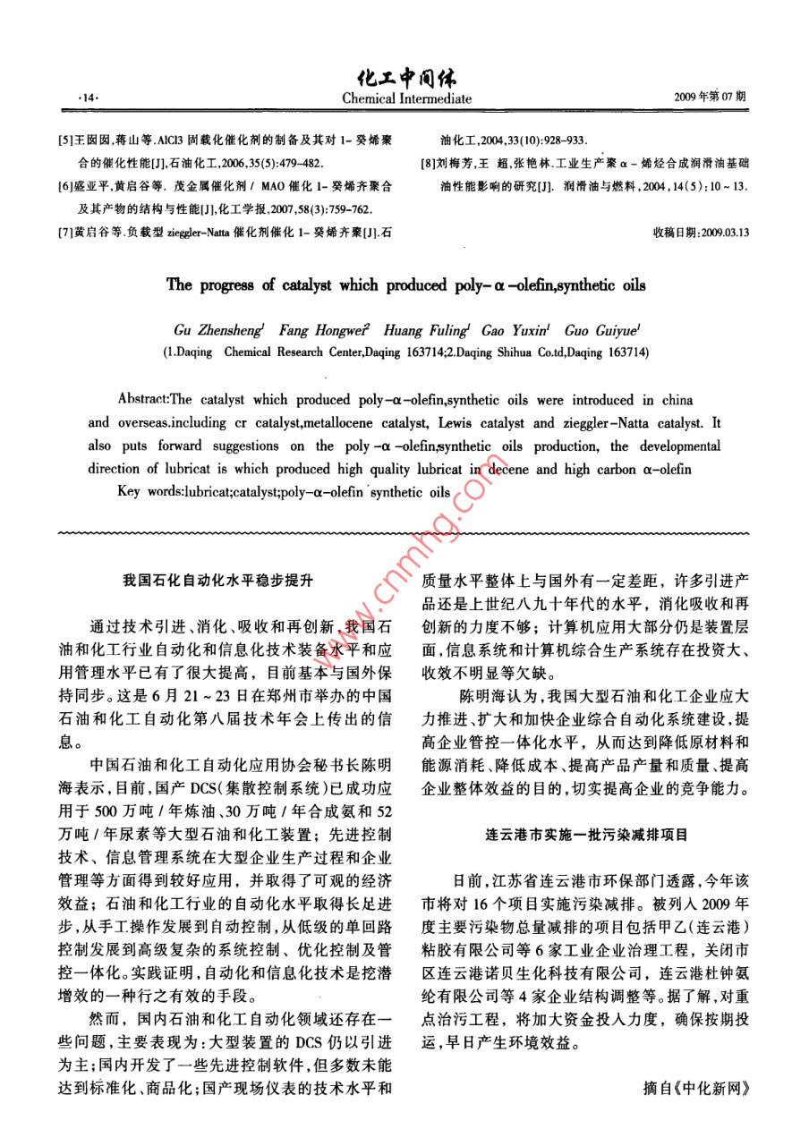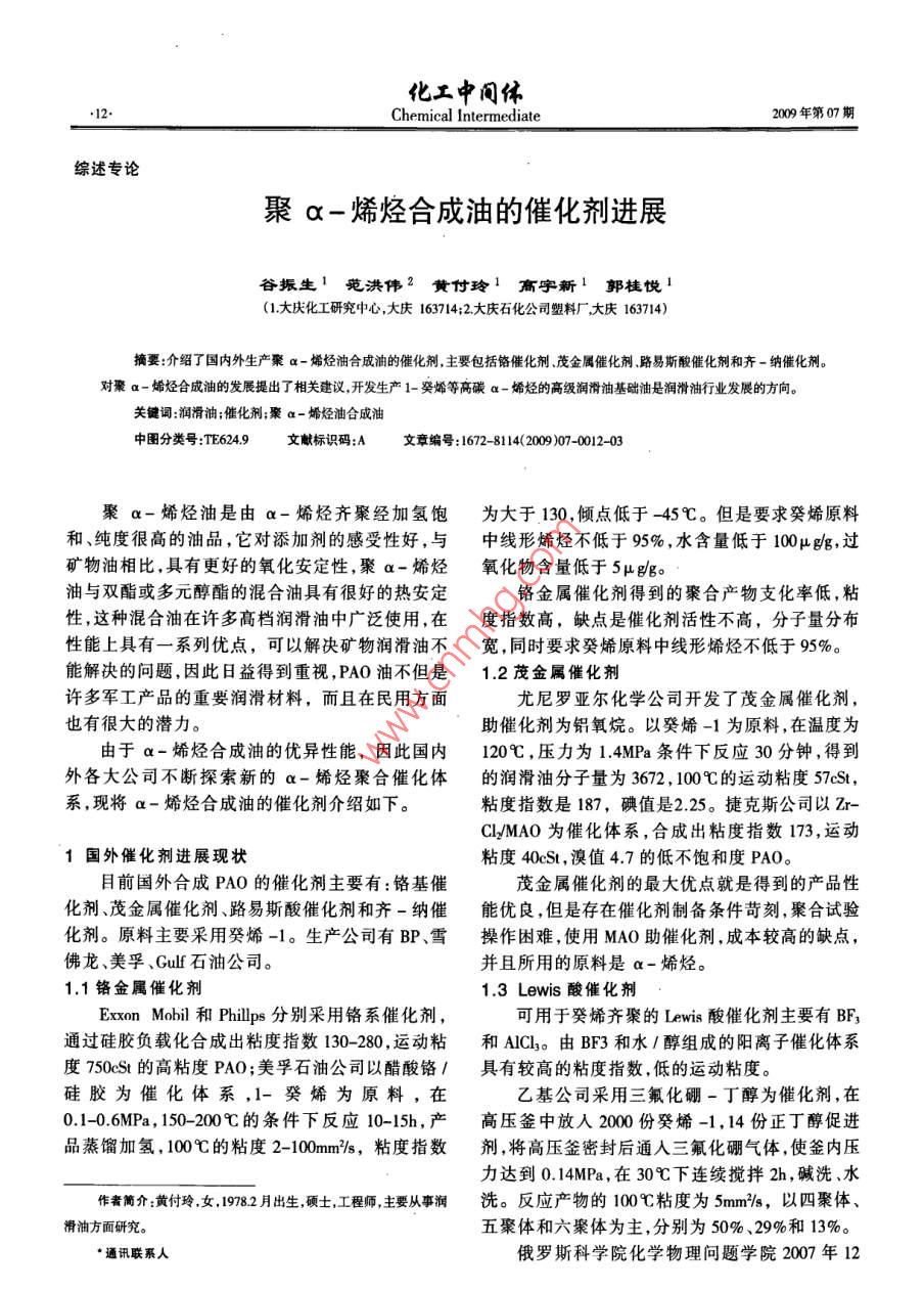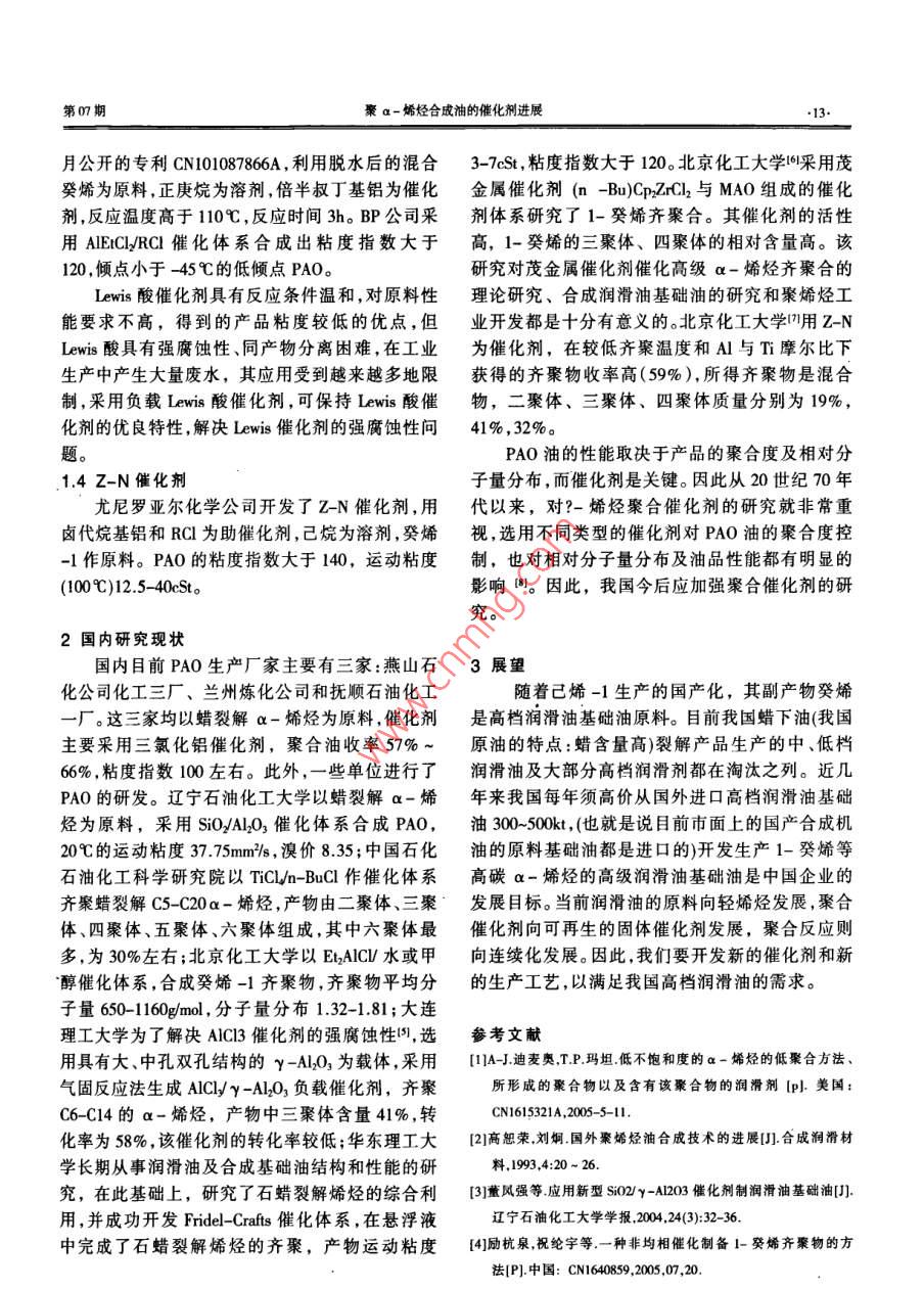 化工中間體.12.Chemical Intermediate2009年第07期綜述專論聚a-烯烴合成油的催化劑進(jìn)展谷振生1范洪偉2黃付玲1高宇新1郭桂悅(1.大慶化工研究中心,大慶163714;2.大慶石化公 司塑料廠,大慶163714)摘要:介紹了國(guó)內(nèi)外生產(chǎn)聚a-烯烴油合成油的催化劑,主要包括鉻催化劑茂金屬催化劑.路易斯酸催化劑和齊-納催化劑。對(duì)聚a-烯烴合成油的發(fā)展提出了相關(guān)建議,開(kāi)發(fā)生產(chǎn)1-突烯等高碳a-烯烴的高級(jí)潤(rùn)滑油基礎(chǔ)油是潤(rùn)滑油行業(yè)發(fā)展的方向。關(guān)鍵詞:潤(rùn)滑油;催化劑;聚a-烯烴油合成油中團(tuán)分類號(hào):TE624.9文獻(xiàn)標(biāo)識(shí)碼:A文章編號(hào):1672- 8114(2009)070012-03聚x-烯烴油是由a-烯烴齊聚經(jīng)加氫飽為大于130, 傾點(diǎn)低于-45C。但是要求癸烯原料和、純度很高的油品,它對(duì)添加劑的感受性好,與中線形烯烴不低于95%,水含量低于100ug,過(guò)礦物油相比,具有更好的氧化安定性,聚a-烯烴氧化物含量低于5μggo .油與雙酯或多元醇酯的混合油具有很好的熱安定鉻金屬催化劑得到的聚合產(chǎn)物支化率低,粘性,這種混合油在許多高檔潤(rùn)滑油中廣泛使用,在度指數(shù)高,缺點(diǎn)是催化劑活性不高,分子量分布性能上具有- -系列優(yōu)點(diǎn),可以解決礦物潤(rùn)滑油不寬,同時(shí)要求癸烯原料中線形烯烴不低于95%。能解決的問(wèn)題,因此日益得到重視,PAO油不但是1.2茂金屬催化劑許多軍工產(chǎn)品的重要潤(rùn)滑材料,而且在民用方面.尤尼羅亞爾化學(xué)公司開(kāi)發(fā)了茂金屬催化劑,也有很大的潛力。助催化劑為鋁氧烷。以癸烯-1為原料,在溫度為由于a-烯烴合成油的優(yōu)異性能,因此國(guó)內(nèi)120心,壓力為1.4MPa條件下反應(yīng)30分鐘,得到外各大公司不斷探索新的a-烯烴聚合催化體的潤(rùn)滑油分子量為3672,100C的運(yùn)動(dòng)粘度57cSt,系,現(xiàn)將a-烯烴合成油的催化劑介紹如下。粘度指數(shù)是187,碘值是2.25。捷克斯公司以Zr-CI/MAO為催化體系,合成出粘度指數(shù)173,運(yùn)動(dòng)1國(guó)外催化劑進(jìn)展現(xiàn)狀粘度40cSt,溴值4.7的低不飽和度PAO。目前國(guó)外合成PAO的催化劑主要有:鉻基催茂金屬催化劑的最大優(yōu)點(diǎn)就是得到的產(chǎn)品性化劑、茂金屬催化劑、路易斯酸催化劑和齊-納催能優(yōu)良,但是存在催化劑制備條件苛刻,聚合試驗(yàn)化劑。原料主要采用癸烯-1。生產(chǎn)公司有BP、雪操作困難,使用MAO助催化劑,成本較高的缺點(diǎn),佛龍、美孚、Gulf石油公司。并且所用的原料是a-烯烴。1.1鉻金屬催化劑1.3Lewis酸催化劑ExxonMobil和Phillps分別采用鉻系催化劑,可用于癸烯齊聚的Lewis酸催化劑主要有BF,通過(guò)硅膠負(fù)載化合成出粘度指數(shù)130--280,運(yùn)動(dòng)粘和AlCl。由BF3和水1醇組成的陽(yáng)離子催化體系度750cSt的高粘度PAO;美孚石油公司以醋酸鉻1具有較高的粘度指數(shù),低的運(yùn)動(dòng)粘度。硅膠為催化體系,1-癸烯為原料,在乙基公司采用三氟化硼-丁醇為催化劑,在0.1-0.6MPa, 150- -200C的條件下反應(yīng)10-15h,產(chǎn)高壓釜中放入2000份癸烯-1,14份正丁醇促進(jìn)品蒸餾加氫,100的粘度2-100mm2/s,粘度指數(shù)劑,將高壓釜密封后通入三氟化硼氣體,使釜內(nèi)壓力達(dá)到0.14MPa,在30C下連續(xù)攪拌2h,堿洗、水作者簡(jiǎn)介:黃付玲,女, 1978.2月出生,碩士,工程師,主要從事潤(rùn)洗。反應(yīng)產(chǎn)物的100C粘度為5mm/s, 以四聚體、滑油方面研究。五聚體和六聚體為主,分別為50%、29%和13%。*通訊聯(lián)系人俄羅斯科學(xué)院化學(xué)物理問(wèn)題學(xué)院2007年12第07期聚a-烯烴合成油的催化劑進(jìn)展.13.月公開(kāi)的專利CN101087866A,利用脫水后的混合3- 7cSt ,粘度指數(shù)大于120。北京化工大學(xué)(6)采用茂癸烯為原料,正庚烷為溶劑,倍半叔丁基鋁為催化金屬催化劑(n -Bu)CpzZrCl2 與MAO組成的催化劑,反應(yīng)溫度高于110C,反應(yīng)時(shí)間3h。BP公司采劑體系研究了1-癸烯齊聚合。其催化劑的活性.用AE:CIl/RCl 催化體系合成出粘度指數(shù)大于高,1-癸烯的三聚體、四聚體的相對(duì)含量高。該120,傾點(diǎn)小于-45C的低傾點(diǎn)PAO。研究對(duì)茂金屬催化劑催化高級(jí)a-烯烴齊聚合的Lewis酸催化劑具有反應(yīng)條件溫和,對(duì)原料性理論研究、合成潤(rùn)滑油基礎(chǔ)油的研究和聚烯烴工能要求不高,得到的產(chǎn)品粘度較低的優(yōu)點(diǎn),但業(yè)開(kāi)發(fā)都是十分有意義的。北京化工大學(xué)(")用Z-NLewis酸具有強(qiáng)腐蝕性、同產(chǎn)物分離困難,在工業(yè)為催化劑,在較低齊聚溫度和Al與Ti摩爾比下生產(chǎn)中產(chǎn)生大量廢水,其應(yīng)用受到越來(lái)越多地限獲得的齊聚物收率高(59%),所得齊聚物是混合制,采用負(fù)載Lewis酸催化劑,可保持Lewis 酸催物,二聚體、三聚體、四聚體質(zhì)量分別為19%,化劑的優(yōu)良特性,解決Lewis催化劑的強(qiáng)腐蝕性問(wèn)41% ,32%。題。PAO油的性能取決于產(chǎn)品的聚合度及相對(duì)分.1.4 Z-N催化劑子量分布,而催化劑是關(guān)鍵。因此從20世紀(jì)70年尤尼羅亞爾化學(xué)公司開(kāi)發(fā)了Z-N催化劑,用代以來(lái),對(duì)?-烯烴聚合催化劑的研究就非常重鹵代烷基鋁和RCI為助催化劑,己烷為溶劑,癸烯視,選用不同類型的催化劑對(duì)PAO油的聚合度控-1作原料。PAO的粘度指數(