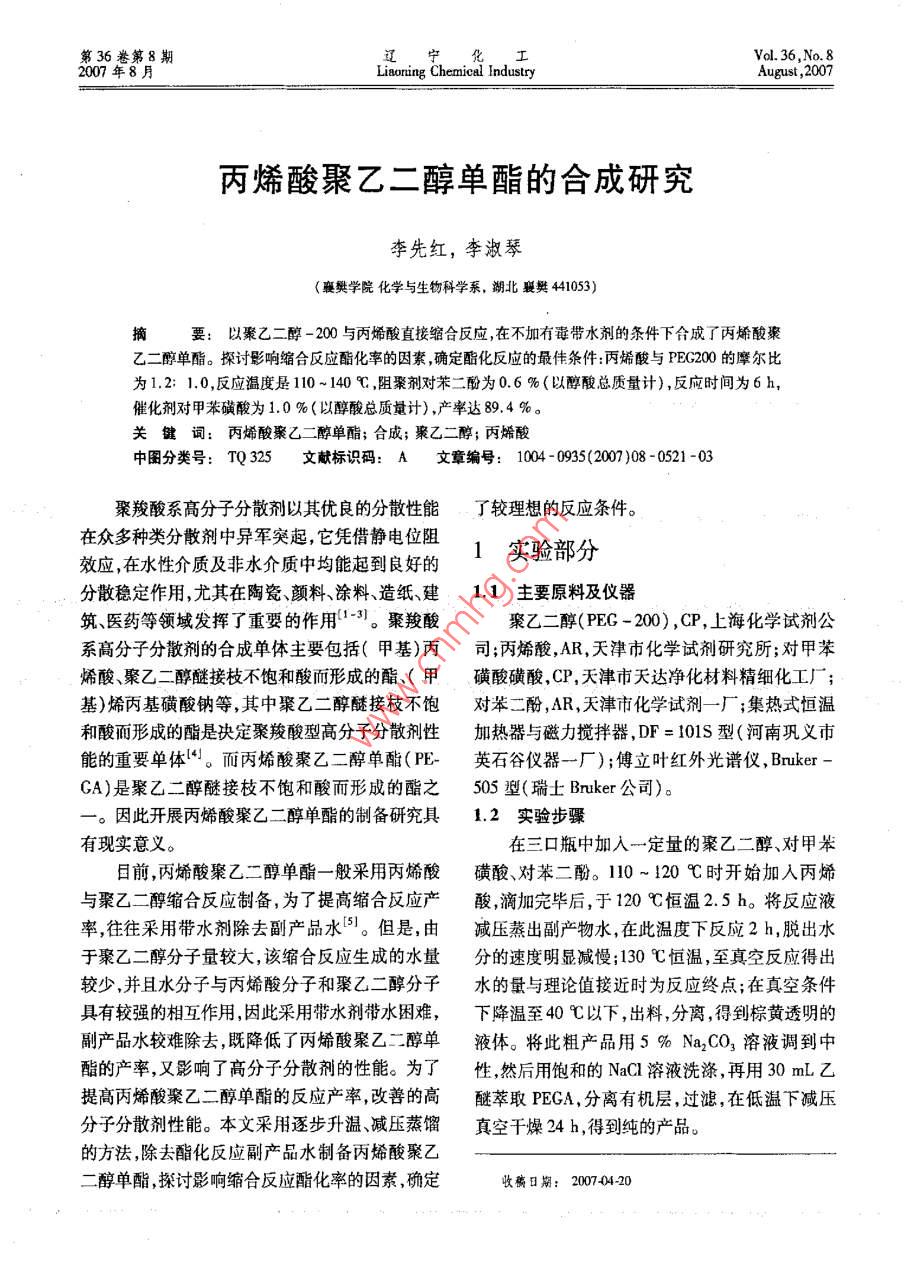 第36卷第8期遼寧化Vol 36, No 82007年8月Liaoning Chemical IndustryAugust, 2007丙烯酸聚乙二醇單酯的合成研究李先紅,李淑琴(襄樊學(xué)院化學(xué)與生物科學(xué)系,湖北襄樊441053)要:以聚乙二醇-200與丙烯酸直接縮合反應(yīng),在不加有囊?guī)畡┑臈l件下合成了丙烯酸聚乙二醇單酯。探討影響縮合反應(yīng)酯化率的因素,確定酯化反應(yīng)的最偉條件:丙烯酸與PEC200的摩爾比為1.2:1.0,反應(yīng)溫度是110~140℃,阻聚劑對(duì)苯二酚為0.6%(以醇酸總質(zhì)量計(jì)),反應(yīng)時(shí)間為6h,催化劑對(duì)甲苯磺酸為1.0%(以醇酸總質(zhì)量計(jì)),產(chǎn)率達(dá)89.4%。關(guān)鍵詞:丙烯酸聚乙二醇單酯;合成;聚乙二醇;丙烯酸中圖分類(lèi)號(hào):TQ325文獻(xiàn)標(biāo)識(shí)碼:A文章編號(hào):1004-0935(2007)08-0521-03聚羧酸系高分子分散劑以其優(yōu)良的分散性能丁較理想的反應(yīng)條件。在眾多種類(lèi)分散劑中異軍突起,它憑借靜電位阻效應(yīng),在水性介質(zhì)及非水介質(zhì)中均能起到良好的1實(shí)驗(yàn)部分分散穩(wěn)定作用,尤其在陶瓷顏料涂料、造紙建1.1主要原料及儀器筑醫(yī)藥等領(lǐng)域發(fā)揮了重要的作用13。聚羧酸聚乙二醇(PEG-200),CP,上海化學(xué)試劑公系高分子分散劑的合成單體主要包括(甲基)丙司;丙烯酸,AR,天津市化學(xué)試劑研究所;對(duì)甲苯烯酸、聚乙二醇醚接枝不飽和酸而形成的酯、(甲磺酸磺酸,CP,天津市天達(dá)凈化材料精細(xì)化工廠;基)烯丙基磺酸鈉等,其中聚乙二醇醚接枝不飽對(duì)苯二酚,AR,天津市化學(xué)試劑一廠;集熱式恒溫和酸而形成的酯是決定聚羧酸型高分子分散劑性加熱器與磁力攪拌器,DF=101S型(河南鞏義市能的重要單體。而丙烯酸聚乙二醇單酯(FEF-英石谷儀器一廠);傅立葉紅外光譜儀, BrukerGA)是聚乙二醇醚接枝不飽和酸而形成的酯之505型(瑞士 Bruker公司)。。因此開(kāi)展丙烯酸聚乙二醇單酯的制備研究具1.2實(shí)驗(yàn)步驟有現(xiàn)實(shí)意義。在三口瓶中加入一定量的聚乙二醇、對(duì)甲苯目前,丙烯酸聚乙二醇單酯一般采用丙烯酸磺酸、對(duì)苯二酚。110~120℃時(shí)開(kāi)始加入丙烯與聚乙二醇縮合反應(yīng)制備,為了提高縮合反應(yīng)產(chǎn)酸滴加完畢后,于120℃恒溫2.5h。將反應(yīng)液率,往往采用帶水劑除去副產(chǎn)品水。但是,由減壓蒸出副產(chǎn)物水,在此溫度下反應(yīng)2h,脫出水于聚乙二醇分子量較大,該縮合反應(yīng)生成的水量分的速度明顯減慢;130℃恒溫,至真空反應(yīng)得出較少,并且水分子與丙烯酸分子和聚乙二醇分子水的量與理論值接近時(shí)為反應(yīng)終點(diǎn);在真空條件具有較強(qiáng)的相互作用,因此采用帶水劑帶水困難,下降溫至40℃以下,出料,分離,得到棕黃透明的副產(chǎn)品水較難除去,既降低了丙烯酸聚乙二醇單液體。將此粗產(chǎn)品用5%Na2CO3溶液調(diào)到中酯的產(chǎn)率,又影響了高分子分散劑的性能。為了性,然后用飽和的NaC1溶液洗滌,再用30mL乙提高丙烯酸聚乙二醇單酯的反應(yīng)產(chǎn)率改善的高醚萃取PEGA,分離有機(jī)層,過(guò)濾,在低溫下減壓分子分散劑性能。本文采用逐步升溫減壓蒸餾真空干燥24h,得到純的產(chǎn)品。的方法除去酯化反應(yīng)副產(chǎn)品水制備丙烯酸聚乙二醇單酯,探討影響縮合反應(yīng)酯化率的因素,確定收蘅日期:200704-20522遼寧化工2007年8月2結(jié)果與討論率先提高后降低,故確定阻聚劑的最佳加入量為反應(yīng)單休總質(zhì)量的0.6%。2.1縮合反應(yīng)產(chǎn)物的紅外光譜丙烯酸/聚乙二醇縮合反應(yīng)產(chǎn)物的紅外光譜見(jiàn)圖1。由圖1可以發(fā)現(xiàn),在編合反應(yīng)產(chǎn)物紅外光諧圖中出現(xiàn)了丙烯酸聚乙二醇均不存在的酯508基特征吸收峰(1110.56cm1和1297.83cm1),這表明縮合反應(yīng)產(chǎn)物為丙烯酸聚乙二醇0.20.30.460.70.8陽(yáng)聚劑加入量/%圖3阻聚劑用量對(duì)PEGA酯化率的影響2.2.3催化劑用量對(duì)酯化率的影響圖4是用對(duì)甲苯磺酸作催化劑時(shí),其用量對(duì)PA酯化率的影響。由圖4可知,催化劑加人量越50030002500200015001000500大,反應(yīng)速度越快酯化率也越高。但催化劑的加入量大于1.0%時(shí)(相對(duì)于單體總質(zhì)量),對(duì)酯化圖1PEGA的紅外光譜率的影響已經(jīng)較小,故確定對(duì)甲苯磺酸的用量為2.2影響單體合成的因素221.酸醇比對(duì)酯化率的影響丙烯酸與聚乙二醇的用量比是影響酯化反應(yīng)的主要因素。圖2是PEGA酯化率隨丙烯酸與聚乙二醇的比(摩爾比)的變化曲線。從圖2可看84出酸醇比為12:1.0時(shí),PEGA酯化率最大。080.91.021.31.41.5化劑加入量/%圖4催化劑用量對(duì)酯化率的影響2.2.4反應(yīng)時(shí)間對(duì)酯化率的影響由圖5可見(jiàn),酯化反應(yīng)時(shí)間對(duì)酯化反應(yīng)的影721.0:1響程度隨著反應(yīng)時(shí)間的延長(zhǎng)而增大,當(dāng)反應(yīng)時(shí)間醇酸比至6h時(shí),酯化率達(dá)894%,但繼續(xù)延長(zhǎng)反應(yīng)時(shí)圖2醇酸比對(duì)PECA的酯化率的影響間對(duì)酯化率的影響已經(jīng)不大,酯化率變化不再明22.2阻聚劑用量對(duì)酯化率的影響顯,此時(shí)酯化反應(yīng)已基本完成故本實(shí)驗(yàn)確定適宜由于丙烯酸為不飽和酸,在反應(yīng)過(guò)程中丙烯的反應(yīng)時(shí)間為6h。酸單體之間及丙烯酸單體與兩烯酸聚乙二醇單酯22.5反