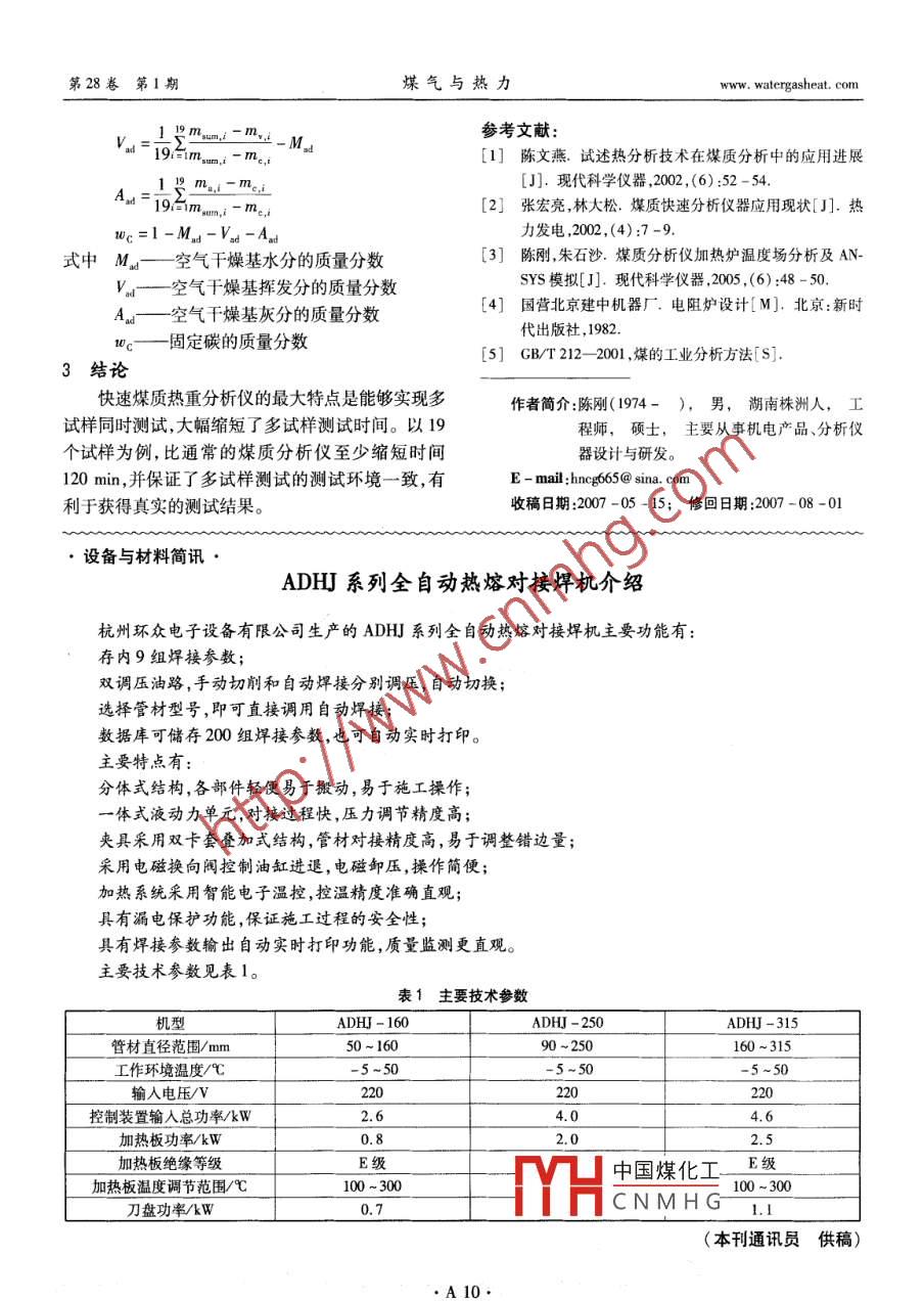 笫28卷第1期煤氣與熱力Vol 282008年1月GAS heat快速煤質(zhì)熱重分析儀的研制陳剛(株洲職業(yè)技術(shù)學院,湖南株洲4120000摘要:基于熱重分析技術(shù)的傳統(tǒng)煤工業(yè)分析速度較慢,主要原因為分析儀的結(jié)構(gòu)不能實現(xiàn)全流程多試樣分析。介紹了新型的快速煤質(zhì)熱重分析儀的結(jié)構(gòu),分析了工藝流程??焖倜嘿|(zhì)熱重分析儀能實現(xiàn)全流程多試樣的分析,縮短了分析時間。關(guān)鍵詞:熱重分析;設計;測試方法;工藝流程中圖分類號:TU995文獻標識碼:B文章編號:1000-446(2008)01-0A08-03Development of Fast Coal Quality Thermogravimetric AnalyzerCHEN GangAbstract: The speed of traditional coal proximate analysis based on thermogravimetric analysis isslow, because the analyzer structure can not realize multi-sample analysis in the whole process. Thestructure of new fast coal quality thermogravimetric analyzer is introduced, and the technological processis analyzed. The fast coal quality thermogravimetric analyzer can realize multi-sample analysis in therocesswhich shortens the analKey words: thermogravimetric analysis; design; test method; technological process具有良好穩(wěn)定性和準確性的基于熱重分析技術(shù)和旋轉(zhuǎn)機構(gòu)。本儀器采用N( National Instruments,的煤質(zhì)分析儀應用最廣?;跓嶂丶t外技術(shù)的煤質(zhì)美國國家儀器公司)虛擬儀器技術(shù)進行控制和編分析儀基本上采用雙爐膛加熱,其中低溫爐膛進行程,實現(xiàn)高精密的數(shù)據(jù)檢測??焖倜嘿|(zhì)熱重分析儀水分和灰分的檢測,高溫爐膛進行揮發(fā)分的檢測,但器的主要工藝流程為:多試樣水分同時測試、多試樣在進行揮發(fā)分檢測時只能加熱單個試樣3。在進揮發(fā)分同時測試、多試樣灰分同時測試行多試樣檢測時,需要按順序?qū)⒃嚇臃湃敫邷貭t膛,②結(jié)構(gòu)這種工藝流程不能滿足快速檢測要求。若能同時檢快速煤質(zhì)熱重分析儀器由揮發(fā)分、灰分測試爐測多個試樣的揮發(fā)分,將大幅縮短檢測時間。基于(上爐體)和水分測試爐體(下爐體)組成34。在上快速檢測的思想,本文提出了一種多試樣可同時檢爐體安裝有通氣孔用于氣壓平衡和散熱,發(fā)熱體用測的快速煤質(zhì)熱重分析儀。于爐體加熱,熱電偶用于測量溫度,在爐墻壁裝有數(shù)1快速煤質(zhì)熱重分析儀的結(jié)構(gòu)控流量計用于控制氧氣和氮氣流量,有一路分支通①技術(shù)解決方案向下爐體。文獻[5]規(guī)定,上爐體在測試揮發(fā)分時快速煤質(zhì)熱重分析儀采用熱重分析方法,爐膛溫度為(900±10)℃,爐內(nèi)通入氮氣;在測試灰分時為雙爐膛一體結(jié)構(gòu),由測試水分的下爐體和測試揮溫度為(815±10)℃,爐體內(nèi)通入氧氣。下爐體測發(fā)分、灰分的上爐體組成(結(jié)構(gòu)見圖1)。上爐體為試中國煤化工內(nèi)通人氮氣雙環(huán)形空腔爐,下爐體中布置多試樣托樣盤和稱樣孔,用于放置坩堝。桿,托樣盤通過中心桿與機架傳動機構(gòu)連接,稱樣桿托樣CNMHG即以:心桿與螺旋總成連與高精密電子天平連接。底部機架布置有升降機構(gòu)接驅(qū)動托樣盤上升和下降,通過稱樣桿利用電子天A08www, wate陳剛:快速煤質(zhì)熱重分析儀的研制第28卷第1期機測試系統(tǒng)程序③打開下爐體側(cè)蓋,點動旋轉(zhuǎn)機構(gòu),將干燥過的坩堝放于托樣盤上,關(guān)閉側(cè)蓋。運行坩堝稱量程序,系統(tǒng)將自動稱量,待1號位置坩堝運行至稱樣桿上方時,旋轉(zhuǎn)機構(gòu)停止運動,托樣盤緩慢下降至坩堝完全落在稱樣桿上且坩堝與托樣盤沒有接觸時停止下降。此時,電子天平稱出1號坩堝的質(zhì)量。這樣,系統(tǒng)自動稱量出共19個坩堝的質(zhì)量(m1、…、m、m19,單位為g),并將數(shù)據(jù)儲存到計算機中。④坩堝稱量后,打開下爐體側(cè)蓋將待測煤樣放于坩堝中,關(guān)閉側(cè)蓋。系統(tǒng)按照同樣的方法稱量出19個盛有煤樣坩堝的總質(zhì)量(mnm,1、…、mnm…m=19,單位為g),并將數(shù)據(jù)儲存到計算機中1通氣孔2上爐體3熱電偶4坩堝5多試樣托樣盤6稱樣桿總質(zhì)量稱量后,開始運行水分測試程序,下7.下爐體8機架9中心桿10天平座11電子天平12軸承座1爐體內(nèi)通入氮氣,爐溫上升至105-110℃,在此溫13光電行程開關(guān)14螺旋總成15步進電機16軸承座217齒輪組18升降電機19絲桿20發(fā)熱體21數(shù)控流量計度下,系統(tǒng)連續(xù)加熱50min,時間可調(diào)。加熱過程圖1快速煤質(zhì)熱重分析儀的結(jié)構(gòu)中,托樣盤保持迅速旋轉(zhuǎn)狀態(tài)。50min后,系統(tǒng)開始平進行稱量。下爐體還安裝有發(fā)熱體,熱電偶用于自動稱量千燥過的19個盛有煤樣坩堝的質(zhì)量測量溫度。(m、…、m,、…、m。1,單位為g)。在10min后進快速煤質(zhì)熱重分析儀的機械傳動機構(gòu)包括升降行檢查性稱量,直到兩次稱量質(zhì)量差的絕對值不超機構(gòu)和旋轉(zhuǎn)機構(gòu)。升降機構(gòu)由升降電機、齒輪組、絲過5×10g。系統(tǒng)自動保存稱量數(shù)據(jù)。桿和螺旋總成組成,升降的行程由光電行程開關(guān)控⑥在水分測試的同時,上爐體已經(jīng)開始升溫,制。旋轉(zhuǎn)機構(gòu)由步進電機、螺旋總成和中心桿組成,并通入氮氣。待溫度升至(900±10)℃時,托樣盤旋轉(zhuǎn)的定位通過步進電機的控制器及數(shù)據(jù)卡由計算整體上升至上爐體加熱7min后,托樣盤整體下降機控制。至下爐體