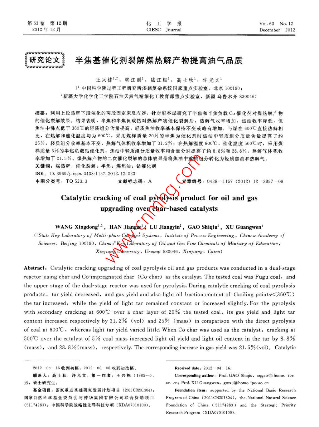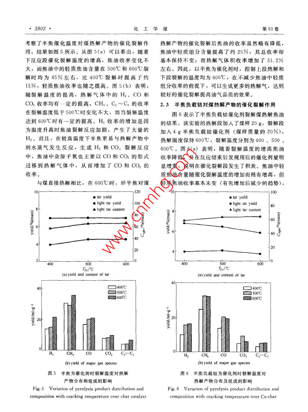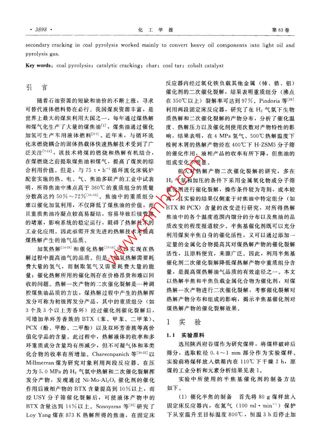 第63卷第12期化工學(xué)報(bào)Vol. 63 No. 122012年12月CIESC JournalDecember 201研究論文巢半焦基催化劑裂解煤熱解產(chǎn)物提高油氣品質(zhì)>>>>王興棟'2,韓江則',陸江銀”,高士秋',許光文'(‘中國(guó)科學(xué)院過(guò)程工程研究所多相復(fù)雜系統(tǒng)國(guó)家重點(diǎn)實(shí)驗(yàn)室,北京100190;“新疆大學(xué)化學(xué)化工學(xué)院石油天然氣精細(xì)化工教育部重點(diǎn)實(shí)驗(yàn)室,新疆烏魯木齊830046)摘要:利用上段熱解下段催化的兩段固定床反應(yīng)器,針對(duì)府谷煤研究了半焦和半焦負(fù)載Co催化劑對(duì)煤熱解產(chǎn)物的催化裂解效果。結(jié)果表明,半焦和半焦負(fù)載鈷對(duì)熱解產(chǎn)物催化裂解后,熱解氣收率增加,焦油收率降低,但焦油中沸點(diǎn)低于360°C 的輕質(zhì)組分含量提高,輕質(zhì)焦油收率基本保持不變或略有增加。與煤在600C直接熱解相比,在熱解和催化溫度均為600C,采用煤樣質(zhì)量20%的半焦為催化劑時(shí)焦油中輕質(zhì)組分質(zhì)量含量提高了約25%,輕質(zhì)組分收率基本不變,熱解氣體積收率增加了31.2%;在熱解溫度600C,催化溫度500C時(shí),采用煤樣質(zhì)量5%的半焦負(fù)載鈷催化劑,焦油中輕質(zhì)組分質(zhì)量收率和含量分別提高了約8.8%和28.8%,熱解氣體積收率增加了21.5%。煤熱解產(chǎn)物的二次催化裂解的總體效果是將焦油中重質(zhì)組分轉(zhuǎn)化為輕質(zhì)焦油和熱解氣。關(guān)鍵詞:媒熱解;催化裂解;半焦;煤焦油;鈷催化劑DOI: 10. 3969/j. issn. 0438-1157. 2012. 12. 023中圖分類(lèi)號(hào): TQ 523.3文獻(xiàn)標(biāo)志碼: A .文章編號(hào): 0438- 1157 (2012) 12- 3897-09Catalytic cracking of coal pyrolysis product for oil and gasupgrading over char-based catalystsWANG Xingdong'2,HAN Jiangze' ,LU Jiangyin',GAO Shiqiu',XU Guangwen'(' State Key Laboratory of Multi- phase Complex Systems,Institute of Process Engineering, Chinese Academy ofSciences, Beijing 100190,China ; Key Laboratory of Oil and Gas Fine Chemicals of Ministry of Education,Xinjiang University,Urumqi 830046, Xinjiang, China)Abstract: Catalytic cracking upgrading of coal pyrolysis oil and gas products was conducted in a dual-stagereactor using char and Co-impregnated char (Co-char) as the catalyst. The tested coal was Fugu coal, andthe upper stage of the dual-stage reactor was used for pyrolysis. During catalytic cracking of coal pyrolysisproducts, tar yield decreased, and gas yield and also light oil fraction content of (boiling points< <360*C)the tar increased, while the yield of light tar remained constant or increased slightly. For the pyrolysiswith secondary cracking at 600C over a char layer of 20% the tested coal, its gas yield and light tarcontent increased respectively by 31. 2% (vol) and 25% (mass) in comparison with the direct pyrolysisof coal at 600C,whereas light tar yield varied little. When Co-char was used as the catalyst, cracking at500°C over the catalyst of 5% coal mass increased light oil yield and light oil content in the tar by 8. 8%(mass),and 28. 8% (mass),respectively. The corresponding increase in gas yield was 21. 5%(vol). Catalytic2012- -04- 16收到初稿,2012 - 06 - 08收到初改稿。Received date: 2012-04- 16.聯(lián)系人:高士秋,許光文。第一作者:王興棟(1985-).Corresponding author: Prof. GAO Shiqiu, sqgao@ home. ipe男,碩士研究生。ac. cn; Prof. XU Guangwen, gwxu@ home. ipe. ac. cn基金項(xiàng)目:國(guó)家重點(diǎn)基礎(chǔ)研究發(fā)展計(jì)劃項(xiàng)目(2011CB201304);Foundation item: supported by the National Basic Research國(guó)家自然科學(xué)基金委員會(huì)與神華集團(tuán)有限公司聯(lián)合資助項(xiàng)目Program of China (2011CB201304), the National Natural Science(51174283);中國(guó)科學(xué)院戰(zhàn)略性先導(dǎo)科技專(zhuān)項(xiàng)(XDA07010100)。Foundation of China ( 51174283) and the Strategic PriorityResearch Program (XDA07010100).3898.化工學(xué)報(bào)第63卷secondary cracking in coal pyrolysis worked mainly to convert heavy oil components into light oil andpyrolysis gas.Key words: coal pyrolysis; catalytic cracking; char; coal tar; cobalt catalyst反應(yīng)器內(nèi)經(jīng)過(guò)氧化鐵負(fù)載其他金屬(鈰、鋯、鋁)引言催化劑的二次催化裂解,結(jié)果表明重質(zhì)組分(沸點(diǎn)隨著石油資源的短缺和油價(jià)的不斷上漲,尋求在350C以上)裂解率可達(dá)到97%。Pindoria 等[24]可替代液體燃料勢(shì)在必行。我國(guó)煤炭資源豐富,是利用兩段固定床反應(yīng)器,研究了在H2氣氛下生物世界上最大的煤炭利用大國(guó)之一,每年通過(guò)煤熱解質(zhì)熱解和二次催化裂解的產(chǎn)物分布,分析了催化溫和煤氣化生產(chǎn)了大量的煤焦油”,煤焦油通過(guò)催化度、熱解壓力以及催化劑使用次數(shù)對(duì)產(chǎn)物特性的影加氫可生產(chǎn)車(chē)用液體燃料(25。近年來(lái),與循環(huán)流響,結(jié)果表明,在4 MPa氫氣、500°C 熱解溫度下化床燃燒耦合的固體熱載體快速熱解技術(shù)受到了廣桉樹(shù)木屑的熱解產(chǎn)物經(jīng)在400C下H-ZSM5分子篩泛關(guān)注(13),該技術(shù)將煤的燃燒和熱解有機(jī)結(jié)合,的催化作用,液相產(chǎn)品的收率有所下降,但焦油的在煤燃燒之前提取煤焦油和煤氣,提高了煤炭的綜組成變化不明顯。合利用價(jià)值。但是,與75 t. h-1循環(huán)流化床鍋爐前人對(duì)熱解產(chǎn)物二次催化裂解的研究,多在配套實(shí)施的熱、電、氣、焦油多聯(lián)產(chǎn)的工業(yè)中試表H2氣氛和加壓的條件下采用金屬氧化物或分子篩明,所得