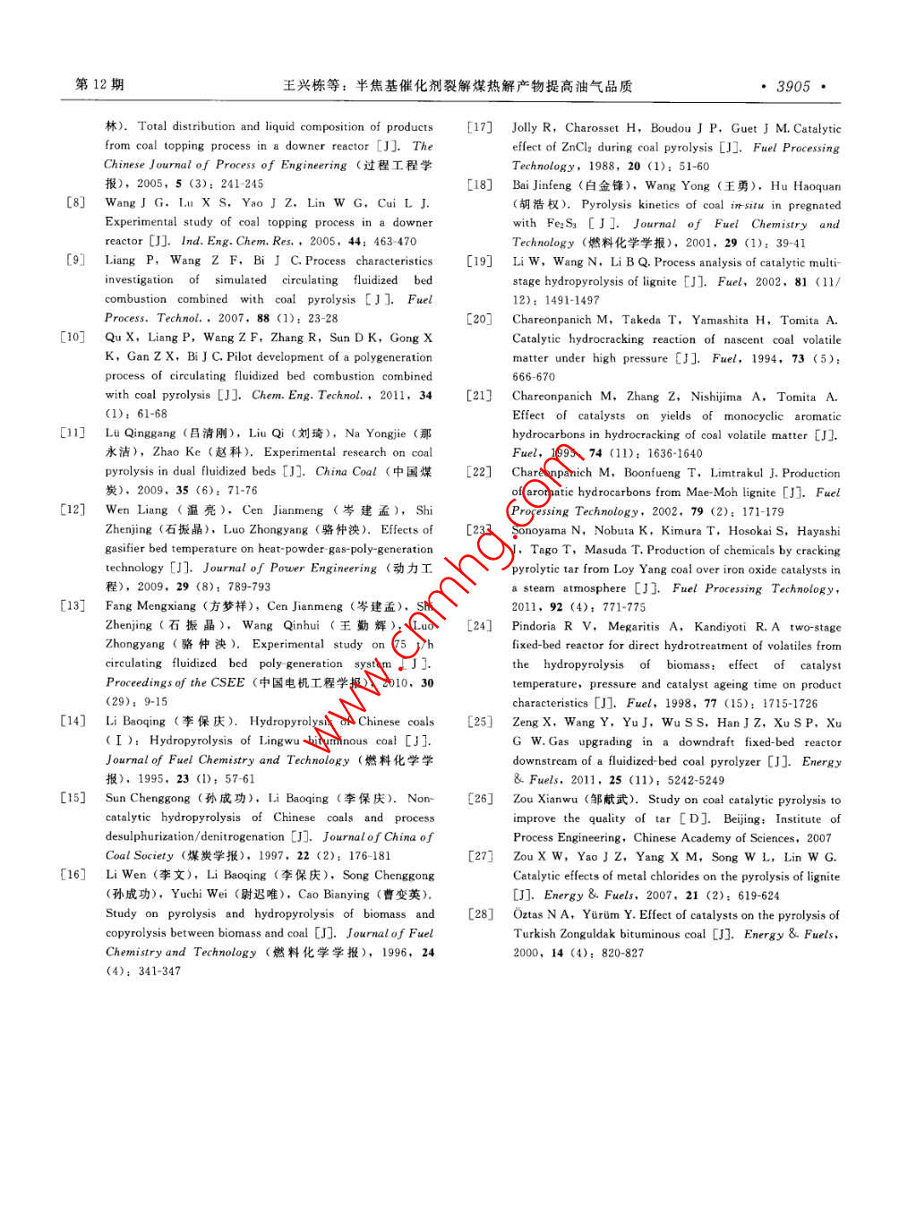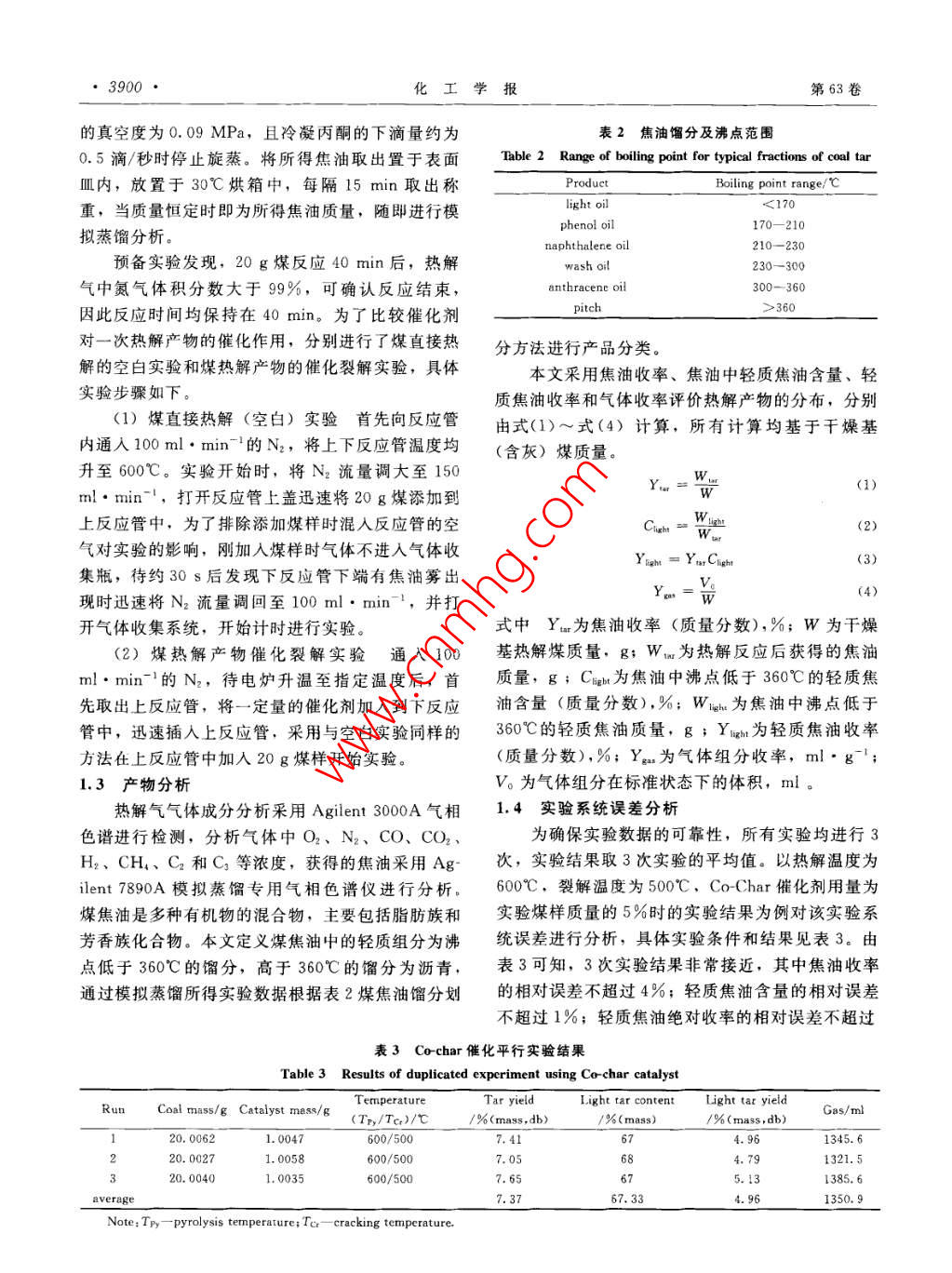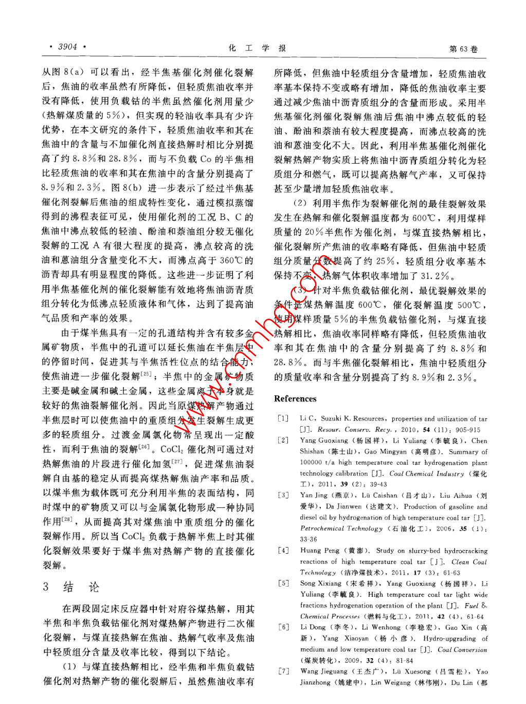 第63卷第12期化工學(xué)報(bào)Vol. 63 No. 122012年12月CIESC JournalDecember 201研究論文巢半焦基催化劑裂解煤熱解產(chǎn)物提高油氣品質(zhì)>>>>王興棟'2,韓江則',陸江銀”,高士秋',許光文'(‘中國(guó)科學(xué)院過(guò)程工程研究所多相復(fù)雜系統(tǒng)國(guó)家重點(diǎn)實(shí)驗(yàn)室,北京100190;“新疆大學(xué)化學(xué)化工學(xué)院石油天然氣精細(xì)化工教育部重點(diǎn)實(shí)驗(yàn)室,新疆烏魯木齊830046)摘要:利用上段熱解下段催化的兩段固定床反應(yīng)器,針對(duì)府谷煤研究了半焦和半焦負(fù)載Co催化劑對(duì)煤熱解產(chǎn)物的催化裂解效果。結(jié)果表明,半焦和半焦負(fù)載鈷對(duì)熱解產(chǎn)物催化裂解后,熱解氣收率增加,焦油收率降低,但焦油中沸點(diǎn)低于360°C 的輕質(zhì)組分含量提高,輕質(zhì)焦油收率基本保持不變或略有增加。與煤在600C直接熱解相比,在熱解和催化溫度均為600C,采用煤樣質(zhì)量20%的半焦為催化劑時(shí)焦油中輕質(zhì)組分質(zhì)量含量提高了約25%,輕質(zhì)組分收率基本不變,熱解氣體積收率增加了31.2%;在熱解溫度600C,催化溫度500C時(shí),采用煤樣質(zhì)量5%的半焦負(fù)載鈷催化劑,焦油中輕質(zhì)組分質(zhì)量收率和含量分別提高了約8.8%和28.8%,熱解氣體積收率增加了21.5%。煤熱解產(chǎn)物的二次催化裂解的總體效果是將焦油中重質(zhì)組分轉(zhuǎn)化為輕質(zhì)焦油和熱解氣。關(guān)鍵詞:媒熱解;催化裂解;半焦;煤焦油;鈷催化劑DOI: 10. 3969/j. issn. 0438-1157. 2012. 12. 023中圖分類(lèi)號(hào): TQ 523.3文獻(xiàn)標(biāo)志碼: A .文章編號(hào): 0438- 1157 (2012) 12- 3897-09Catalytic cracking of coal pyrolysis product for oil and gasupgrading over char-based catalystsWANG Xingdong'2,HAN Jiangze' ,LU Jiangyin',GAO Shiqiu',XU Guangwen'(' State Key Laboratory of Multi- phase Complex Systems,Institute of Process Engineering, Chinese Academy ofSciences, Beijing 100190,China ; Key Laboratory of Oil and Gas Fine Chemicals of Ministry of Education,Xinjiang University,Urumqi 830046, Xinjiang, China)Abstract: Catalytic cracking upgrading of coal pyrolysis oil and gas products was conducted in a dual-stagereactor using char and Co-impregnated char (Co-char) as the catalyst. The tested coal was Fugu coal, andthe upper stage of the dual-stage reactor was used for pyrolysis. During catalytic cracking of coal pyrolysisproducts, tar yield decreased, and gas yield and also light oil fraction content of (boiling points< <360*C)the tar increased, while the yield of light tar remained constant or increased slightly. For the pyrolysiswith secondary cracking at 600C over a char layer of 20% the tested coal, its gas yield and light tarcontent increased respectively by 31. 2% (vol) and 25% (mass) in comparison with the direct pyrolysisof coal at 600C,whereas light tar yield varied little. When Co-char was used as the catalyst, cracking at500°C over the catalyst of 5% coal mass increased light oil yield and light oil content in the tar by 8. 8%(mass),and 28. 8% (mass),respectively. The corresponding increase in gas yield was 21. 5%(vol). Catalytic2012- -04- 16收到初稿,2012 - 06 - 08收到初改稿。Received date: 2012-04- 16.聯(lián)系人:高士秋,許光文。第一作者:王興棟(1985-).Corresponding author: Prof. GAO Shiqiu, sqgao@ home. ipe男,碩士研究生。ac. cn; Prof. XU Guangwen, gwxu@ home. ipe. ac. cn基金項(xiàng)目:國(guó)家重點(diǎn)基礎(chǔ)研究發(fā)展計(jì)劃項(xiàng)目(2011CB201304);Foundation item: supported by the National Basic Research國(guó)家自然科學(xué)基金委員會(huì)與神華集團(tuán)有限公司聯(lián)合資助項(xiàng)目Program of China (2011CB201304), the National Natural Science(51174283);中國(guó)科學(xué)院戰(zhàn)略性先導(dǎo)科技專(zhuān)項(xiàng)(XDA07010100)。Foundation of China ( 51174283) and the Strategic PriorityResearch Program (XDA07010100).3898.化工學(xué)報(bào)第63卷secondary cracking in coal pyrolysis worked mainly to convert heavy oil components into light oil andpyrolysis gas.Key words: coal pyrolysis; catalytic cracking; char; coal tar; cobalt catalyst反應(yīng)器內(nèi)經(jīng)過(guò)氧化鐵負(fù)載其他金屬(鈰、鋯、鋁)引言催化劑的二次催化裂解,結(jié)果表明重質(zhì)組分(沸點(diǎn)隨著石油資源的短缺和油價(jià)的不斷上漲,尋求在350C以上)裂解率可達(dá)到97%。Pindoria 等[24]可替代液體燃料勢(shì)在必行。我國(guó)煤炭資源豐富,是利用兩段固定床反應(yīng)器,研究了在H2氣氛下生物世界上最大的煤炭利用大國(guó)之一,每年通過(guò)煤熱解質(zhì)熱解和二次催化裂解的產(chǎn)物分布,分析了催化溫和煤氣化生產(chǎn)了大量的煤焦油”,煤焦油通過(guò)催化度、熱解壓力以及催化劑使用次數(shù)對(duì)產(chǎn)物特性的影加氫可生產(chǎn)車(chē)用液體燃料(25。近年來(lái),與循環(huán)流響,結(jié)果表明,在4 MPa氫氣、500°C 熱解溫度下化床燃燒耦合的固體熱載體快速熱解技術(shù)受到了廣桉樹(shù)木屑的熱解產(chǎn)物經(jīng)在400C下H-ZSM5分子篩泛關(guān)注(13),該技術(shù)將煤的燃燒和熱解有機(jī)結(jié)合,的催化作用,液相產(chǎn)品的收率有所下降,但焦油的在煤燃燒之前提取煤焦油和煤氣,提高了煤炭的綜組成變化不明顯。合利用價(jià)值。但是,與75 t. h-1循環(huán)流化床鍋爐前人對(duì)熱解產(chǎn)物二次催化裂解的研究,多在配套實(shí)施的熱、電、氣、焦油多聯(lián)產(chǎn)的工業(yè)中試表H2氣氛和加壓的條件下采用金屬氧化物或分子篩明,所得