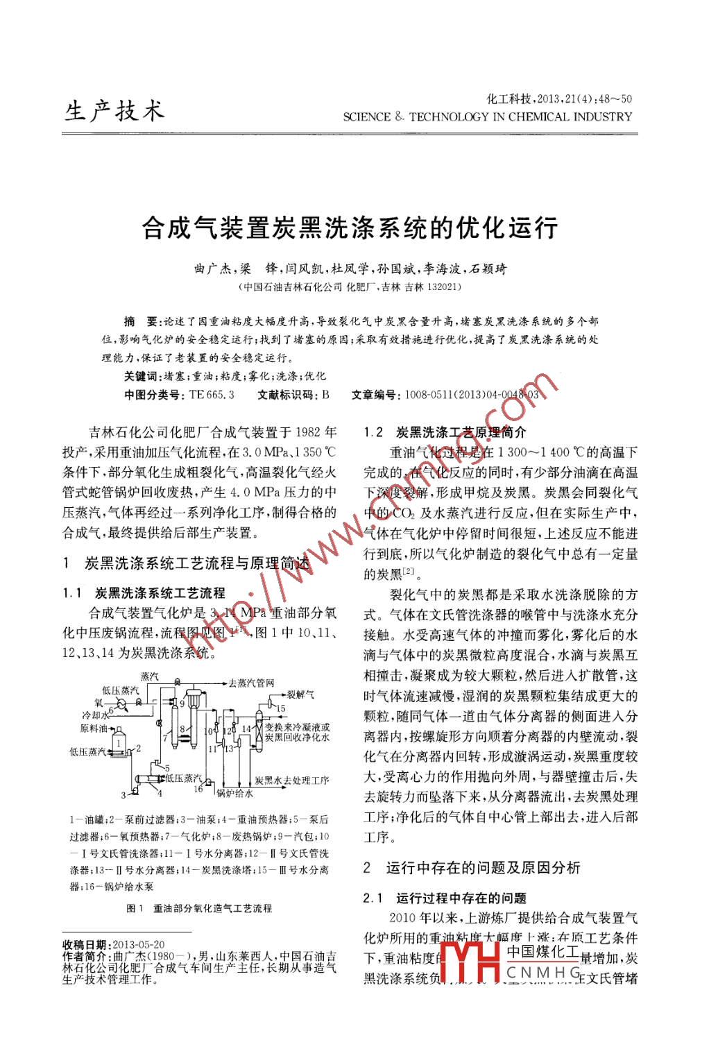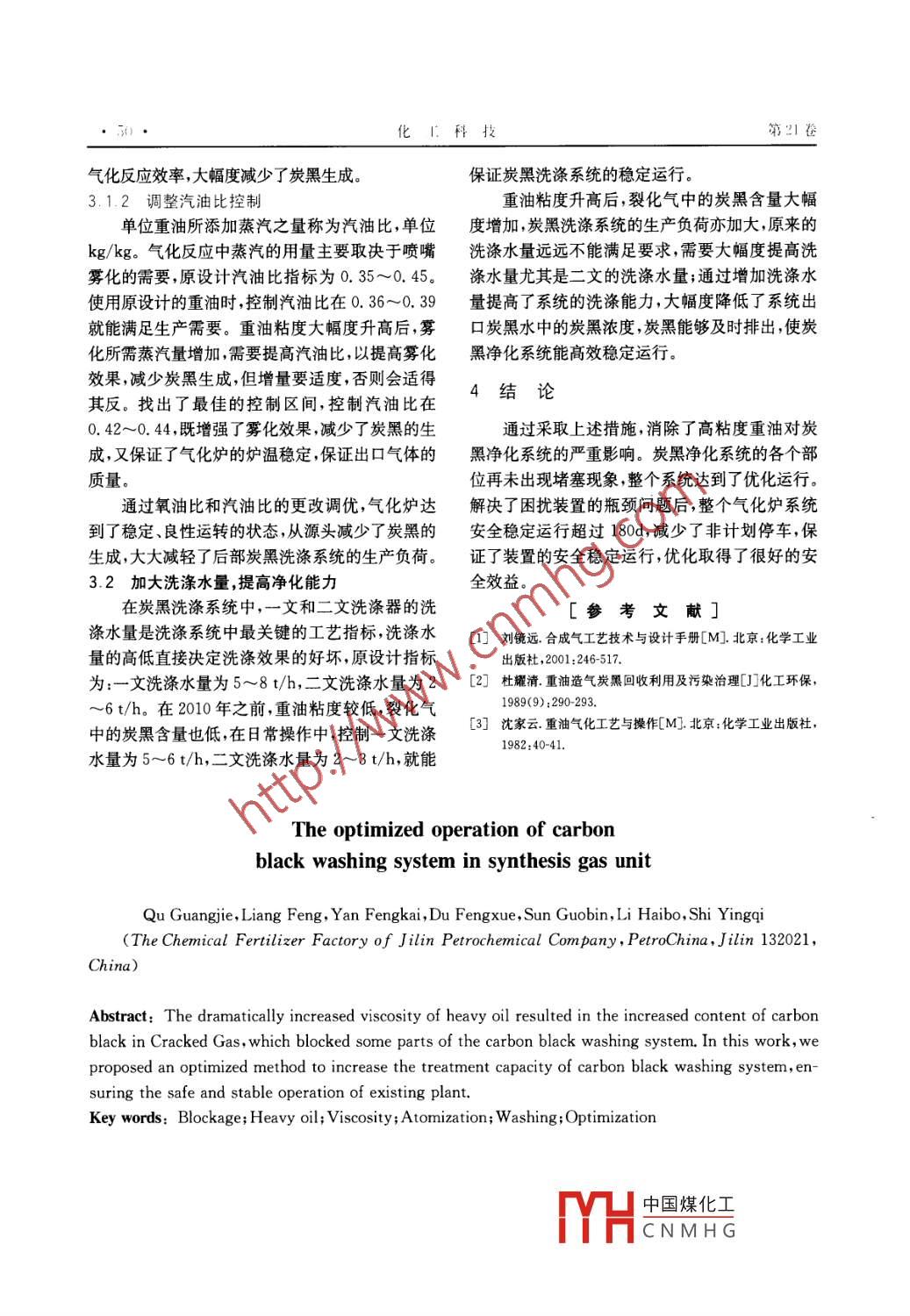 生產(chǎn)技術(shù)化工科技,2013,21(4):48~50science & TECHNOLOGY IN CHEMICAL INDUSTRY合成氣裝置炭黑洗滌系統(tǒng)的優(yōu)化運行曲廣杰,梁鋒,閆風凱,杜鳳學,孫國斌,李海波,石穎琦(中國石油吉林石化公司化肥廠,吉林吉林132021)摘要:論迷了因重油粘度大幅度升高,導致裂化氣中炭黑含量升髙,堵塞炭黑洗滌系統(tǒng)的多個部位,影響氣化爐的安全穩(wěn)定運行;找到了堵塞的原因;釆取有效措施進行優(yōu)化,提高了炭黑洗滌系統(tǒng)的處理能力,保證了老裝置的安全穩(wěn)定運行。關(guān)鍵詞:;堵塞;重油;粘度;霧化;洗滌;優(yōu)化中圖分類號:TE665.3文獻標識碼:B文章編號:1008-0511(2013)04004803吉林石化公司化肥廠合成氣裝置于1982年1.2炭黑洗滌工藝原理簡介投產(chǎn),采用重油加壓氣化流程,在3.0MPa、1350℃重油氣化過程是在1300~1400℃的高溫下條件下,部分氧化生成粗裂化氣,高溫裂化氣經(jīng)火完成的,在氣化反應的同時,有少部分油滴在高溫管式蛇管鍋爐回收廢熱,產(chǎn)生4.0MPa壓力的中下深度裂解,形成甲烷及炭黑。炭黑會同裂化氣壓蒸汽,氣體再經(jīng)過一系列凈化工序,制得合格的中的CO2及水蒸汽進行反應,但在實際生產(chǎn)中,合成氣,最終提供給后部生產(chǎn)裝置。氣體在氣化爐中停留時間很短,上述反應不能進1炭黑洗滌系統(tǒng)工藝流程與原理簡述行到底,所以氣化爐制造的裂化氣中總有一定量的炭黑211.1炭黑洗滌系統(tǒng)工藝流程裂化氣中的炭黑都是采取水洗滌脫除的方合成氣裝置氣化爐是3.14MPa重油部分氧式。氣體在文氏管洗滌器的喉管中與洗滌水充分化中壓廢鍋流程,流程圖見圖1,圖1中10、11、接觸。水受高速氣體的沖撞而霧化,霧化后的水12、13、14為炭黑洗滌系統(tǒng)滴與氣體中的炭黑微粒高度混合,水滴與炭黑互蒸汽去蒸汽管網(wǎng)相撞擊,凝聚成為較大顆粒,然后進入擴散管,這低壓蒸汽時氣體流速減慢,濕潤的炭黑顆粒集結(jié)成更大的冷卻水6顆粒,隨同氣體一道由氣體分離器的側(cè)面進入分原料油14變換來冷凝液或炭黑回收凈化水離器內(nèi),按螺旋形方向順著分離器的內(nèi)壁流動,裂低壓蒸汽攔2化氣在分離器內(nèi)回轉(zhuǎn),形成漩渦運動,炭黑重度較炭黑水去處理工序大,受離心力的作用拋向外周,與器壁撞擊后,失去旋轉(zhuǎn)力而墜落下來,從分離器流出,去炭黑處理油罐:2-泵前過濾器:3-油泵;4-重油預熱器:5-泵后工序;凈化后的氣體自中心管上部出去,進入后部過濾器;6一氧預熱器;7一氣化爐;8一廢熱鍋爐;9一汽包;10工序。I號文氏管洗滌器:11-1號水分離器;12-Ⅱ號文氏管洗滌器:13-Ⅱ號水分離器:14-炭黑洗滌塔;15-Ⅲ號水分離2運行中存在的問題及原因分析器;16-鍋爐給水泵2.1運行過程中存在的問題圖1重油部分氧化造氣工藝流程2010年以來,上游煉廠提供給合成氣裝置氣收稿日期:201305-20化爐所用的重油料度大幅度上漲:在原工藝條件作者簡介;曲廣杰(1980-),男,山東萊西人,中國石下,重油粘度中國煤化工量增加,炭肥廠合成氣車間生產(chǎn)主任,長期從事生產(chǎn)技術(shù)管理工作。黑洗滌系統(tǒng)負CNMH王文氏管堵第1期曲疒杰·等.合成氣裝置炭黑洗滌系統(tǒng)的優(yōu)化運行塞喉管,造成氣化爐超壓直至停車,嚴重影響氣化大幅度升高后原有的霧化器不能適應粘度的改爐的安全運行;同時堵塞也使炭黑洗滌系統(tǒng)效率變,霧化效果變差,導致裂化氣中炭黑含量增加,炭下降,降低了外送裂化氣的品質(zhì),影響后部工序的黑洗滌系統(tǒng)負荷增大,導致一文、二文頻繁堵塞;生產(chǎn)。旦出現(xiàn)堵塞,無法及時停車清理(保證連續(xù)化生2.2原因分析產(chǎn)),炭黑在喉管和擴散管處聚集,久而久之,將喉在重油部分氧化過程中,為了保證氣化反應管和擴散管完全堵塞,造成氣化爐系統(tǒng)停車。的效果,需要最大限度的將油滴分割,使油和氣化劑形成最大的反應界面。這樣既能減少重油裂解3采取的措施反應的發(fā)生(即減少炭黑和甲烷的生成),又能加由炭黑生成機理和炭黑洗滌工藝原理簡介不快氣化反應速度,提高氣化效率難看出,要避免一文、二文洗滌器的堵塞,必須從概括來說,重油的霧化是用外加能量做功克減少炭黑的生成和強化洗滌效果2個方面想辦服重油的表面張力以增大表面積的過程。此過法,基于這2點,從2012年8月份開始,開始積極程是一個復雜的物理機械過程。重油霧化效果的進行工藝優(yōu)化:一是根據(jù)入爐重油的變化對氣化好壞直接決定裂化氣中炭黑含量多少。爐進行工藝指標優(yōu)化,大幅度減少炭黑的生成;二影響重油霧化效果的因素主要有5方面:重是加大一文、二文的洗滌水用量,盡量提高整個炭油的粘度及表面張力氣化劑與重油的相對速度,黑洗滌系統(tǒng)的能力防止炭黑在系統(tǒng)內(nèi)積聚外界給予重油外力的大小,氣化劑和燃料的噴出3.1優(yōu)化工藝指標減少炭黑生成夾角及作用方向,霧化器的類型、結(jié)構(gòu)及加工質(zhì)根據(jù)氣化反應的原理并結(jié)合多年的生產(chǎn)實踐量,其中影響最大的因素是重油的粘度。重油的經(jīng)驗,反應中炭黑生成的多少主要取決于氧油比粘度除了與溫度有關(guān)外,也與自己本身的物理性汽油比這2個工藝指標的控制。質(zhì)有關(guān),由于石油的組成和加工方法不同,煉制后在裝置設計時,根據(jù)當時所用重油的特性,設重油的粘度也不一樣,合成氣裝置