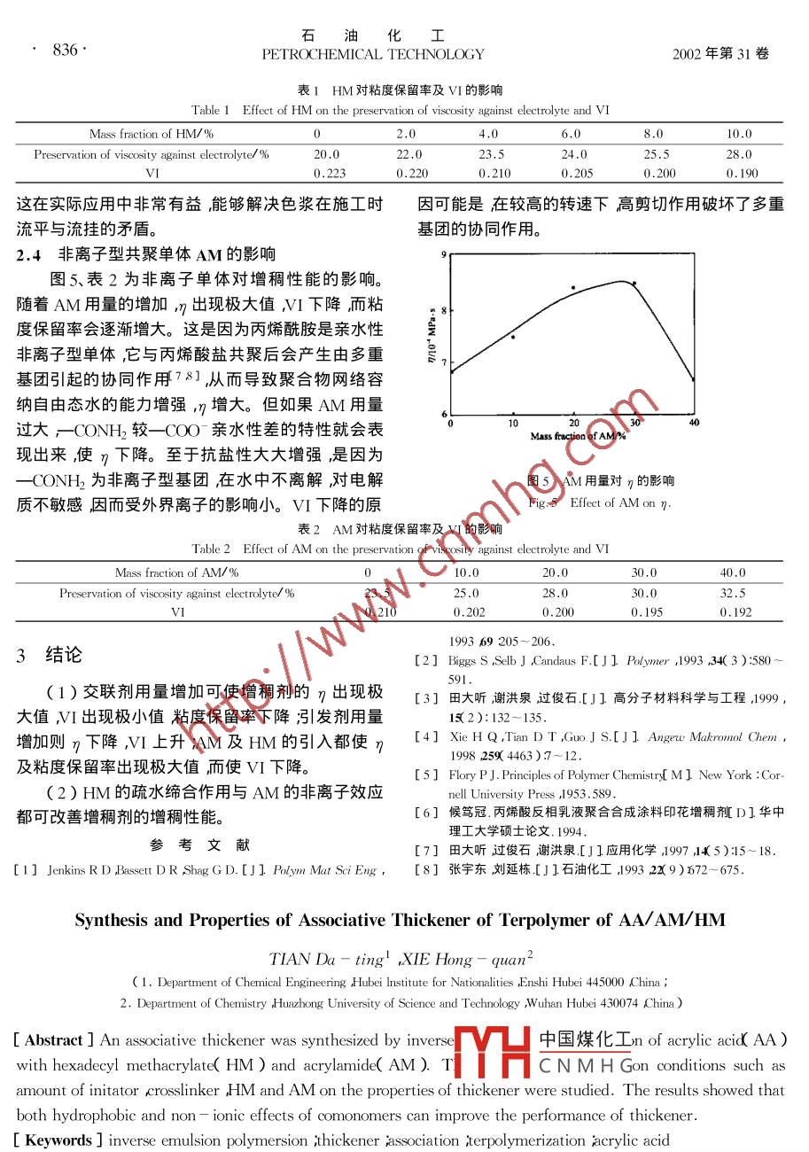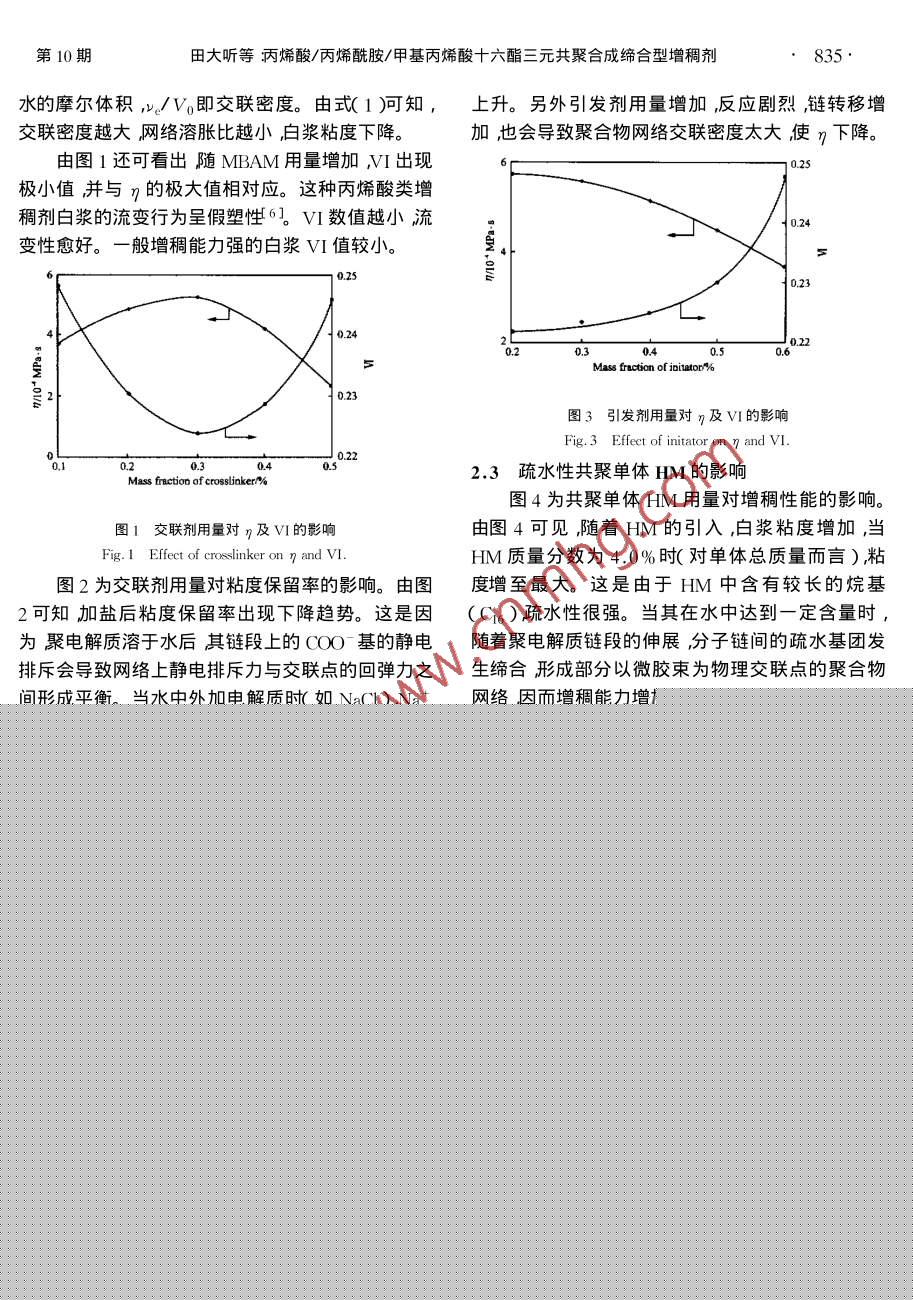 石油化工PETROCHEMICAL TECHNOLOGY2002年第31卷第10期丙烯酸/丙烯酰胺/甲基丙烯酸十六酯三元共聚合成締合型增稠劑田大聽(tīng),謝洪泉1.湖北民族學(xué)院化工系湖北恩施445000.華中科技大學(xué)化學(xué)系湖北武漢430074〔摘要]采用反相乳液聚合法合成了含丙烯酸/丙烯酰胺/甲基丙烯酸十六酯三元共聚物的締合型增稠劑。研究了交聯(lián)劑、引發(fā)劑、疏水共聚單體、親水非離子型共聚單體的用量等聚合條件對(duì)增稠劑性能的彯響。結(jié)果表明共聚單體的硫水效應(yīng)及非離子效應(yīng)都有利于改善增稠劑的性能。關(guān)鍵詞]反相乳液聚合增稠劑締合三元共聚丙烯酸[文章編號(hào)]1000-8411(2002)0-0834-03[中圖分類號(hào)]O631.51[文獻(xiàn)標(biāo)識(shí)碼]A交聯(lián)型聚丙烯酸膠乳作為涂料印花增稠劑已經(jīng)減壓共沸脫水及二甲苯,得到基本無(wú)水的油包水得到廣泛應(yīng)用。但是這類陰離子型增稠劑仍存在-(W/O型聚合物膠乳。最后向此膠乳中加入一定些缺陷如耐電解質(zhì)性能、色漿觸變性、印花時(shí)得色量的反相劑 Tween-80。量等均不十分理想。改進(jìn)的方法是在其親水主鏈上1.3性能測(cè)試引入少量疏水性基團(tuán)從而合成締合型增稠劑123白漿粘度用NDJ-1型旋轉(zhuǎn)粘度計(jì)測(cè)定由已文獻(xiàn)34報(bào)道了用含長(zhǎng)鏈的疏水性單體甲基丙烯酸加反相劑的膠乳、適量氨水與蒸餾水配成的白漿膠十六酯與丙烯酸共聚合成了由二元共聚物組成的乳質(zhì)量分?jǐn)?shù)1%粘度n轉(zhuǎn)速為6r/min締合型增稠劑。在此基礎(chǔ)上本研究用反相乳液聚白漿的粘度指數(shù)ⅥI)是轉(zhuǎn)速為60r/min的白合法合成含丙烯酸/丙烯酰胺/甲基丙烯酸十六酯三漿粘度m與轉(zhuǎn)速6r/min的白漿粘度v的比值。元共聚物的締合型增稠劑,以期利用共聚單體的疏粘度保留率在測(cè)定完白漿粘度后向其中加入水效應(yīng)及非離子效應(yīng)來(lái)共同提高增稠劑的性能。定量的NaC得到含0.05%(質(zhì)量分?jǐn)?shù))NaCl的1實(shí)驗(yàn)部分白漿再測(cè)其粘度加電解質(zhì)后的自漿粘度×1001.1原料粘度保留率%)=原白漿粘度丙烯酸(AA)聚合級(jí)北京東方化工廠產(chǎn)丙烯2結(jié)果與討論酰胺(AM)N,N′-亞甲基雙丙烯酰胺(MBAMSpan-80、Twen-80均為化學(xué)純:/氮二異丁腈2.1交聯(lián)劑用量的影響AIBN)北化學(xué)純用95%乙醇重結(jié)晶甲基丙烯酸交聯(lián)劑用量對(duì)膠乳的增稠性能影響顯著。由圖十六酯HM內(nèi)為甲基丙烯酸甲酯與十六醇通過(guò)酯交1可看出隨著MAM用量的增加白漿粘度出現(xiàn)換反應(yīng)制得并經(jīng)減壓蒸餾精制高分子穩(wěn)定劑為兩極大值。這可解釋為線型聚電解質(zhì)引入交聯(lián)劑后親聚合物由本實(shí)驗(yàn)室自制3a;石蠟油、二甲苯及形成網(wǎng)絡(luò)。對(duì)自由態(tài)水的限制作用大大增強(qiáng)增稠氨水為工業(yè)級(jí)未經(jīng)處理能力隨之驟增。但若繼續(xù)增大交聯(lián)劑用量交聯(lián)度1.2聚合物膠乳的合成過(guò)大聚合物的溶脹性變差粘度變小。 Flory51關(guān)在配置有機(jī)械攪拌器、油水分離器及冷凝裝置、于離子型網(wǎng)絡(luò)的溶脹理論見(jiàn)式(1溫度計(jì)的三口圓底燒瓶中分別加入由適量乳化劑A3=[(i2VS)+(1/2-X1yv1yvV(1)(Span-80)高分子穩(wěn)定劑、引發(fā)劑(AIBN)HM、其中中國(guó)煤化工劉絡(luò)上固定電荷的濃液體石蠟及二甲苯組成的油相由定量氨水中和的度SCNMHG相互作用參數(shù),V1為丙烯酸、交聯(lián)劑MBAMλ丙烯酰胺溶于蒸餾水組成水相,將水相加入到油相,強(qiáng)烈攪拌(600~700[收稿日期]2002-03-07[修改稿日期]2002-04-17。r/min頎乳化30min后控制攪拌速率200-300作者簡(jiǎn)介]田大聽(tīng)1968-)男湖北省巴東縣人頤士講師電話r/min在丙方傑下升溫到70℃引發(fā)聚合數(shù)小時(shí)0718-8432015電郵 mandating@163.cm第10期田大聽(tīng)等丙烯酸/丙烯酰胺/甲基丙烯酸十六酯三元共聚合成締合型增稠劑835水的摩爾體積,/V即交聯(lián)密度。由式(1)可知,上升。另外引發(fā)劑用量增加,反應(yīng)劇烈鏈轉(zhuǎn)移增交聯(lián)密度越大網(wǎng)絡(luò)溶脹比越小白漿粘度下降。加也會(huì)導(dǎo)致聚合物網(wǎng)絡(luò)交聯(lián)密度太大使n下降。由圖1還可看出隨MBAM用量增加ⅥI出現(xiàn)極小值并與η的極大值相對(duì)應(yīng)。這種丙烯酸類增稠劑白漿的流變行為呈假塑性6。ⅥI數(shù)值越小流變性愈好。一般增稠能力強(qiáng)的白漿ⅥI值較小024Mass fraction of imitaton%o圖3引發(fā)劑用量對(duì)n及Ⅵ的影響Fig 3 Effect of initator on n and VI0.32.3疏水性共聚單體HM的影響Mass fraction of cross linker?圖4為共聚單體HM用量對(duì)增稠性能的影響。圖1交聯(lián)劑用量對(duì)n及ⅥI的影響由圖4可見(jiàn)隨著HM的引入,白漿粘度增加,當(dāng)Fig 1 Effect of crosslinker on n and VHM質(zhì)量分?jǐn)?shù)為4.0%時(shí)(對(duì)單體總質(zhì)量而言),粘圖2為交聯(lián)劑用量對(duì)粘度保留率的影響。由圖度增至最大。這是由于HM中含有較長(zhǎng)的烷基2可知加鹽后粘度保留率出現(xiàn)下降趨勢(shì)。這是因(C6)疏水性很強(qiáng)。當(dāng)其在水中達(dá)到一定含量時(shí)為聚電解質(zhì)溶于水后其鏈段上的(OOˉ基的靜電隨著聚電解質(zhì)鏈段的伸展分子鏈間的疏水基團(tuán)發(fā)排斥會(huì)導(dǎo)致網(wǎng)絡(luò)上靜電排