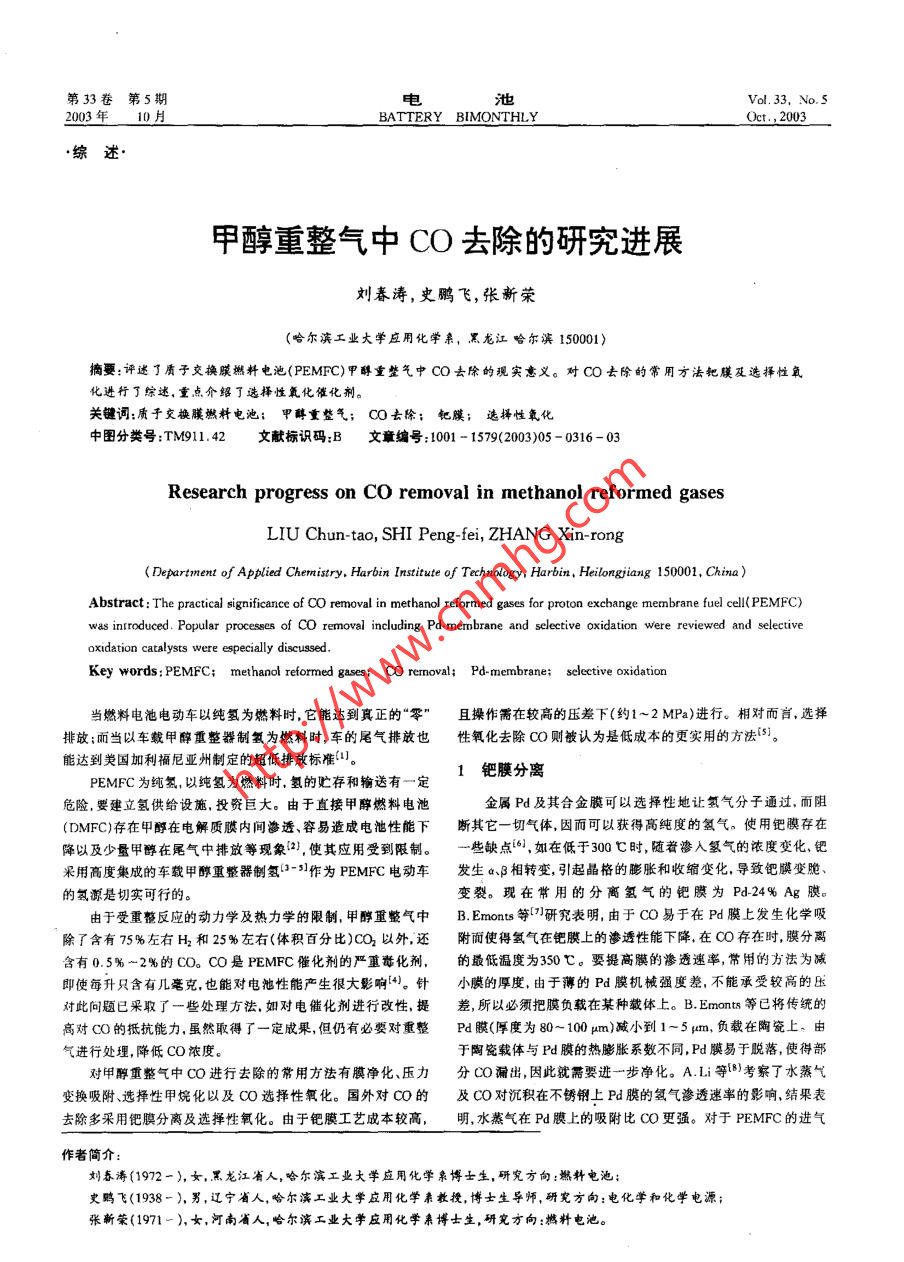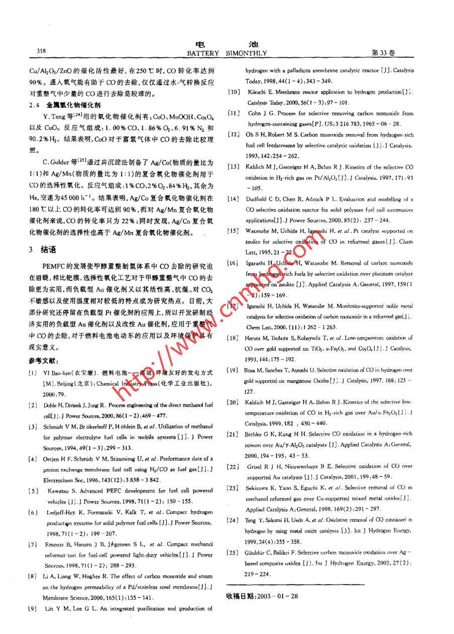 第33卷第5期電池Vol. 33, No.S2003年10 月。BATTERY BIMONTHLYOct.. 2003.綜述.甲醇重整氣中CO去除的研究進展劉春濤,史鵬飛,張新榮(哈爾濱工業(yè)大學應用化學系,黑龍江哈爾濱150001)摘要:評述了質(zhì)予交換膜燃料電池(PEMPC)甲醇重整氣中co去除的現(xiàn)實意義。對CO去除的常用方法鈀膜及選擇性氧化進行了綜述,重點介鯧了選擇性氧化催化劑。關鍵詞:質(zhì)于交換膜燃料電池;甲醇重整氣; C0去除;鈀膜;選擇性氧化中圖分類號:TM911.42文獻標識碼:B 文章編號: 1001 -1579(2003)05 - 0316-03Research progress on CO removal in methanol reformed gasesLIU Chun-tao, SHI Peng-fei, ZHANG Xin- rong(Department of Applied Chernistry. Harbin Institute of Technology, Harbin。Heilongjiang 150001, China)Abstract: The practical significance of CO removal in methanol reformed gases for proton excbange membrane fuel cell(PEMFC)was introduced. Popular processes of CO removal including Pd- membrane and selective oxidation were reviewed and selectiveoxidation catalysts were especially discussed.Key words: PEMFC; methanol reformed gases; CO remnoval; Pd- menbrane; selective oxidation當燃料電池電動車以純氫為燃料時,它能達到真正的“零”且操作需在較高的壓差下(約1~2 MPa)進行。相對而言,選擇排放;而當以車載甲醇重整器制氫為燃料時,車的尾氣排放也性氧化去除Co則被認為是低成本的更實用的方法[5]。能達到美國加利福尼亞州制定的超低排放標準(。PEMFC為純氫,以純氫為燃料時,氫的貯存和輸送有一定1鈀膜分離危險,要建立氫供給設施,投資巨大。由于直接甲醇燃料電池金屬Pd及其合金膜可以選擇性地讓氫氣分子通過,而阻(DMFC)存在甲醇在電解質(zhì)膜內(nèi)間滲透、容易造成電池性能下斷其它一切氣體,因而可以獲得高純度的氫氣。使用鈀膜存在降以及少量甲醇在尾氣中排放等現(xiàn)象2),使其應用受到限制。-些缺 點i6].如在低于300心時,隨者滲入氫氣的濃度變化,鈀采用高度集成的車載甲醇重整器制氫(-s]作為PEMFC電動車發(fā)生a、β相轉(zhuǎn)變,引起晶格的膨脹和收縮變化.導致鈀膜變脆、的氫源是切實可行的。變裂。現(xiàn)在常用的分離氫氣的鈀膜為Pd-24% Ag膜。由于受重整反應的動力學及熱力學的限制,甲醇重整氣中B.Enonts等”]研究表明,由于CO易于在Pd膜上發(fā)生化學吸除了含有75%左右H2和25%左右(體積百分比)CO2以外,還附而使得氫氣在鈀膜上的滲透性能下降,在c0存在時,膜分離含有0.5% ~2%的CO。CO是PEMFC催化劑的嚴重毒化劑,的最低溫度為350七。要提高膜的滲透速率,常用的方法為減即使每升只含有幾毫克,也能對電他性能產(chǎn)生很大影響(4。針小膜的厚度,由于薄的Pd膜機械強度差,不能承受較高的壓對此問題已采取了一些處理方法.如對電催化劑進行改性,提差,所以必須把膜負載在某種載體上。B. Emonts等已將傳統(tǒng)的高對co的抵抗能力,雖然取得了一定成果,但仍有必要對重整Pd膜(厚度為80~ 100 pm)堿小到1~5 pumn,負載在陶瓷上。由氣進行處理,降低CO濃度。于陶瓷載體與Pd膜的熱膨脹系數(shù)不同,Pd膜易于脫落,使得部對甲醇重整氣中CO進行去除的常用方法有膜凈化、壓力分c漏出,因此就需要進一步凈化。A.Li 等18)考察了水蒸氣變換吸附、選擇性甲烷化以及CO選擇性氧化。國外對co的及co對沉積在不銹鋼上Pd膜的氫氣滲透速串的影響,結(jié)果表去除多采用鈀膜分離及選擇性氧化。由于鈀膜工藝成本較高,明,水蒸氣在Pd膜上的吸附比CO更強。對于PEMFC的進氣作者簡介:劉春濤(1972-),女,黑龍江省人,哈爾濱工業(yè)大學應用化學泉博士生。研究方向:燃料電池; .史鸚飛(1938-),男,遼寧省人,哈爾濱工業(yè)大學應用化學素教授,博士生導師,研究方向:電化學和化學電源{ .張新榮(1971- ),女,河南省人,哈爾濱工業(yè)大學應用化學來博士生,研究方向:燃料電池。317第5期劉春濤,等:甲醇重整氣中co去除的研究進展來說,水蒸氣及co對氫滲透效率的影響都存在。富氫氣體中的C的氧化,結(jié)果發(fā)現(xiàn),在150七時,Pr-Ru/Y.M.1in等人測采用負載的單層Pd膜反應器與雙層Pdmordenite呈現(xiàn)出相當高的催化活性。作者認為,這可能是由于膜反應器把制氫與凈化氫氣結(jié)合成一-體, 反應時嚴生的氫氣透“協(xié)同作用“機制的結(jié)果,即吸附在Pt上的CO與吸附在相鄰位過Pd膜直接得到富集,00和Co2則因不能透過而被除去,用置Ru上的O2發(fā)生反應。這種反應器制得的氫氣純度可達99.9%。.2 負載僉催化劑E.Kikuhil0)為克服Pd膜的一些缺點,如存在氫脆現(xiàn)象20世紀90年代初期,M.HarutalB)開始研究以Au為主要等,采用化學氣相沉積法制得了非Pd膜,如Pt膜,但這種膜對活性組分的催化劑,研究發(fā)現(xiàn)當Au高度分散于多孔氧化物表氫氣滲透的選擇性較差,而由化學鍍膜法制得的在多孔陶瓷上面形成納米顆粒時,對Co的氧化反應具有很強的催化活性,而的Pd膜對氫氣的選擇性卻為100%。且具有相當好的耐水性。這-發(fā)現(xiàn)使得對負載型金催化劑的研究成為熱點。國內(nèi)也隨之開始了金催化劑的研究。最近,一2選擇性氧化些學者把它應用于富氫氣體中co的去除。2.1 鉑系貴金屬催化劑M.Rosa等191用共沉淀法制備了負載型金催化劑Au/早在1965年,JG.Cn!)就發(fā)現(xiàn)Pt/Al2O3能有效地對富MnO2, 用于富氫氣體中選擇性氧化CO的研究,模擬反應氣組氨氣體中的CO進行選擇性氧化,但需要嚴格控制反應溫麼和成為:1.0%CO.1.0%O2,其余為H2。結(jié)果表明,與Pt/A-zeolile通