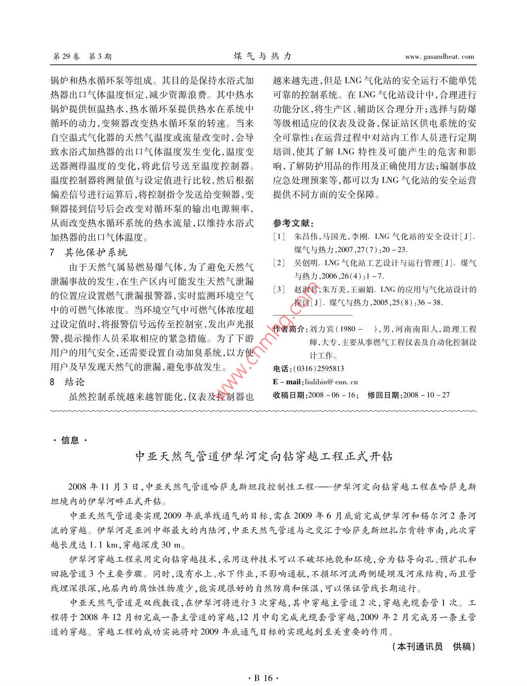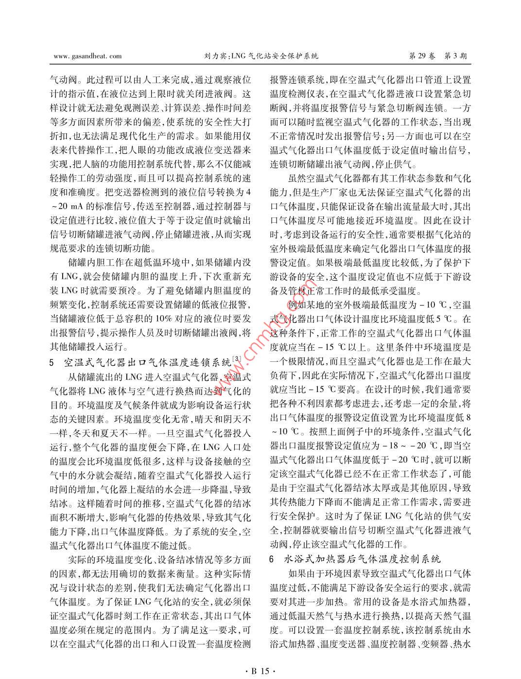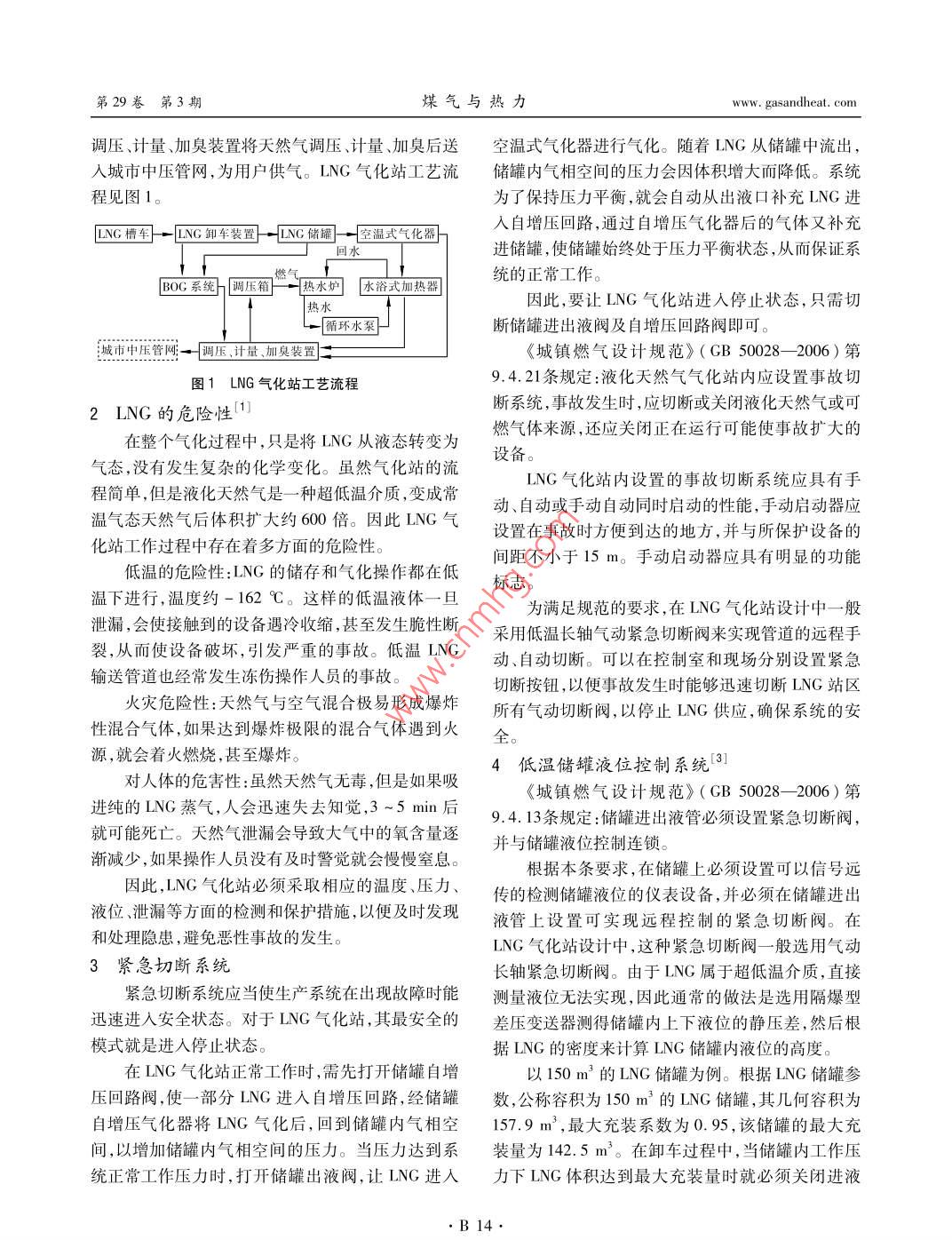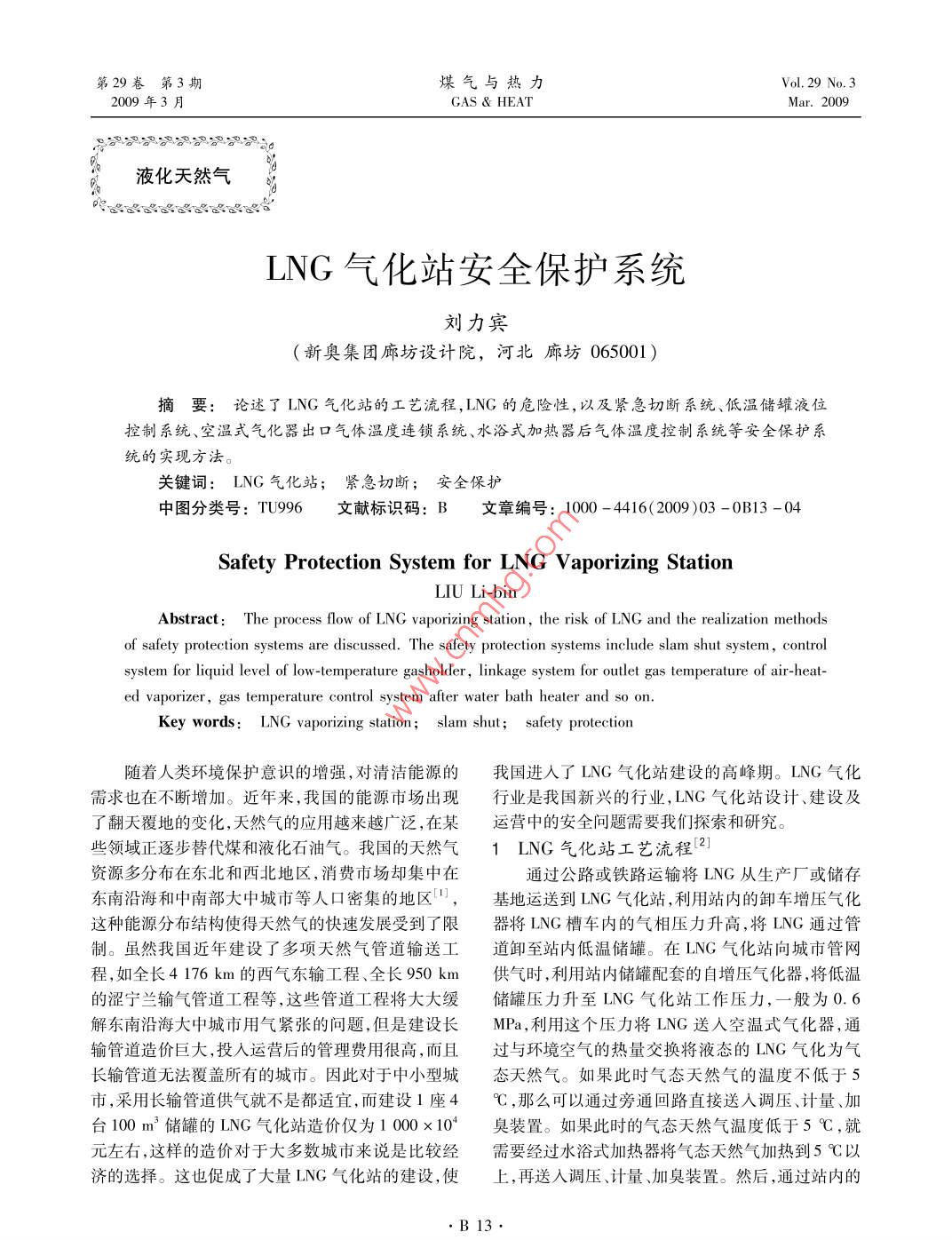 第29卷第3期煤氣與熱力www. gasandheat. com調(diào)壓、計量、加臭裝置將天然氣調(diào)壓、計量、加臭后送:空溫式氣化器進行氣化。隨著LNG從儲罐中流出,人城市中壓管網(wǎng),為用戶供氣。LNG氣化站工藝流.儲罐內(nèi)氣相空間的壓力會因體積增大而降低。系統(tǒng)程見圖1。為了保持壓力平衡,就會自動從出液口補充LNG進LNG槽車一LNG卸車裝置-LNG儲罐]-一空溫式氣化器入自增壓回路,通過自增壓氣化器后的氣體又補充回水進儲罐,使儲罐始終處于壓力平衡狀態(tài),從而保證系BOG系統(tǒng)一調(diào)壓箱一一熱水爐水浴式加熱器 |統(tǒng)的正常工作。因此,要讓LNG氣化站進人停止狀態(tài),只需切一循環(huán)水泵斷儲罐進出液閥及自增壓回路閥即可。城市中壓管網(wǎng)- -調(diào)壓、計量、加臭裝司二《城鎮(zhèn)燃氣設計規(guī)范》(GB 50028- 2006) 第9.4.21條規(guī)定:液化天然氣氣化站內(nèi)應設置事故切圖1 LNG 氣化站工藝流程斷系統(tǒng),事故發(fā)生時,應切斷或關(guān)閉液化天然氣或可2 LNG的危險性"在整個氣化過程中,只是將LNG從液態(tài)轉(zhuǎn)變?yōu)槿細怏w來源,還應關(guān)閉正在運行可能使事故擴大的氣態(tài),沒有發(fā)生復雜的化學變化。雖然氣化站的流設備。LNG氣化站內(nèi)設置的事故切斷系統(tǒng)應具有手程簡單,但是液化天然氣是- - 種超低溫介質(zhì),變成常動、自動或手動自動同時啟動的性能,手動啟動器應溫氣態(tài)天然氣后體積擴大約600倍。因此LNG氣設置在事故時方便到達的地方,并與所保護設備的化站工作過程中存在著多方面的危險性。低溫的危險性:LNG的儲存和氣化操作都在低間距不小于15m。手動啟動器應具有明顯的功能標志溫下進行,溫度約一162 C。這樣的低溫液體- - 旦為滿足規(guī)范的要求,在LNG氣化站設計中一-般泄漏,會使接觸到的設備遇冷收縮,甚至發(fā)生脆性斷采用低溫長軸氣動緊急切斷閥來實現(xiàn)管道的遠程手裂,從而使設備破壞,引發(fā)嚴重的事故。低溫LNG動、自動切斷??梢栽诳刂剖液同F(xiàn)場分別設置緊急輸送管道也經(jīng)常發(fā)生凍傷操作人員的事故。切斷按鈕,以便事故發(fā)生時能夠迅速切斷LNG站區(qū)火災危險性:天然氣與空氣混合極易形成爆炸所有氣動切斷閥,以停止LNG供應,確保系統(tǒng)的安性混合氣體,如果達到爆炸極限的混合氣體遇到火全。源,就會著火燃燒,甚至爆炸。對人體的危害性:雖然天然氣無毒,但是如果吸4低溫儲罐液位控制系統(tǒng)[3進純的LNG蒸氣,人會迅速失去知覺,3 ~5 min后9.4.13條規(guī)定:儲罐進出液管必須設置緊急切斷閥,就可能死亡。天然氣泄漏會導致大氣中的氧含量逐并與儲罐液位控制連鎖。漸減少,如果操作人員沒有及時警覺就會慢慢窒息。根據(jù)本條要求,在儲罐上必須設置可以信號遠因此,LNG氣化站必須采取相應的溫度、壓力、傳的檢測儲罐液位的儀表設備,并必須在儲罐進出液位、泄漏等方面的檢測和保護措施,以便及時發(fā)現(xiàn)液管上設置可實現(xiàn)遠程控制的緊急切斷閥。在和處理隱患,避免惡性事故的發(fā)生。LNG氣化站設計中,這種緊急切斷閥--般選用氣動3緊急切斷系統(tǒng)長軸緊急切斷閥。由于LNG屬于超低溫介質(zhì),直接緊急切斷系統(tǒng)應當使生產(chǎn)系統(tǒng)在出現(xiàn)故障時能測量液位無法實現(xiàn),因此通常的做法是選用隔爆型迅速進入安全狀態(tài)。對于LNG氣化站,其最安全的差壓變送器測得儲罐內(nèi)上下液位的靜壓差,然后根模式就是進入停止狀態(tài)。據(jù)LNG的密度來計算LNG儲罐內(nèi)液位的高度。在LNG氣化站正常工作時,需先打開儲罐自增以150m3的LNG儲罐為例。根據(jù)LNG儲罐參壓回路閥,使--部分LNG進人自增壓回路,經(jīng)儲罐數(shù),公稱容積為150m'的LNG儲罐,其幾何容積為自增壓氣化器將LNG氣化后,回到儲罐內(nèi)氣相空157.9 m3 ,最大充裝系數(shù)為0. 95,該儲罐的最大充間,以增加儲罐內(nèi)氣相空間的壓力。當壓力達到系裝量為142.5 m'。在卸車過程中,當儲罐內(nèi)工作壓統(tǒng)正常工作壓力時,打開儲罐出液閥,讓LNG進入力下LNG體積達到最大充裝量時就必須關(guān)閉進液●B14●www. gasandheat. com劉力賓:LNG氣化站安全保護系統(tǒng)第29卷第3期氣動閥。此過程可以由人工來完成,通過觀察液位報警連鎖系統(tǒng),即在空溫式氣化器出口管道上設置計的指示值,在液位達到上限時就關(guān)閉進液閥。這溫度檢測儀表,在空溫式氣化器進液口設置緊急切樣設計就無法避免觀測誤差、計算誤差操作時間差斷閥,并將溫度報警信號與緊急切斷閥連鎖。一方等多方面因素所帶來的偏差,使系統(tǒng)的安全性大打面可以隨時監(jiān)視空溫式氣化器的工作狀態(tài),當出現(xiàn)折扣,也無法滿足現(xiàn)代化生產(chǎn)的需求。如果能用儀不正常情況時發(fā)出報警信號;另- -方面也可以在空表來代替操作工,把人眼的功能改成液位變送器來溫式氣化器出口氣體溫度低于設定值時輸出信號,實現(xiàn),把人腦的功能用控制系統(tǒng)代替,那么不僅能減連鎖切斷儲罐出液氣動閥,停止供氣。輕操作工的勞動強度,而且可以提高控制系統(tǒng)的速雖然空溫式氣化器都有其工作狀態(tài)參數(shù)和氣化度和準確度。把變送器檢測到的液位信號轉(zhuǎn)換為4能力,但是生產(chǎn)廠家也無法保證空溫式氣化器的出~20mA的標準信