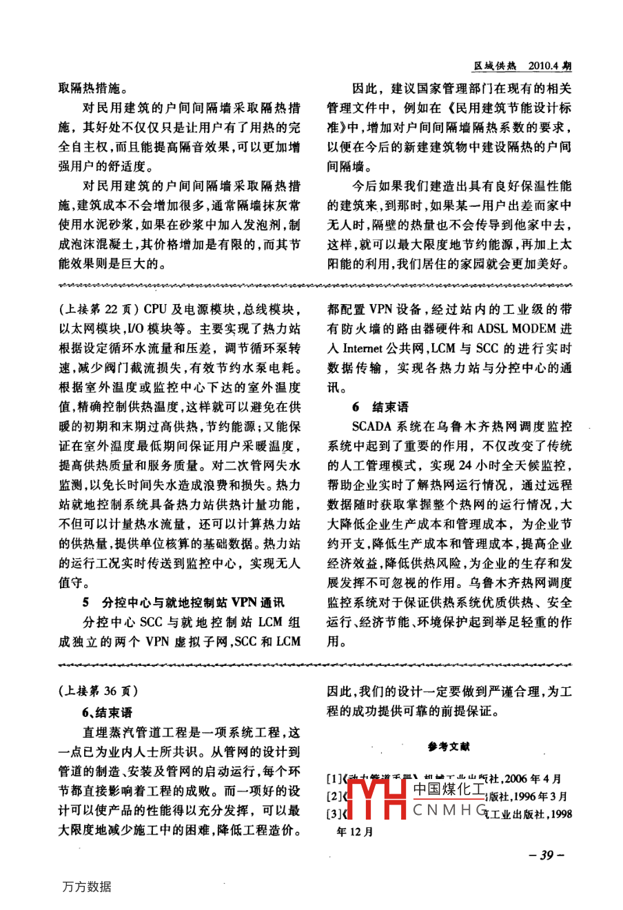 區(qū)域供熱20104期計量供熱對節(jié)能建筑的要求唐山市熱力總公司陳茉【摘要】本文說明了計量供熱的價格構成方法及其原因,并提出了計量供熱對節(jié)能建筑要求的建議?!娟P鍵詞】計量供熱價格構成節(jié)能建筑建議按用熱量計量收費勢在必行溫度偏高,底層溫度偏低的現(xiàn)象,這樣就形成新中國成立以后,由于長江以北氣候比了底層用戶室內溫度達到16℃合格標準時,江南寒冷,且國家在全國實行統(tǒng)一的工資制頂層用戶的室內供暖溫度高達20℃以上,有度,因此國家對長江以北的城鎮(zhèn)職工給以冬的甚至達到25℃,由于用戶不能自行調節(jié)室季取暖費補貼。當時城鎮(zhèn)居民的住房基本是內溫度,因此導致高層用戶不得不打開窗戶平房,住室內沒有集中供暖的設施,因此城鎮(zhèn)降溫,這樣就造成了能源的極大浪費居民的取暖費主要用于買煤,以小火爐或土2、單管串聯(lián)的供暖方式不能滿足不同用炕的形式取暖,以度過寒冷的冬季。戶的不同需求。有的老年用戶、有病人的用改革開放以后,城鎮(zhèn)居民的居住條件有戶,以及家有兒童的用戶需要室內溫度高一了很大的改善,居民樓建筑增多,而且有相當些;有的用戶出差或外出探親,需要室內溫度數(shù)量的樓房安裝了集中供暖設施,當時由于低一些;有的常年在外地居住、或暫時不住的國家財力的條件所限,安裝供暖設施遵照勤用戶有希望停熱的要求,等等,而單管串聯(lián)的儉節(jié)約、少花錢多辦事的原則,因此絕大多數(shù)供熱方式卻無法滿足用戶的這些合理要求,樓房的供暖設施都是按照單管串聯(lián)的方式建只能按單一的供暖溫度為各種不同溫度需求設這種安裝方式的特點是既節(jié)約資金,又能的用戶甚至不用熱的用戶供熱,這種做法頗迅速為廣大城鎮(zhèn)居民供暖。城鎮(zhèn)普通百姓破有一些強買強賣的味道。天荒地第一次用上了暖氣,告別了幾千年靠由于單管串聯(lián)供暖方式的弊端逐漸顯燃火取暖的歷史,這一進步體現(xiàn)了社會主義現(xiàn),一種新型的按照用熱量供暖的方式呼之的優(yōu)越性欲出,按照不同用戶的不同需求供暖,讓用戶隨著人民生活水平的不斷提高,單管串有用熱和不用熱、多用熱和少用熱的權利,這聯(lián)的大鍋飯式的供暖方式越來越不能滿足人既體現(xiàn)了供熱的人性化管理,也能夠節(jié)約大們的要求,其弊端主要表現(xiàn)在以下幾個方面:量的能源,于國于民都是非常有益的1、供暖系統(tǒng)缺乏有效的調節(jié)手段,導致中國煤化工價格的構成能源的極大浪費。由于采用的是單管串聯(lián)的CNMH聽的供暖形式的供暖方式,因此往往造成樓房高層室內供暖必然要求,但要實現(xiàn)這一目的,卻仍然有一些37區(qū)域供熱2010.4期問題需要解決。市區(qū)計量供熱價格的通知》中具體規(guī)定為首先是現(xiàn)有的供暖系統(tǒng)必須進行改造居民用熱價格,基本熱價975元m2(建即由單管串聯(lián)的供暖方式改為雙管并聯(lián)的供筑面積);計量熱價0.11元/kWh。暖方式,其次需要在用戶端安裝熱計量表,而這一價格構成充分考慮了用戶自用熱和解決這些問題只是解決了“硬件”建設問題,戶間傳熱的兩大因素,其中基本熱價x供熱面同時還需要解決“軟件”問題,即還需要解決積考慮的是戶間傳熱的用熱量,而計量熱價x如何確定供熱價格問題。按照目前的住宅建用熱量則考慮的是用戶自用熱量。采用這種設狀況,我們還不能簡單按照熱計量表的讀熱價方式同以前的“大鍋飯”式的供熱方式相數(shù)收取熱費。比,無疑是一個巨大的進步,在一定幅度內,不能簡單按照熱計量表讀數(shù)收費的原因滿足了用戶自由用熱的要求很簡單,因為用熱建筑戶間傳熱的問題尚未三、完善的供熱計量價格取決于建筑物得到解決。的隔熱質量理想的按照熱計量表讀數(shù)收費的建筑應顯而易見,現(xiàn)行的供熱計量收費方式是當是用戶之間的間隔墻以及房間地板、頂板符合現(xiàn)有的建筑物的隔熱現(xiàn)狀的,但是我們有良好的隔熱性能,這樣才能保證某一熱用明顯可以看出,在這種供熱收費方式中還存戶熱計量表讀數(shù)顯示的用熱量都被該用戶使在“大鍋飯”供熱的成分,以某戶建筑面積為用了,而不是傳導到別的用戶,即傳導到隔壁167.7平米用戶的供熱交費情況看,其一個或樓上、樓下的用戶家中去了。而現(xiàn)在的建筑采暖季所交納的熱費為397601元,其中基本卻無法滿足這一要求。目前一些新建筑是按熱費為975×16777=163575元,占總熱費的照建設部關于節(jié)能建筑的要求建造的,但也41%,這個比例還是相當大的。只在建筑的外圍結構和頂板采取了保溫的措而要解決這一問題,最根本的辦法是把施,而用戶之間的隔墻卻沒有采取相應的隔戶間傳熱的問題徹底解決掉。熱措施,這就是說,即使是新建的節(jié)能建筑,四、計量供熱對節(jié)能建筑的要求和建議也存在戶間傳熱的問題。從目前國家對節(jié)能建筑的強制性規(guī)范要這樣在確定熱費價格時,就不能只考慮求來看,文件中對民用建筑的圍護結構即外單一的按照熱計量表讀數(shù)收費,還必須考慮墻、屋頂、門窗等的傳熱系數(shù)都做出了嚴格的到有一部分熱量通過隔墻或頂板傳到鄰居家要求(見《民用建筑節(jié)能設計標準》),但文件去了,也就是有一部分熱量被“公用”了。在確中并未對戶間間