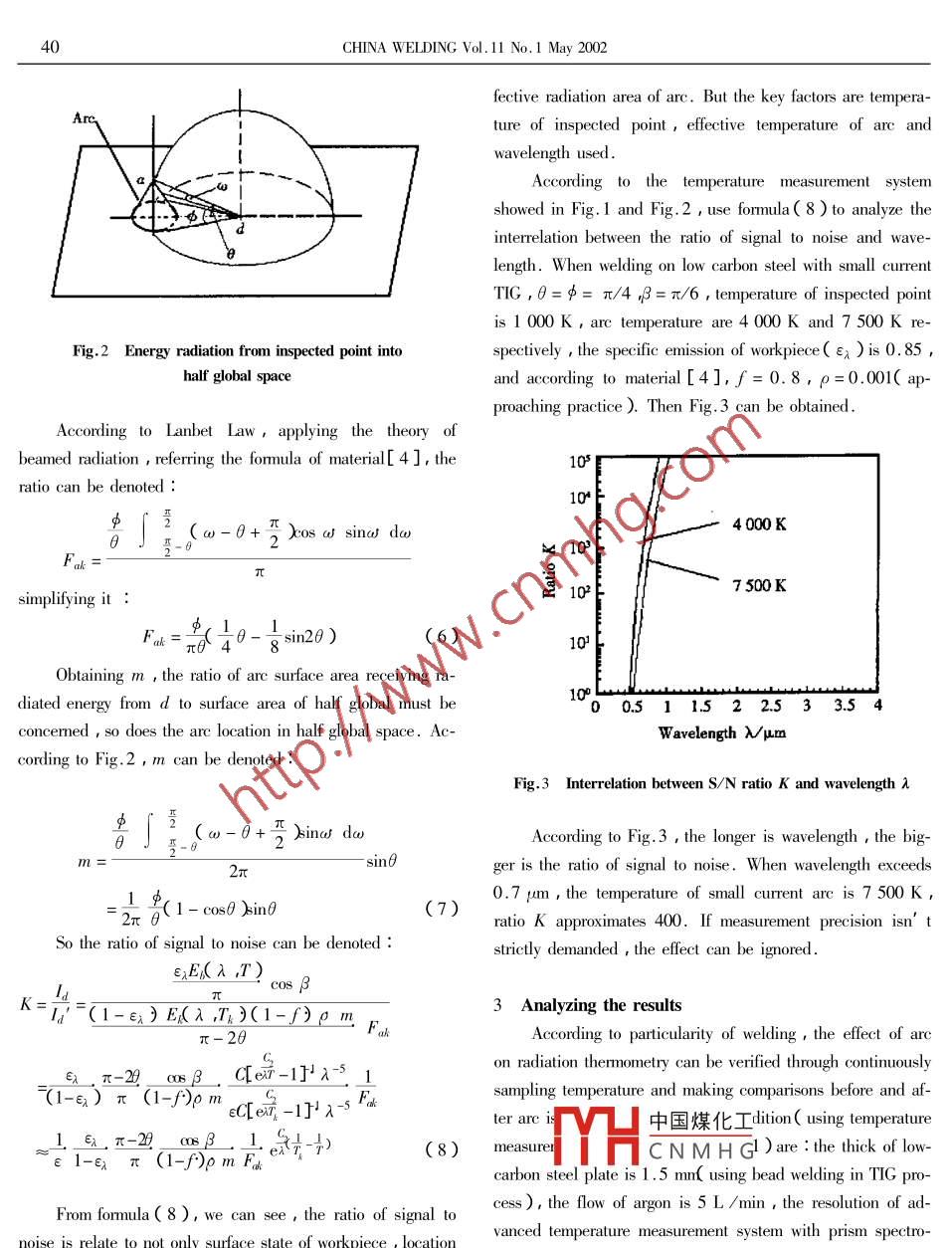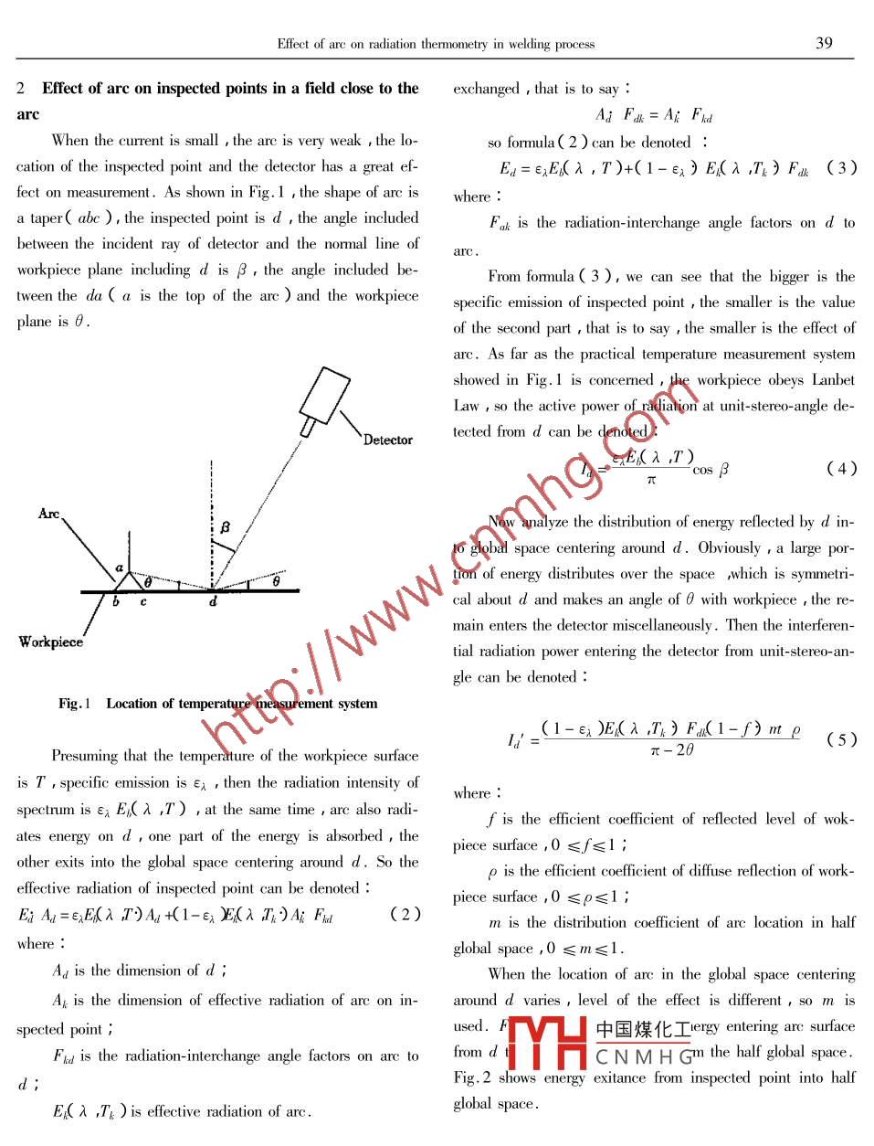 38CHINA WELDING Vol.11 No.1 May 2002Effect of arc on radiation thermometry in welding processLi Liangyu,Wangyan and Wu Baolin李亮玉王燕武寶林AbstractThe efecet of arc on radiation thermometry is analyzed in a field close to the arc during the uelding process , and the ratioof signal to noise and other factors are obtained for a small current arc . The method of the temperature measurement is feasible whenthe are current is decreased to a smallr value in the rvelding process .Key words arc , radiation , thermometry0 Introduction1 The features of radiation of small current arcThe information obtained from the top temperature fieldIn fact , the radiation intensity of arc is composed of twoplays an important role in quality control during welding pro-parts : the spectrum intensity and continuous spectrum inten-cess. The method of radiation thermometry is mainly used duesity. When the current is small , the radiation of arc is closeto the particularity of top temperature field. But this methodto the complete line spectrum and band spectrum ,and be-is affected by many factors ,of which , the effect of arc is thetween them there is a big gap ,that is to say , spectrum inten-most serious and difficult to overcome because of the intensesity is very small ,the continuous spectrum intensity almostradiation and wide spectrum. At present , the main steps toapproximates zero and the temperature of arc is low. So theovercome it are as follows :radiated energy of arc is smaller than that of blackbody at the( 1 ) Utilizing long wavelength in radiation thermometry.same temperature. When the current increases , the electronicAs shown in material[ 1 ], the radiation intensity of arc ap-continuous spectrum will be generated and the line spectrumproximate zero when the wavelength exceeds4 pum. So we canwill expand due to the Doppler Effect and the Compton Ef-obtain the information of the temperature field by thermometryfect. As a result , the gap will reduce , viewing the arc as ausing monochromatic infrared rays( 8~ 12 pum ) generated bywhole , the radiation distribution is similar to the blackbodycut-off filter. But the devices of test and measurement are ex-s. This is the reason why the effect of arc is very intensepensive.when the curent is big. As shown in material[ 2 ] , when the(2) Putting out arc instantly. As shown in materialcurrent is small and temperature is below 7 500 K , the radia-[2],we can detect the top temperature field by tuming offtion intensity of arc can be approximately denoted :the power , but this will affct the stability of welding pro-E(λ ,T:)=eC{(ex.-1)-5(1)cess , and the devices are strictly demanded.( 3 ) Small current for instant. We can reduce the radia-λ is the wavelength ;tion intensity of arc by greatly decreasing the current instant-C1 and C2 are the first plank constant and the secondly. At present , this method is mainly used in vision imagedisposal and single point measurement 31plank constant respectively ;The third method is easy to carry out using moderm de-Tk is the, temnerature of arc :vices ,so this paper aims to analyze the effect of arc on radia-中國(guó)煤化工。rface( ε≈0.001 ).YHCNMHGtion thermometry.u萬(wàn)友數(shù)據(jù)Yan and Wu Baolin ,Tanjin Polytechnic University , Tianjin , 300160 E-mail : liangu 2001 @ yahoo. comEfect of arc on radiation thermometry in welding process392 Effect of arc on inspected points in a field close to theexchanged , that is to say :arcAj Fauk=Ai FldWhen the current is small , the are is very weak , the lo-so formula( 2 ) can be denoted :cation of the inspected point and the detector has a great ef-Ea=exE(λ ,T)+(1-ε;) E(λ ,T。) Fa (3)fect on measurement. As shown in Fig.1 ,the shape of are iswhere :a taper( abc ) , the inspected point is d , the angle includedFak is the radiation-interchange angle factors on d tobetween the incident ray of detector and the normnal line ofworkpiece plane including d is β , the angle included be-From formula( 3 ), we can see that the bigger is thetween the da( a is the top of the arc ) and the workpiecespecific enmission of inspected point , the smaller is the valueplane is θ.of the second part , that is to say , the smaller is the effect ofarc. As far as the practical temperature measurement systemshowed in Fig.1 is concerned , the workpiece obeys LanbetLaw , so the active power of radiation at unit-stereo-angle de-tected from d can be denoted :~ DetectorεxE(λ ,T)ld=π'cos β(4)Arc.Now analyze the distribution of energy rllected by d in-to global space centering around d. Obviously ,a large por-tion of energy distributes over the space ,which is symmetri-bCdcal about d and makes an angle of θ with workpiece , the re-main enters the detector miscellaneously. Then the interferen-Workpiece'tial radiation power entering the detector from unit-stereo- an-gle can be denoted :Fig.1 Location of temperature measurement system(1-ελ )E(λ T) Fu(1-f)m ρ(5)π-20Presuming that the temperature of the workpiece surfaceis T ,specific emission is ελ , then the radiation intensity ofspectrum is ελ E6( λ ,T) ,at the same time , arc also radi-f is the fficient cofficient of rflcted level of wok-ates energy on d , one part of the energy is absorbed , thepiece surface ,0≤f≤1 ;other exits into the global space centering around d. So theρ is the efficient coefficient of diffuse reflection of work-effective radiation of inspected point can be denoted :piece surface ,0≤ρ≤1 ;Eix Au=e;EKλ ,T)Aa+(1-εx E(λ T:)Ai Fa(2)m is the distribution cofficient of are location in halfglobal space ,0≤m≤l.Ad is the dimensionof d ;When the location of are in the global space centeringAk is the dimension of effective radiation of arc on in-around d varies ,level of the effect is different,so m isspected point ;used中國(guó)煤化Tergy entering are surfaceFad is the radiation- interchange angle factors on arc tofrom dMHC N M H Gm the half global space.d;Fig.2 shows energy exitance