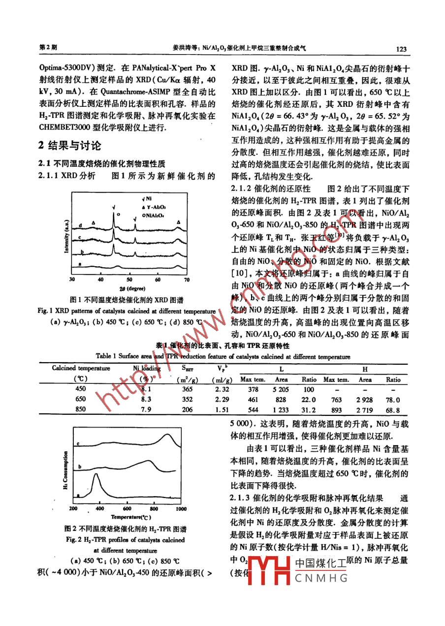 第21卷第2期VoL 21. No. 22007年4月JOURNAL OF MOLECULAR CATALYSIS( CHINA)Apr.2007文章端號(hào):100135552007)02012206Ni/Al2O3催化劑上甲烷三重整制合成氣姜洪濤2,李會(huì)泉1”,張懿(1.中國(guó)科學(xué)院過(guò)程工程研究所綠色過(guò)程與工程實(shí)驗(yàn)室,北京10002.中國(guó)科學(xué)院研究生院北京100049)摘要:制備了負(fù)載于大孔容、高比表面的yA2O3載體上的N基催化劑.采用固定床流動(dòng)反應(yīng)裝置,考察了催化劑焙燒溫度、反應(yīng)條件(反應(yīng)溫度、壓力、空速以及反應(yīng)原料氣組成)對(duì)甲烷三重整反應(yīng)(TRM)制合成氣的催化性能的影響.結(jié)果表明,650℃焙燒的催化劑具有較好的穩(wěn)定性在常壓、850℃、10080h、n(CH)/n(CO2)′n(H12O)/n(O2)=1/0.48/0.54/0.1的條件下,CH轉(zhuǎn)化率達(dá)到954%,CO2轉(zhuǎn)化率達(dá)到84.6%,在此條件下連續(xù)運(yùn)行9h未見活性下降.TRM反應(yīng)適宜于在高溫、低壓下進(jìn)行,原料組成的變化不會(huì)影響CH轉(zhuǎn)化率,但會(huì)影響cO2轉(zhuǎn)化率和產(chǎn)物合成氣的n(H2)/m(co)比關(guān)鍵詞:甲烷;三重整;合成氣;NA2O3催化劑中國(guó)分類號(hào):T64;0643.32文獻(xiàn)標(biāo)識(shí)碼:A甲烷三重整反應(yīng)是指二氧化碳重整甲烷響以及溫度、壓力、空速、原料組成等反應(yīng)條件對(duì)(CDR)、水蒸汽重整甲烷(SRM)和甲烷部分氧化催化劑性能的影響(POM)三個(gè)反應(yīng)在同一個(gè)反應(yīng)器內(nèi)耦合進(jìn)行的反應(yīng),即同步利用三個(gè)反應(yīng)來(lái)制合成氣的反應(yīng).熱1實(shí)驗(yàn)部分力學(xué)分析表明,通過(guò)甲烷三重整反應(yīng)可以生產(chǎn)n1.1催化劑制備(H2)m(Co)比為10~2.0之間的合成氣,適合于在前期工作中”,我們采用H12O2沉淀鋁酸下游化工利用.甲烷三重整反應(yīng)與單獨(dú)的CDR、鈉溶液法制備了大孔容、高比表面積yAL2O3本SRM和POM反應(yīng)相比12-4,具有很大程度的優(yōu)勢(shì),文釆用所獲的yA2O3為載體,制備了N/A2O3催如可以實(shí)現(xiàn)反應(yīng)部分自供熱,緩解過(guò)程積炭等.三化劑.將制備好的載體在一定濃度的硝酸鎳溶液中重整反應(yīng)中用于重整CH4的原料中同時(shí)含有CO2、浸漬后,110℃干燥12h,一定的溫度下焙燒4h即O2和H2O這三種組分,因此,利用三重整反應(yīng),可可制得NAL2O3催化劑以使含CO2廢氣中的CO2不經(jīng)分離而直接原位利1.2催化劑評(píng)價(jià)用.如化石燃料電廠中的煙氣同時(shí)含有CO2、O2和催化劑活性考察在固定床流動(dòng)反應(yīng)裝置上進(jìn)水蒸汽這三種成分,如果以電廠煙氣和天然氣為原行.采用不銹鋼反應(yīng)器(內(nèi)徑10mm),催化劑裝量料,通過(guò)甲烷三重整反應(yīng)制合成氣,則既可以利用為1g.催化劑在常壓、H2Ar混合氣流中程序升溫?zé)煔獾挠酂?又可以將煙氣中的二氧化碳不經(jīng)分離還原后,用Ar吹掃10mn,然后引人一定配比的原而直接加以利用,從而實(shí)現(xiàn)二氧化碳的減排與利用料氣在指定條件下進(jìn)行反應(yīng).原料水經(jīng)平流泵計(jì)量有機(jī)的結(jié)合在一起5.再如,煤層氣中含有一定的后直接進(jìn)入反應(yīng)器,在反應(yīng)器石英砂段充分汽化CO2,如果輔以空氣和少量水蒸汽,利用三重整反反應(yīng)尾氣經(jīng)冷凝除水后,用 SHIMADZU-CC4B氣應(yīng)制合成氣,則可以使煤礦瓦斯得以有效利用°.相色譜儀在線分析,Ar作載氣,色譜柱為TDX01我們以大孔容、高比表面yAl2O3為載體,采碳分子篩,柱長(zhǎng)2.5m,柱溫85℃,熱導(dǎo)檢測(cè)用浸漬法制備了N/A2O3催化劑,并對(duì)其催化性能13催化劑的表征進(jìn)行了評(píng)價(jià),考察了焙燒溫度對(duì)催化劑穩(wěn)定性的影催化劑中Ni含量采用 ICP-OES( PerkinElmer收稿日期:2006-10-19;修回日期:200701-17基金項(xiàng)目:國(guó)家自然科學(xué)基金重點(diǎn)項(xiàng)目(20436050)資助項(xiàng)目作者簡(jiǎn)介:姜洪濤,男,生于1976年E-mail: hqli@ home. ipe ac en.中國(guó)煤化工CNMHG第2期姜洪濤等:NAl2O3催化劑上甲烷三重整制合成氣123Optima53000V)測(cè)定.在 PANalytical-X'pert Pro X XRD圖.yAl2O3、N和NiA12O尖晶石的衍射峰十射線行射儀上測(cè)定樣品的XRD(cu/Kα輻射,40分接近,以至于彼此之間相互重疊,因此,很難從kV,30mA).在 Quantachrome-ASIMP型全自動(dòng)比XRD圖上加以區(qū)分.由圖1可以看出,650℃以上表面分析儀上測(cè)定樣品的比表面積和孔容.樣品的焙燒的催化劑經(jīng)還原后,其XRD衍射峰中含有H2TPR圖譜測(cè)定和化學(xué)吸附、脈沖再氧化實(shí)驗(yàn)在NiA12O4(20=66.43°為yAl2O3,20=65.52°為CHEMBE3000型化學(xué)吸附儀上進(jìn)行NiA12O4)尖晶石的衍射峰.這是金屬與載體的強(qiáng)相2結(jié)果與討論互作用造成的,這種強(qiáng)相互作用有助于提高金屬的分散度,但相互作用越強(qiáng),催化劑越難還原,同時(shí)2.1不同溫度焙燒的催化劑物理性質(zhì)過(guò)高的焙燒溫度還會(huì)引起催化劑的燒結(jié),使比表面2.1.1XRD分析圖1所示為新鮮催化劑的降低,孔結(jié)構(gòu)發(fā)生變化2.1.2催化劑的還原性圖2給出了不同溫度下N焙燒的催化劑的H2TPR圖譜,表1列出了催化劑A Y-AhOyONIAL:O的還原峰面積由圖2及表1可以看出,NiO/Al203650和No/Al2O3850的H2TPR圖譜中出現(xiàn)兩個(gè)還原峰T和T張玉紅等將負(fù)載于yAl2O2上的N基催化劑中No的狀態(tài)歸屬于三種類型自由的NO、分散的NO和固定的NO.根據(jù)文獻(xiàn)[10],本文將還原峰歸屬于