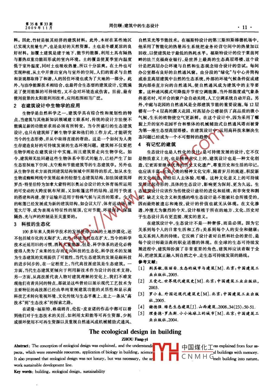 山西建筑Vol.35 No. 33Nov.200910●SHANXI ARCHITECTURE文章編號:1009-68252009)33-0010-02建筑中的生態(tài)設(shè)計周仿頤摘要:闡述了生態(tài)設(shè)計的概念 ,并從可再生資源、建筑中生物學(xué)的應(yīng)用、科技的生態(tài)化及有記憶的建筑這四個方面說明了對建筑中的生態(tài)設(shè)計這一問題的理解,并提出了生態(tài)設(shè)計不是一種奢侈,而是必須,建筑師應(yīng)該著眼于全局,把建筑真正融入到自然之中,走生態(tài)可持續(xù)發(fā)展的路線。關(guān)鍵詞:建筑,生態(tài)設(shè)計,可持續(xù)中圖分類號:TU-021.文獻標(biāo)識碼:A生態(tài)學(xué)引起社會的普遍關(guān)注是在20世紀(jì)后期,生態(tài)、環(huán)境和師追尋的方向。談到建筑中的生態(tài)設(shè)計這-問題,可以從以下幾可持續(xù)發(fā)展已成為21世紀(jì)設(shè)計師面臨的最迫切的研究課題。在個方面來理解。1957年,當(dāng)人類的第-顆人造衛(wèi)星被發(fā)射進人軌道,衛(wèi)星就提供1可再生資源了一個供我們觀察自己的全新角度,同時,這也是一種全新的全未來的建筑發(fā)展不僅僅要考慮建筑物實體的耐久性,同時也球意識的信號,從外太空同眸,地球大氣層的美是令人心動、令人要考慮我們的星球本身及其能源的耐久性。 在這種情況下,生態(tài)震撼的,但同時,它的脆弱也是顯而易見的,環(huán)境污染的痕跡,森的建筑設(shè)計將是基于對一-種能 更有效地利用材料和能源,而不是林毀滅的外傷,工業(yè)化的疤痕以及城市的蔓延,這一切都證明了揮衢或忽視資源問題的引人,應(yīng)是向多樣化、靈活可變性方向發(fā)在對財富追求的過程中,我們正在掠奪生命支撐體系的每-方展,以最少的材料消耗,高度靈活的可再生建筑材料取代那些高面在建筑設(shè)計的發(fā)展中更是如此,一方面,運用各種建筑材料、價和耐久的材料。在2000年漢諾威世界博覽會上,自然成為建各種設(shè)計手法,在創(chuàng)造舒適的人I環(huán)境方面做出了很大貢獻,在筑師展現(xiàn)設(shè)計的場所,日本展廳是“零廢料”生態(tài)設(shè)計概念的體人類的建筑史上是-次巨大的進步。另- -方面,這一進步是以地現(xiàn),展廳內(nèi)部是用廢紙制作的空心紙網(wǎng)絡(luò)組成的拱形大空間,外球資源與能源的高消耗為代價的,它對地球生態(tài)環(huán)境的破壞與日部覆以白色的模面表層。這座建筑空間的支撐骨架是用廢紙制俱增。于是,如何保護人類賴以生存的環(huán)境,維持生態(tài)系統(tǒng)的平作的空心紙網(wǎng)絡(luò),當(dāng)博覽會結(jié)束之后,這些材料仍可回收再利用,同時,承重的基礎(chǔ)采用鋼構(gòu)架,以使不可同收的混凝土減至最少。衡,便成為全球關(guān)注的現(xiàn)實問題,也成為現(xiàn)代設(shè)計師的責(zé)任。另外,在建筑材料的選擇上,加大了對原生材料的使用,如竹、木任何與生態(tài)過程相協(xié)調(diào),盡量使其對環(huán)境的破壞影響達到最和泥 土都可以回復(fù)到大自然中而不污染環(huán)境,鋼材和玻璃則可回小的設(shè)計形式都可以稱為生態(tài)設(shè)計,在建筑設(shè)計中,由于生物氣收再循環(huán)使用。竹材生長迅速,易于制作、運輸及貯存。其最重候?qū)W和可持續(xù)發(fā)展的引人,使得生態(tài)設(shè)計在建筑中的運用變得越要的特點是有圓的形狀、重量輕、有光潔的表面,在制作過程中不來越重要,自20世紀(jì)70年代的能源危機以來,以節(jié)約能源,資產(chǎn)生任何廢料,甚至少量的枝條也能利用,葉子也可作為動物的飼源,減少污染為核心內(nèi)容的可持續(xù)發(fā)展的設(shè)計理念逐漸成為建筑4結(jié)語[2] 白德懋.城市空間環(huán)境設(shè)計[M].北京:中國建筑工業(yè)出版對于數(shù)量與類型眾多的歷史文化名城,單一的保護對策無法社,2002.滿足各名城的需要。通過對洛陽城市保護的個案研究,以洛陽的[3] 陳志華.保護文物建筑及歷史地段的國際憲章[J].世界建地域文化為基礎(chǔ),以城市文化生態(tài)學(xué)為著眼點,通過城市文化學(xué)、筑,1986(3):13-14.城市社會學(xué)、城市美學(xué)等相關(guān)學(xué)科以及城市建設(shè)史、城市規(guī)劃設(shè)[4] 劉武君.英國街區(qū)保護制度的建立與發(fā)展[J].國外城市規(guī)計等專業(yè)領(lǐng)域的支撐,來研究城市文化結(jié)構(gòu)組成、相互關(guān)系與演劃, 1995(1):22-26.變規(guī)律,探索生態(tài)原理的文化生態(tài)表征,希望能對我國歷史文化5] 田銀生,劉韶軍.建筑設(shè)計與城市空間[M].天津:天津大學(xué)名城的保護起到指導(dǎo)與借鑒作用。出版社, 1999. .參考文獻: .[6] 吳良鏞,方 可,張 悅.從城市文化發(fā)展的角度,用城市設(shè)[1] 劉濱誼.現(xiàn)代景觀規(guī)劃設(shè)計[M].南京:東南大學(xué)出版社,計的手段看歷史文化地段的保護與發(fā)展[J].華中建筑,1999.1998(3):84-89.The applied practice research of urban cultural ecology protectionQIAO Feng JIA Ting-yuAbstract: The comparing, generalizing and deducing methods were adopted in the paper, the research was set in detail large background ofLuoyang, with geographical culture of Luoyang as started point, and cultural中國煤化工as goal, which was imple-mented to detail creation principle and method, looked for its development rulbtained.:YHCNMHGKey words: cultural cology, geographical culture, applied practice收稿日期:2009-06-09作者簡介:周仿頤(1983- ),男,四川美
