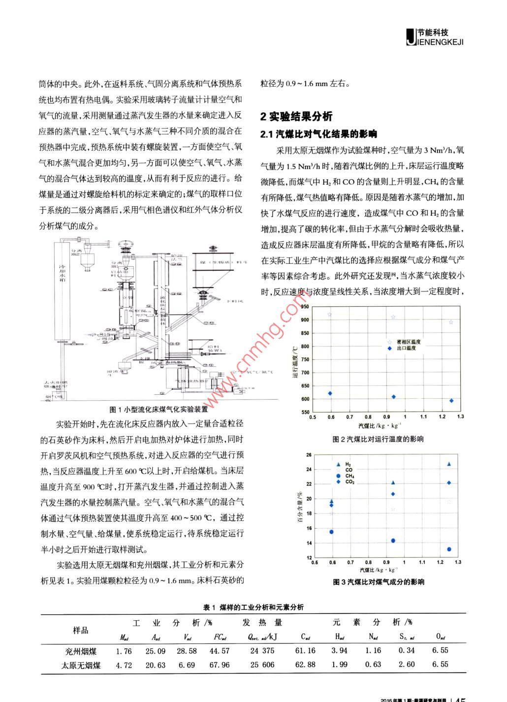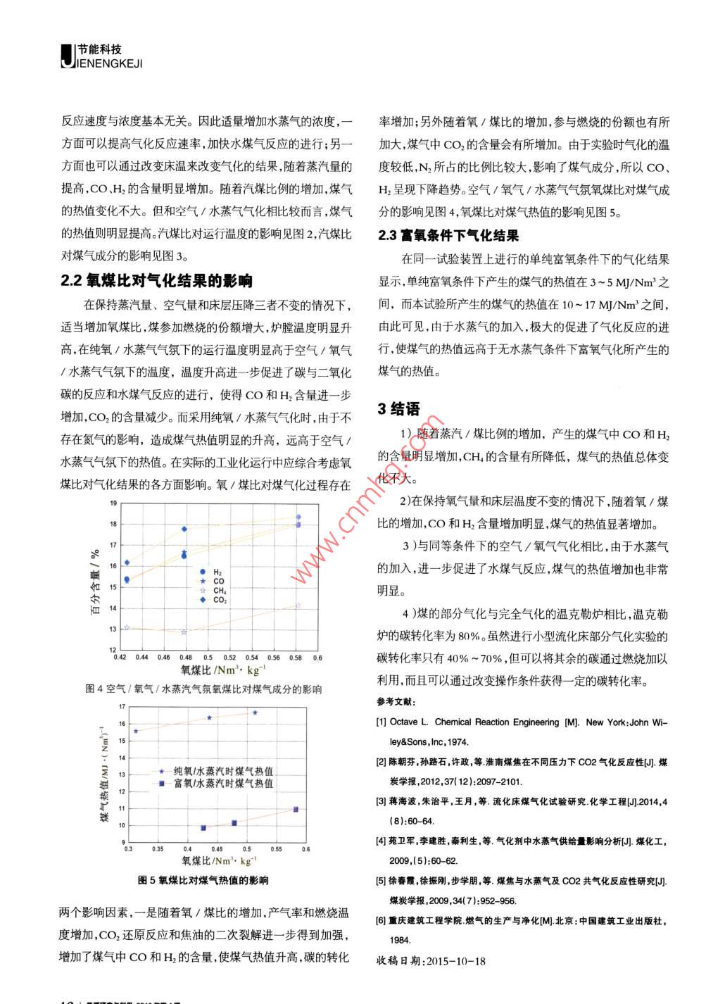 |節(jié)能科技, IENENGKEJI簡(jiǎn)體的中央。此外,在返料系統(tǒng)、氣固分離系統(tǒng)和氣體預(yù)熱系粒徑為0.9~ 1.6 mm左右。統(tǒng)也均布置有熱電偶。實(shí)驗(yàn)采用玻璃轉(zhuǎn)子流量計(jì)計(jì)量空氣和氧氣的流量,采用測(cè)量通過(guò)蒸汽發(fā)生器的水量來(lái)確定進(jìn)入反2實(shí)驗(yàn)結(jié)果分析應(yīng)器的蒸汽量.空氣、氧氣與水蒸氣三種不同介質(zhì)的混合在2.1汽煤比對(duì)氣化結(jié)果的影響預(yù)熱器中完成,預(yù)熱系統(tǒng)中裝有螺旋裝置,-方面使空氣、氧采用太原無(wú)煙煤作為試驗(yàn)煤種時(shí),空氣量為3 Nm/h,氧氣和水蒸氣混合更加均勻,另-方面可以使空氣、氧氣、水蒸氣量為1.5 Nm/h時(shí),隨著汽煤比例的上升,床層運(yùn)行溫度略氣的混合氣體達(dá)到較高的溫度,從而有利于反應(yīng)的進(jìn)行。給微降低,而煤氣中H2和Co的含量則上升明顯,CH4的含量煤量是通過(guò)對(duì)螺旋給料機(jī)的標(biāo)定來(lái)確定的;煤氣的取樣口位有所降低,煤氣熱值略有降低。原因是隨著水蒸氣的增加,加于系統(tǒng)的二級(jí)分離器后,采用氣相色譜儀和紅外氣體分析儀快了水煤氣反應(yīng)的進(jìn)行速度,造成煤氣中cO和H2的含量分析煤氣的成分。增加,提高了碳的轉(zhuǎn)化率,但由于水蒸氣分解時(shí)會(huì)吸收熱量,造成反應(yīng)器床層溫度有所降低,甲烷的含量略有降低,所以ao 蝴“中物間。14在實(shí)際工業(yè)生產(chǎn)中汽煤比的選擇應(yīng)根據(jù)煤氣成分和煤氣產(chǎn)果率等因素綜合考慮。此外研究還發(fā)現(xiàn)心,當(dāng)水蒸氣濃度較小時(shí),反應(yīng)速度與濃度呈線(xiàn)性關(guān)系,當(dāng)濃度增大到- -定程度時(shí),95902e85密相區(qū)溫度, 800, 出口溫度750日700. *-◆60圖1小型流化床煤氣化實(shí)驗(yàn)裝置1.1 1.2 1.3實(shí)驗(yàn)開(kāi)始時(shí),先在流化床反應(yīng)器內(nèi)放入- -定量合適粒徑汽煤比/kg.kg"的石英砂作為床料,然后開(kāi)啟電加熱對(duì)爐體進(jìn)行加熱,同時(shí)圖2汽煤比對(duì)運(yùn)行溫度的影響開(kāi)啟羅茨風(fēng)機(jī)和空氣預(yù)熱系統(tǒng),對(duì)進(jìn)入反應(yīng)器的空氣進(jìn)行預(yù)26 r熱,當(dāng)反應(yīng)器溫度上升至600 C以上時(shí),開(kāi)啟給煤機(jī)。當(dāng)床層24 t●CH溫度升高至900 C時(shí),打開(kāi)蒸汽發(fā)生器,并通過(guò)控制進(jìn)入蒸22一汽發(fā)生器的水量控制蒸汽量。空氣、氧氣和水蒸氣的混合氣體通過(guò)氣體預(yù)熱裝置使其溫度升高至400~ 500 C,通過(guò)控制水量、空氣量、給煤量,使系統(tǒng)穩(wěn)定運(yùn)行,待系統(tǒng)穩(wěn)定運(yùn)行半小時(shí)之后開(kāi)始進(jìn)行取樣測(cè)試。實(shí)驗(yàn)選用太原無(wú)煙煤和兗州煙煤,其工業(yè)分析和元素分汽煤比/kg . kg析見(jiàn)表1。實(shí)驗(yàn)用煤顆粒粒徑為0.9~ 1.6 mm。床料石英砂的圖3汽煤比對(duì)煤氣成分的影響表1煤樣的工業(yè)分析和元素分析I業(yè)分析/%發(fā)熱量元素分析/%樣品MsAsVuQo AkJC.NadS,as兗州煙煤1.76 25.09 28.58 44.5724 37561. 16.941. 160.34:6.55太原無(wú)煙煤: 4.72 20.63 6.69 67. 9625 60662. 881.990.63.2.606. 551 |節(jié)能科技IENENGKEJI反應(yīng)速度與濃度基本無(wú)關(guān)。因此適量增加水蒸氣的濃度,一率 增加;另外隨著氧/煤比的增加,參與燃燒的份額也有所方面可以提高氣化反應(yīng)速率,加快水煤氣反應(yīng)的進(jìn)行;另一加大, 煤氣中CO,的含量會(huì)有所增加。由于實(shí)驗(yàn)時(shí)氣化的溫方面也可以通過(guò)改變床溫來(lái)改變氣化的結(jié)果,隨著蒸汽量的度較低,N2所占的比例比較大,影響了煤氣成分,所以CO、提高,CO、H2的含量明顯增加。隨著汽煤比例的增加,煤氣H2呈現(xiàn)下降趨勢(shì)??諝?氧氣/水蒸氣氣氛氧煤比對(duì)煤氣成的熱值變化不大。但和空氣/水蒸氣氣化相比較而言,煤氣分的影響見(jiàn)圖4,氧煤比對(duì)煤氣熱值的影響見(jiàn)圖5。的熱值則明顯提高。汽煤比對(duì)運(yùn)行溫度的影響見(jiàn)圖2,汽煤比2.3富氧條件下氣化結(jié)果對(duì)煤氣成分的影響見(jiàn)圖3。在同一試驗(yàn)裝置上進(jìn)行的單純富氧條件下的氣化結(jié)果2.2氧煤比對(duì)氣化結(jié)果的影響顯示,單純富氧條件下產(chǎn)生的煤氣的熱值在3~ 5 MJ/Nm'之在保持蒸汽量、空氣量和床層壓降三者不變的情況下,間,而本試驗(yàn)所產(chǎn)生的煤氣的熱值在10~ 17 MJ/Nm'之間,適當(dāng)增加氧煤比,煤參加燃燒的份額增大,爐膛溫度明顯升由此可見(jiàn),由于水蒸氣的加入,極大的促進(jìn)了氣化反應(yīng)的進(jìn)高,在純氧/水蒸氣氣氛下的運(yùn)行溫度明顯高于空氣/氧氣行,使煤氣的熱值遠(yuǎn)高于無(wú)水蒸氣條件下富氧氣化所產(chǎn)生的/水蒸氣氣氛下的溫度,溫度升高進(jìn)一步促進(jìn)了碳與二氧化煤氣的熱值。碳的反應(yīng)和水煤氣反應(yīng)的進(jìn)行,使得co和H2含量進(jìn)一-步增加,CO2的含量減少。而采用純氧/水蒸氣氣化時(shí),由于不3結(jié)語(yǔ)存在氮?dú)獾挠绊?,造成煤氣熱值明顯的升高,遠(yuǎn)高于空氣11)隨著蒸汽/煤比例的增加,產(chǎn)生的煤氣中Co和H2水蒸氣氣氛下的熱值。在實(shí)際的工業(yè)化運(yùn)行中應(yīng)綜合考慮氧的含量明顯增加,CH,的含量有所降低,煤氣的熱值總體變煤比對(duì)氣化結(jié)果的各方面影響。氧/煤