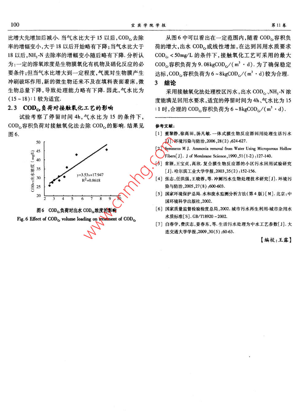 第11卷第6期宜賓學(xué)院學(xué)報(bào)2011年6月Vol.11. No.6Joumal of Yibin UniversityJune, 2011生物膜法處理校區(qū)污水周明羅(宜賓學(xué)院化學(xué)與化工學(xué)院,四川宜賓644007)摘要;利用兩種生物膜技術(shù)處理高校生活污水進(jìn)行了試驗(yàn)研究,結(jié)果表明,接觸氧化法優(yōu)于生物轉(zhuǎn)盤(pán)法;在停留時(shí)間為4h,接觸氧化法對(duì)CODa和NH, -N的去除率分別為78.5%和75.6% ,出水能達(dá)到《城市污水再生利用城市雜 用水水質(zhì)>(GB/T18920 - 2002)標(biāo)準(zhǔn);隨著氣水比的增大,CODcr、NH,-N的去除率先增大后減小,其適宜的氣水比為15: 1;出水COD。濃度隨CODc容積負(fù)荷的增大而升高,合理的CODc容積負(fù)荷為6 ~8kgCOD/(m3●.d).關(guān)鍵詞:中水回用;接觸氧化法;CODc;氨氟中國(guó)分類號(hào):X703文獻(xiàn)標(biāo)志碼:A文章編號(hào):1671-5365(2011 )06- 0098- 03The Treatment of Domestic Sewage on University Campus with Bio-film ProcessZHOU Ming-luo( School of Chemistry and Chemical Engeerning, Yibin University, Yibin 644007, China)Abstract: The experimental study on two bio-flm process for the treatment of domestic sewage on university campus was carriedout. The results show that bio-contact oxidation process is preferable to rotate biological contactor process. The removal ratio ofCODC,NH'-N by bio-contact oxidation process are 78. 5% and75. 6% under HRT = 4h, and the quality of the efluent watermeets the requirement of Water Quality Standard for Urban Miscellaneous Water Consumption ( GB/T18920 2002 ). The efficiencyof bio-contact oxidation process increases first and then reduces with the growth of the ratio of air to flow wastewater, and the suit-able portion is 15: 1. The effluent CODa concentration rises with the growth of COD. volume loading, the suitable COD volumeloading was 6 ~ 8kgCOD./(m2●d).Key words: reclaimed water reuse; bio contact oxidation process; CODG ; NH'-N前人對(duì)生活污水生物處理及回用進(jìn)行了較多研表1 主要水質(zhì)指標(biāo)/mg.L"究[1-4),由于生活水平、生活習(xí)慣的差異,污水水質(zhì)、濃度Table 1 Main infuent quality/ mg. L-1相差較大,處理工藝及技術(shù)參數(shù)很難統(tǒng)- -. 因此,對(duì)不同地項(xiàng)目CODaNH,-NsspH區(qū)、不同類型的生活污水,應(yīng)通過(guò)試驗(yàn)確定適宜的工藝及范圍240-2706. 5-8.8參數(shù),以提高污水處理效果和回用率.本文采用接觸氧化均值254. 838.4132.36.8和生物轉(zhuǎn)盤(pán)處理校區(qū)污水,進(jìn)行了比較研究和分析,為高1.2試驗(yàn)流程及裝置校生活污水回用的處理工藝選擇及運(yùn)行參數(shù)的確定提供接觸氧化法、生物轉(zhuǎn)盤(pán)法試驗(yàn)流程如圖1所示.污水參考,對(duì)實(shí)現(xiàn)校區(qū)生活污水的回用具有-定的實(shí)際意義.通過(guò)濾網(wǎng)初濾后進(jìn)人水箱,由泵分別輸送到接觸氧化池和1試驗(yàn)條件與方法生物轉(zhuǎn)盤(pán),經(jīng)生物氧化、沉淀后取樣分析.接觸氧化池直徑1.1 污水水質(zhì)試驗(yàn)用水為某學(xué)院二平臺(tái)學(xué)生宿舍區(qū)排放的生活污0.44m,總?cè)莘e0.20m' ,內(nèi)裝0. 12m’立體填料.生物轉(zhuǎn)盤(pán)水,主要來(lái)自廁所、浴室、盥洗間及洗衣間,主要水質(zhì)見(jiàn)表1.采用單軸三級(jí)串聯(lián),PVC盤(pán)片直徑0.46m、總面積11. 4m2 ,除pH、溫度為現(xiàn)場(chǎng)測(cè)量外,其余為實(shí)驗(yàn)室分析值,分析方廢水處理槽直徑0. 56m,容積0.12m'.法均采用國(guó)家標(biāo)準(zhǔn)方法51].收稿日期: 2011-03-03.修回: 2011-03-12作者簡(jiǎn)介:周明羅(1977-),男,四川宜賓人,講師 ,主要從事水污染控制的研究第6期周明羅:生物膜法處理校區(qū)污水99以后趨于穩(wěn)定;而生物轉(zhuǎn)盤(pán)法在停留時(shí)間5h以后趨于穩(wěn)取樣..取樣定,且處理率低于前者.10。三級(jí)生物轉(zhuǎn)盤(pán)由圖3可以看出,隨著停留時(shí)間的延長(zhǎng),接觸氧化法5. 11.堅(jiān)誠(chéng)沉淀池對(duì)NH,-N去除率由34.7%增加到4h時(shí)的75.6%,緩慢增污泥回流g&2回10.接觸氧化池加到最高的83. 0%后趨于穩(wěn)定;生物轉(zhuǎn)盤(pán)對(duì)NH-N去除12空壓機(jī)接觸氧化法工藝流程三級(jí)生物轉(zhuǎn)肚工藝流程率由30.2%增加到6h時(shí)的75.9%,緩慢增加到最高的圖1生物膜試驗(yàn)流程圖78.3%后趨于穩(wěn)定.Fig. 1 Flow chart of bio-film aystem比較分析可知,對(duì)NH3-N的去除接觸氧化法優(yōu)于生物1.3 分析方法與掛膜轉(zhuǎn)盤(pán).從出水濃度來(lái)看,當(dāng)水力停留時(shí)間為4h后,接觸氧COD。采用重鉻酸鉀法( GB11914 89)51 ,NH.,-N采用化法出水COD。、NH,-N分別為44. 67mg/L、9. 64mg/L,均納氏試劑光度法( GB7479-87)[5].能滿足城市雜用水標(biāo)準(zhǔn)要求[01.分析看出校區(qū)污水處理為掛膜采用接種污泥、自然進(jìn)水式,接種污泥取自某城中水選用接觸氧化工藝更優(yōu),從回用水水質(zhì)及經(jīng)濟(jì)角度考市污水處理廠CASS 池.培養(yǎng)初期定期更換污水,以保證微慮,水力停留時(shí)間為4 ~5h較為適宜,這與白春學(xué)(']I的研生物所需營(yíng)養(yǎng),其后進(jìn)行動(dòng)態(tài)運(yùn)行,并逐漸加大流量,待掛究結(jié)果相比更短.膜成功且處理效果穩(wěn)定后開(kāi)始試驗(yàn).2.2氣水比對(duì)接觸氧化工 藝的影響2結(jié)果與分析試驗(yàn)考察了氣水比(空氣體積流量/污水體積流量)對(duì)2.1 HRT 對(duì)處理效果的影響及比較接觸氧化工藝去除CODc及NH2-N的影響.調(diào)節(jié)進(jìn)水流量,控