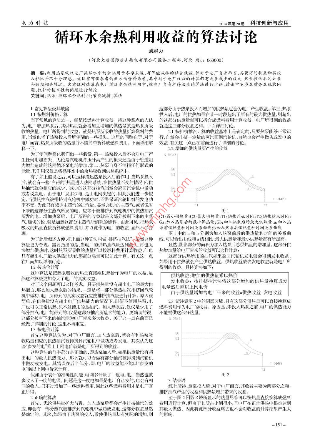 電力科技014年第20期|科技創(chuàng)新與應(yīng)用循環(huán)水余熱利用收益的算法討論姚群力(河北大唐國際唐山熱電有限公司設(shè)備工程部,河北唐山063000摘要:利用熱泵吸收電廠循環(huán)水中的余熱用于冬季采暖,有節(jié)能減排的社會(huì)效益,但對(duì)于電廠自身而言,其獲得的收益和其投入相比并不十分理想。就目前可供參考的此方面資料來看,其中對(duì)于電廠收益的計(jì)算都有或多或少的放大,熱泵投運(yùn)后的效果和預(yù)期相去較遠(yuǎn)。文章僅對(duì)熱泵在電廠循環(huán)水余熱利用中,就電廠自身所得收益的算法進(jìn)行討論、討論中不涉及財(cái)務(wù)及稅收問題,僅針對(duì)技術(shù)性的問題進(jìn)行討論。關(guān)鍵詞:熱泵;循環(huán)水余熱利用;節(jié)能減排;算法1常見算法極其缺陷這部分由于熱泵投入而增加的供熱量也會(huì)為電廠產(chǎn)生收益。第三,熱泵1.1按燃料價(jià)格計(jì)算投入后,電廠的供熱如果在某一時(shí)段超出了原有的最大供熱量,則超出當(dāng)下常見的算法之一,就是按燃料計(jì)算收益。持這種觀點(diǎn)的人認(rèn)的這部分供熱量就可以折合成燃料費(fèi)用計(jì)算收益。電廠所得到的收益為:電廠增加熱泵后,其供熱量就會(huì)增加且增加的供熱量就是熱泵所吸就是這三部分收益之和。下面詳細(xì)討論。收的熱量,電廠所得到的收益,就是熱泵所吸收的熱量折算燃料的費(fèi)21按排擠抽汽計(jì)算的收益基本上是確定的,只要熱泵能夠正常運(yùn)用,當(dāng)然也考了熱泵投入后所伴隨的一些損失。這里的問題在于,對(duì)于行,自然會(huì)排擠一定量的蒸汽回到汽輪機(jī),自然也會(huì)產(chǎn)生做功或發(fā)電的電廠而言,熱泵所吸收的熱量并不能簡(jiǎn)單折算成燃料費(fèi)用。下面詳細(xì)解效益,有關(guān)這一點(diǎn)已在前面進(jìn)行了詳細(xì)的討論。釋一下22增加的供熱量所產(chǎn)生的收益為了使問題簡(jiǎn)化我們做一些假設(shè),第一、熱泵投入后不會(huì)對(duì)電廠產(chǎn)生任何附加損失,無論是汽輪機(jī)背壓升高產(chǎn)生的損失還是由于管道阻力增加造成的熱網(wǎng)循環(huán)泵電耗增加,第二,熱泵自身不消耗任何形式的能量,其作用僅僅是將循環(huán)水中的余熱吸收到供熱系統(tǒng)中。有了如上假設(shè)之后,可以這樣描述熱泵投入后的作用:當(dāng)熱泵投后就會(huì)有一些“白得的”熱量進(jìn)入熱網(wǎng)系統(tǒng),在供熱量不變的情況下,供熱抽汽就會(huì)相應(yīng)的減少,減少的這部分抽汽當(dāng)然會(huì)返回汽輪機(jī)中做功或者說發(fā)電。由于電廠發(fā)多少電,是由電網(wǎng)決定的,因此我們進(jìn)一步假定,當(dāng)供熱抽汽被排擠到汽輪機(jī)中做功時(shí),還需保證汽輪機(jī)組的發(fā)電功T(小時(shí)率不變。為此只有減少主蒸汽的進(jìn)汽量。顯然,減少的主蒸汽,或者說省下來的這部分主蒸汽所發(fā)的電,應(yīng)等于被排擠到汽輪機(jī)中的供熱抽汽圖1所發(fā)的電。增加熱泵后,電廠所得的收益就是這部分被剩下來的主蒸G1:最小供熱量;G2:最大供熱量;T1:供熱開始時(shí)間;T2:供熱結(jié)束時(shí)間;汽確切的說,就是加熱這部分主蒸汽所消耗的燃料。由此可見,把熱泵Ga:加入熱泵后的最小供熱量;G;b:加入熱泵后的最大供熱量;a:加入吸收的熱量直接折算成燃料費(fèi)用,并以此作為電廠的收益,顯然不盡合泵前供熱量和時(shí)間關(guān)系曲線;b加入熱泵后供熱量和時(shí)間關(guān)系曲線圖1中的a和b分別為加入熱泵前后的供熱量和時(shí)間的關(guān)系曲為了此后敘述方便,把上面這種算法叫做¨排擠抽汽法”。顯然這種線,可以看出b線和a線相比,最大供熱量和最小供熱量都有所提高。算法更為合理。需要指出的是,當(dāng)電廠的供熱抽汽量達(dá)到最大,再也無顯然,陰影部分的面積為加入熱泵后總供熱量的增加量。這部分供法増加倛熱時(shí),這時(shí)熱泵所吸收的熱量可以按燃料費(fèi)用計(jì)算收益,但也熱増加量給電廠帶來的收益可以這樣計(jì)算只有超出電廠最大供熱能力的那部分熱量可以如此計(jì)算。有關(guān)這一點(diǎn)這部分供熱所用的抽汽如果返回汽輪機(jī)發(fā)電就會(huì)得到發(fā)電收益在后面加以詳細(xì)討論如果用于供熱就會(huì)產(chǎn)生供熱收益。供熱收益減去發(fā)電收益就是電廠所1.2按熱價(jià)計(jì)算得到的收益。具體算法如下這種算法是把熱泵吸收的熱量直接乘以熱價(jià)作為電廠的收益,顯然這種算法更加夸大了電廠的真實(shí)收益供熱收益:增加的供熱量乘以熱價(jià)發(fā)電收益:按排擠抽汽法將這部分增加的供熱量換算成發(fā)熱能力那么加人熱泵后的結(jié)果,定是將一部分供熱抽汽排擠回汽輪電量然斤上電價(jià)機(jī)中做功,電廠所得到的真實(shí)收益就應(yīng)按排擠抽汽法進(jìn)行計(jì)算。原因很由于供熱量增加給電廠帶來的收益=供熱收益-發(fā)電收益簡(jiǎn)單,在供熱量沒有超出電廠供熱能力的情況下,即便不使用熱泵,電23請(qǐng)注意圖2中的陰影區(qū)域,只有這部分供熱量可以直接換算成廠也可以正常供熱,只不過使用的是抽汽。加入熱泵后,僅僅是少用了燃料費(fèi)用作為電廠的收益。原因是:未投入熱泵之前,電廠的供熱能力部分抽汽,電廠能得到的,僅是這部分抽汽所蘊(y