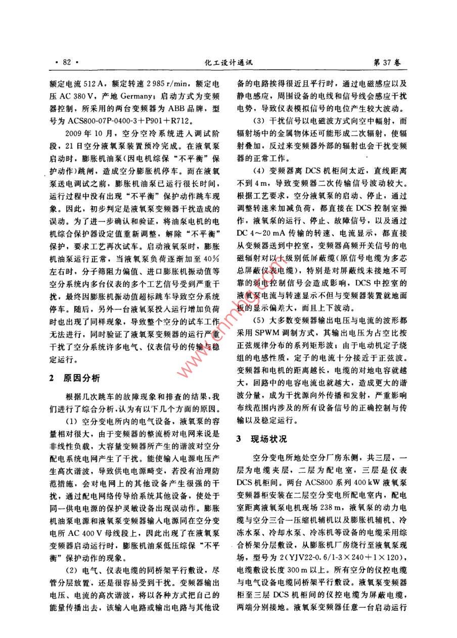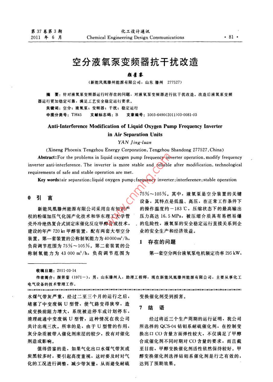 第37卷第3期化工設(shè)計(jì)通訊201年6月 Chemical Engineering Design Communications·81空分液氧泵變頻器抗干擾改造顆景賽(新能鳳凰滕州能源有限公司,山東滕州277527)摘要:針對(duì)液氧泵變頻器運(yùn)行時(shí)存在的問(wèn)題,對(duì)液氧泵變頻器進(jìn)行抗干擾改造。改造后液氧泵變頻器運(yùn)行更加穩(wěn)定可靠,滿(mǎn)足工藝安全穩(wěn)定運(yùn)行要求關(guān)鍵詞:空分;液氧泵;變頻器;干擾;穩(wěn)定運(yùn)行中圖分類(lèi)號(hào):TH45文獻(xiàn)標(biāo)志碼:B文章編號(hào):1003-6490(2011)030081-03Anti-Interference Modification of Liquid Oxygen Pump Frequency Inverterin Air Separation UnitsYAN Jing-luan(Xineng Phoenix Tengzhou Energy Corporation, Tengzhou Shandong 277527, China)Abstract: For the problems in liquid oxygen pump frequency inverter operation, modify frequencyinverter anti-interference. The inverter is more stable and reliable after modification, technologicalrequirements of safe and stable operation are metKey words: air separation: liquid oxygen pump frequency inverter; interference; stable operation75%~105%。其中,液氧泵是空分裝置的關(guān)鍵0引言設(shè)備,其特點(diǎn)是低溫、高壓,在正常工作條件下新能鳳凰滕州能源有限公司采用自有知識(shí)產(chǎn)的操作溫度約-183℃,壓縮狀態(tài)下的最高輸出權(quán)的粉煤加壓氣化國(guó)產(chǎn)化技術(shù)和華東理工大學(xué)管壓力高達(dá)16.5MPa,被壓縮介質(zhì)具有易燃易爆殼外冷絕熱復(fù)合式固定床催化反應(yīng)甲醇合成技術(shù),,的危險(xiǎn)性,液氧泵的安全穩(wěn)定運(yùn)行直接關(guān)系到企建設(shè)的年產(chǎn)720kt甲醇裝置,配有兩套大型空分業(yè)的安全生產(chǎn)和經(jīng)濟(jì)效益。裝置。第一套裝置的公稱(chēng)制氧能力為40000m3/h負(fù)荷調(diào)節(jié)范圍為75%~105%。第二套裝置的公1存在的問(wèn)題稱(chēng)制氧能力為43000m3/h,負(fù)荷調(diào)節(jié)范圍為第一套空分兩臺(tái)液氧泵電機(jī)額定功率295kW收稿日期:2011-03-14作者簡(jiǎn)介:顏景鑾(1971一),男,山東臁州人,助理工程師,現(xiàn)在新能風(fēng)凰滕州能源有限公司,主要從事化工電氣設(shè)備的技術(shù)管理工作水煤氣帶灰嚴(yán)重,經(jīng)過(guò)二至三個(gè)月的運(yùn)行之后,變換催化劑受到損害。堵塞了中變廢鍋U型管,使氣路變得狹窄,造成變換前阻力增大,系統(tǒng)被迫停車(chē)或計(jì)劃停車(chē),7結(jié)語(yǔ)清理疏通中變廢鍋U型管,這種情況在我公司經(jīng)過(guò)將近三個(gè)生產(chǎn)周期的運(yùn)行證明,我公司共計(jì)出現(xiàn)三次。所幸的是,由于U型管的作用,所選擇的QCS04鈷鉬系耐硫催化劑,在控制變灰分雜質(zhì)被帶入催化劑床層的較少,沒(méi)有對(duì)催化換出口CO含量方面彈性較大,不僅滿(mǎn)足了甲醇劑造成影響合成催化劑不同時(shí)期對(duì)CO含量的要求,而且截值得借鑒的是,如果氣化出口水煤氣帶灰或至目前,甲醇變換催化劑活性依然保持較好。甲炭黑較多時(shí),要引起高度重視,這時(shí)要及時(shí)對(duì)氣醇變換催化劑選擇鈷鉬系催化劑是行之有效的,化的工況進(jìn)行調(diào)整,減少帶灰量,從而避免耐硫達(dá)到了預(yù)期效果?;ぴO(shè)計(jì)通訊37卷額定電流512A,額定轉(zhuǎn)速2985r/min,額定電備的電路挨得很近且平行時(shí),通過(guò)電磁感應(yīng)以及壓AC380V,產(chǎn)地 Germany;啟動(dòng)方式為變頻靜電感應(yīng),周?chē)O(shè)備的電線和信號(hào)線會(huì)感應(yīng)干擾器控制,所采用的兩臺(tái)變頻器為ABB品牌,型電勢(shì),導(dǎo)致儀表模擬信號(hào)的電位產(chǎn)生較大波動(dòng)。號(hào)為ACS800-07P0400-3+P901+R712(3)干擾信號(hào)以電磁波方式向空中幅射,而2009年10月,空分空冷系統(tǒng)進(jìn)入調(diào)試階輻射場(chǎng)中的金屬物體還可能形成二次輻射,使輻段,21日空分液氧泵裝置預(yù)冷完成。在液氧泵射疊加,反過(guò)來(lái)變頻器外部的輻射也會(huì)干擾變頻啟動(dòng)時(shí),膨脹機(jī)油泵(因電機(jī)綜?!安黄胶狻北F鞯恼9ぷ?。護(hù)動(dòng)作)跳閘,造成空分膨脹機(jī)停車(chē)。而在液氧(4)變頻器離DCS機(jī)柜間太近,直線距離泵送電調(diào)試之前,膨脹機(jī)油泵已運(yùn)行很長(zhǎng)時(shí)間,不到4m,導(dǎo)致變頻器二次傳輸信號(hào)波動(dòng)較大。運(yùn)行過(guò)程中沒(méi)有出現(xiàn)“不平衡”保護(hù)動(dòng)作跳車(chē)現(xiàn)根據(jù)工藝要求,空分液氧泵的啟動(dòng)、停止,通過(guò)象。因此,初步判定是液氧泵變頻器干擾造成的調(diào)整轉(zhuǎn)速來(lái)加減負(fù)荷,都直接在DCS控制室操誤動(dòng)。為了進(jìn)一步確認(rèn)和驗(yàn)證,將油泵電機(jī)的電作,液氧泵的運(yùn)行、停止、故障信號(hào),以及通過(guò)機(jī)綜合保護(hù)器設(shè)定值重新調(diào)整,解除“不平衡”DC4~20mA傳輸?shù)霓D(zhuǎn)速、電流顯示,都直接保護(hù),要求工藝再次試車(chē)。啟動(dòng)液氧泵時(shí),膨脹從變頻器送到中控室,變頻器高頻開(kāi)關(guān)信號(hào)的電機(jī)油泵運(yùn)行正常,當(dāng)液氧泵負(fù)荷逐漸加至40%磁輻射對(duì)以上級(jí)別低屏蔽纜(原信號(hào)電纜為多芯左右時(shí),分子篩阻力偏值、進(jìn)口膨脹機(jī)振動(dòng)值等總屏蔽儀表電纜),特別是對(duì)屏蔽線未接地不可空分系統(tǒng)內(nèi)多臺(tái)儀表的多個(gè)工藝信號(hào)受到嚴(yán)重干靠的弱
