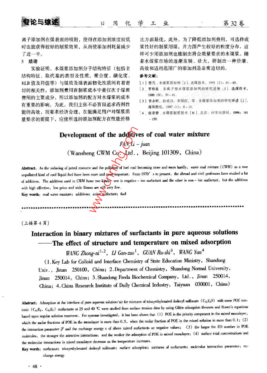 第32卷第1日用化學工業(yè)China Surfactant Detergent Cosmetics水煤漿添加劑的研究進展范麗娟(北京萬盛木煤漿有限責任公司,北京101309)摘要:隨著世界原油資源的日漸減少及燃煤污染的日趨嚴重,水煤漿作為一種新型的環(huán)保型煤基流體燃料日益受到人們的重視。從70年代至今,國內(nèi)外學者研究過多種添加劑,目前制漿用添加劑主要分為陰離子表面活性劑和非離子表面活性劑兩大類,但高效,價廉、適用性廣的添加劑為數(shù)并不多關鍵詞:水煤漿;添加劑;陰離子表面活性劑;非離子表面活性劑;燃料中圖分類號:TQ423.2文獻標識碼:A文章編號:1001-1803(2002)01-006-03水煤漿( Coal Water mixture,簡稱CWM)是一種國際價格比為1:2:3:4,我國非離子型添加劑的價格新型的煤基流體燃料,是由大約70%的煤、30%的比這個比例還高。所以制漿添加劑多選擇陰離子表面水和少量(通常約占煤量的0.5%~1.0%左右)的活性劑。分散劑的作用發(fā)生在煤水界面,因此它的效化學添加劑制備而成的固液分散體系,屬熱力學不穩(wěn)能與煤炭性質特別是煤炭的表面性質及水的性質都有定體系。具有實用要求的高質量水煤漿應具備高濃密切的關系。所以制漿用化學添加劑配方不可能是度、低黏度、良好的流動性及穩(wěn)定性,為達此目的,成不變的。合理的添加劑配方必須根據(jù)制漿用煤的性在煤水混合物中加入適量的化學添加劑是非常重要質和用戶對水煤漿產(chǎn)品質量的需求,經(jīng)過實驗研究后的方可確定。從70年代至今,國內(nèi)外學者研究過多種制漿時所用添加劑,按其功能不同,有分散劑、添加劑,目前制漿用添加劑主要分為陰離子表面活性穩(wěn)定劑及其他一些輔助化學藥劑,如消泡劑、pH調劑和非離子表面活性劑兩大類,但高效、價廉、適用節(jié)劑、防霉劑、表面改性劑及促進劑等多種。在這些性廣的添加劑為數(shù)并不多??偟臍w納起來,到目前國添加劑中,不可缺少的是分散劑與穩(wěn)定劑。受水煤漿內(nèi)外研制及篩選的水煤漿添加劑分為以下幾種類型市場的影響,國內(nèi)水煤漿添加劑的研究、發(fā)展比較緩1.1陰離子型的水煤漿分散劑1慢。目前,水煤漿添加劑主要以萘系列、腐殖酸系(1)聚烯烴系列如:馬來酸與各類環(huán)戊二烯的列、木質素系列、丙烯酸系列以及相關復合型添加劑聚合物鈉鹽,聚環(huán)烯磺酸鹽,聚二烯磺酸鹽,聚苯乙為主,其中應用比較廣泛的為萘系列水煤漿添加劑;烯磺酸鹽,異丁烯和順丁烯二酸酐聚合物鈉鹽等。此對于蔡系列添加劑的研究、應用已達到較高水平;其種分散劑的用量一般為煤重的0.5%左右,其中聚苯成本相對國外同類產(chǎn)品較低。雖然我國已對水煤漿添乙烯磺酸鹽(PS),比萘磺酸鹽甲醛縮合物更優(yōu)越。加劑進行了較多的研究,但仍存在所適用煤種范圍對低灰CWM同時具有良好的減黏以及穩(wěn)定作用。前窄、成本較高等問題。者隨相對分子質量增加而減弱,后者則反之。因此1分散劑通過控制相對分子質量可以同時兼顧CWM的流變性分散劑的作用在于提高煤粒表面的親水性,增加和穩(wěn)定性,甚至可以免去穩(wěn)定劑的加入。這是高聚物煤粒表面的動電位,使煤粒在水中能更好的潤濕并均分散劑的主要優(yōu)點之勻的分散于水中,防止煤粒間相互聚集,從而提高煤2)聚丙烯酸酯系列如:丙烯酸與苯乙烯聚合漿濃度,降低煤漿黏度,增加煤漿流動性。水煤漿分物鈉鹽、丙烯酸與丙烯酰胺共聚物鈉鹽和聚丙烯磺酸散劑都是一些表面活性劑,溶于水后,按離解與不離鹽等。解可分為離子型與非離子型兩大類。按價格,陰離子(3)木質素磺酸鹽此類分散劑主要來自造紙廢型最便宜,它與非離子、陽離子及兩性表面活性劑的液再加工,其最大優(yōu)點是原料豐富,易于加工,價格收稿日期:200-10-16;修回日期:2001-01-19作者簡介:范娟(1972-),女,北京,199年攻讀北京化工大學碩士學位,聯(lián)系電話:(0o)61291452第1期范麗娟:水煤漿添加劑的研究進展專論與練遽便宜,而且漿的穩(wěn)定性好。一般用量為干煤的1%~(2)高分子有機化合物大多數(shù)是有機多糖類高2%。缺點是雜質含量大,因此,除易制漿的煤種分子聚合物,如:Guar膠、 Xanthan膠、黃膠、阿拉外,通常都不能單獨應用。伯膠、半乳糖醛酸、羥乙基纖維素、聚丙烯酰胺絮凝(4)腐殖酸鹽及磺化腐殖酸鹽系列大量實驗證劑、羧甲基纖維素(CMC),以及一些微細膠體粒子明、越年輕的原料煤,其產(chǎn)物的降黏效果越好。這是(如有機膨潤土)等。高聚物的特點是線性長度長因為越年輕的原料煤,含活性基團豐富。-COOH、而且每個分子都有許多極性基團,通過氫鍵或其他鍵H、-0-等,有利于進行化學反應,同時年輕煤合作用(如共價鍵),在煤粒間架橋,形成結構。結基本結構單元相對分子質量小,有利于起分散減黏作構形成后,水被包裹在結構的空隙內(nèi),漿的黏度升用。此類分散劑的許多特點和木質素相似,但其分散高,尤其有高的剪切應力,有利穩(wěn)定。由于CWM為性能更佳,可單獨使用,加量約1%~1.5%,其主粗粒懸浮體,屬動力不穩(wěn)定體系,要其穩(wěn)定,主要方要缺點是漿的穩(wěn)定性差法是使它成為假塑性觸變體3。穩(wěn)定劑的用量隨煤(5)各類取代基聚萘磺酸鹽系列能作為CwM種、穩(wěn)定劑類型、要求的穩(wěn)定期而異,變化在干煤量分散劑的萘磺酸鹽種類很多,其中典型產(chǎn)品是萘磺酸的0.1%~0.005%之間。鈉甲醛縮
