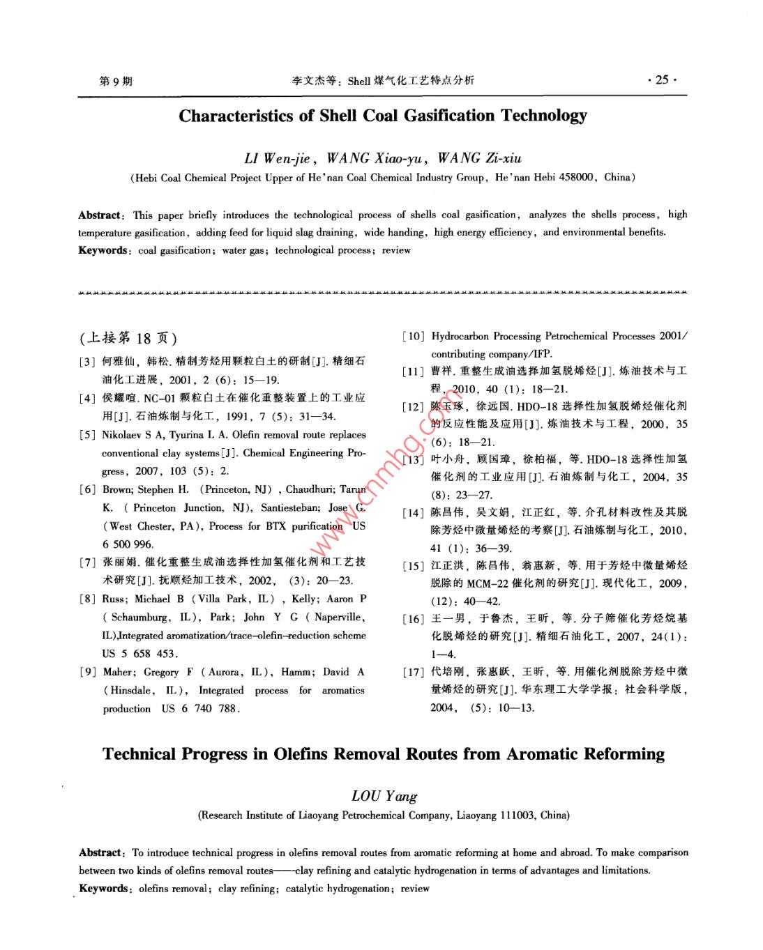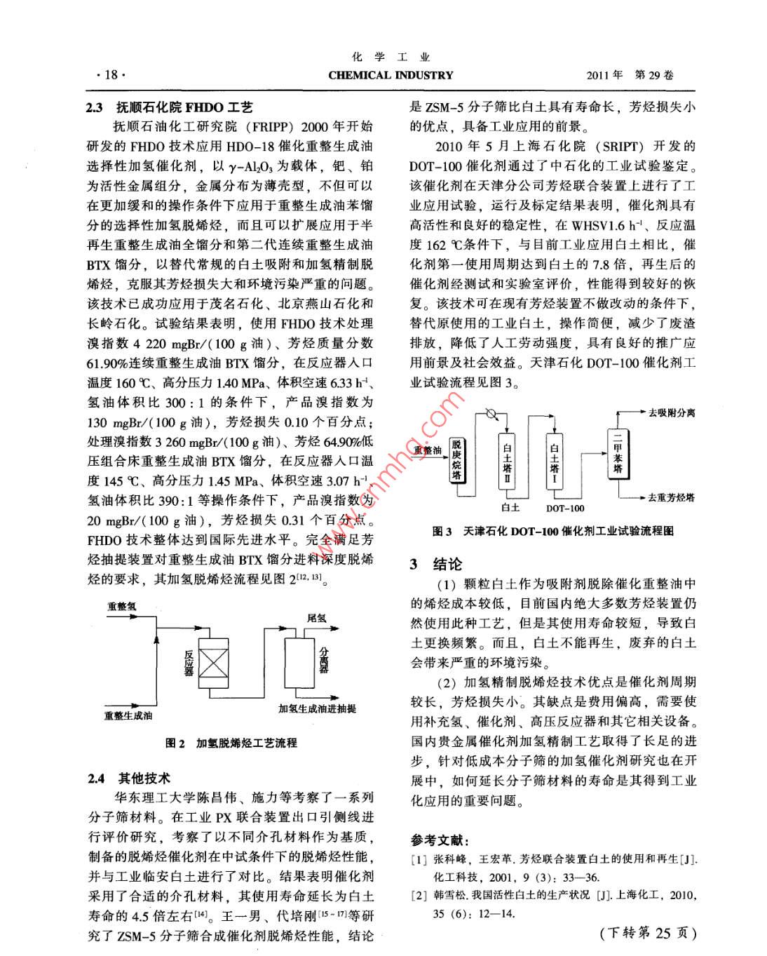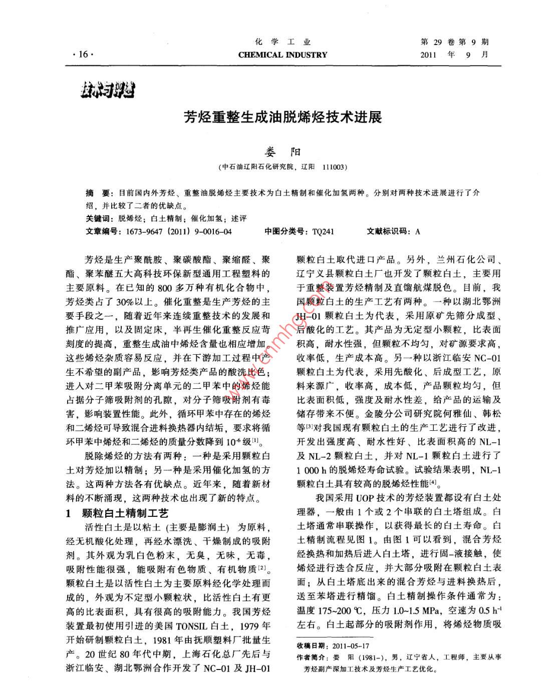 化學(xué)工業(yè)第29卷第9期CHEMICAL INDUSTRY2011年9月芳烴重整生成油脫烯烴技術(shù)進(jìn)展婁陽(yáng)(中石油遼陽(yáng)石化研究院,遼陽(yáng)11003)摘要:目前國(guó)內(nèi)外芳烴、重整油脫烯烴主要技術(shù)為白土精制和催化加氫兩種。分別對(duì)兩種技術(shù)進(jìn)展進(jìn)行了介紹,并比較了二者的優(yōu)缺點(diǎn)。關(guān)鍵詞:脫烯烴;白土精制;催化加氫;述評(píng)文章編號(hào): 1673 -9647 (2011) 9 0016-04中圖分類號(hào): TQ241文獻(xiàn)標(biāo)識(shí)碼: A芳烴是生產(chǎn)聚酰胺、聚碳酸酯、聚縮醛、聚顆粒白土取代進(jìn)口產(chǎn)品。另外,蘭州石化公司、酯、聚苯醚五大高科技環(huán)保新型通用工程塑料的遼寧義縣顆粒白土廠也開(kāi)發(fā)了顆粒白土,主要用主要原料。在已知的800多萬(wàn)種有機(jī)化合物中,于重整裝置芳烴精制及直餾航煤脫色。目前,我芳烴類占了30%以上。催化重整是生產(chǎn)芳烴的主國(guó)顆粒白土的生產(chǎn)工藝有兩種。一種以湖北鄂洲要手段之一,隨著近年來(lái)連續(xù)重整技術(shù)的發(fā)展和JH-01顆粒白土為代表,采用原礦先篩分成型、推廣應(yīng)用,以及固定床,半再生催化重整反應(yīng)苛后酸化的工藝。其產(chǎn)品為無(wú)定型小顆粒,比表面刻度的提高,重整生成油中烯烴含量也相應(yīng)增加。積高,耐水性強(qiáng),但顆粒不均勻,對(duì)礦源要求高,這些烯烴雜質(zhì)容易反應(yīng),并在下游加工過(guò)程中產(chǎn)收率低,生產(chǎn)成本高。另一種以浙江臨安NC-01生不希望的副產(chǎn)品,影響芳烴類產(chǎn)品的酸洗比色;顆粒白土為代表,采用先酸化、后成型工藝,原進(jìn)人對(duì)二甲苯吸附分離單元的二甲苯中的烯烴能料來(lái)源廣,收率高,成本低,產(chǎn)品顆粒均勻,但占據(jù)分子篩吸附劑的孔隙,對(duì)分子篩吸附劑有毒比表面積低,強(qiáng)度及耐水性差,給產(chǎn)品的運(yùn)輸及害,影響裝置性能。此外,循環(huán)甲苯中存在的烯烴儲(chǔ)存帶來(lái)不便。金陵分公司研究院何雅仙、韓松和二烯烴可導(dǎo)致混合進(jìn)料換熱器內(nèi)結(jié)垢,要求將循等B)對(duì)我國(guó)現(xiàn)有顆粒白土的生產(chǎn)工藝進(jìn)行了改進(jìn),環(huán)甲苯中烯烴和二烯烴的質(zhì)量分?jǐn)?shù)降到106級(jí)叫。開(kāi)發(fā)出強(qiáng)度高、耐水性好、比表面積高的NL-1脫除烯烴的方法有兩種:一種是采用顆粒白及NL-2顆粒白土,并對(duì)NL-1顆粒白土進(jìn)行了土對(duì)芳烴加以精制;另一種是采用催化加氫的方1 000 h的脫烯烴壽命試驗(yàn)。試驗(yàn)結(jié)果表明,NL-1法。這兩種方法各有優(yōu)缺點(diǎn)。近年來(lái),隨著新材顆粒白土具有較高的脫烯烴性能[4。料的不斷涌現(xiàn),這兩種技術(shù)也出現(xiàn)了新的特點(diǎn)。我國(guó)采用UOP技術(shù)的芳烴裝置都設(shè)有白土處1顆粒白土精制工藝?yán)砥鳎话阌?個(gè)或2個(gè)串聯(lián)的白土塔組成。白活性白土是以粘土(主要是膨潤(rùn)土)為原料,土塔通常串聯(lián)操作,以獲得最長(zhǎng)的白土壽命。白經(jīng)無(wú)機(jī)酸化處理,再經(jīng)水漂洗、干燥制成的吸附土精制流程見(jiàn)圖1。由圖1可以看到,混合芳烴劑。其外觀為乳白色粉末,無(wú)臭,無(wú)味,無(wú)毒,經(jīng)換熱和加熱后進(jìn)入白土塔,進(jìn)行固_液接觸,使吸附性能很強(qiáng),能吸附有色物質(zhì)、有機(jī)物質(zhì)(2。烯烴進(jìn)行迭合反應(yīng),并大部分吸附在顆粒白土表顆粒白土是以活性白土為主要原料經(jīng)化學(xué)處理而面;從白土塔底出來(lái)的混合芳烴與進(jìn)料換熱后,成的,外觀為不定型小顆粒狀,比活性白土有更送至苯塔進(jìn)行精餾。白土精制操作條件通常為:高的比表面積,具有很高的吸附能力。我國(guó)芳烴溫度175~200C,壓力1.0~1.5 MPa,空速為0.5 h-'裝置最初使用引進(jìn)的美國(guó)TONSIL白土,1979年左右。白土起部分的吸附劑作用,將烯烴物質(zhì)吸開(kāi)始研制顆粒白土,1981年由撫順?biāo)芰蠌S批量生收稿日期: 2011-05-17產(chǎn)。20世紀(jì)80年代中期,上海石化總廠先后與作者簡(jiǎn)介:婁陽(yáng)(1981-), 男,遼寧省人,工程師,主要從事浙江臨安、湖北鄂洲合作開(kāi)發(fā)了NC-01及JH-01芳烴副產(chǎn)深加工技術(shù)及芳烴生產(chǎn)工藝優(yōu)化。第9期婁陽(yáng): 芳烴重整生成油脫烯烴技術(shù)進(jìn)展●17●附于其表面及其微小的孔隙內(nèi),當(dāng)其表面和孔隙(3)加氫裂化反應(yīng)內(nèi)的空間完全被占用后,就不能再吸附其它的烯R- -CH2- -CH2- -Rr+H-- +Rs- -CH;+Rc- -CHs;烴物質(zhì),白土便被認(rèn)為是永久地失活了。4)芳烴加氫飽和反應(yīng)O+H2-→O。若要通過(guò)選擇性加氫的方法脫烯烴,則需要催化劑有非常好的選擇性和適宜的活性,既可使反應(yīng)(1)和(2)順利進(jìn)行,又能有效抑制反應(yīng)(3)和(4)的發(fā)生。為此,需要選擇合適的活性混合芳烴組分并添加助劑,制備成具有特定金屬分布的催化劑,以達(dá)到選擇性加氫脫烯烴的目的門(mén)。2.1 UOP 加氫脫烯烴ORP工藝圖1 UOP 芳烴裝置白土精制流程該工藝由美國(guó)UOP公司開(kāi)發(fā),主要特點(diǎn)是取通常,白土塔的使用壽命為半年。張科峰、消了重整液分離器、重芳烴塔、苯塔和重整液分王宏革等[I研究了溫度、投用方式等影響白土壽離器和萃取精餾(即,環(huán)丁砜)單元后的粘