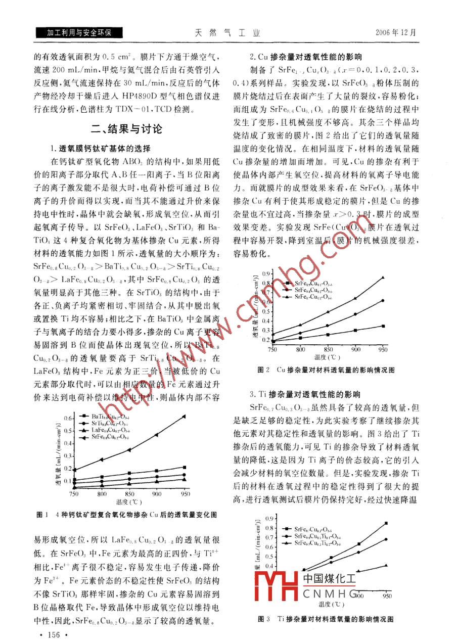 第26卷第12期天然氣工業(yè)加工利用與安全環(huán)保高溫氧滲透膜反應(yīng)器中的甲烷部分氧化制合成氣張恒1董新法1林維明(1.華南理工大學(xué)化工與能源學(xué)院2.廣州大學(xué)化學(xué)化工學(xué)院)張恒等.高溫氧滲透膜反應(yīng)器中的甲烷部分氧化制合成氣.天然氣工業(yè),2006,26(12):155-15摘要采用固相反應(yīng)法合成了Cu摻雜的高溫氧滲透膜材料,并用于甲烷部分氧化制合成氣反應(yīng)過(guò)程。探討了鈣鈦礦苤體氣化物、離子摻雜以及膜片燒結(jié)溫度等對(duì)材料透氧性能的影響,并考察了膜催化反應(yīng)器內(nèi)的甲烷部分氧化反應(yīng)情況。結(jié)果表明,在4種復(fù)合氧化物基體中摻雜Cu得到的透氧量的大小願(yuàn)序?yàn)?SrFe(Cu)O->BaTi(Cu)O3-a>SrTi(Cu)O3-8>LaFe(Cu)O3-。SrFe(Cu)O3-8系列材料顯示了很高的透氧能力,透氧量隨Cu含量的增加而增大,繼續(xù)摻雜Ti可以提高穩(wěn)定性,但是透氧量會(huì)隨Ti含量的增加而降低。Cu和T對(duì) SrFeo2-8基體共摻雜能夠制得具有高透氧量和穩(wěn)定性的透氧膜。在SrFe. s Cuo, Tio.O2-a膜催化反應(yīng)器內(nèi),850℃時(shí),甲烷轉(zhuǎn)化率達(dá)到85%以上,一氧化碳選擇性在90%以上,膜片透氧量達(dá)到5mL/(min·cm2)主題詞膜分離鈣鈦礦反應(yīng)器甲烷部分氧化合成氣轉(zhuǎn)化率選擇性銅鈦目前,天然氣的化工利用主要是通過(guò)間接轉(zhuǎn)化,即純的SrCO3、BaCO3、La2O3、Fe2O3、CuO、TiO2,按照先由天然氣轉(zhuǎn)化成合成氣,再由合成氣生產(chǎn)下游產(chǎn)品?;瘜W(xué)計(jì)量比準(zhǔn)確稱取所需組分,混合均勻后加入乙甲烷部分氧化制合成氣工藝以其能耗低、反應(yīng)速度快、醇,研磨后在900℃下預(yù)燒5h,再次研磨后于1100條件溫和等優(yōu)點(diǎn)得到了人們的廣泛關(guān)注2。近年來(lái),℃下反應(yīng)5h,升降溫速率為2℃/min。甲烷部分氧有許多研究將高溫氧滲透膜應(yīng)用到甲烷部分氧化反應(yīng)化反應(yīng)采用NiCe/yAl2O3催化劑,其制備方法見(jiàn)過(guò)程中,使得制氧過(guò)程與催化部分氧化過(guò)程耦合在一參考文獻(xiàn)。個(gè)反應(yīng)器中完成,它利用透氧膜的選擇滲透性為反應(yīng)提2.膜片的制備供純氧,省去了空分設(shè)備,可以顯著地減少能耗,降低操研磨所得粉體,取小于200目的粉體,添加作成本。此工藝過(guò)程的核心部件高溫氧滲透膜是一類PVA造粒后采用不銹鋼模具成型,在200MPa下壓同時(shí)具有氧離子導(dǎo)電性能與電子導(dǎo)電性能的陶瓷材料,成直徑為20mm、厚度為2mm左右的原片。將原在高溫下,當(dāng)膜兩側(cè)存在氧濃度梯度時(shí),晶體中的氧離片在1200℃燒結(jié)5h,升降溫速率為2℃/min,最后子由高氧壓區(qū)向低氧壓區(qū)傳導(dǎo)同時(shí)電子朝相反的方向得厚度1.5mm左右、直徑17~19mm的致密膜片傳導(dǎo)。目前, Sr-Fe-Co0系列高溫氧滲透膜材料得到了3.透氧性能測(cè)試最為廣泛的關(guān)注,如 SaFeco.50,Ba0 s Sro,s co3Fe2采用穩(wěn)態(tài)法測(cè)試樣品的透氧量。膜片與石英管O3_a③等在甲烷部分氧化反應(yīng)條件下顯示了較高的透之間通過(guò)金圈密封。膜片的一端通干燥空氣,流速氧能力。有研究表明,在鈣鈦礦結(jié)構(gòu)中摻雜Cu可以200mL/min,另一端通高純氦氣,流速35mL/min產(chǎn)生大量的氧空位,提高材料的透氧能力。另外,以Cu尾氣經(jīng)六通閥進(jìn)入HP4890D型氣相色譜儀進(jìn)行氧元素替代Co元素還可降低原料成本。為此,筆者開(kāi)發(fā)含量分析,在進(jìn)入色譜檢測(cè)以前通入很小流量的了一系列Cu摻雜的高溫氧滲透膜材料,并組裝了膜反CH4作為內(nèi)標(biāo)定量,TCD檢測(cè),色譜柱為5A分子應(yīng)器,考察了氧滲透膜反應(yīng)器內(nèi)的甲烷部分氧化反應(yīng)。篩,進(jìn)行可能的氮氧分離。、實(shí)驗(yàn)部分4.膜反應(yīng)器中的甲烷部分氧化透氧膜粉體采用固相反應(yīng)法合成,原料為分所子膜反應(yīng)實(shí)驗(yàn)時(shí),先將厚度為15m的膜1.透氧膜粉體及催化劑的制備HH中國(guó)煤化工度為850℃時(shí),將CNMHG膜的上表面,膜片本研究為廣東省自然科學(xué)基金項(xiàng)目(編號(hào):030514)和廣東省科技計(jì)劃項(xiàng)目(編號(hào):2004B33401006)研究成果。作者簡(jiǎn)介:張恒,1979年生,博士研究生。地址:(510640)廣東省廣州市。電話:(020)88371667E-mails:tmne@126.com加工利用與安全環(huán)保天然氣工業(yè)2006年12月的有效透氧面積為0.5cm2。膜片下方通干燥空氣,2.Cu摻雜量對(duì)透氧性能的影響流速200mL/min,甲烷與氦氣混合后由石英管引入制備了SrFe1,Cu,O)2a(x=0,0.1,0.2,0.3反應(yīng)側(cè),氦氣流速保持在30mL/min,反應(yīng)后的氣體0.4)系列樣品。實(shí)驗(yàn)發(fā)現(xiàn),以 SrFc)3a粉體壓制的產(chǎn)物經(jīng)冷卻干燥后進(jìn)入HP4890D型氣相色譜儀進(jìn)膜片燒結(jié)過(guò)后在表面產(chǎn)生了大量的裂紋,容易粉化行在線分析,色譜柱為TDX-01,TCD檢測(cè)。而組成為SrFe.6Cu.,O4a的膜片在燒結(jié)的過(guò)程中二、結(jié)果與討論發(fā)生了變形,且機(jī)械強(qiáng)度不夠高。其余三個(gè)樣品均燒結(jié)成了致密的膜片,圖2給出了它們的透氧量隨1.透氧膜鈣鈦礦基體的選擇溫度的變化情況。在相同溫度下,材料的透氧量隨在鈣鈦礦型氧化物ABO3的結(jié)構(gòu)中,如果用低Cu摻雜量的增加而增加??梢?jiàn),Cu的摻雜有利于價(jià)的陽(yáng)離子部分取
