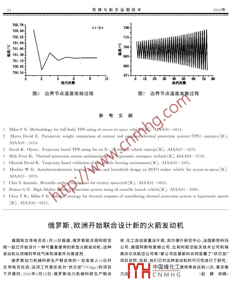 馬忠輝等RLⅤ陶瓷熱防護(hù)系統(tǒng)熱分析模型研究文章編號(hào):1004-7182(2003)03-0019-06RLV陶瓷熱防護(hù)系統(tǒng)熱分析模型研究馬忠輝孫秦王小軍楊勇(西北工業(yè)大學(xué),西安,710072)(北京宇航系統(tǒng)工程設(shè)計(jì)部,北京,100076)摘要:應(yīng)用于可重復(fù)使用運(yùn)載器的陶瓷熱防護(hù)系統(tǒng)具有多層結(jié)構(gòu)、材料物理性能差異大、外邊界具有輻射、對(duì)流換熱等復(fù)雜內(nèi)部結(jié)構(gòu)及外邊界特征,熱分析涉及到復(fù)雜的氣動(dòng)熱、溫度場(chǎng)以及應(yīng)力應(yīng)變場(chǎng)的耦合分析。瞬態(tài)溫度場(chǎng)分析是將各種分析過(guò)程耦合于一體的一個(gè)重要的中間環(huán)節(jié),應(yīng)用非線性全隱式有限差分方法研究陶瓷熱防護(hù)系統(tǒng)瞬態(tài)溫度場(chǎng)數(shù)值計(jì)算方法及細(xì)致計(jì)算步驟,建立了用于溫度場(chǎng)分析及結(jié)構(gòu)質(zhì)量預(yù)測(cè)的一維熱分析模型,獲得了可資工程實(shí)踐應(yīng)用的數(shù)值算法體系以及有益的數(shù)值計(jì)算結(jié)論,對(duì)于提高熱防護(hù)系統(tǒng)結(jié)構(gòu)質(zhì)量旳預(yù)測(cè)精度及深λ進(jìn)行往返式航天飛行器結(jié)構(gòu)優(yōu)化設(shè)計(jì)都有較好的理論參考價(jià)值。關(guān)鍵詞:重復(fù)使用運(yùn)載器;陶瓷;熱防護(hù)系統(tǒng);瞬態(tài)溫度場(chǎng);隱式差分格式;熱分析模型中圖分類號(hào):V250.1V435.14文獻(xiàn)標(biāo)識(shí)碼:AThermal model Study of rlv Ceramic Thermal protection SystemMa Zhonghui Sun Qin(Northwestern Polytechnical University, Xi'an, 710072)Wang Xiaojun Yang YongBeijing Institute of Astronautical Systems Engineering, Beijing, 100076)Abstract: Analysis of reusable temperature protection system involves flow field analysistemperature field analysis and stress and strain field analysis, in which transient temperature fieldalysis is the key medium procedure that couples all analyses Based on analyzing the characters ofinter structure and outer condition of tps that is laminar and thermal radiative at surface, this paperstudies the application of nonlinear, implicit one-dimensional, transient, difference solution techniqueto predict temperature field through TPS and one-dimensional thermal model, which will be used toanalyze temperature field and predict structure weight. This method will improve the analysisprecision中國(guó)煤化工Key Words: Reusable launch vehicle, Ceramic, TheCNMHGnSIent temperaturefield, Implicit finite difference scheme, Thermal model收稿日期痂數(shù)據(jù)8作者簡(jiǎn)介:馬忠輝(1977-),女,在讀博士生,主要從事飛行器設(shè)計(jì)研究導(dǎo)彈與航天運(yùn)載技術(shù)2003年1引言態(tài)溫度場(chǎng)高精度計(jì)算分析的目的就在于準(zhǔn)確估算使往返于大氣層內(nèi)外,使航天/空天飛機(jī)遭受到大內(nèi)部冷結(jié)構(gòu)在使用溫度范圍內(nèi)時(shí)的隔熱層厚度氣層內(nèi)、外的所有外部環(huán)境的影響,尤其在上升和再涂入階段受到嚴(yán)重的氣動(dòng)加熱,因此必須采用熱防護(hù)系統(tǒng)(TPS)。航天飛機(jī)軌道器的防熱系統(tǒng)質(zhì)量約占防熱瓦軌道器總重的20%,超過(guò)以往任何載人再入飛行器有機(jī)膠的比率(水星飛船為1/12,雙子星座飛船為1/7,阿波應(yīng)變隔高墊冷結(jié)構(gòu)羅登月艙為1/14)先進(jìn)的空天飛機(jī)特別是單級(jí)入軌空天飛機(jī)對(duì)結(jié)構(gòu)質(zhì)量要求十分苛刻,有效載重比的高低將直接決定其竟?fàn)幜?。因?提高熱防護(hù)系統(tǒng)質(zhì)圖剛性陶瓷防熱瓦分析模型量的估算精度,對(duì)于減少結(jié)構(gòu)質(zhì)量、實(shí)現(xiàn)熱防護(hù)系統(tǒng)優(yōu)化設(shè)計(jì)、提高運(yùn)載器有效載重以及經(jīng)濟(jì)性等會(huì)起涂層到重要作用。目前,美國(guó)等先進(jìn)航天大國(guó)都在致力于提高計(jì)算流體力學(xué)(CFD)對(duì)氣動(dòng)加熱環(huán)境的預(yù)測(cè)精度,改進(jìn)防熱系統(tǒng)溫度場(chǎng)瞬態(tài)響應(yīng)分析方法,并將兩柔性隔熱氈個(gè)分析過(guò)程有機(jī)耦合在一起,提高熱防護(hù)系統(tǒng)質(zhì)量的估算準(zhǔn)確度-。本文在借鑒已有的研究成果基有機(jī)膠冷結(jié)構(gòu)礎(chǔ)上,探討具有多層結(jié)構(gòu)、變物性,外邊界具有輻射對(duì)流換熱等特點(diǎn)的陶瓷防熱系統(tǒng)瞬態(tài)導(dǎo)熱過(guò)程的數(shù)圖2柔性隔熱氈分析模型值分析方法,建立應(yīng)用于溫度場(chǎng)分析及結(jié)構(gòu)質(zhì)量預(yù)測(cè)的熱分析模型,以期獲得對(duì)防熱系統(tǒng)質(zhì)量預(yù)測(cè)精度的改進(jìn)。外邊界2陶瓷防熱系統(tǒng)數(shù)學(xué)分析模型及離散72化處理經(jīng)過(guò)幾十年的研制與應(yīng)用,國(guó)外非金屬防熱系材料2到統(tǒng)已經(jīng)有多代產(chǎn)品問(wèn)世,由最初的剛性陶瓷防熱瓦、柔性隔熱氈發(fā)展到現(xiàn)代結(jié)構(gòu)更為復(fù)雜的多層隔熱系統(tǒng),防熱系統(tǒng)物理性能得到很大改善,但仍保持了基●7材料M本的層狀結(jié)構(gòu)。將真實(shí)結(jié)構(gòu)進(jìn)行簡(jiǎn)化得到的數(shù)學(xué)分內(nèi)邊界析模型如圖1~2所示2。防熱系統(tǒng)整體由不同厚度、物理性能差異顯著的數(shù)層物質(zhì)疊合而成,基本結(jié)構(gòu)圖3陶瓷防熱結(jié)構(gòu)離散化分析模型由外至內(nèi)分別為表面涂層、隔熱材料、粘
